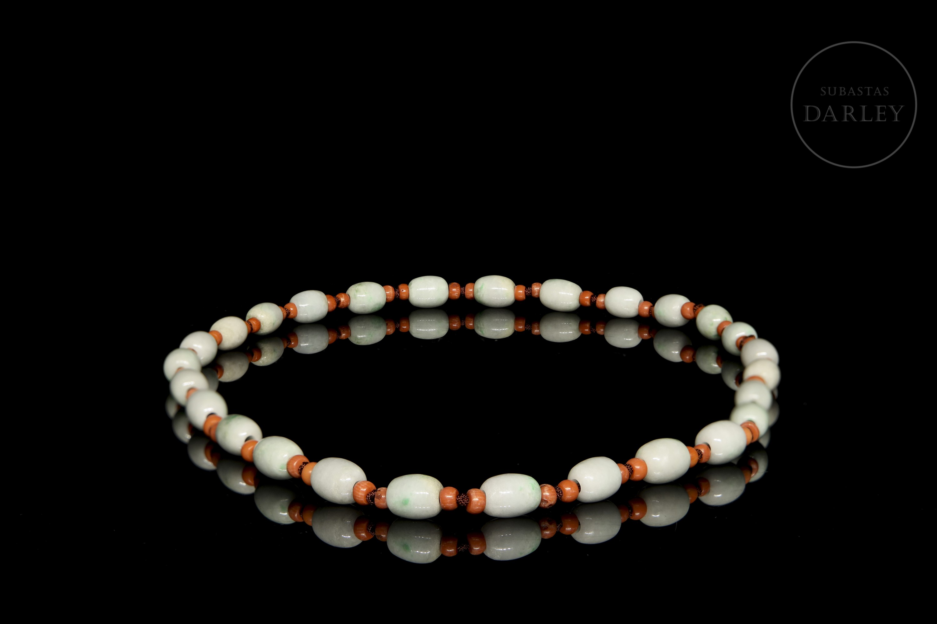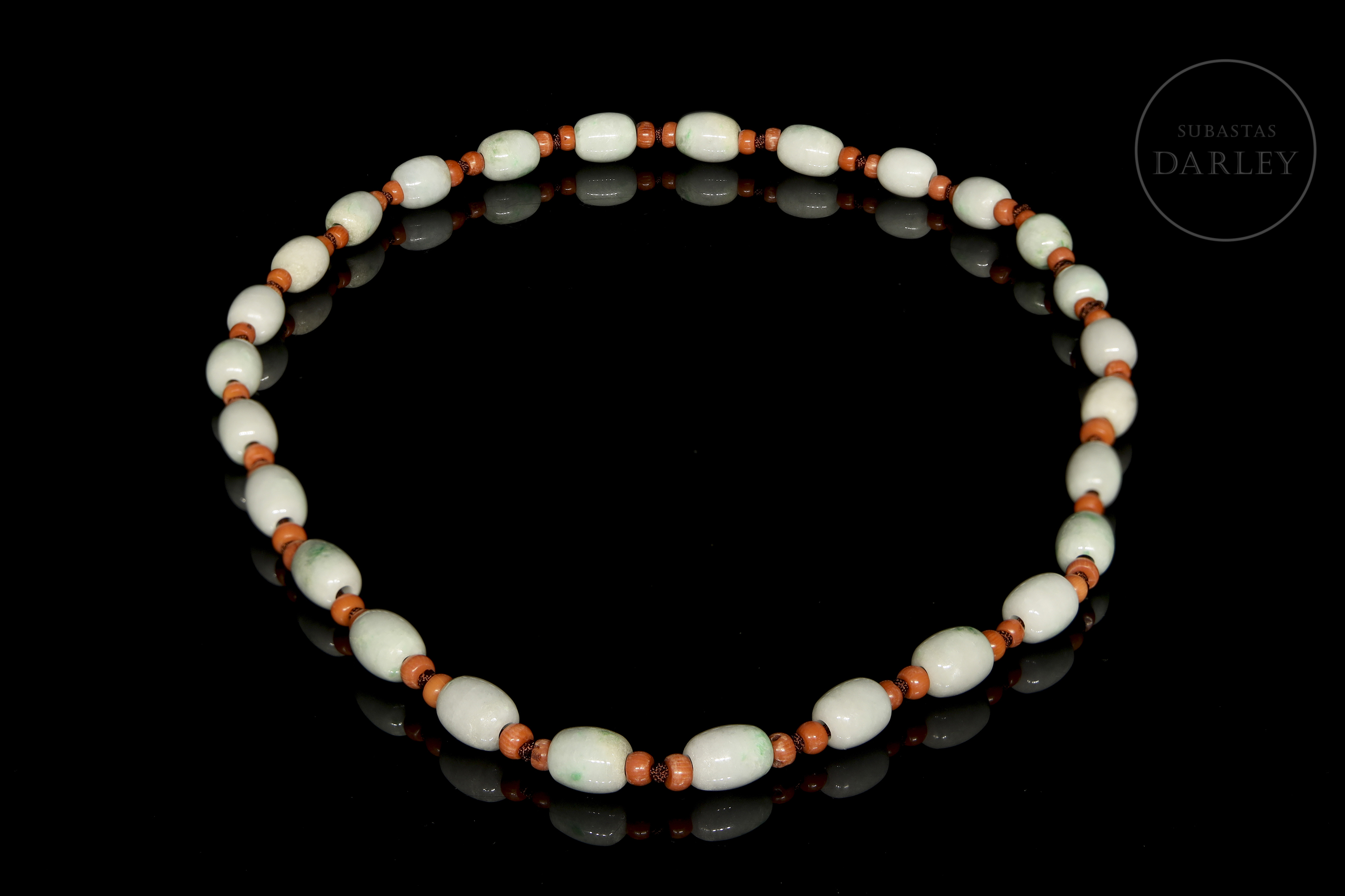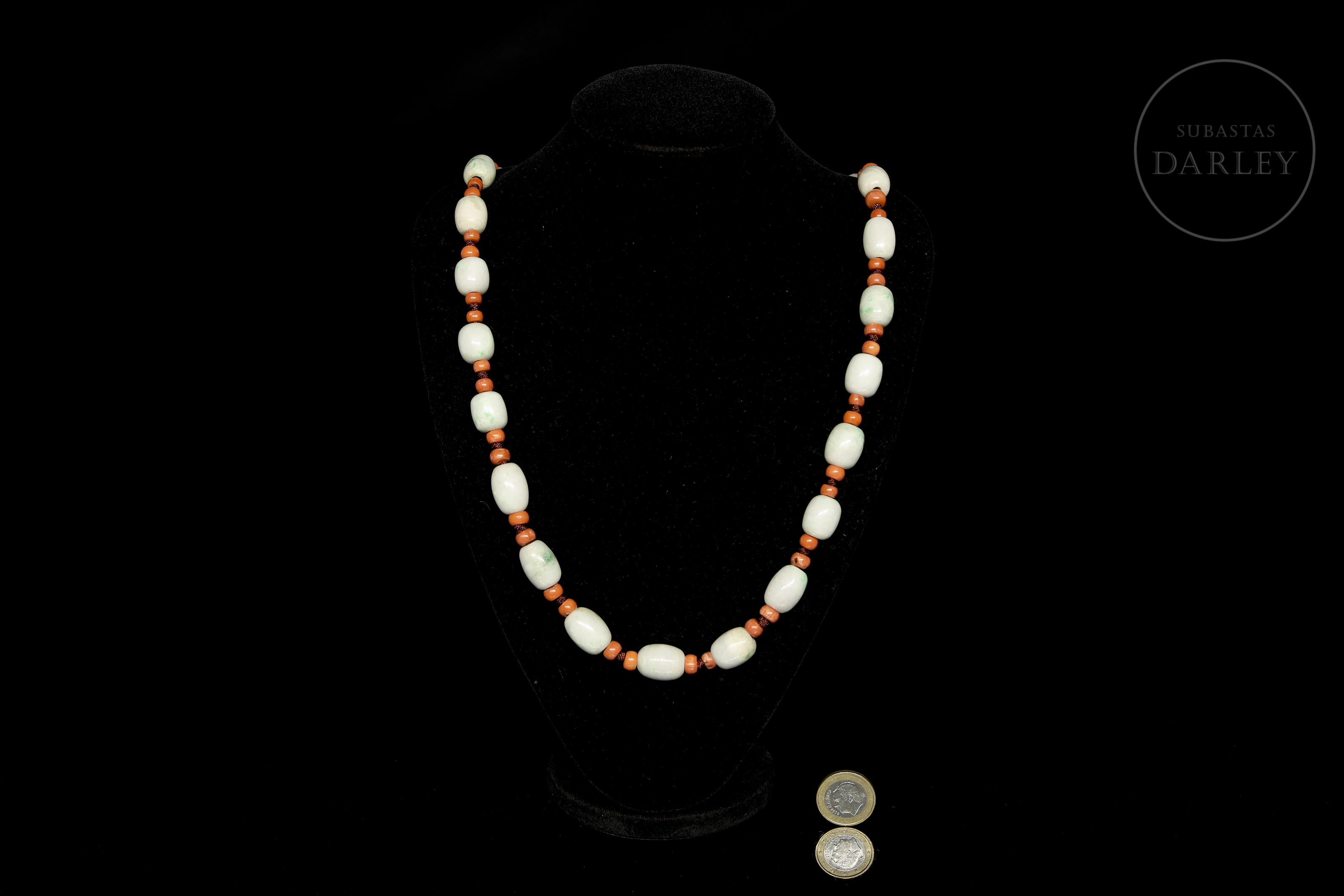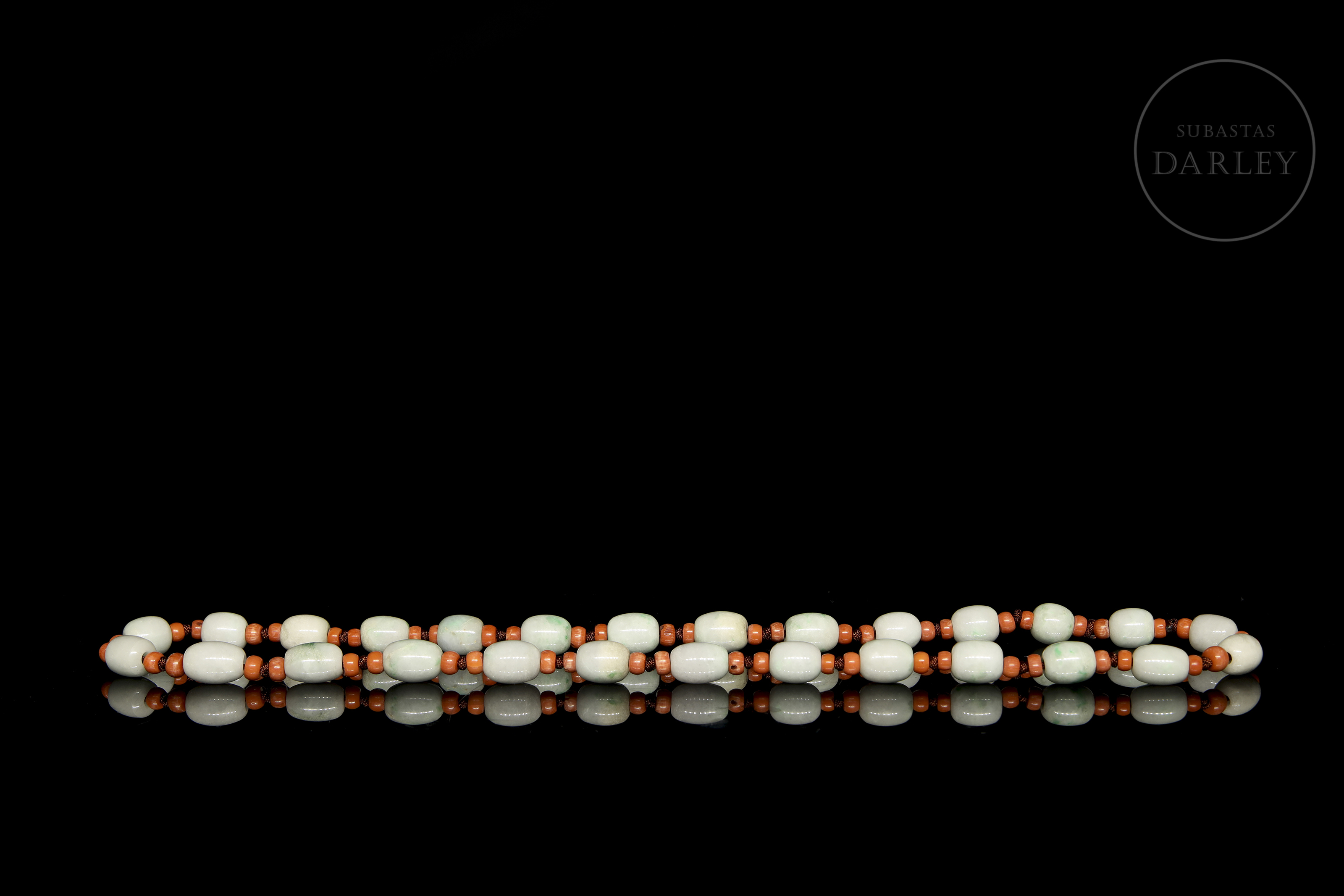 Compuesto por un total de 27 cuentas de jadeíta tallada en forma ovalada, de color lechoso con sutiles manchas verdes, que se alternan con 54 pequeñas cuentas de piedra tallada de tonalidad coral, dispuestas por parejas. Todo ello atravesado por un cordón anudado añadido posteriormente.