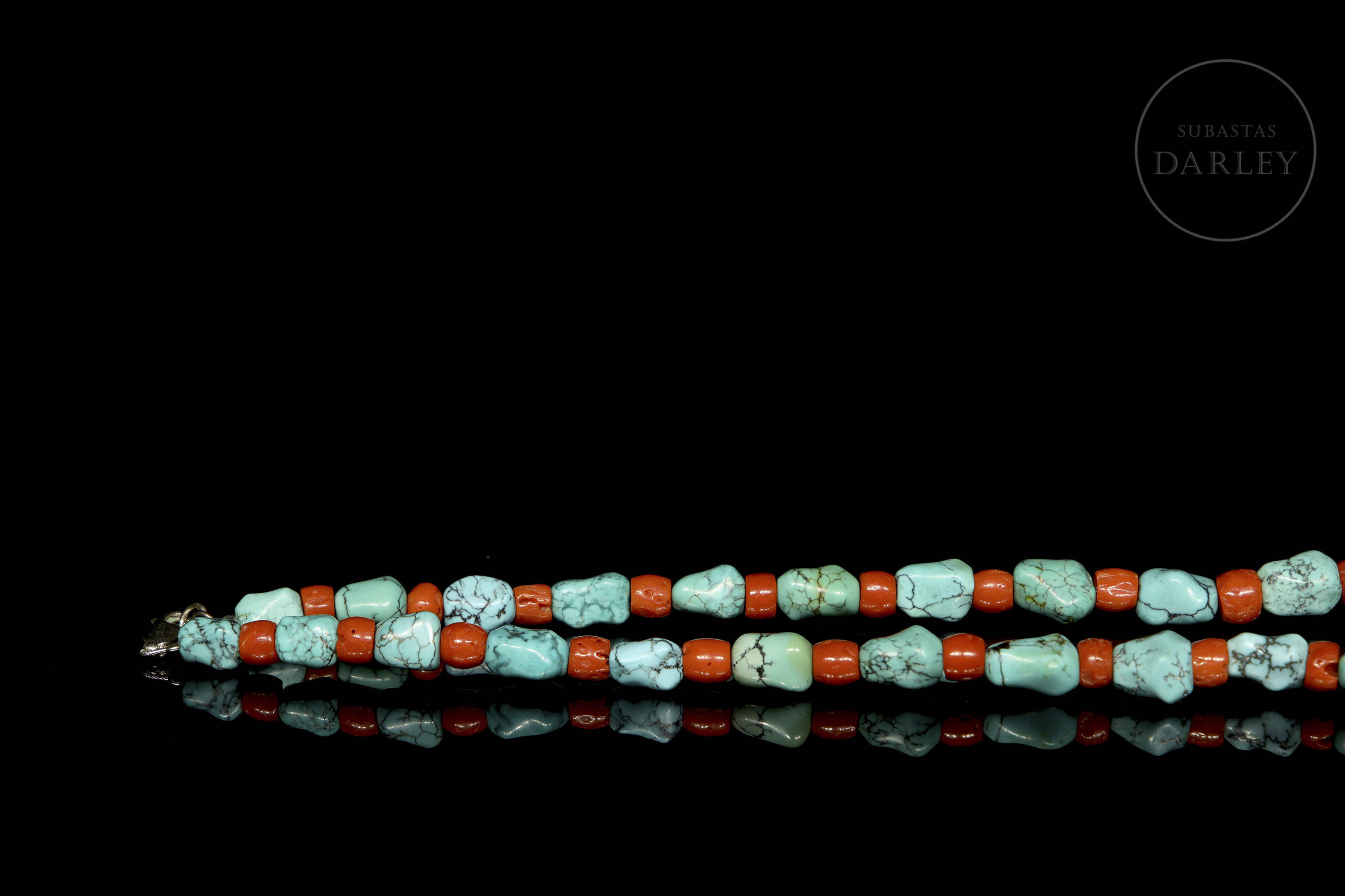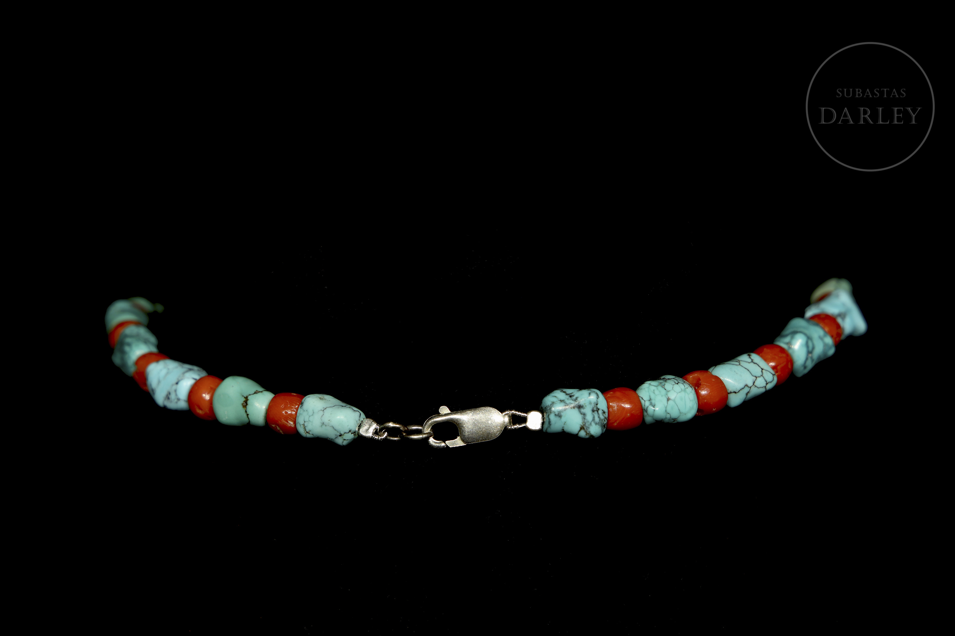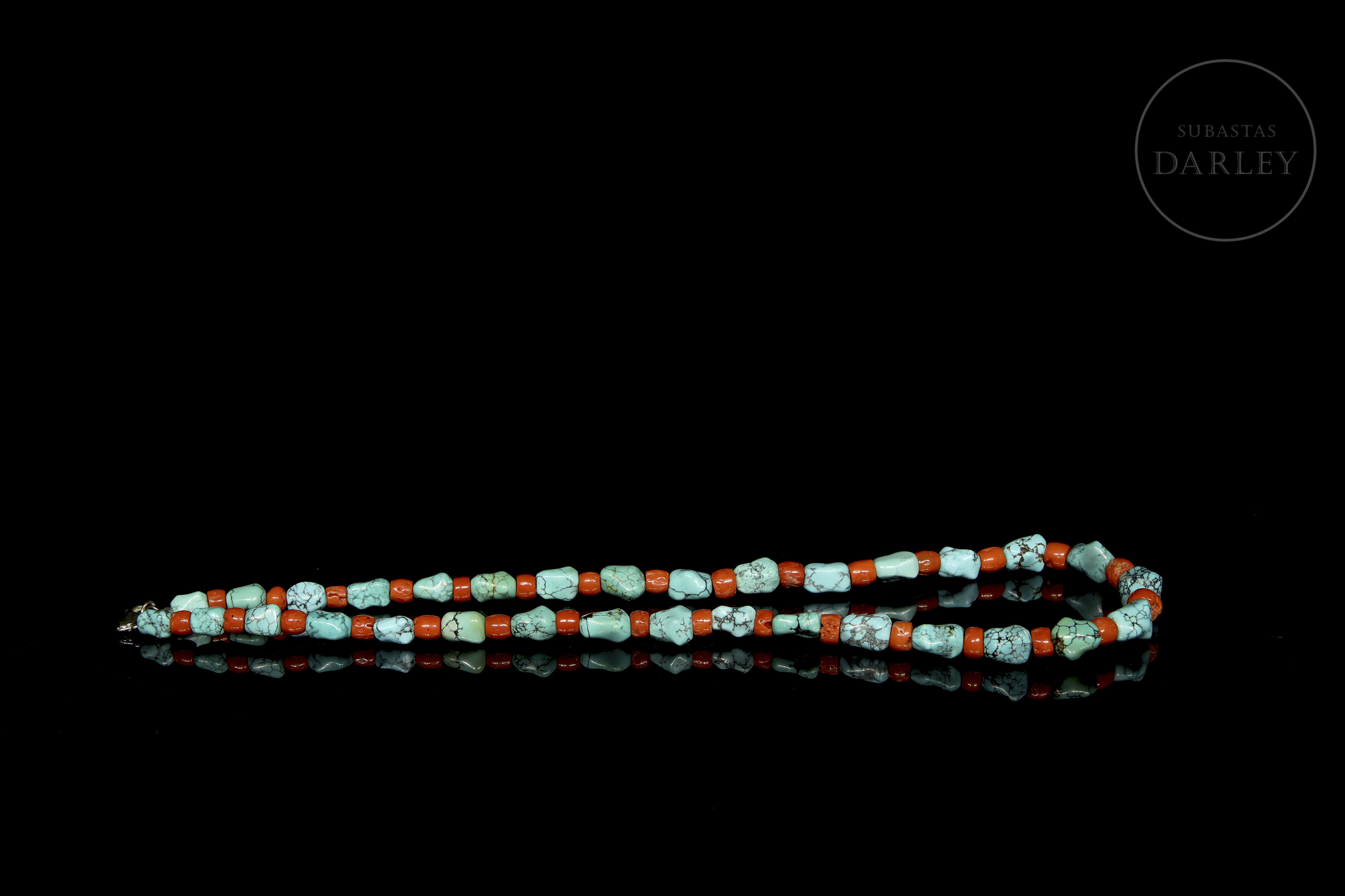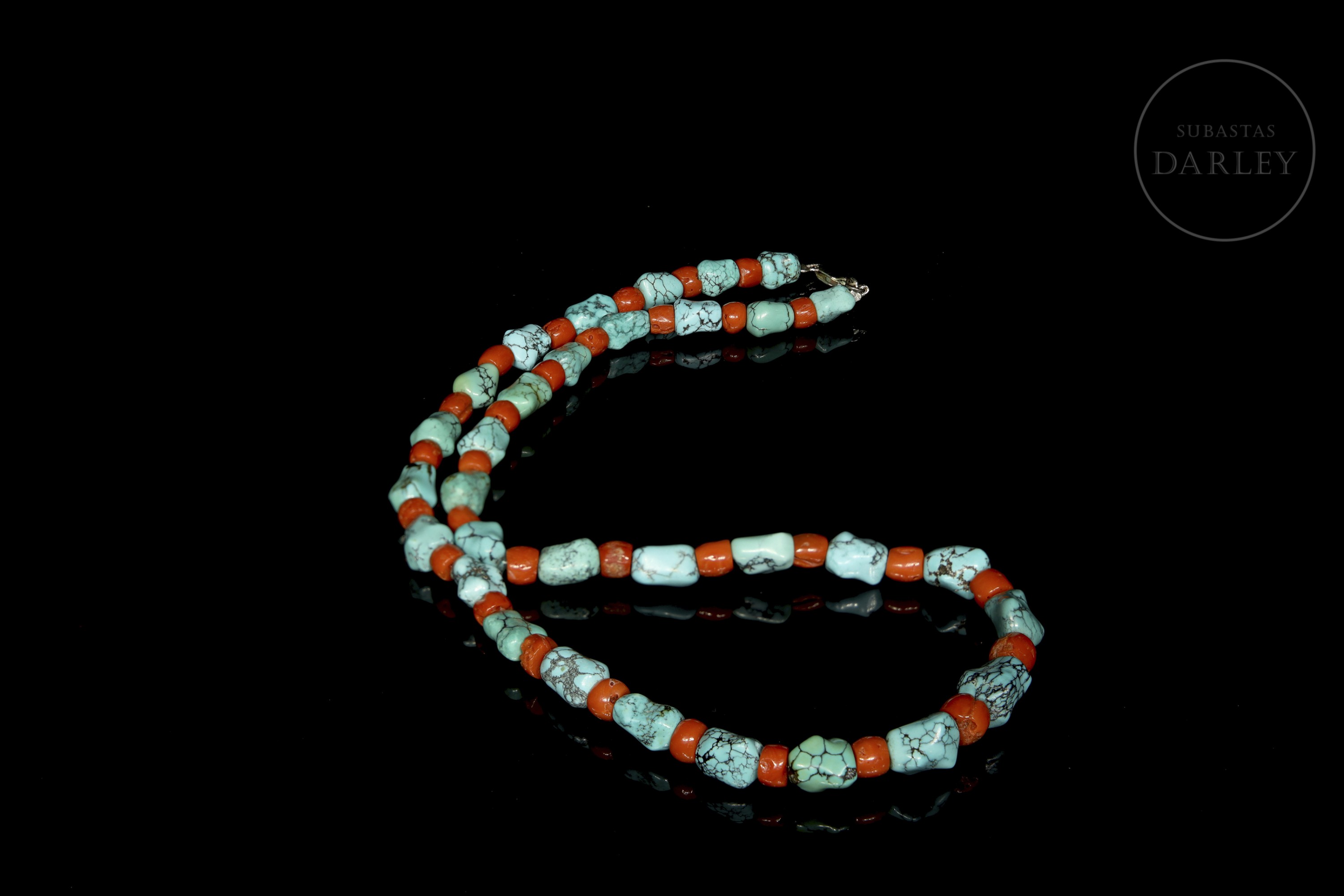 Collar vintage decorado con cuentas alternadas de turquesa y coral. Las cuentas de turquesa son de forma orgánica e irregular, con vetas naturales y un color azul verdoso intenso. Se encuentran separadas por cuentas de coral, con forma de barril y color rojo anaranjado fuerte. Cierre de plata tipo mosquetón.