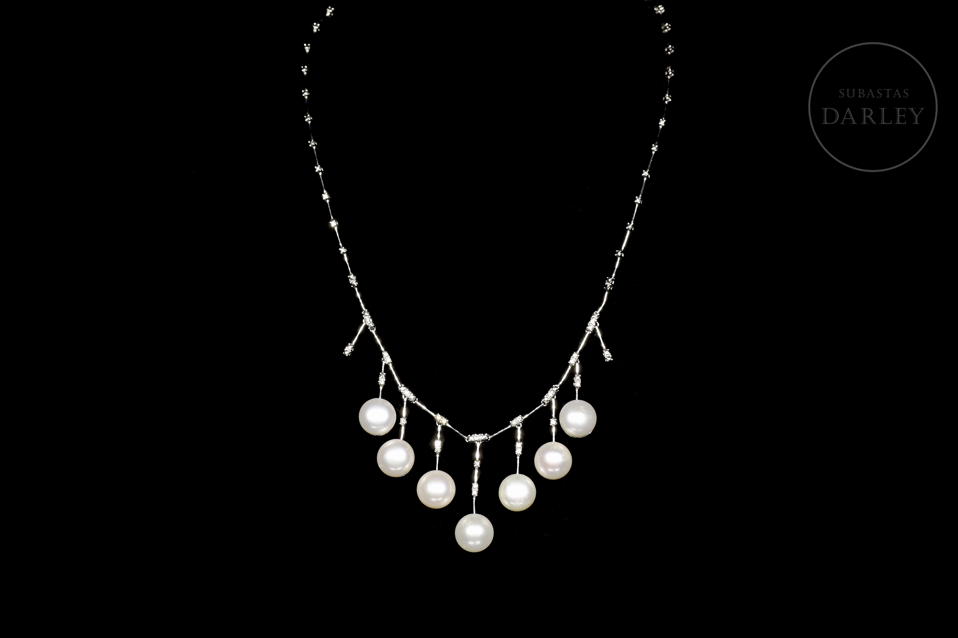 Collar de oro blanco de 18k con perlas y diamantes engastados. Posee una cadena, adornada con diamantes engastados en garras, de los que penden en el área central, eslabones colgantes, en cascada, con diamantes en el área central, y finalizados con una perla (7 en total).
