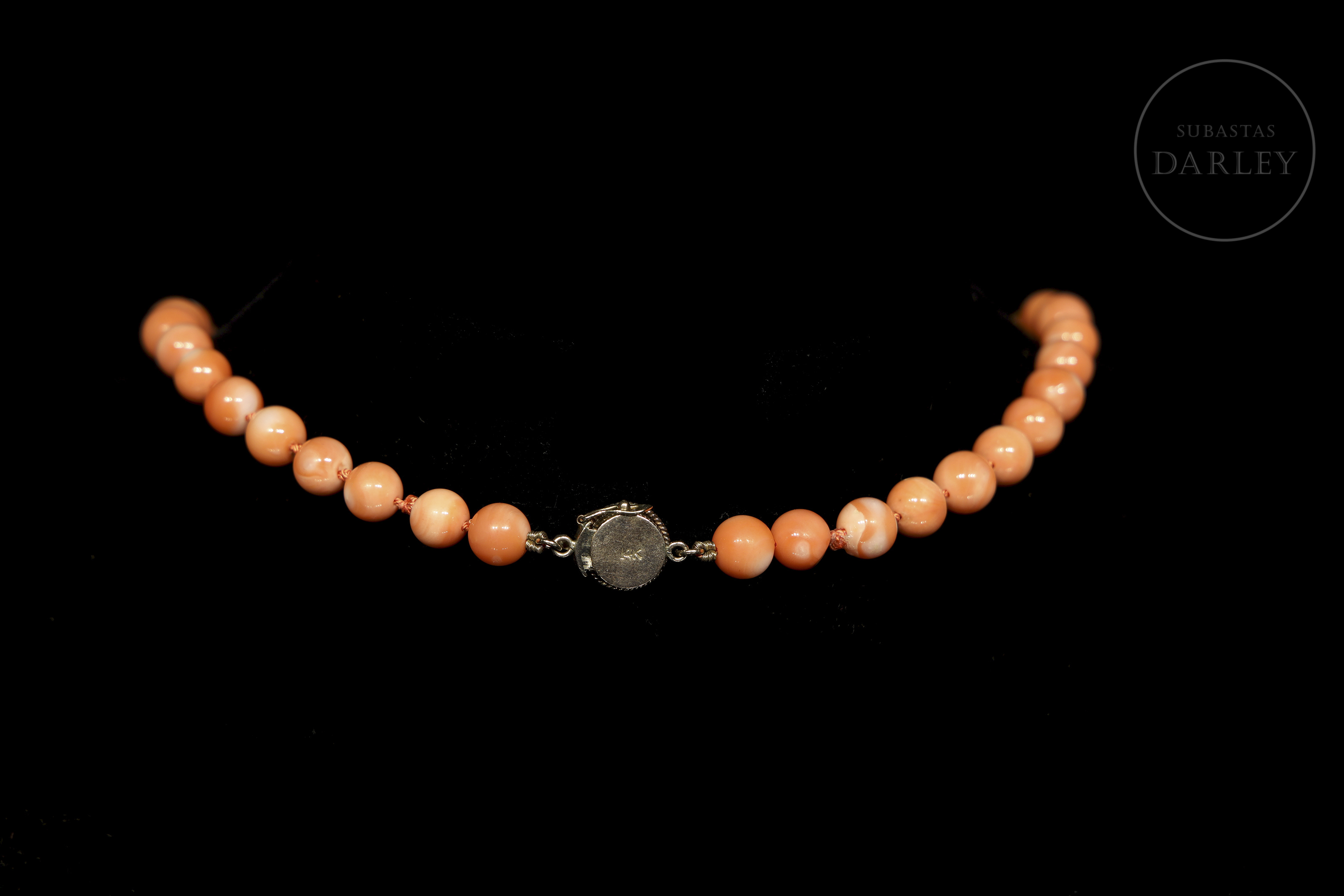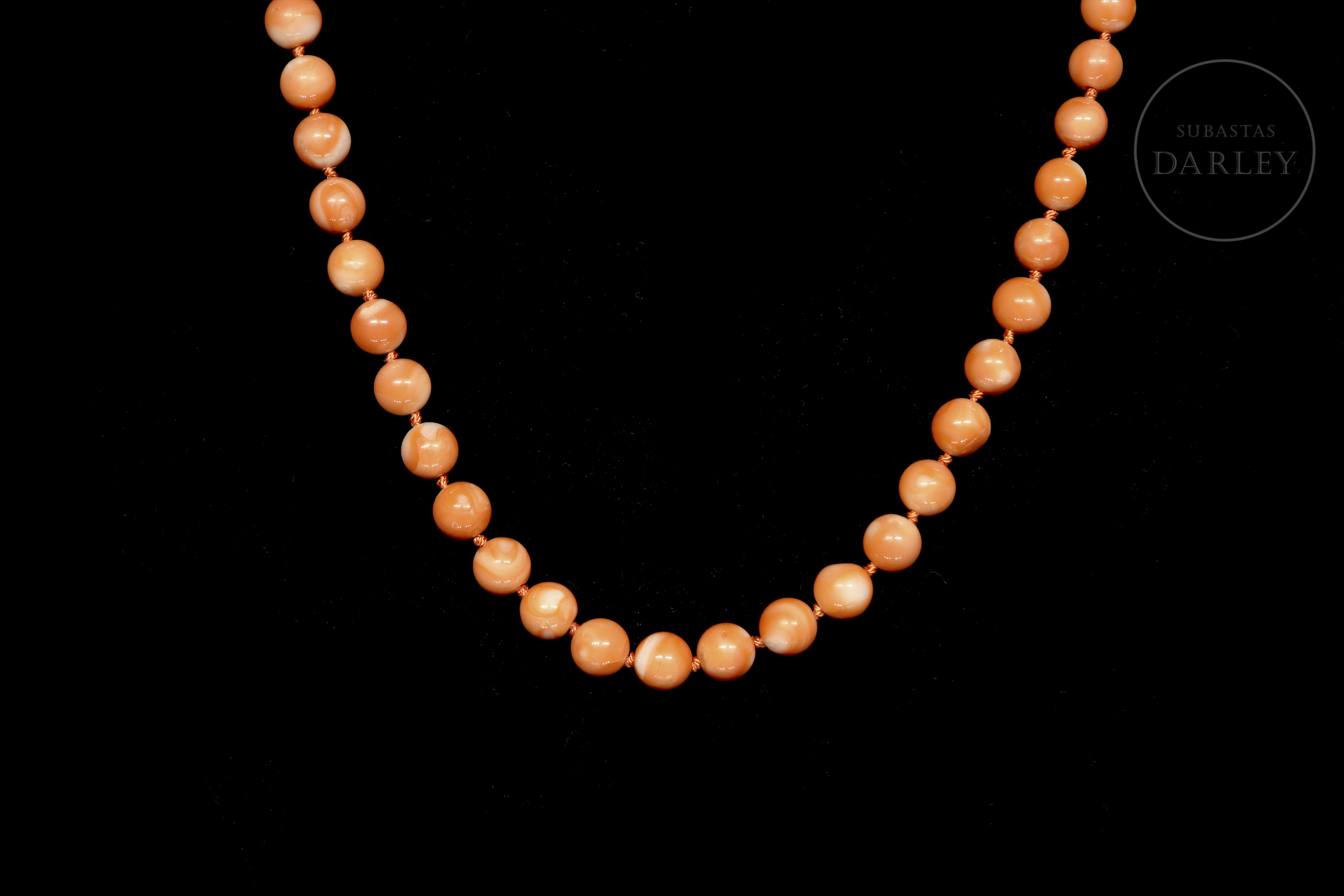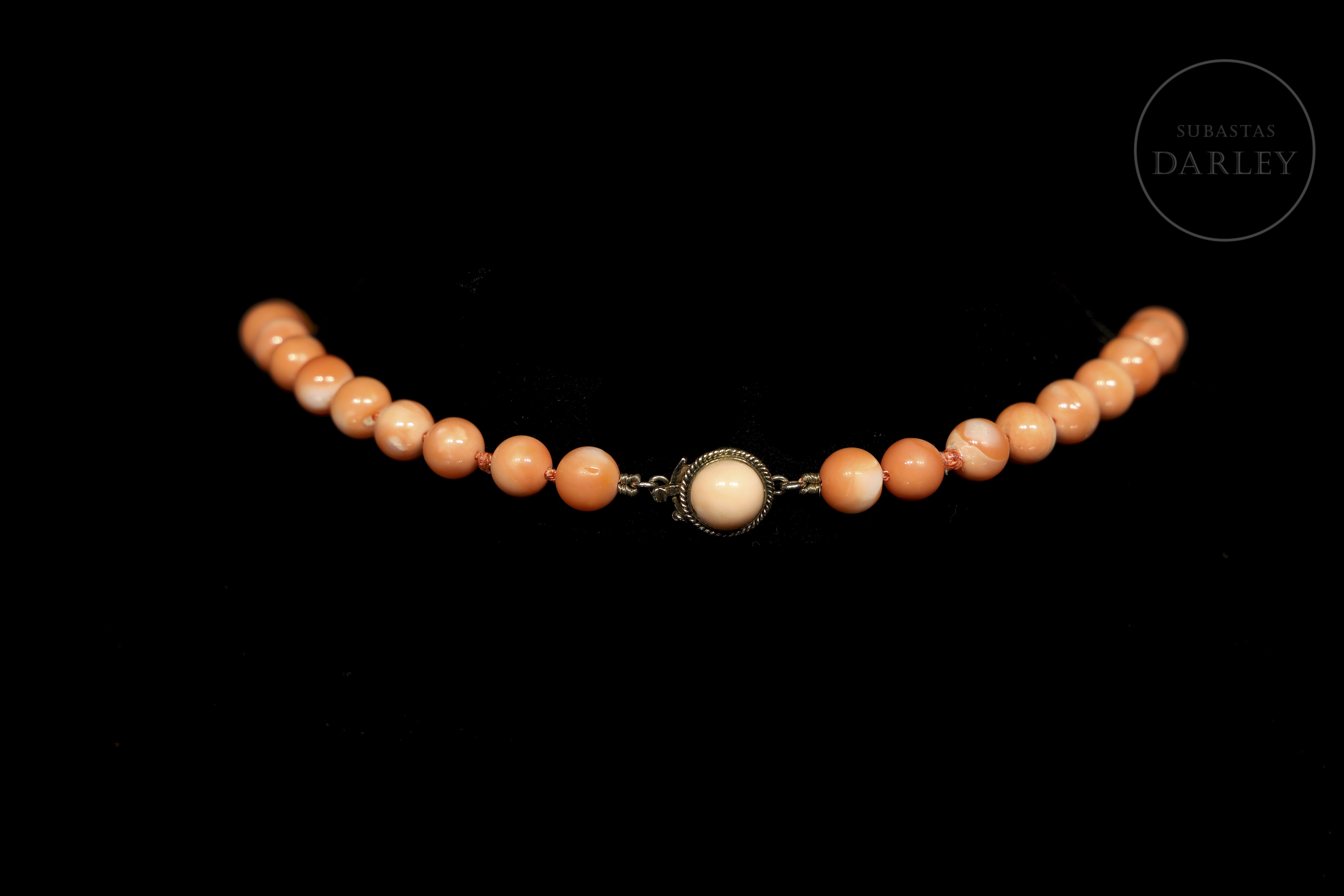 Collar de sartal simple con 56 las cuentas de coral variedad "Piel de Ángel", caracterizada por un tono rosa pálido o melocotón, separadas por pequeños nudos manuales. Cierre de lengüeta invisible, realizado en oro de 14k adornado por una cuenta de coral en cabujón.