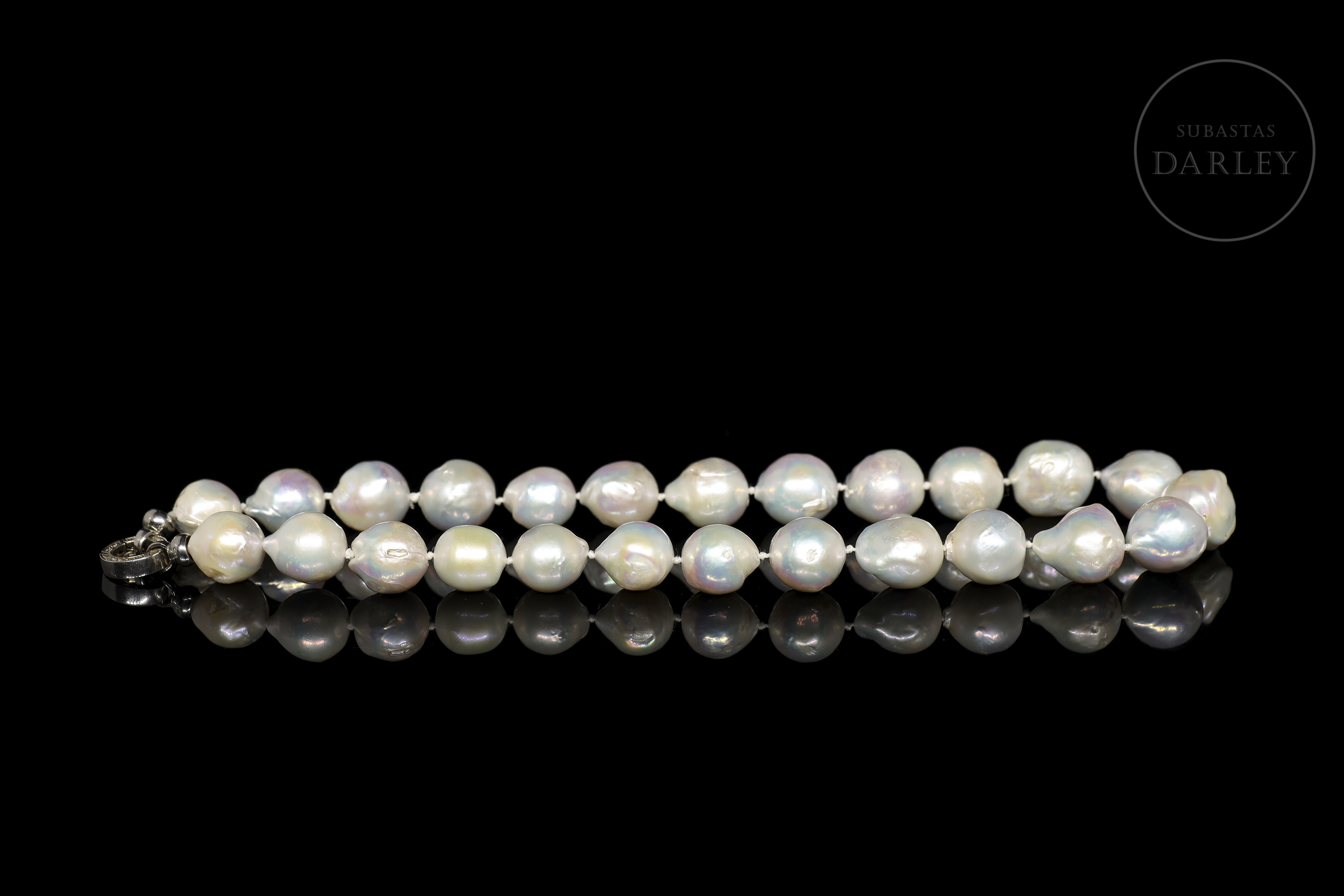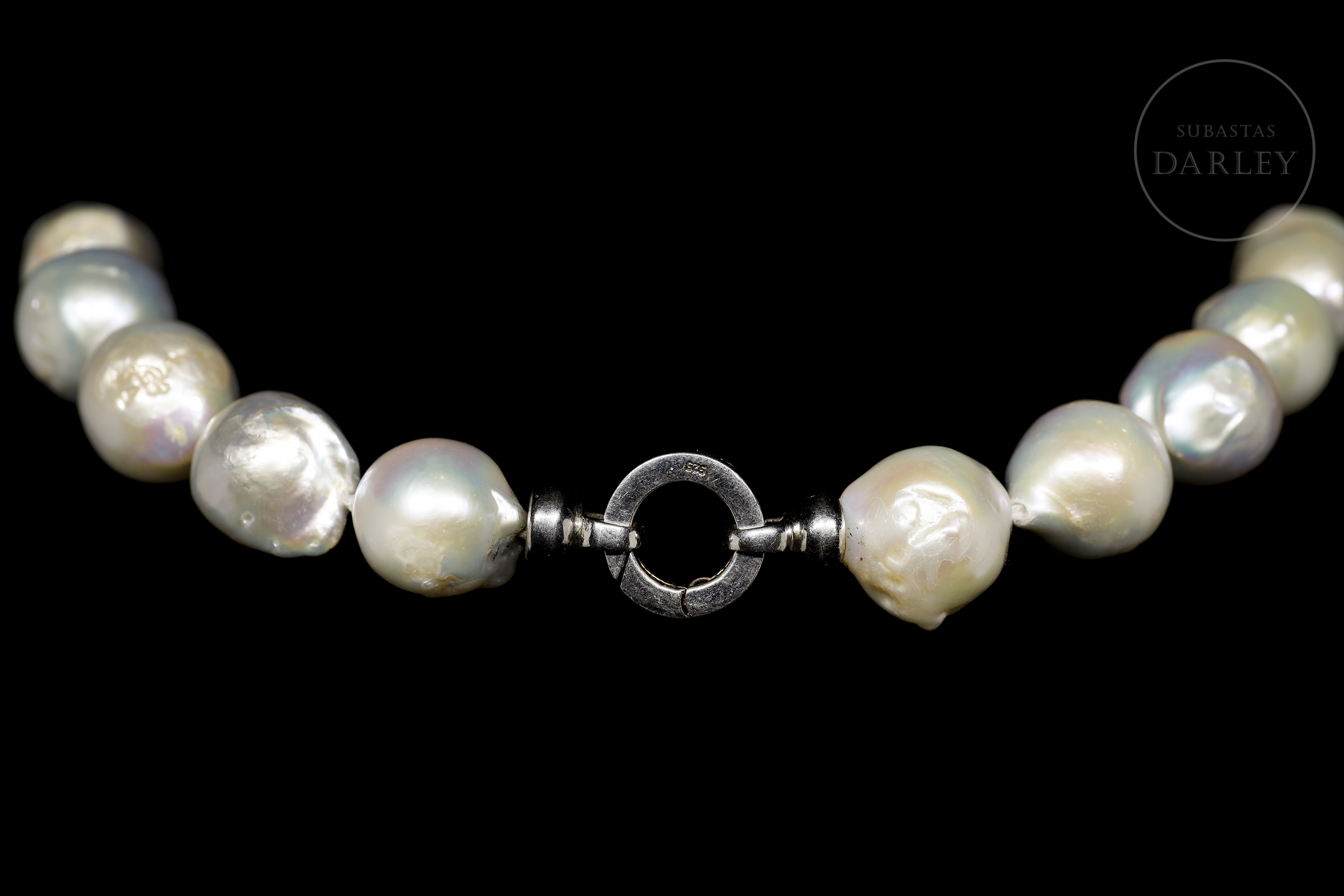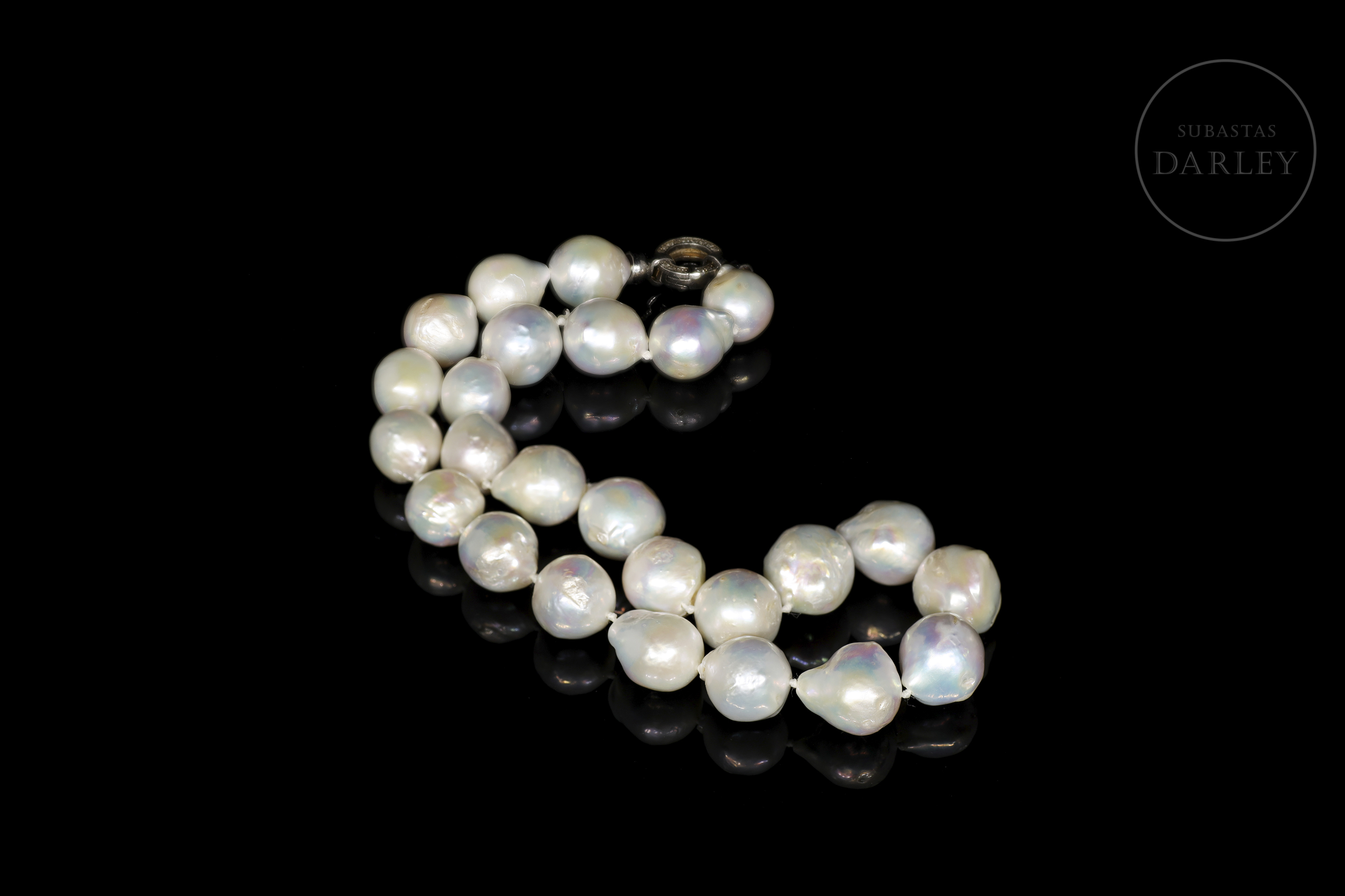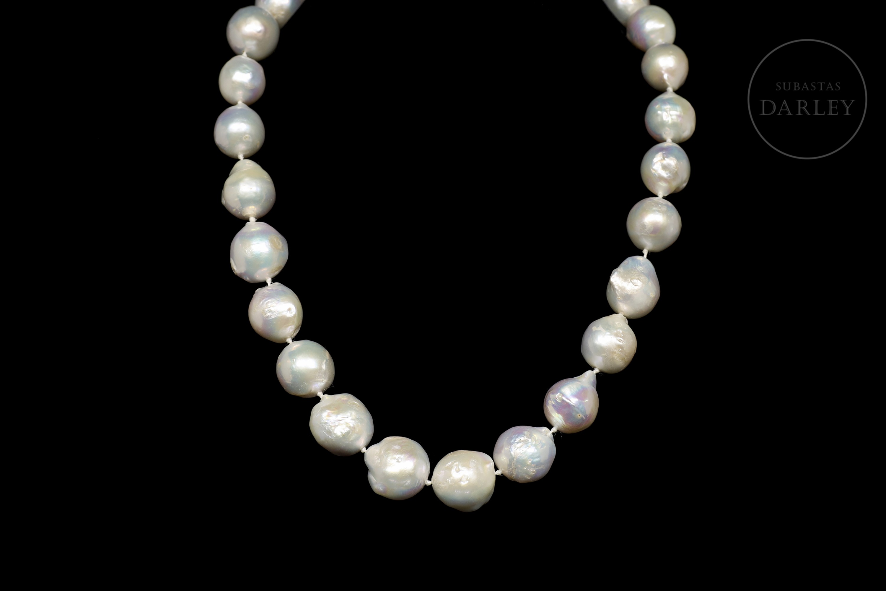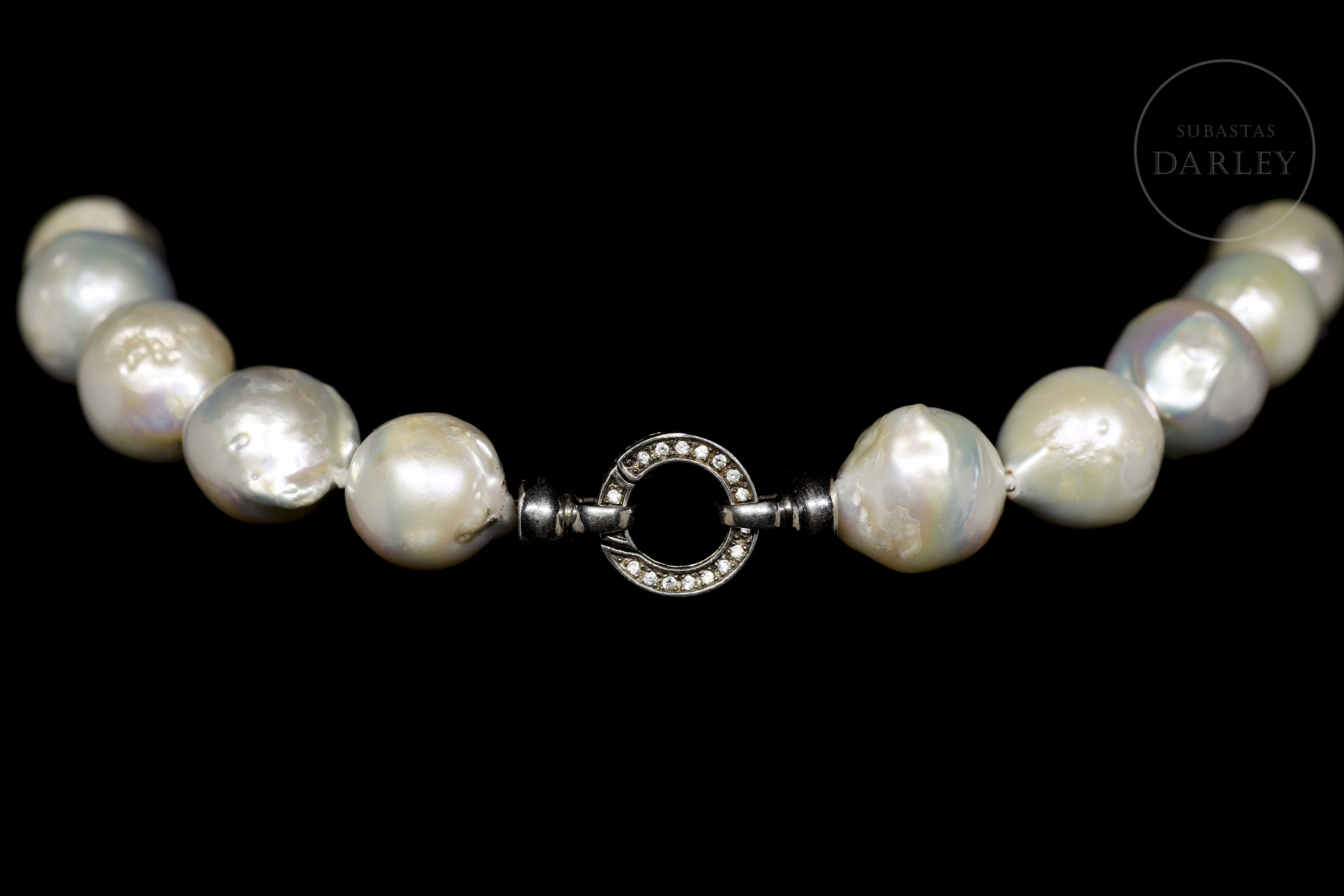 Collar formado por veinticinco perlas barrocas australianas de superficie nacarada y matices iridiscentes, dispuestas en un hilo anudado. El cierre circular, elaborado en plata, decorado con pequeñas piedras engastadas en pavé.