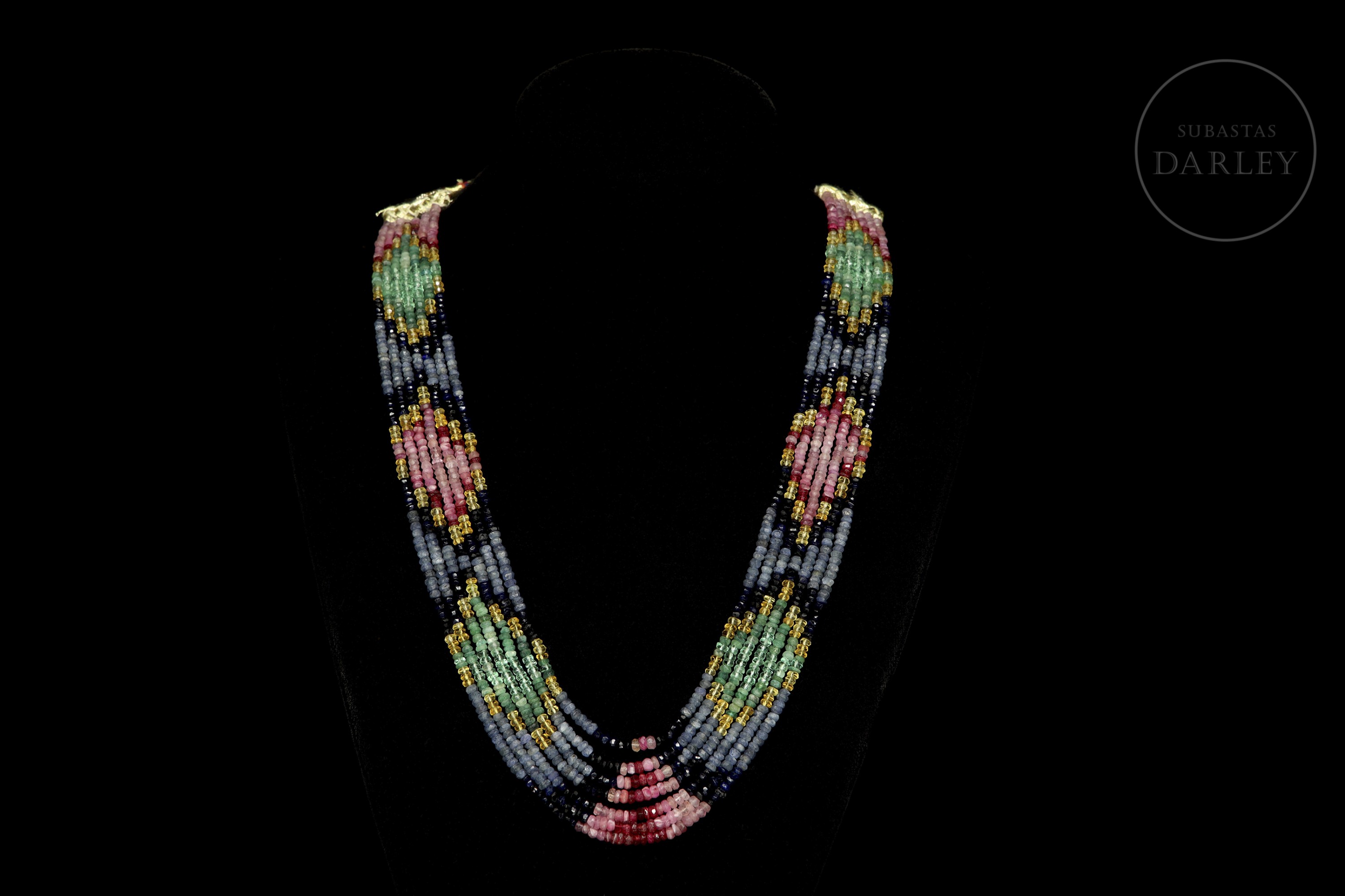 Collar de origen indio, compuesto por siete hileras de cuentas facetadas que forman un vistoso entramado de motivos geométricos. Las hileras alternan una variedad de esmeraldas, rubíes y zafiros azul y amarillo, creando un llamativo contraste cromático. El diseño escalonado permite que las piedras se dispongan en patrones simétricos. Con cierre de nudo corredizo.