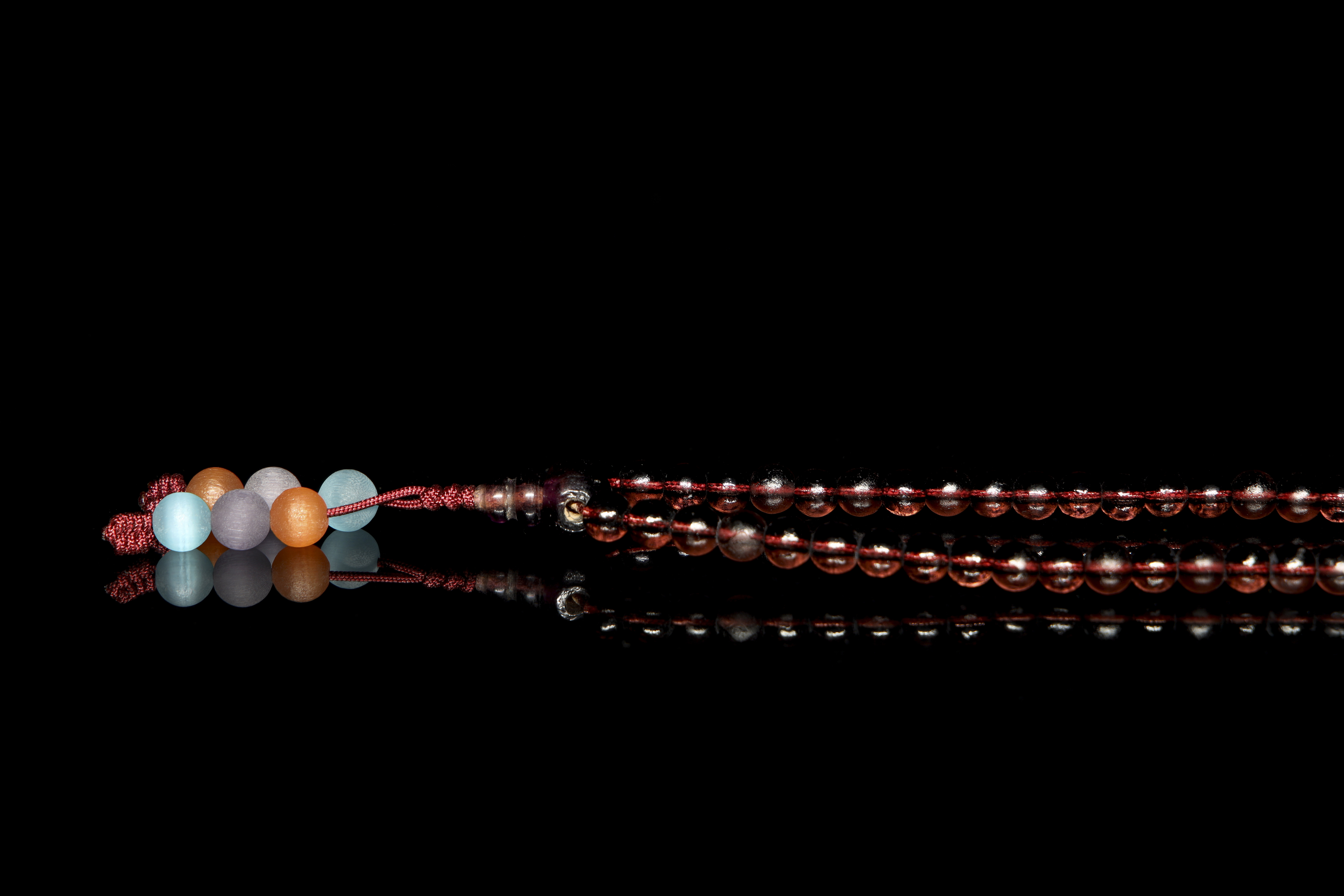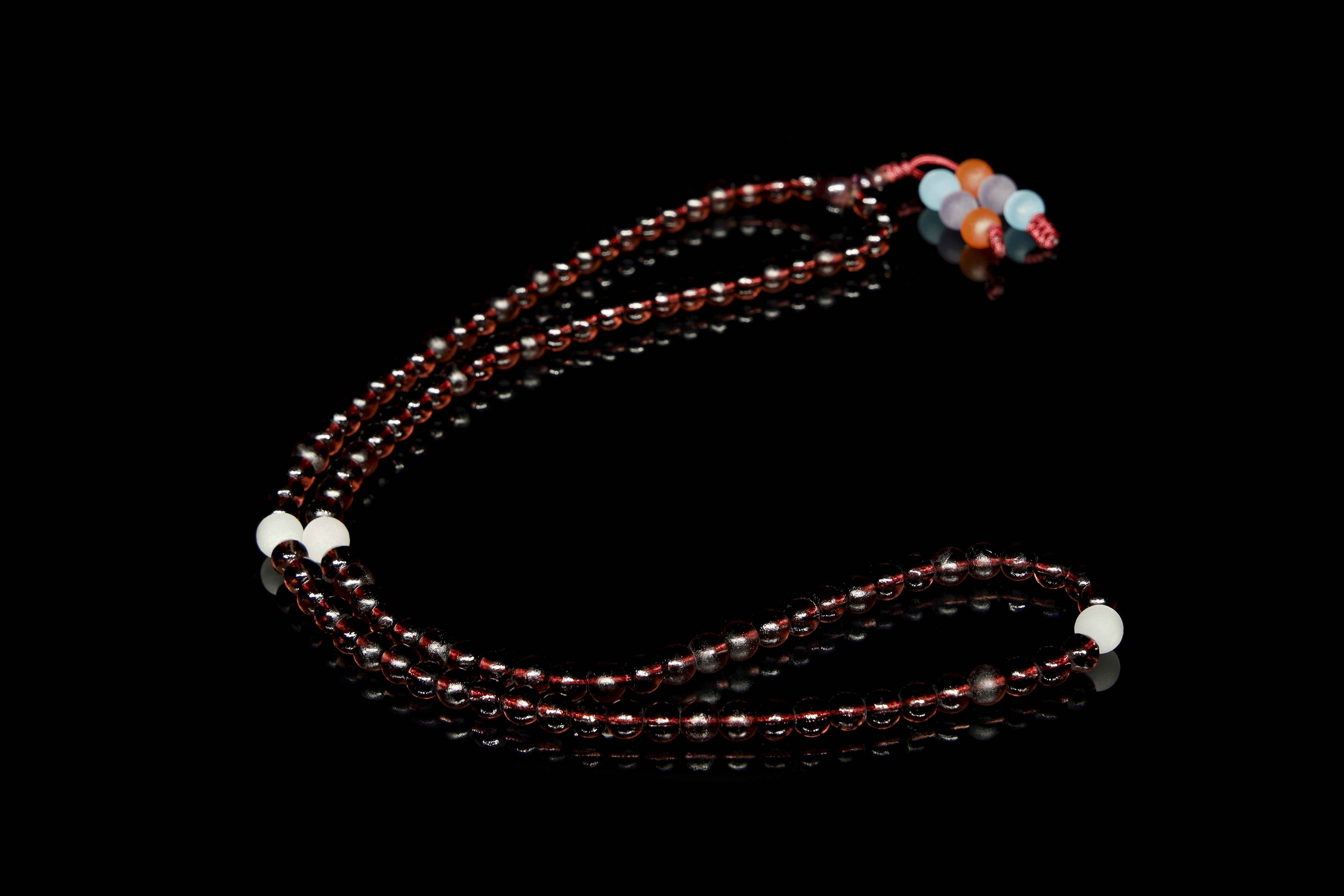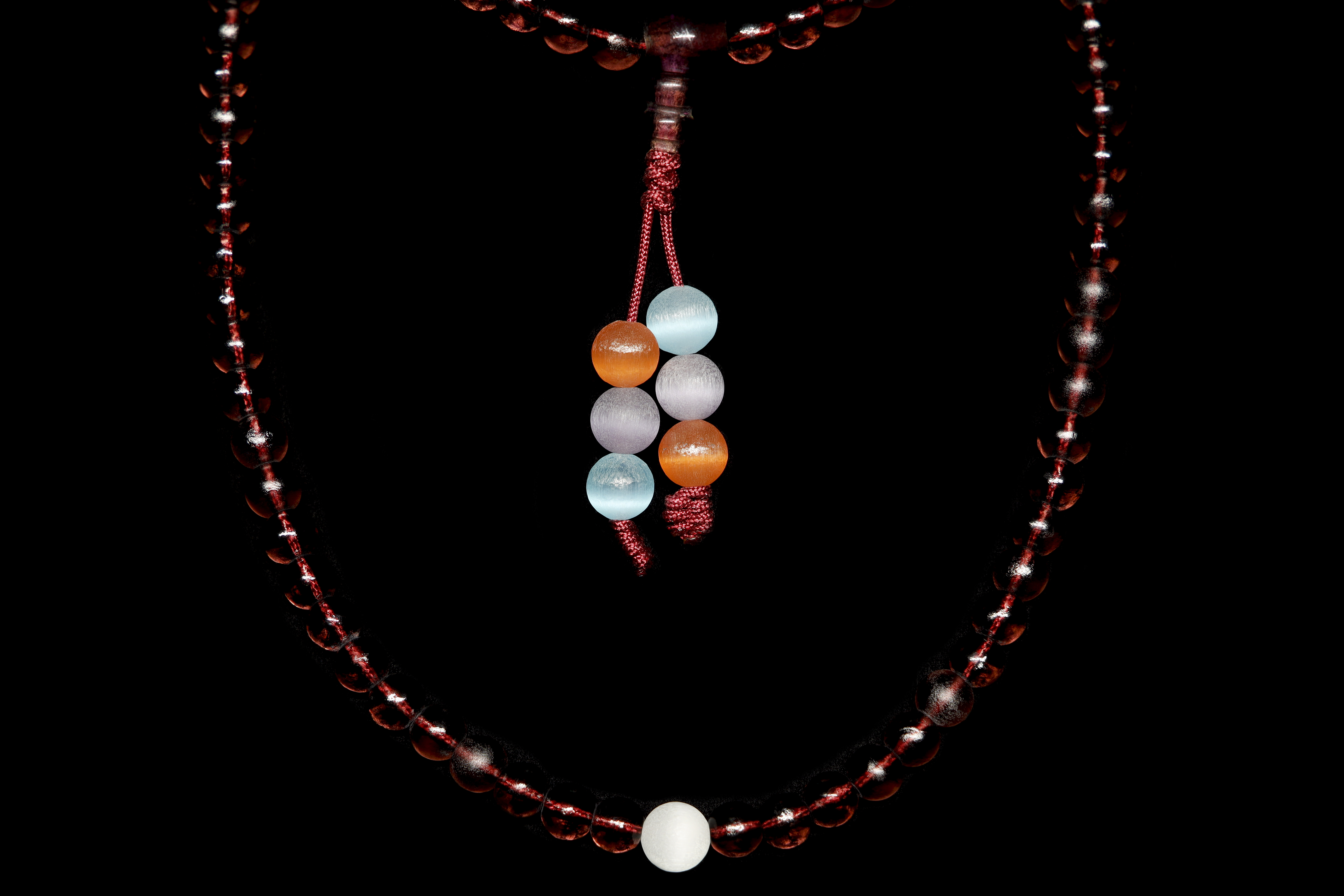 Collar de rosario budista (mala) compuesto por 108 cuentas de liulí "琉璃" esféricas de un tono marrón rojizo translúcido. Está articulado con tres cuentas espaciadoras de vidrio blanco opaco. El remate o "gurú" presenta un conjunto de seis cuentas de vidrio tipo "ojo de gato" en varios colores (naranja, azul, lila y blanco).