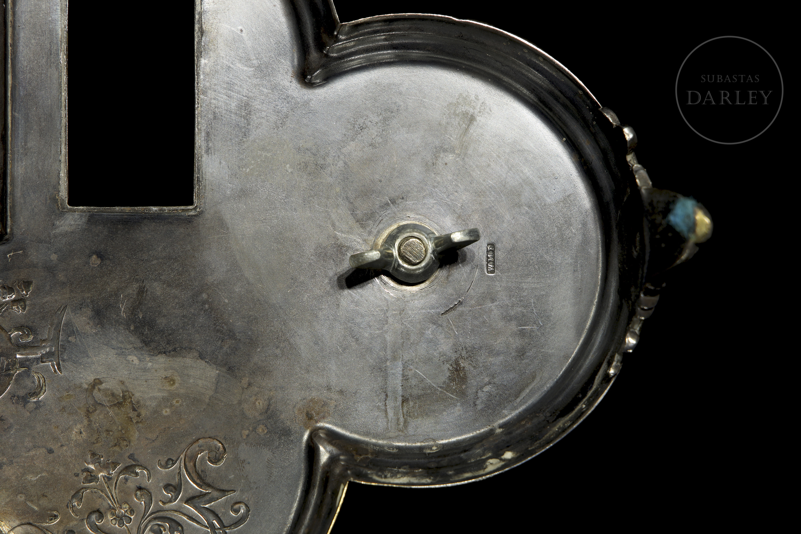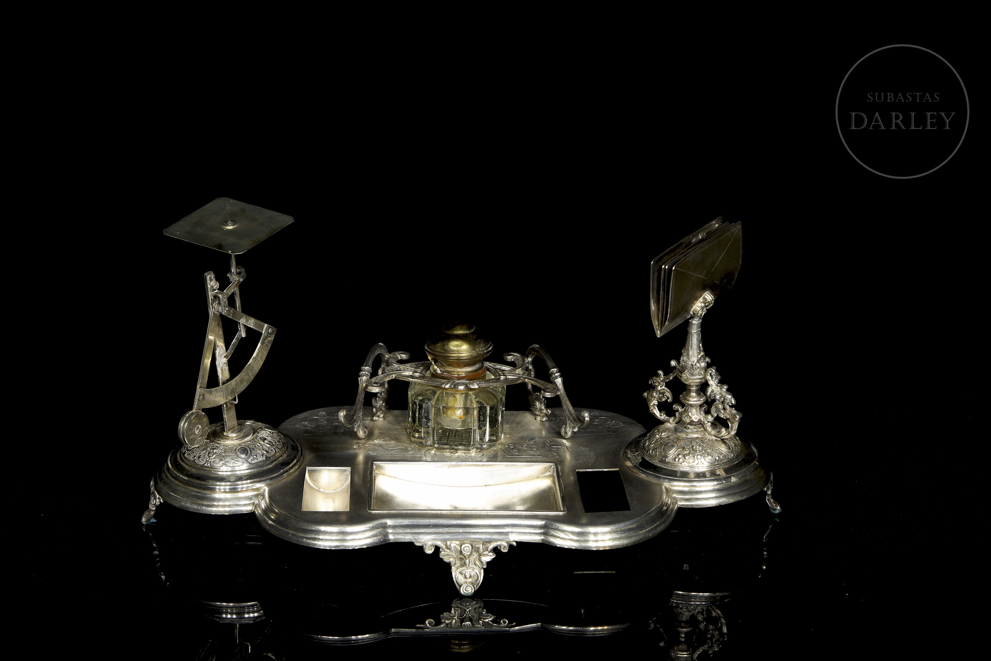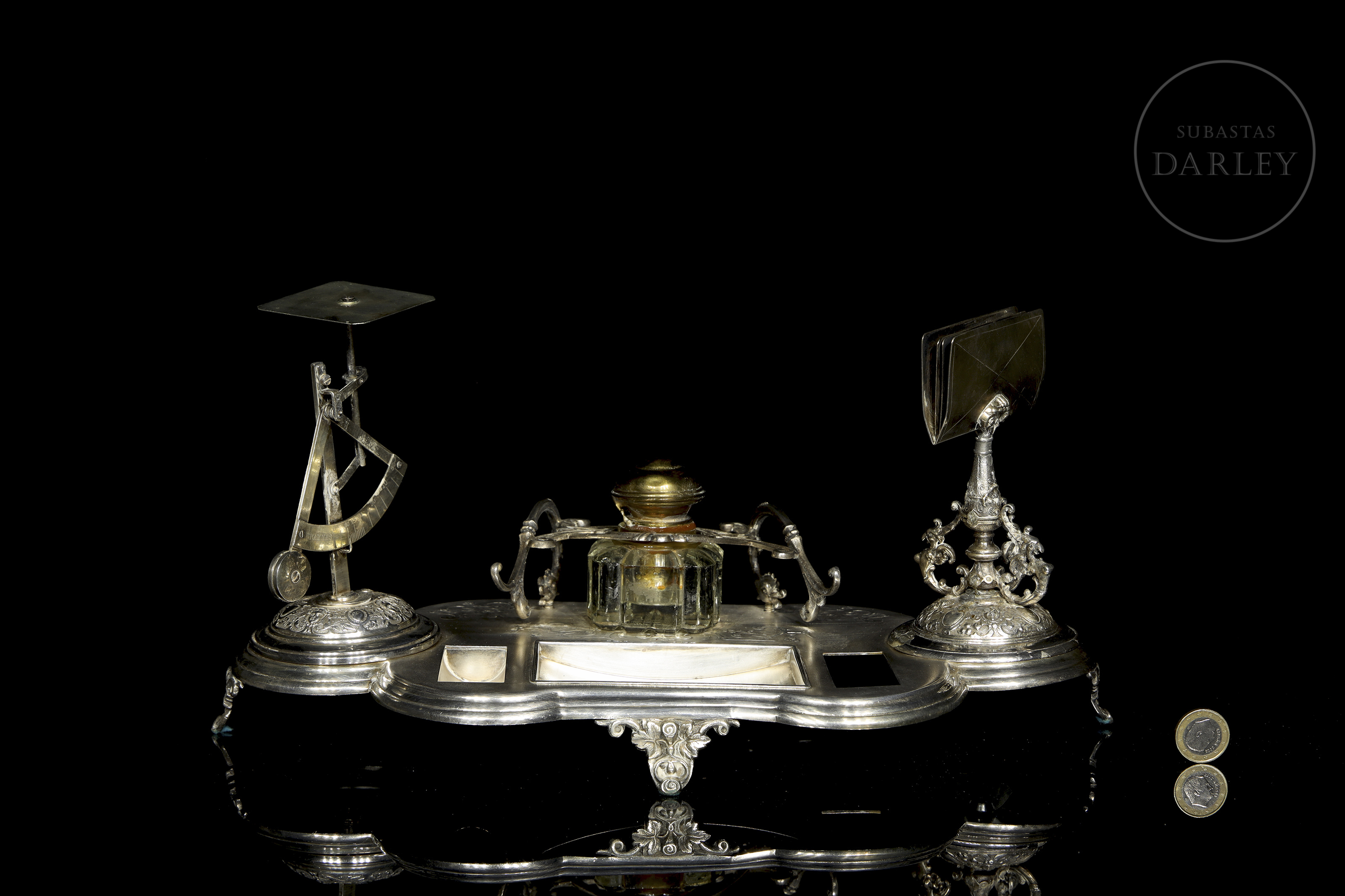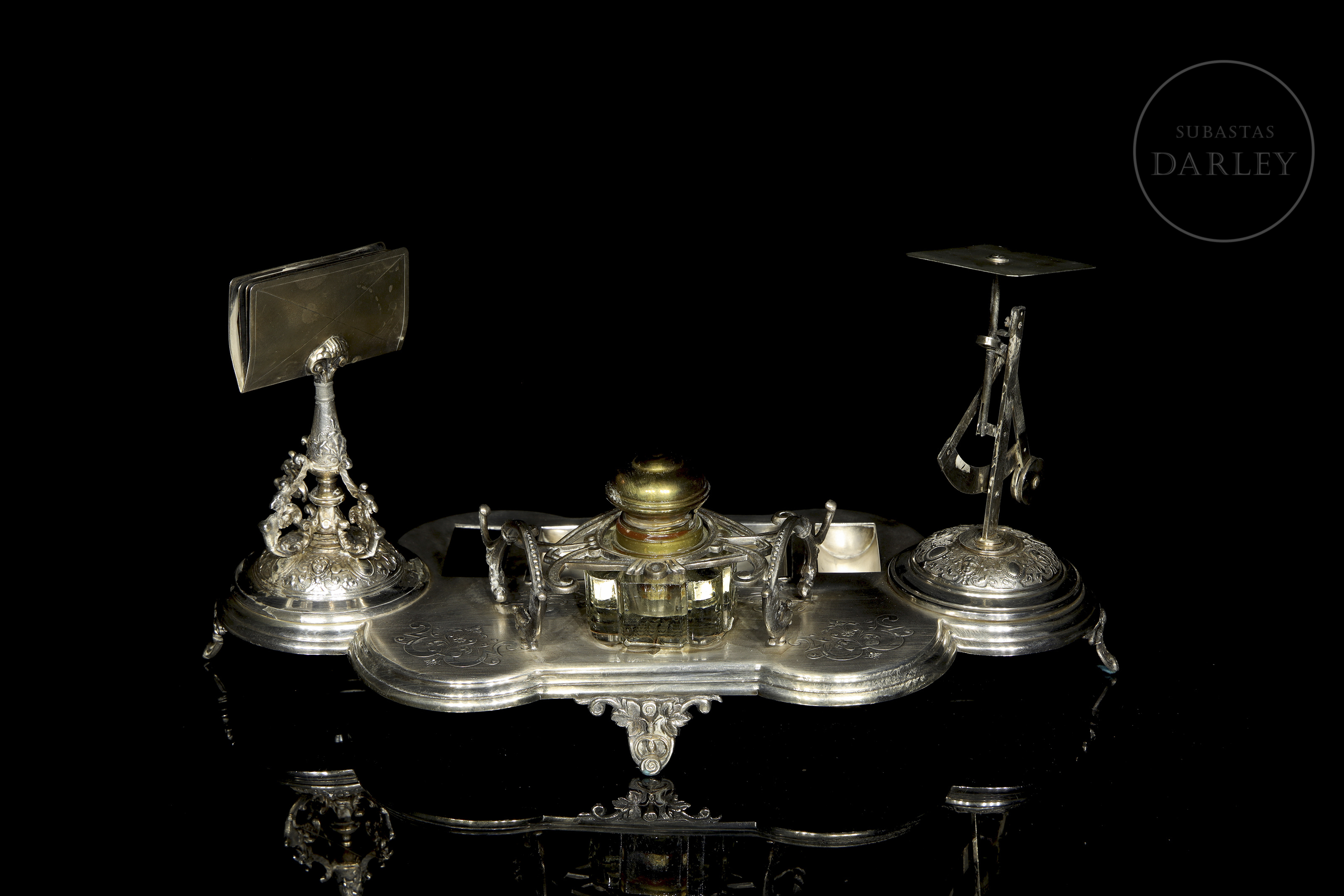 Completo conjunto de escritorio realizado enmetal plateado y vidrio, que destaca por incluir accesorios técnicos como una balanza para correspondencia, un tintero central de vidrio tallado y un tarjetero. Presenta una base polilobulada de estilo ecléctico con profusa decoración en relieve de motivos vegetales y volutas.