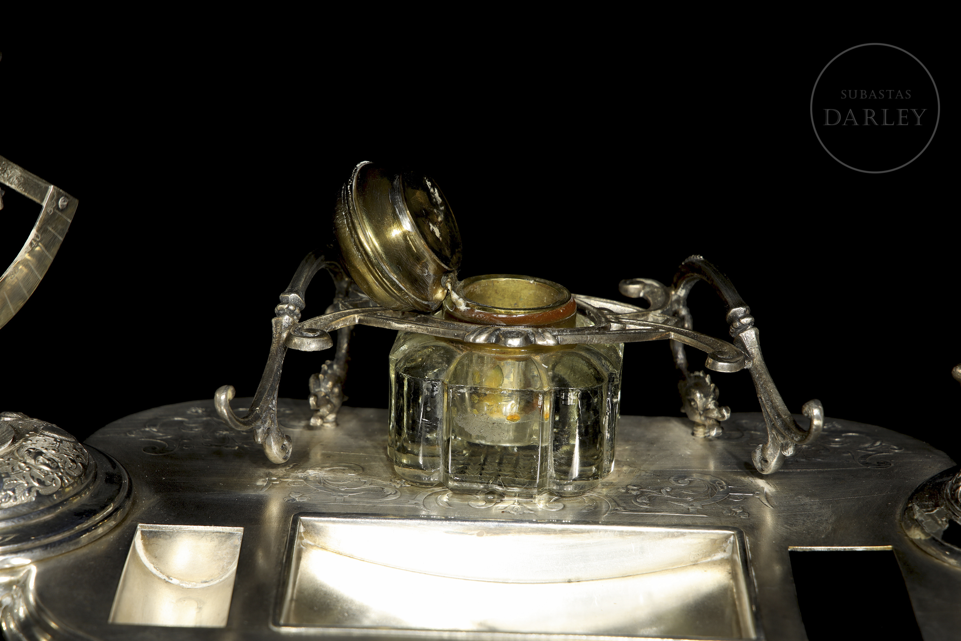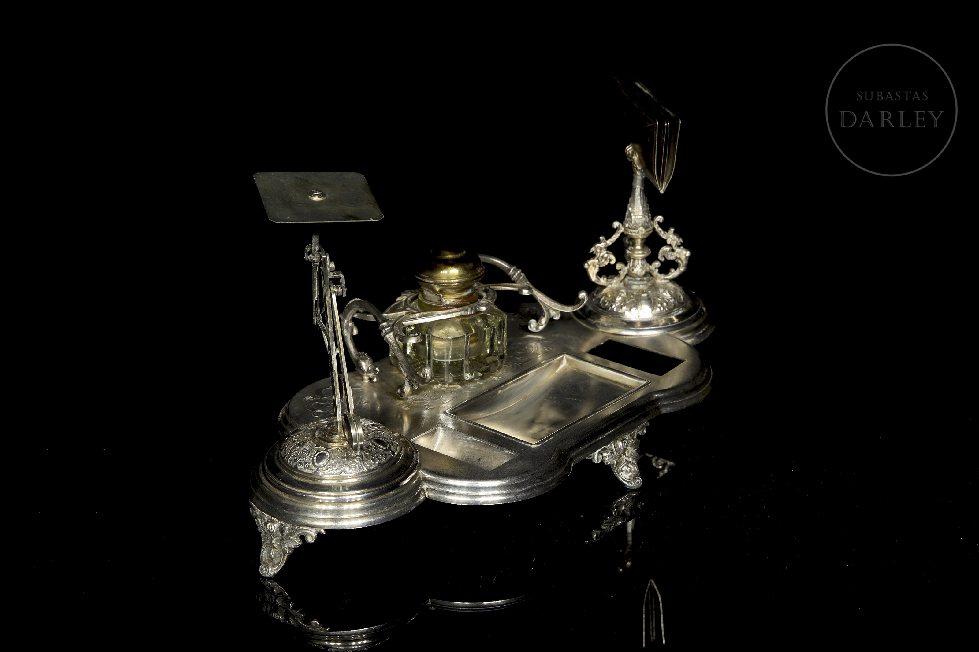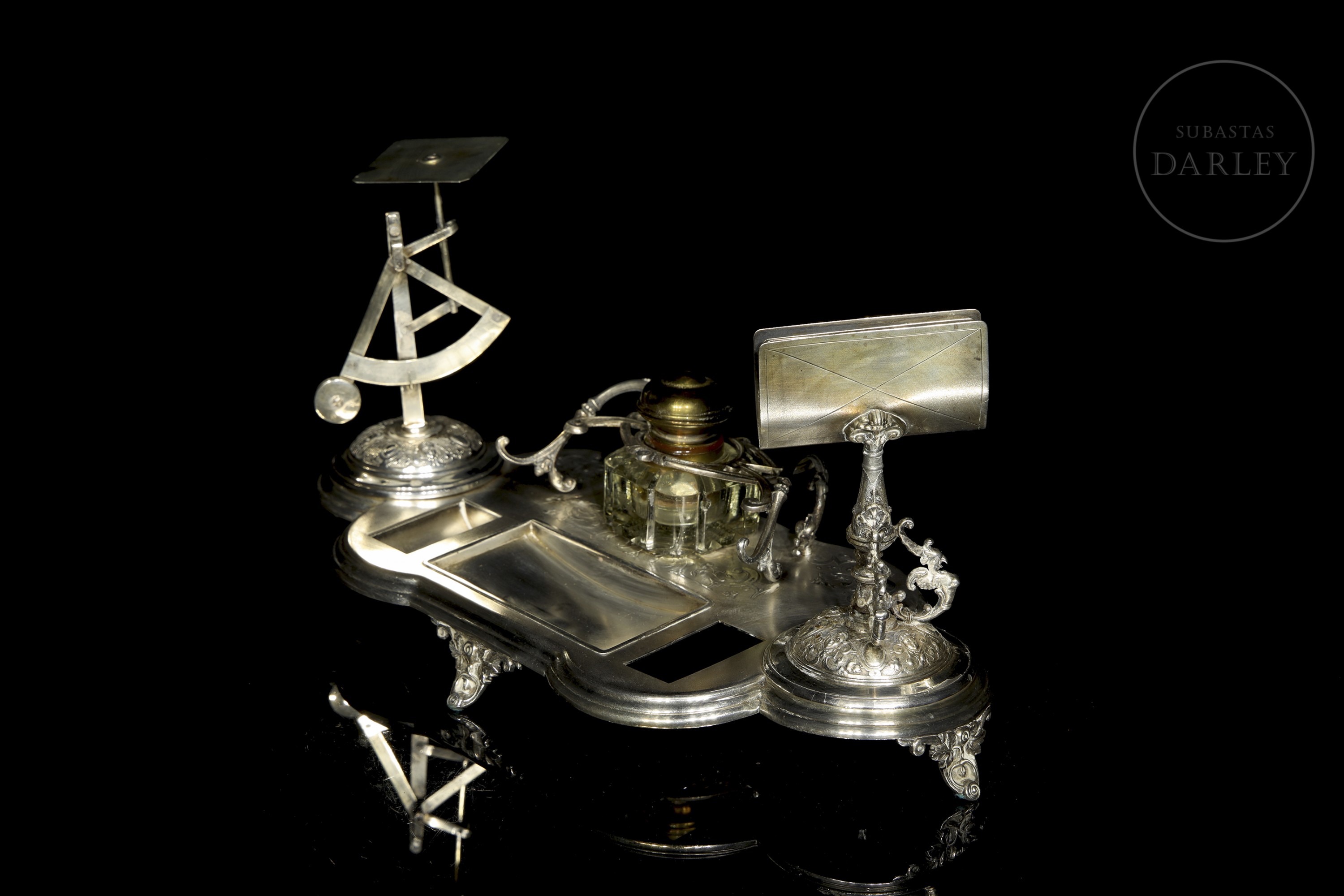 Completo juego de escribanía en metal plateado, pps. s.XX