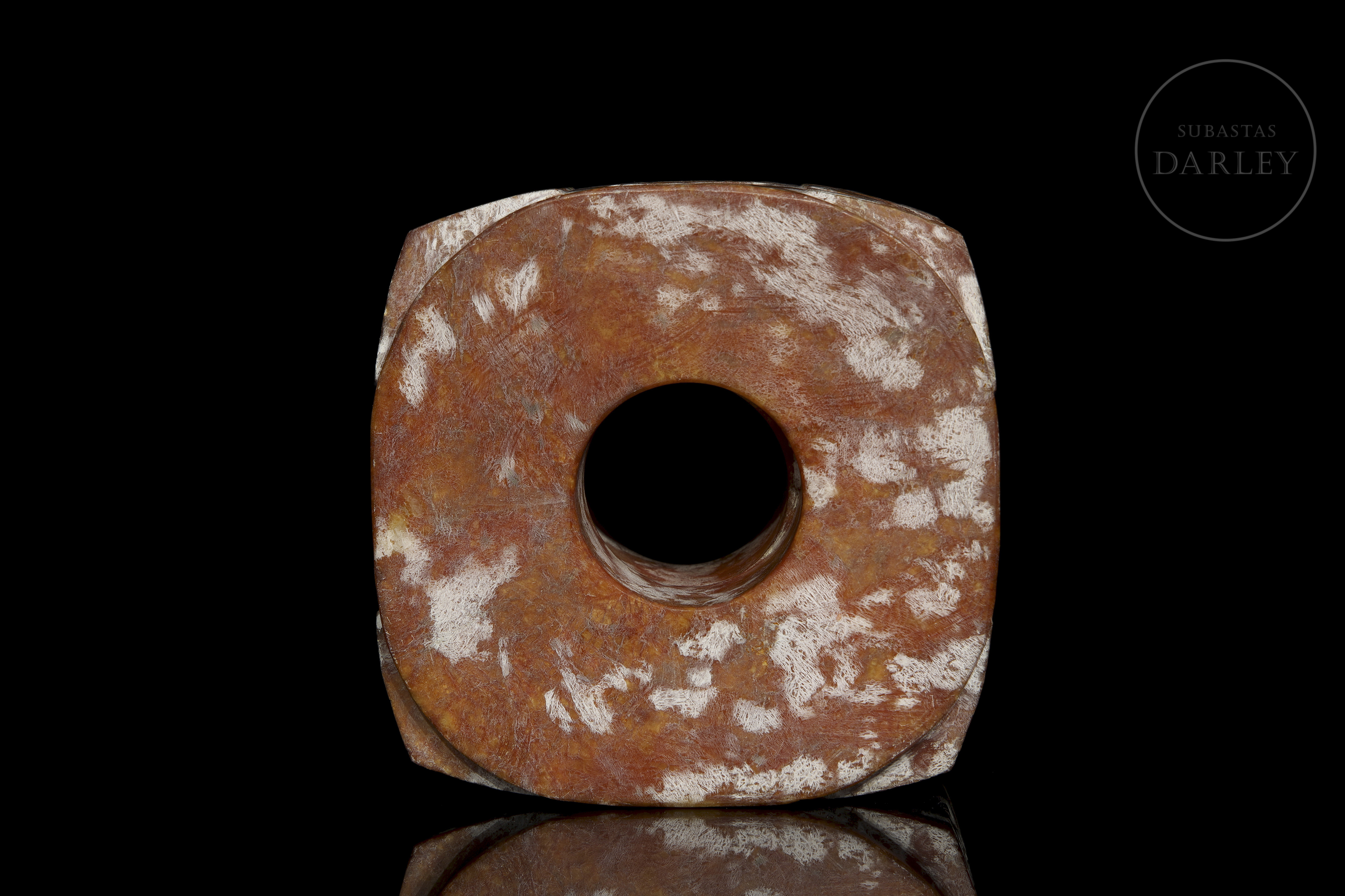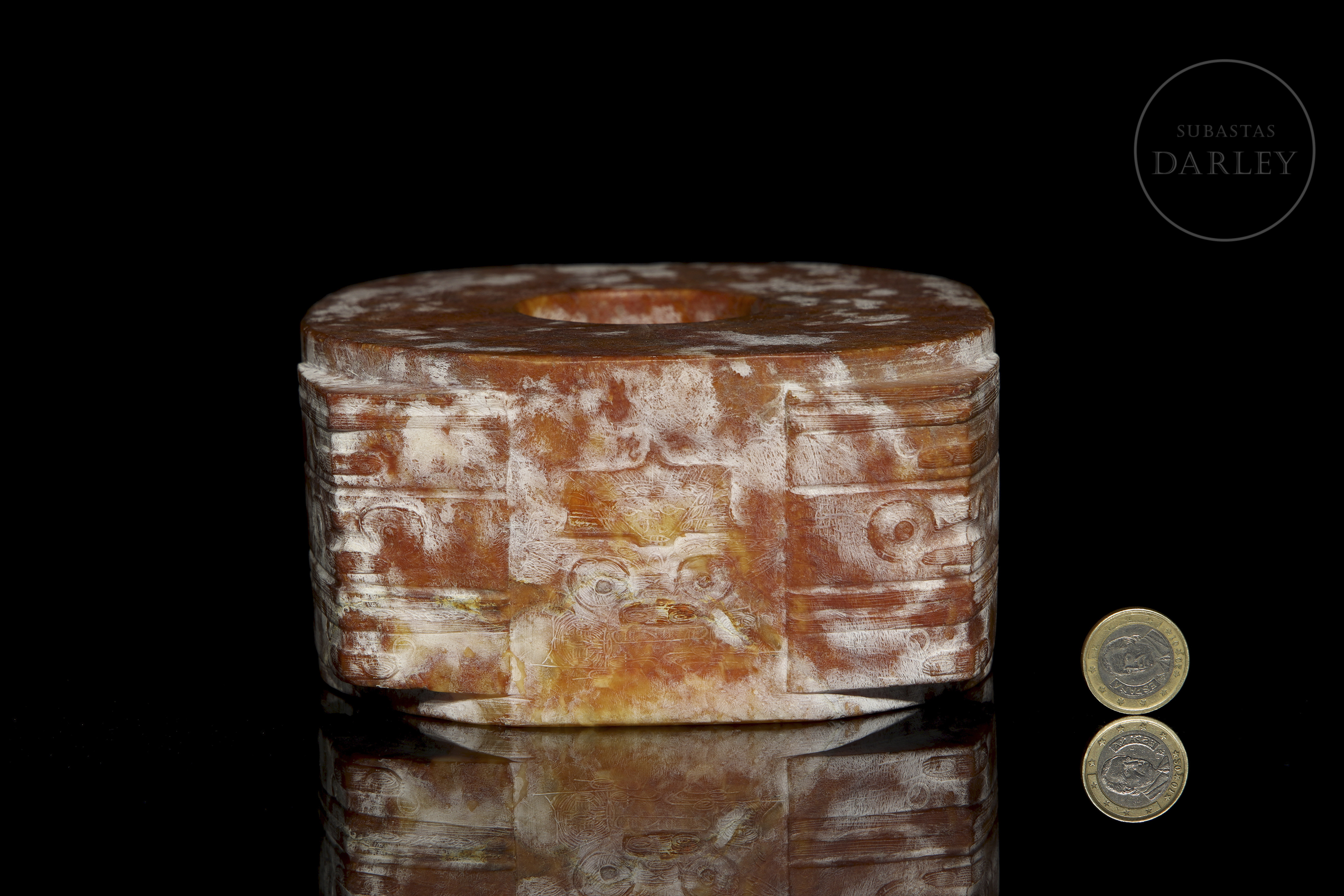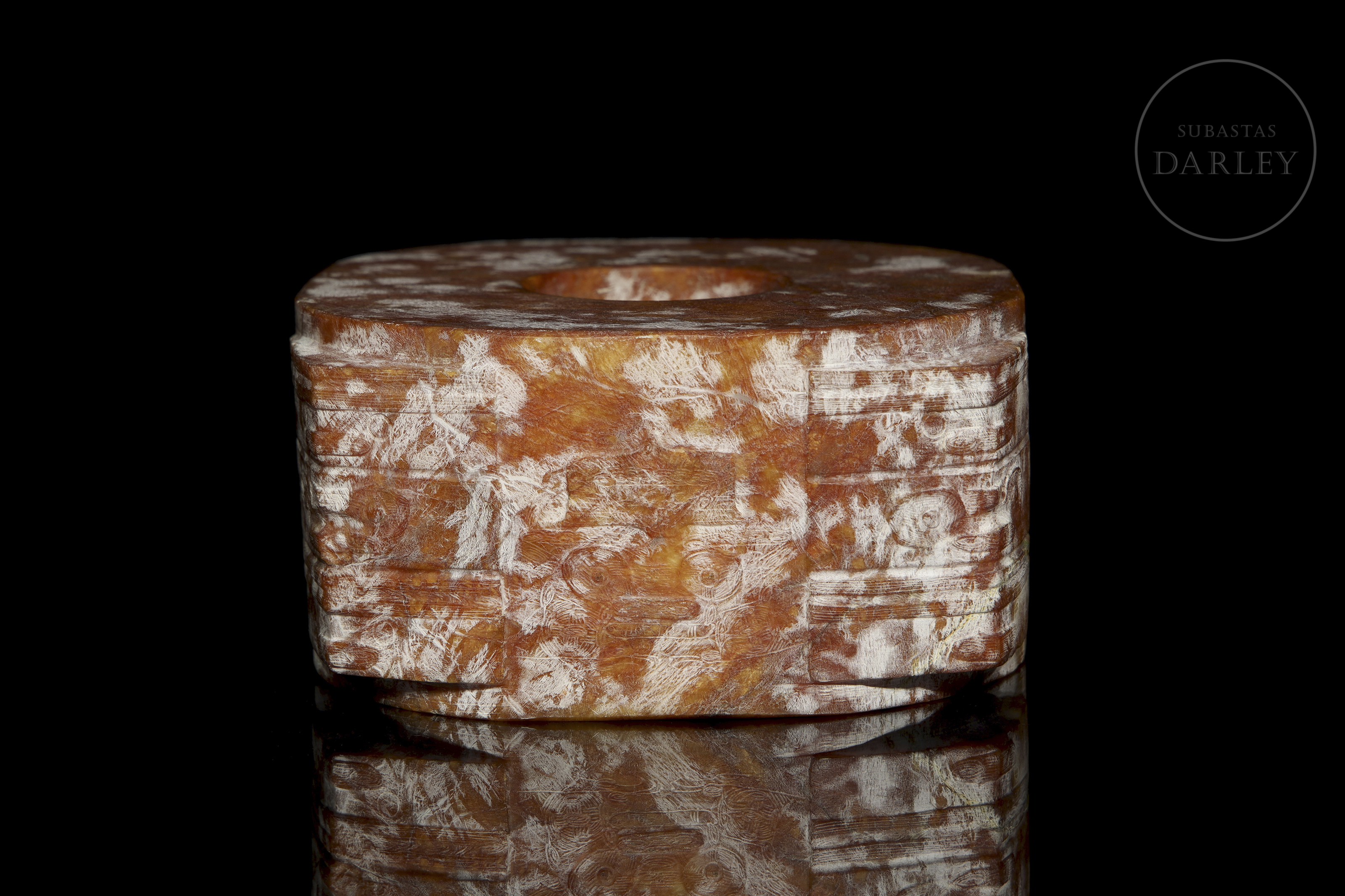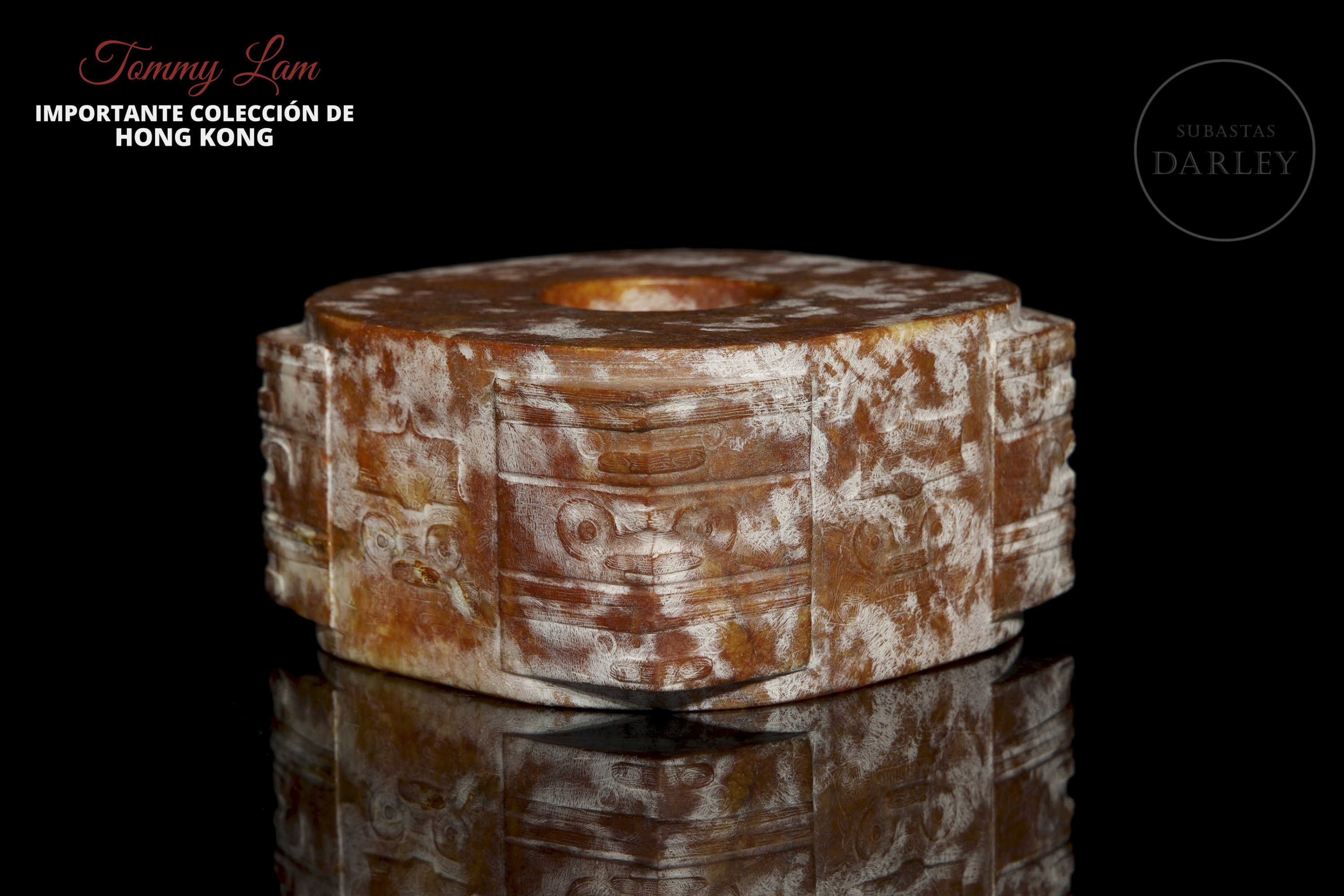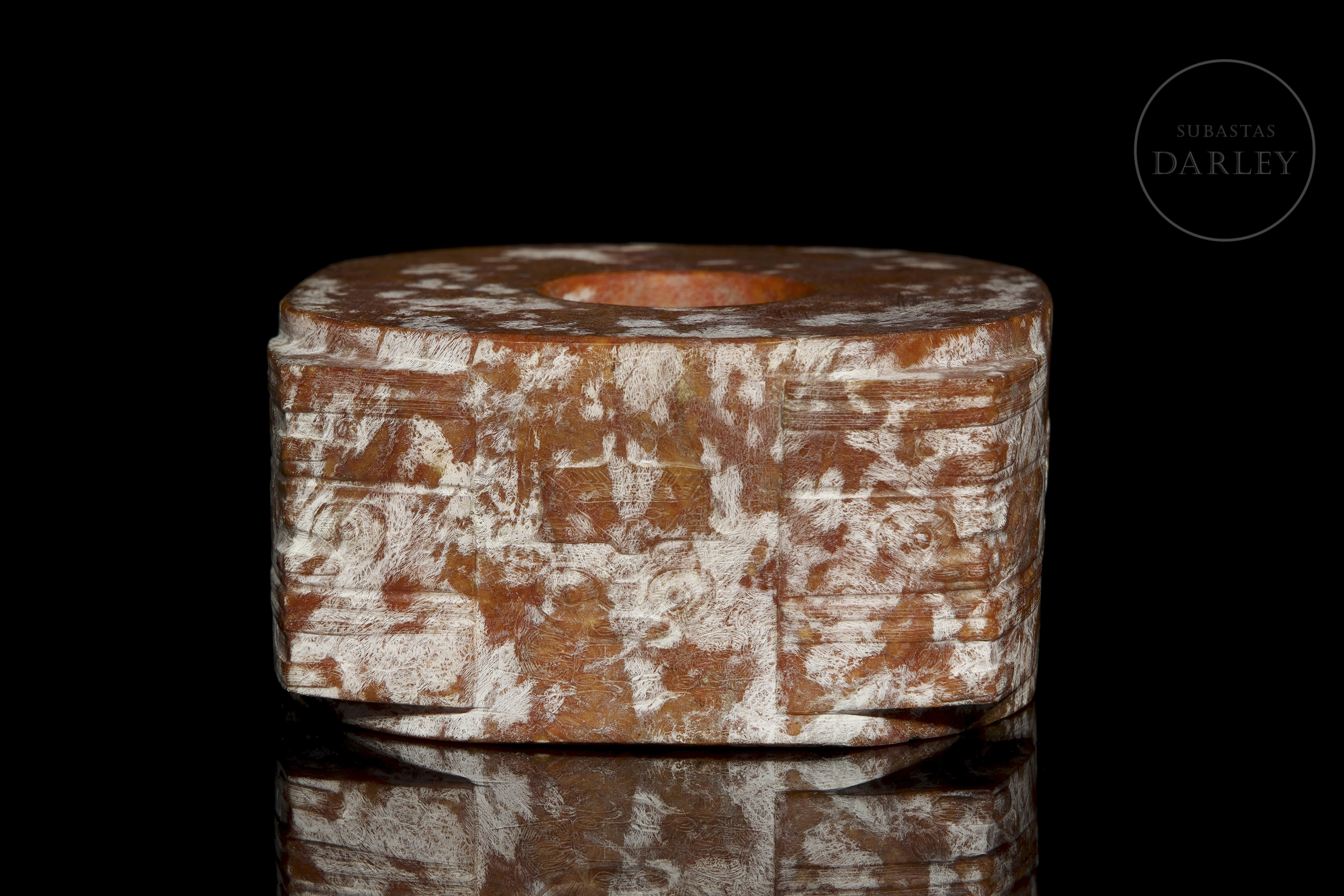 Jade tallado de una tonalidad rojiza con una profusa pátina y vetas blanquecinas. La pieza presenta el formato clásico de un cilindro hueco, inscrito en un prisma cuadrangular. Destaca la decoración en sus esquinas y laterales, talladas en bajorrelieve con máscaras taotie, de grandes ojos y bandas horizontales. Cultura Liangzhu (aprox. 3300–2300 a.C.) o posterior.