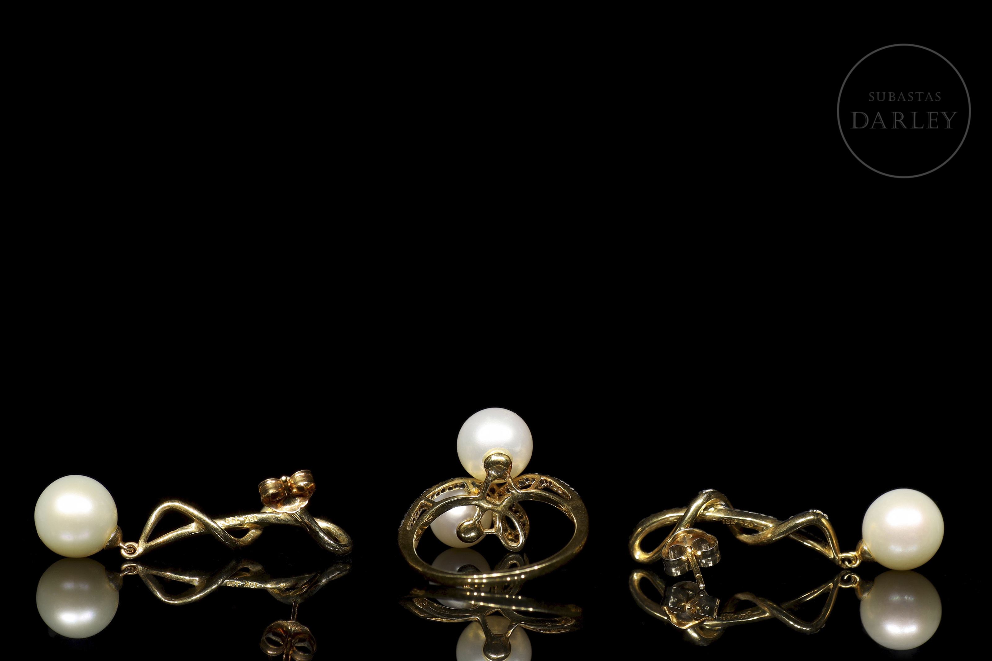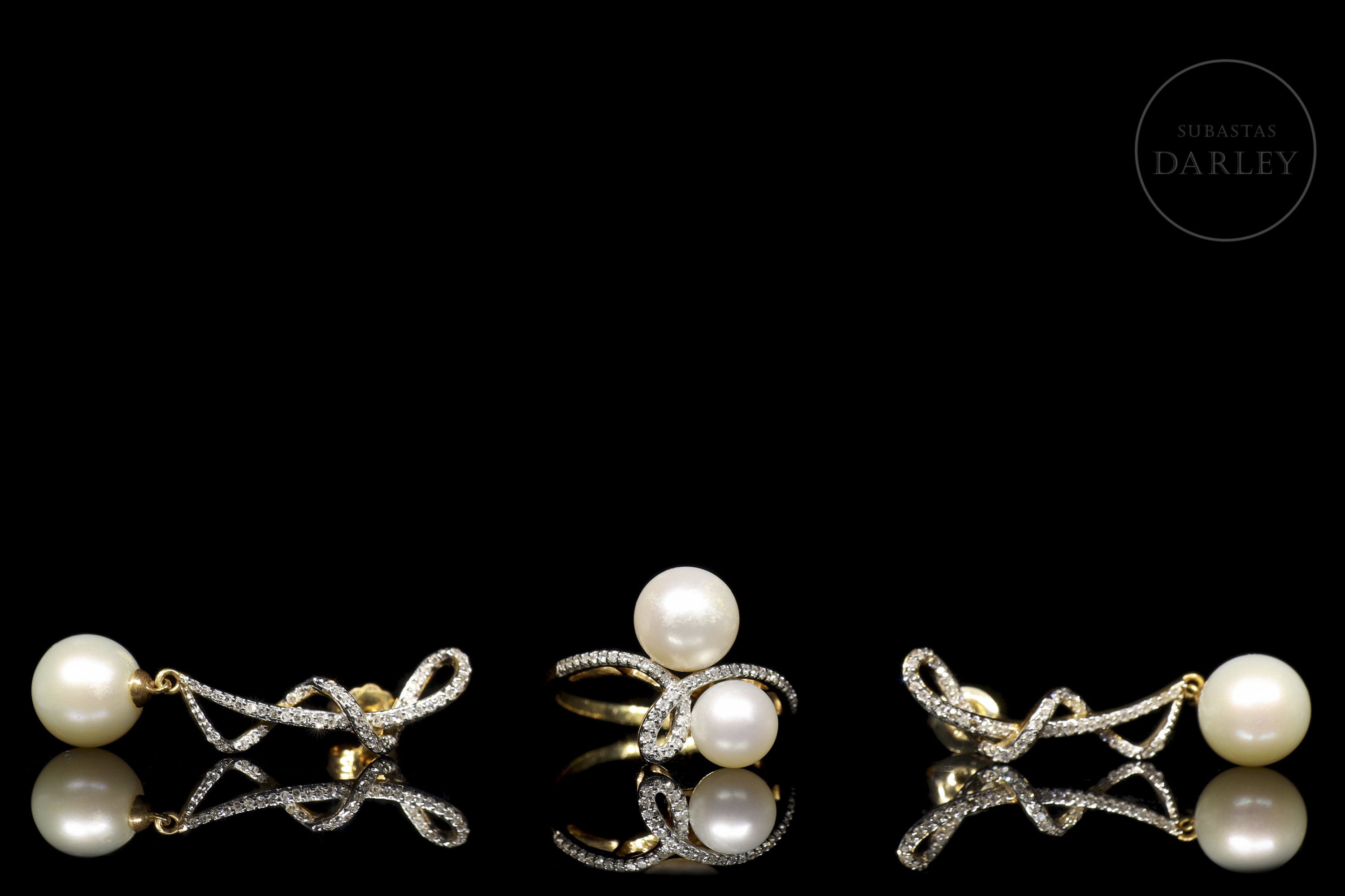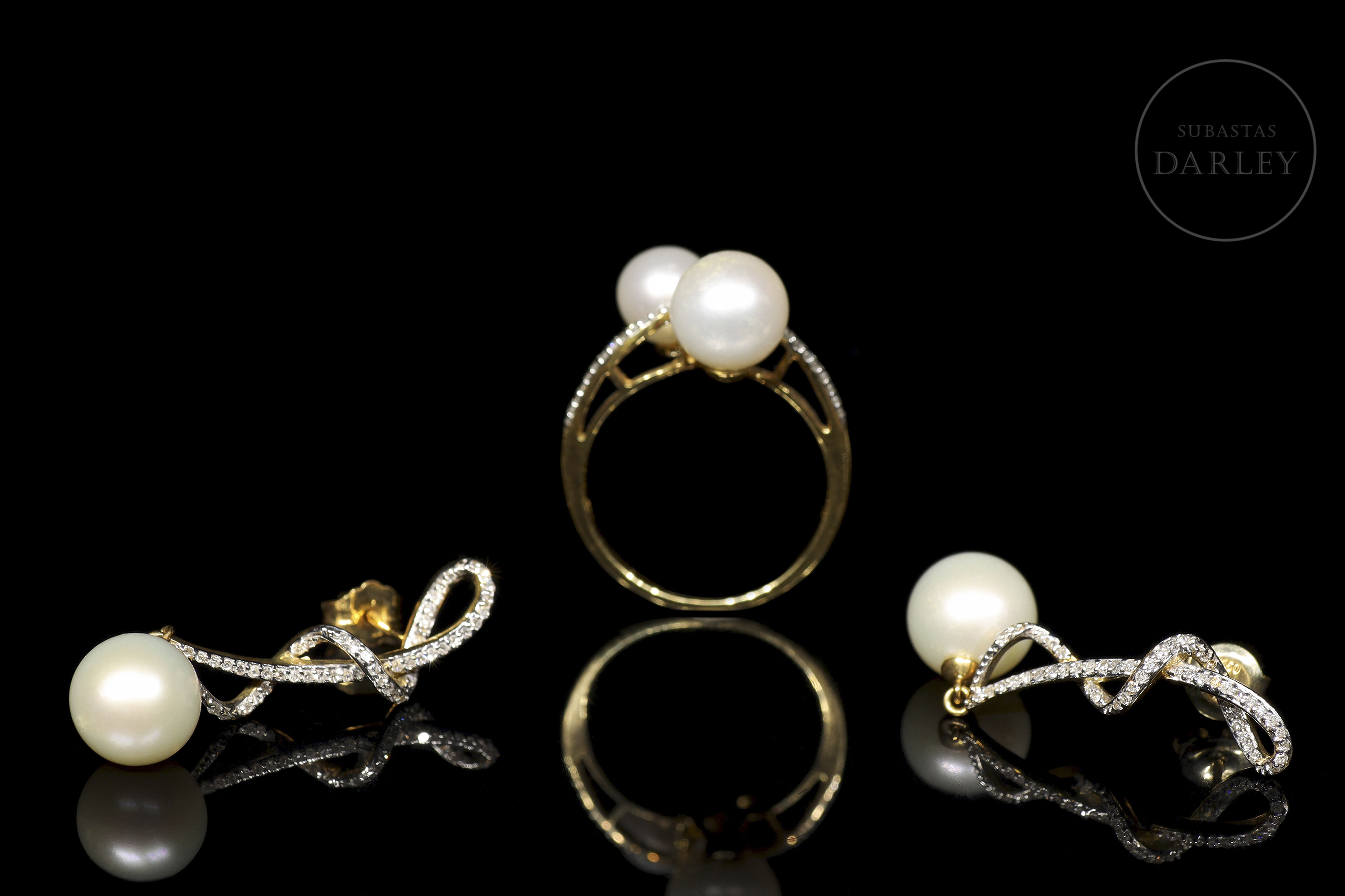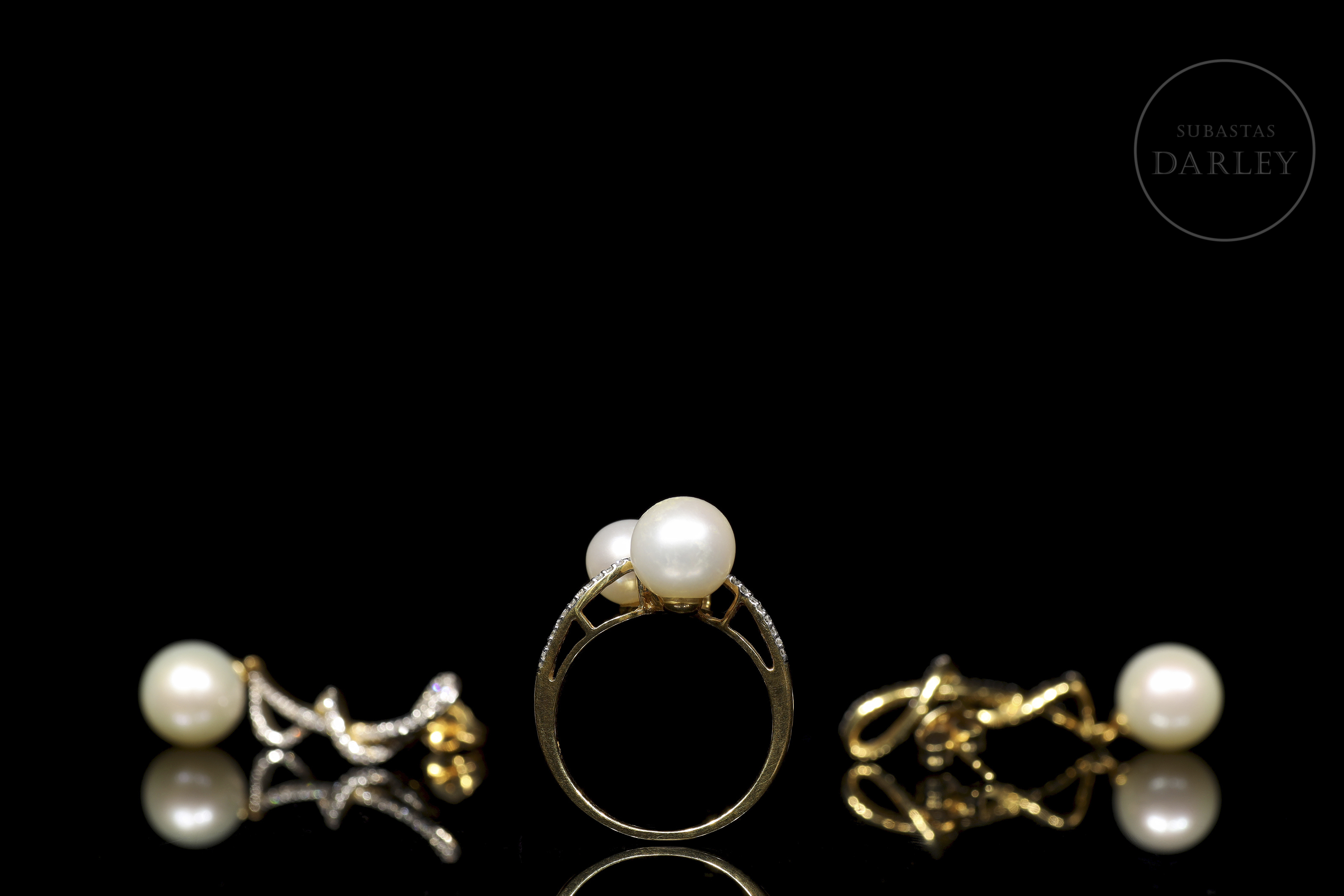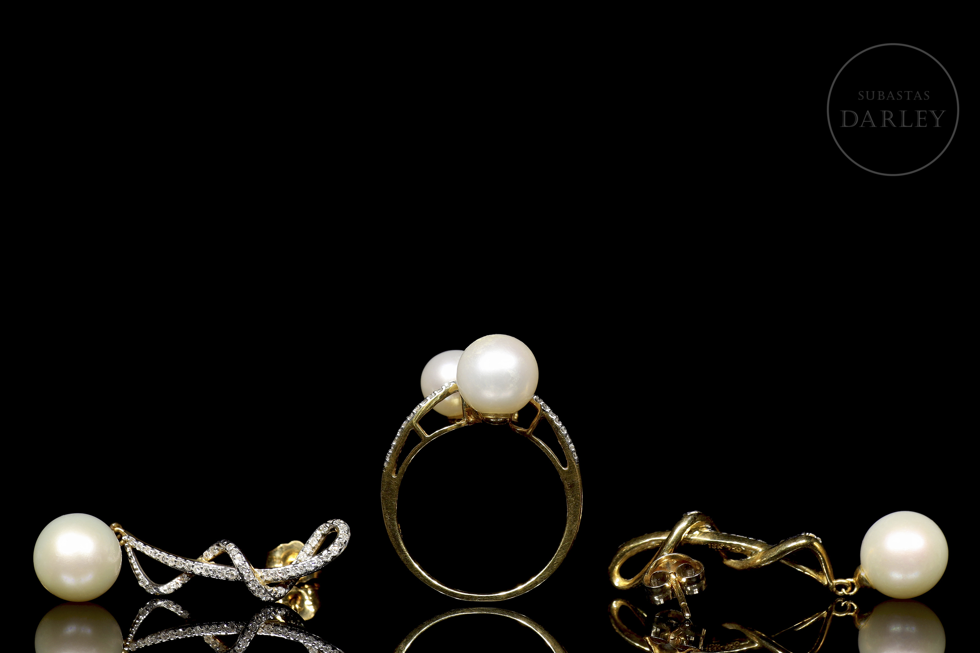 Conjunto de anillo y pendientes de oro amarillo de 18k, perlas y diamantes