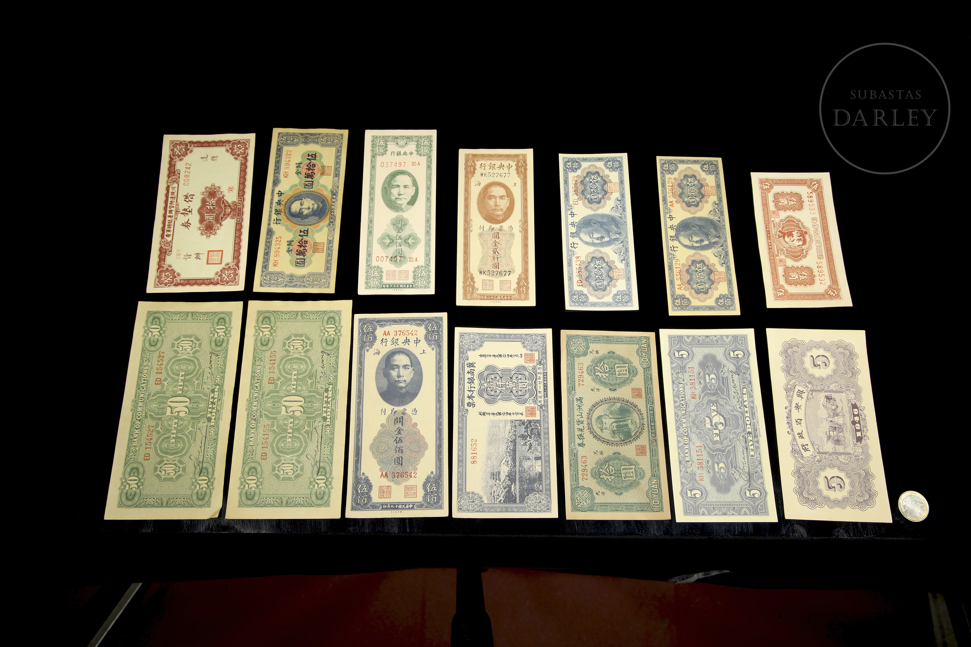 Interesante conjunto compuesto por diversos billetes chinos emitidos a lo largo del siglo XX, pertenecientes a distintas entidades bancarias y periodos históricos. La colección incluye ejemplares de diferentes denominaciones y diseños, algunos con motivos arquitectónicos, paisajes y retratos de figuras relevantes. Se aprecian inscripciones tanto en caracteres chinos como en inglés en algunos billetes, reflejando la diversidad económica y política de la época. Las piezas muestran una variada gama cromática y estilos gráficos propios de las emisiones de principios y mediados del siglo pasado.