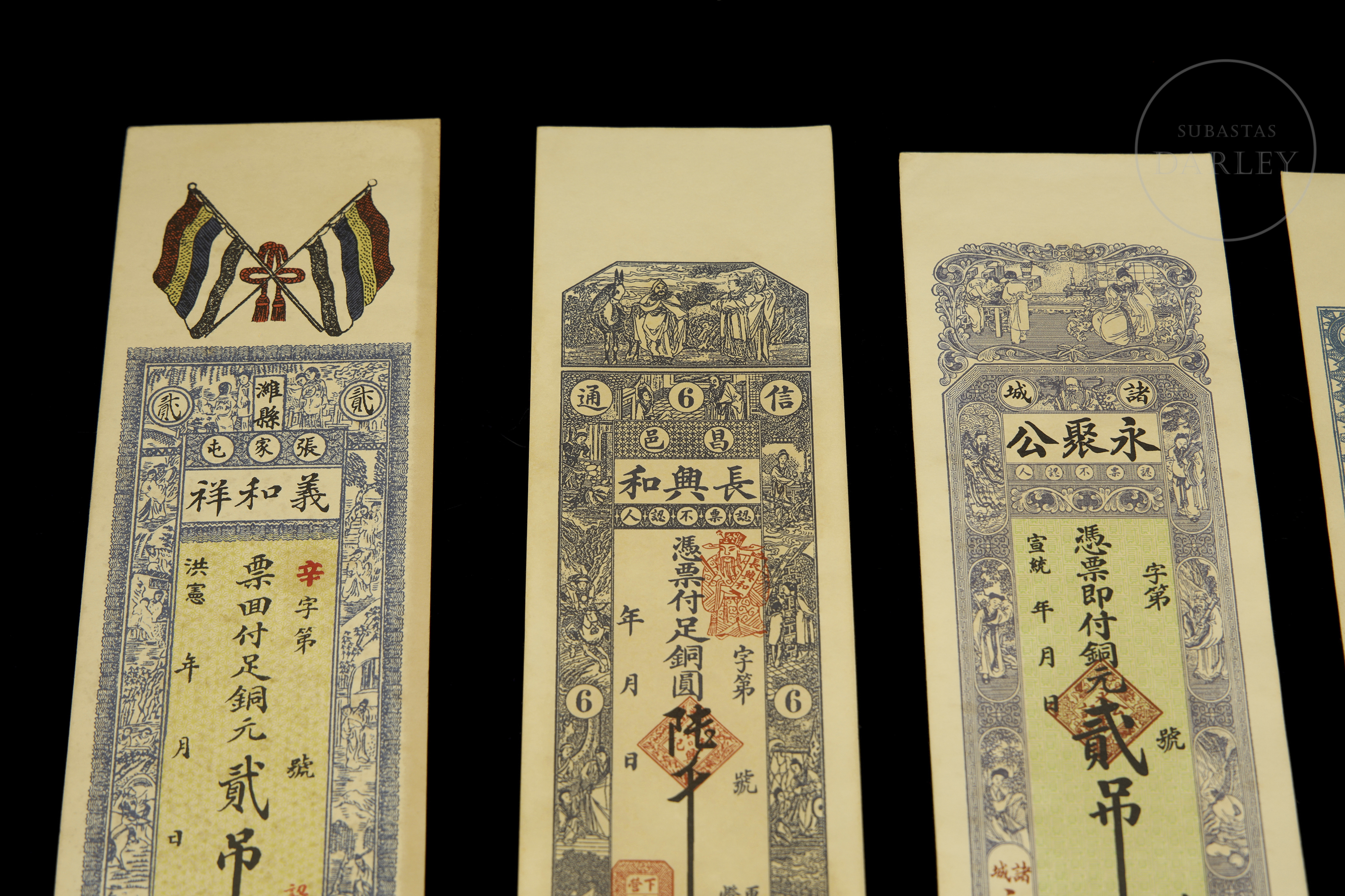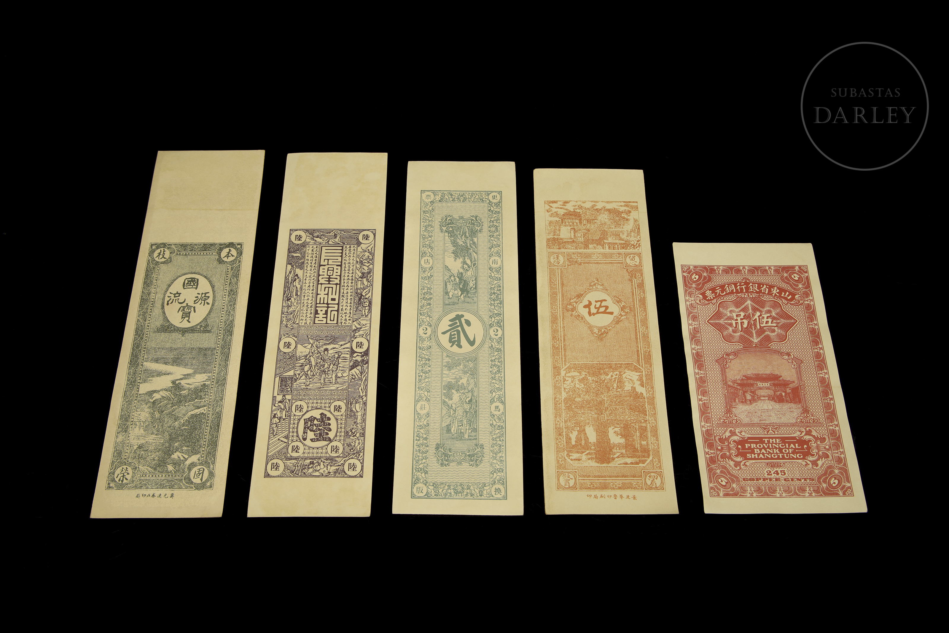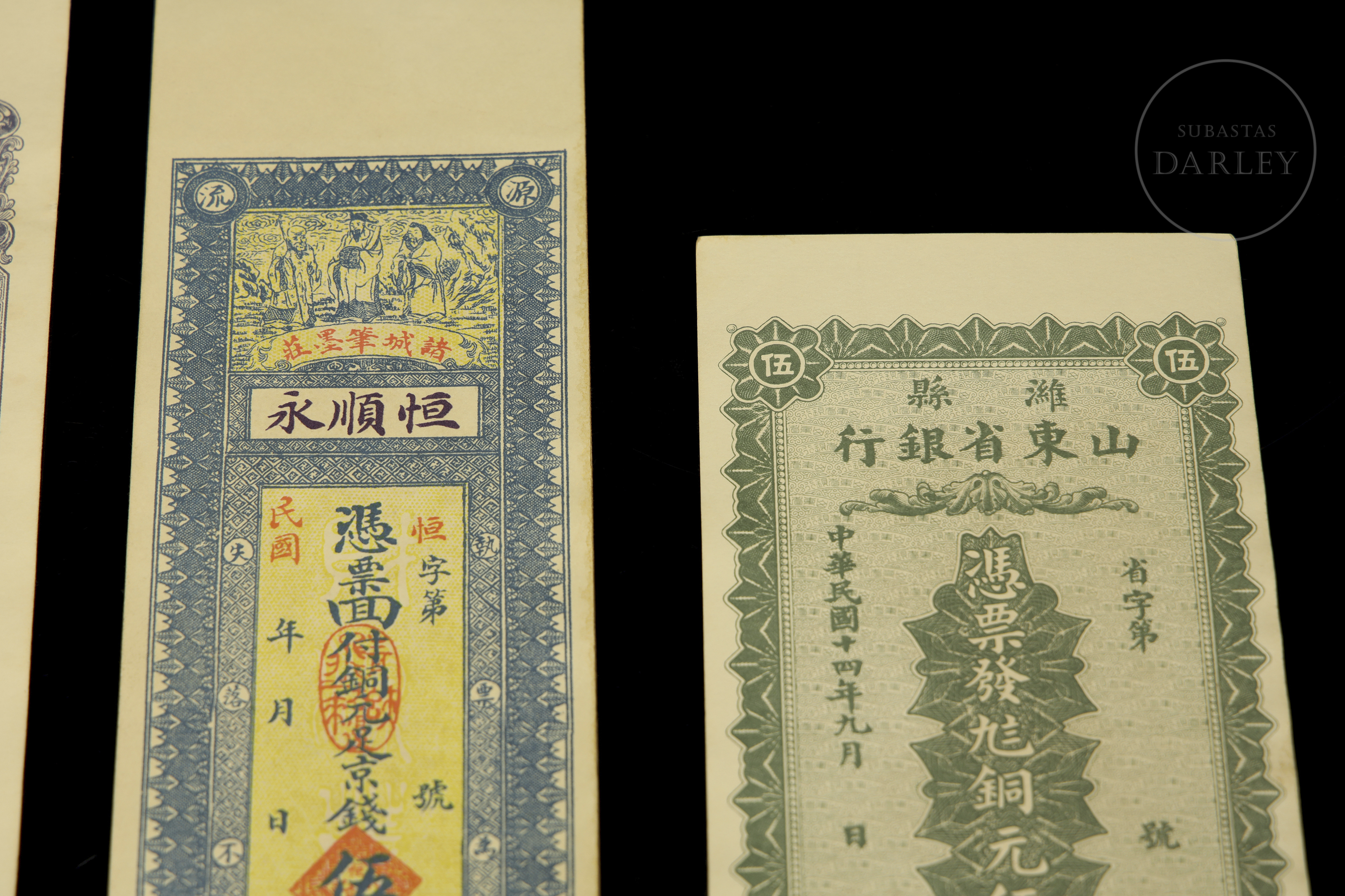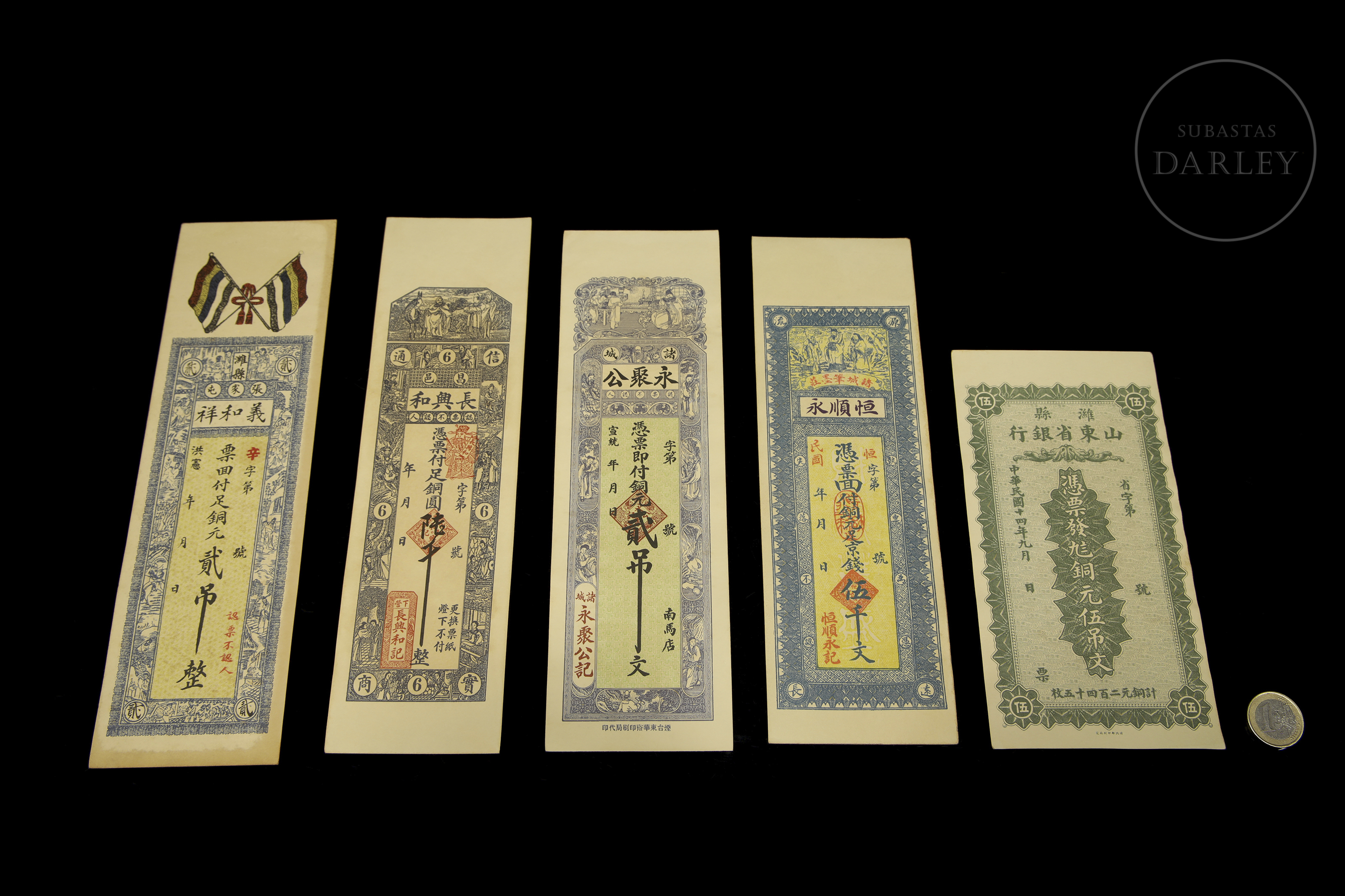 Conjunto de cinco “yínpiào” o billetes de plata impresos por bancos y comercios regionales chinos, con textos en caracteres chinos y algunos con inscripciones bilingües. Ejemplares policromos con orlas ornamentadas y escenas figurativas. Dinastía Qing (1644-1912) o posterior.