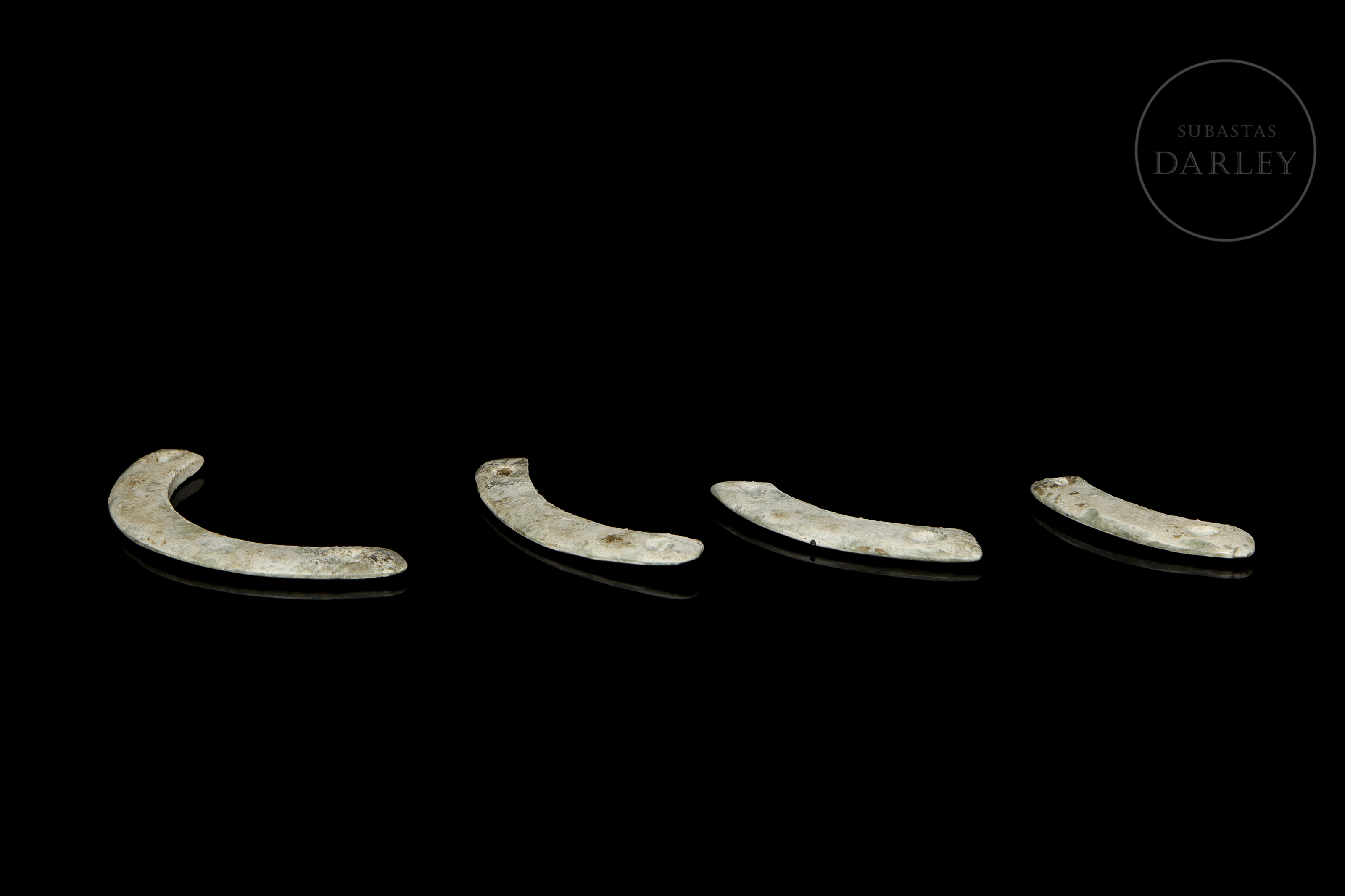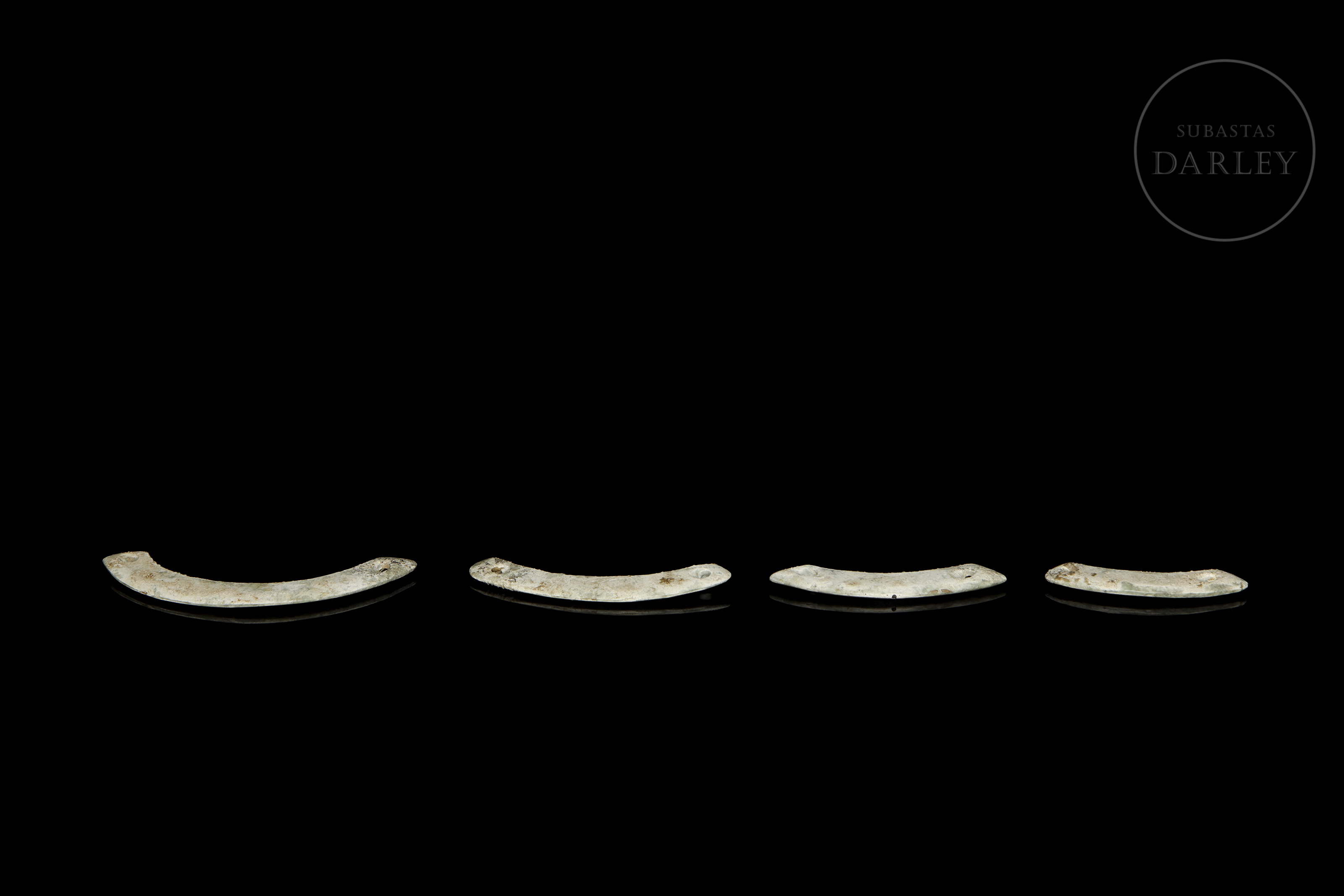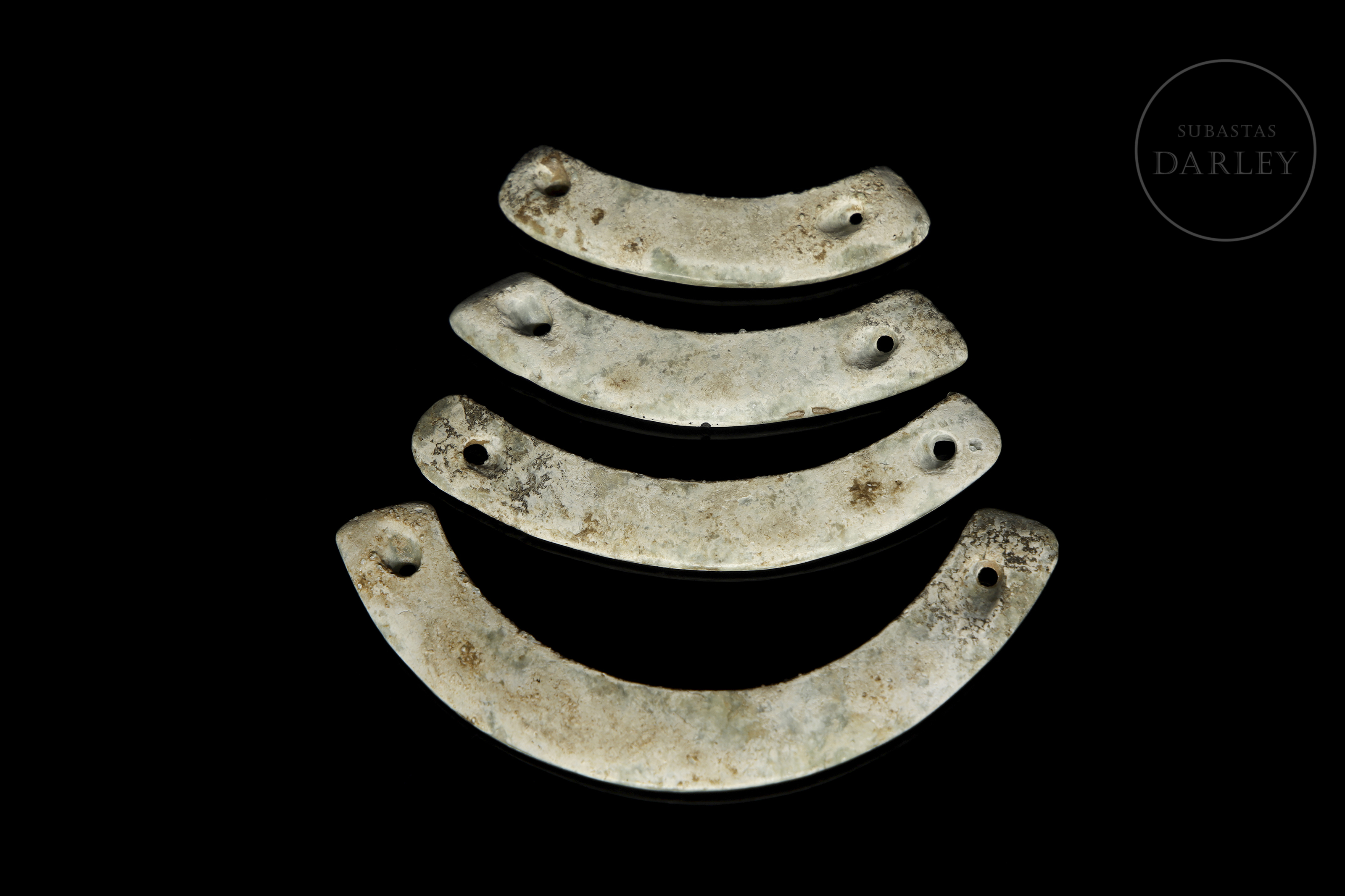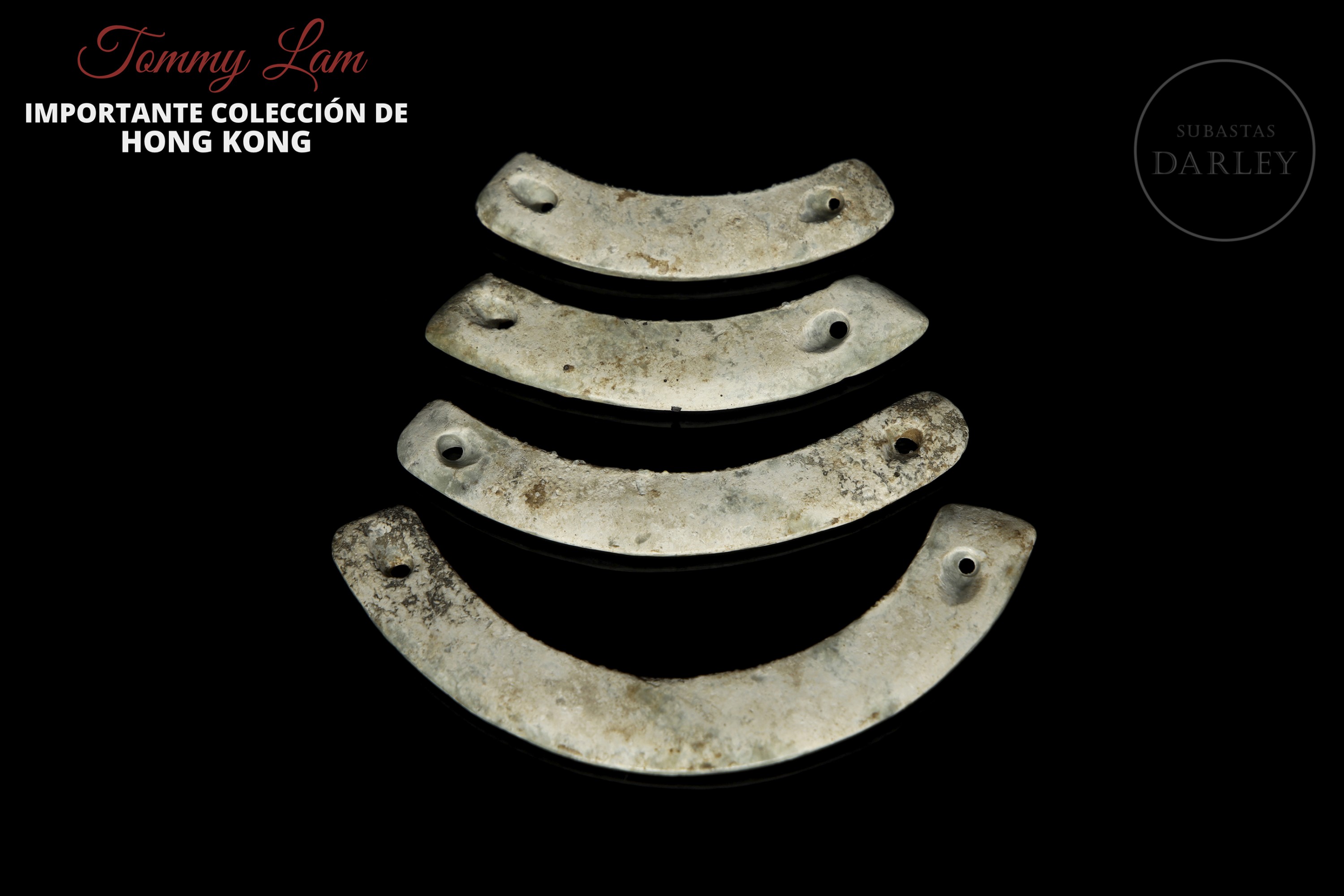 Conjunto de cuatro colgantes arcaicos de jade, con la característica forma de arco segmentado o huang. Cada pieza está perforada en sus extremos para formar parte de un pectoral o adorno ritual más complejo. El jade presenta una intensa y extensa calcificación, conocida como "hueso de pollo", que le confiere un aspecto blanquecino y opaco, indicativo de antigüedad.