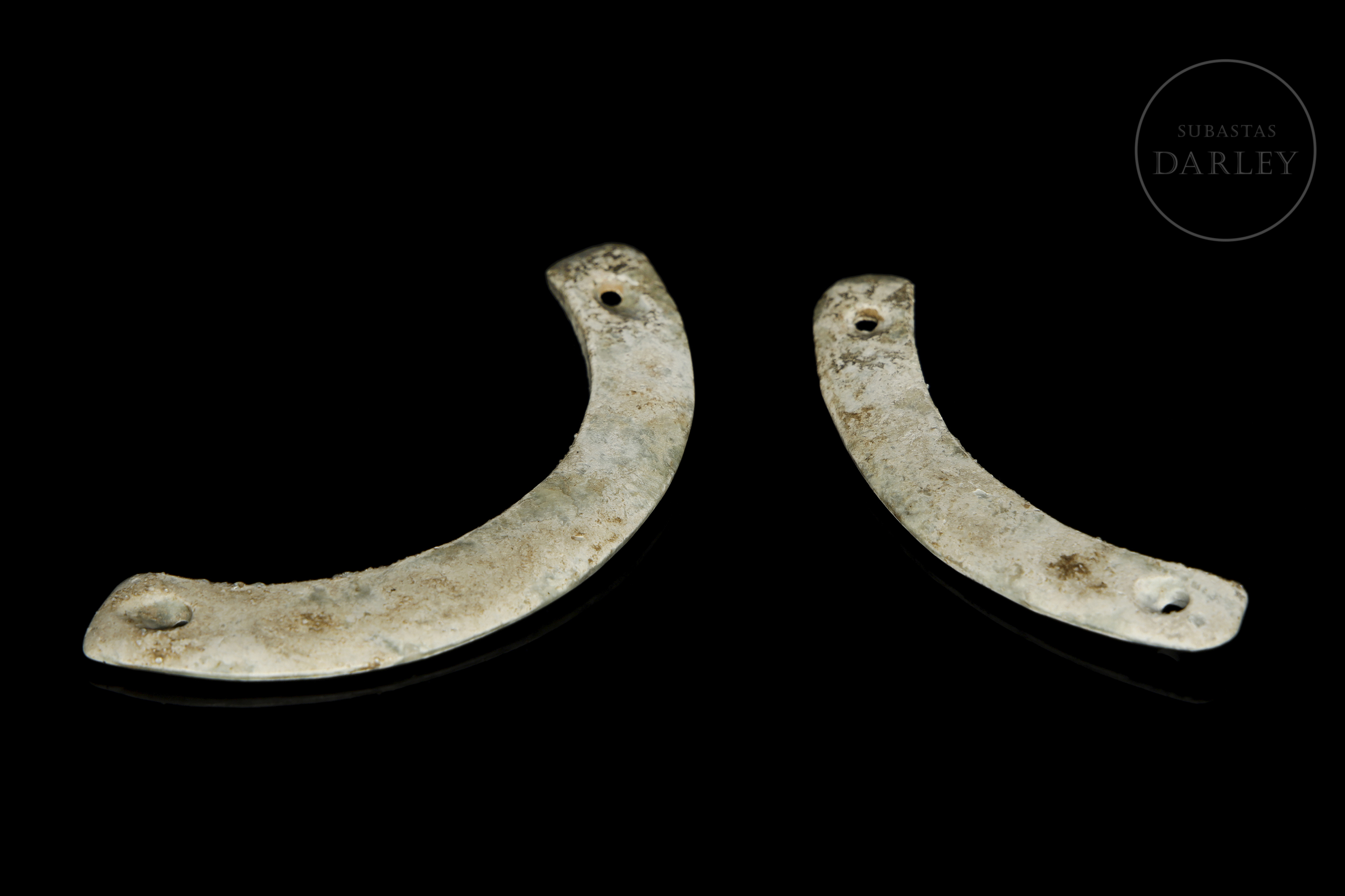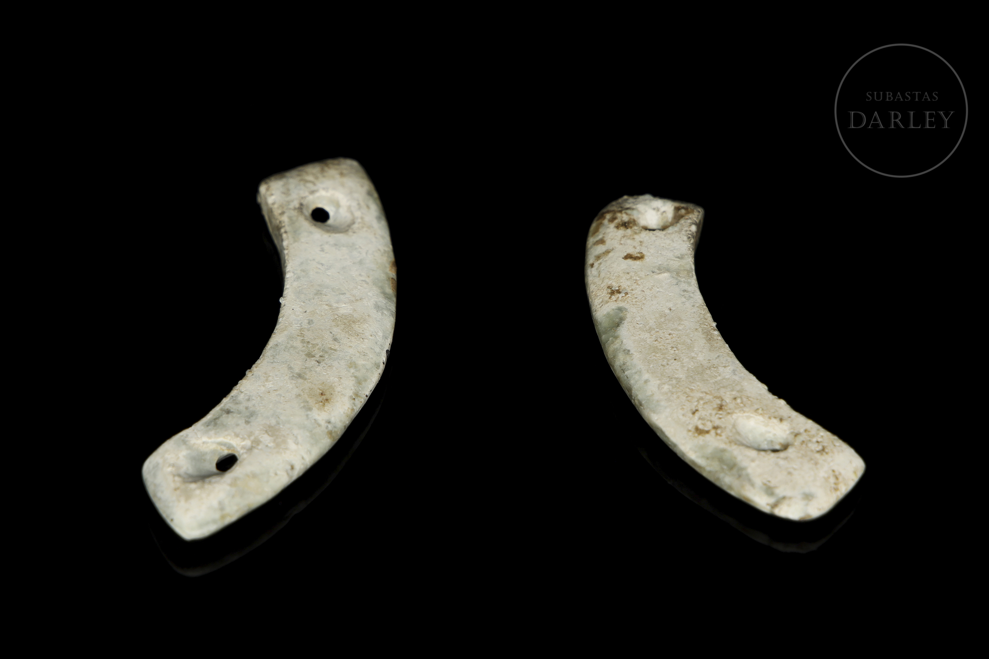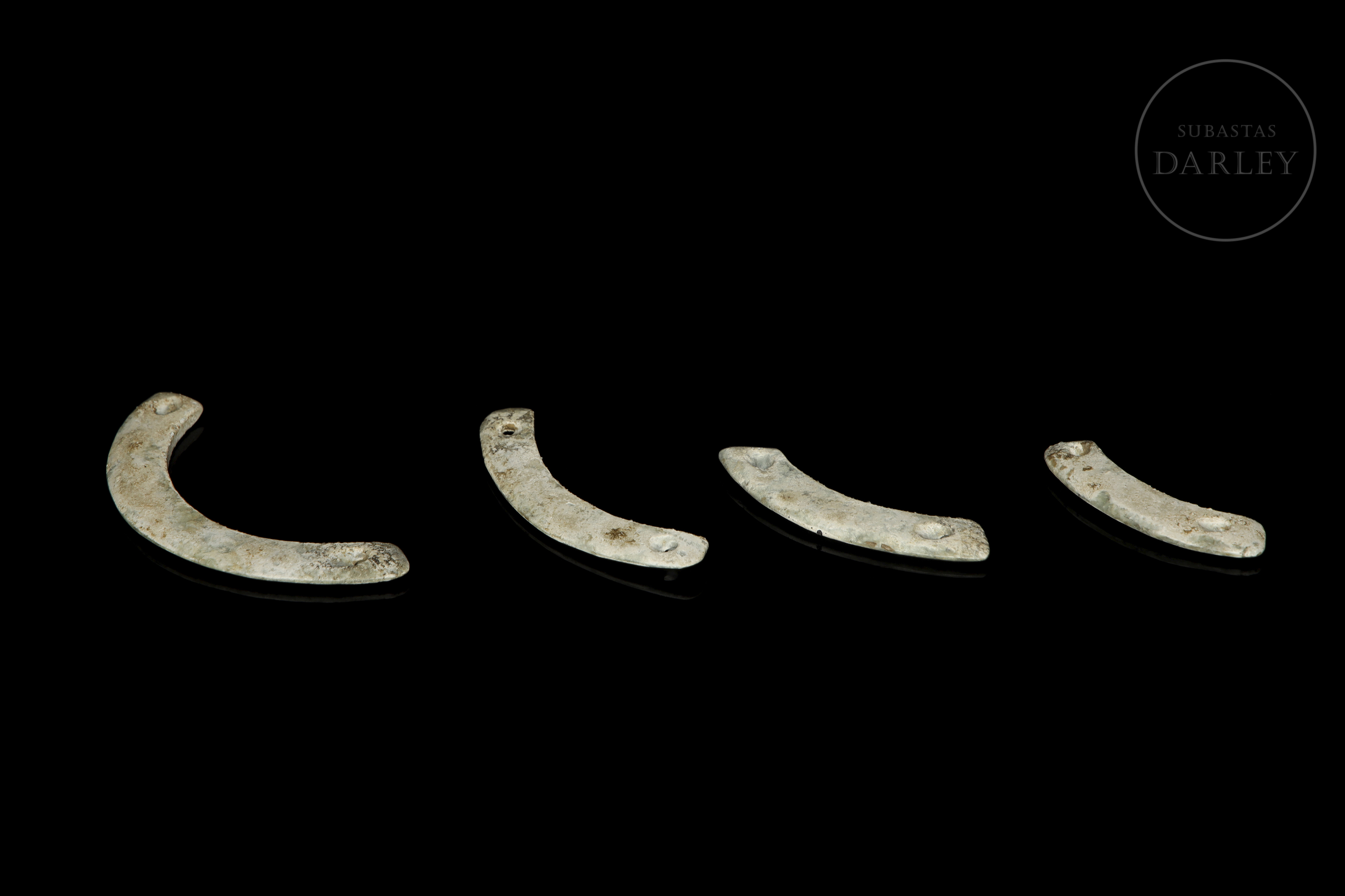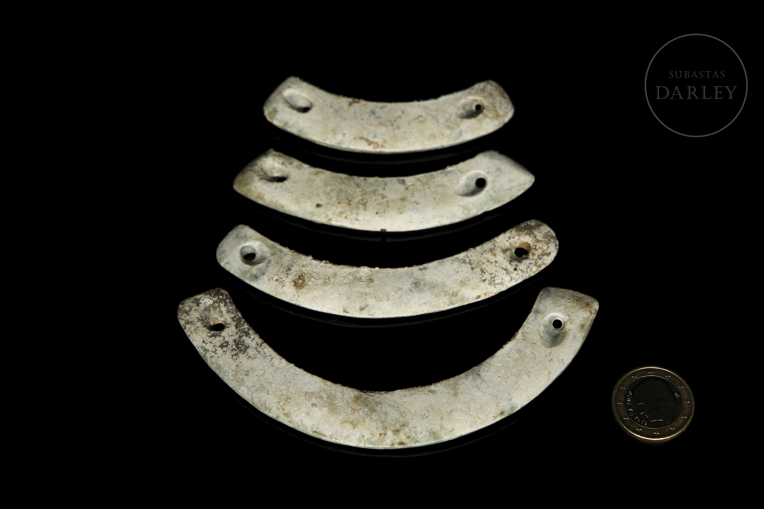 Conjunto de cuatro colgantes arcaicos de jade, con la característica forma de arco segmentado o huang. Cada pieza está perforada en sus extremos para formar parte de un pectoral o adorno ritual más complejo. El jade presenta una intensa y extensa calcificación, conocida como "hueso de pollo", que le confiere un aspecto blanquecino y opaco, indicativo de antigüedad.