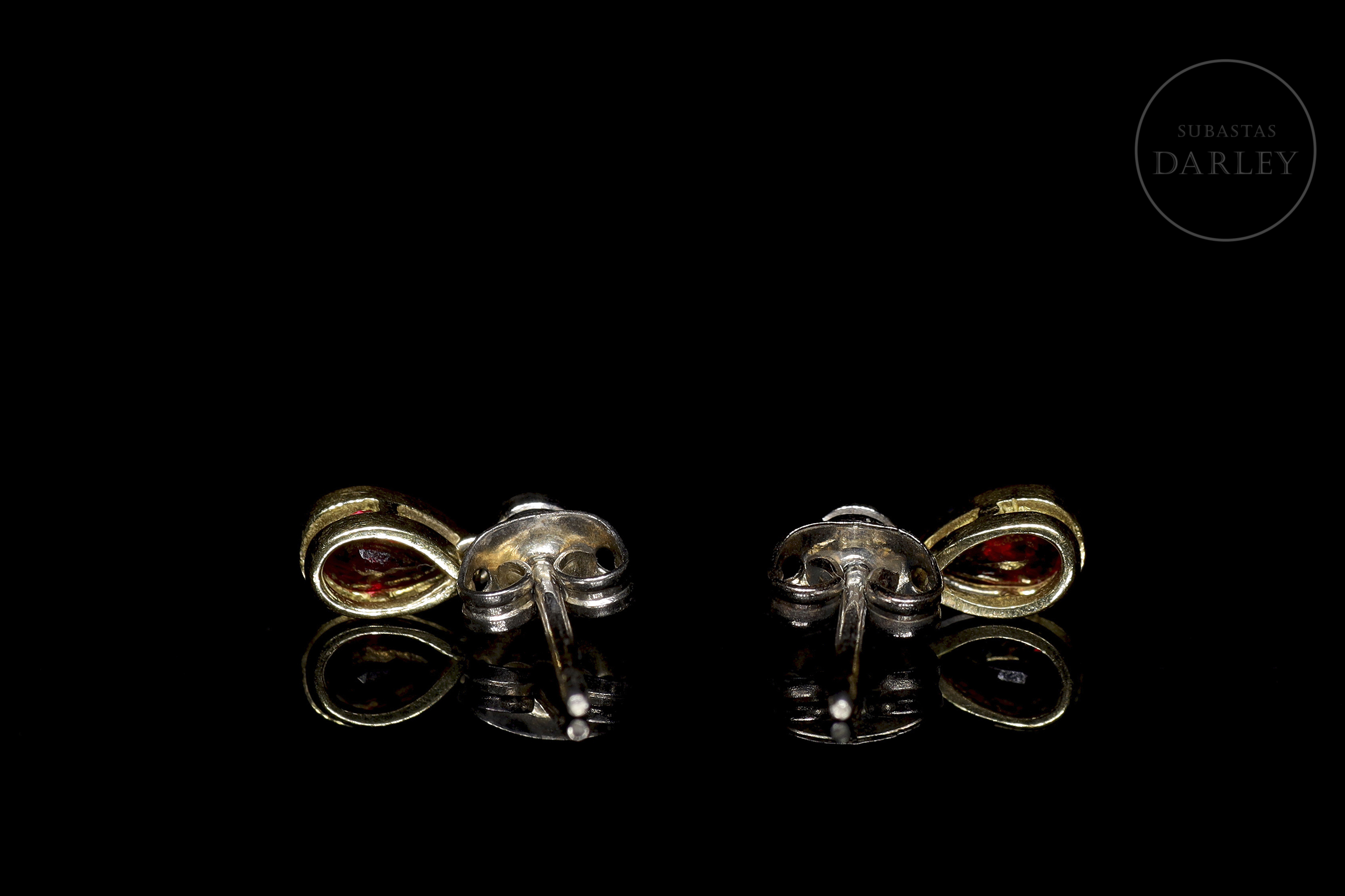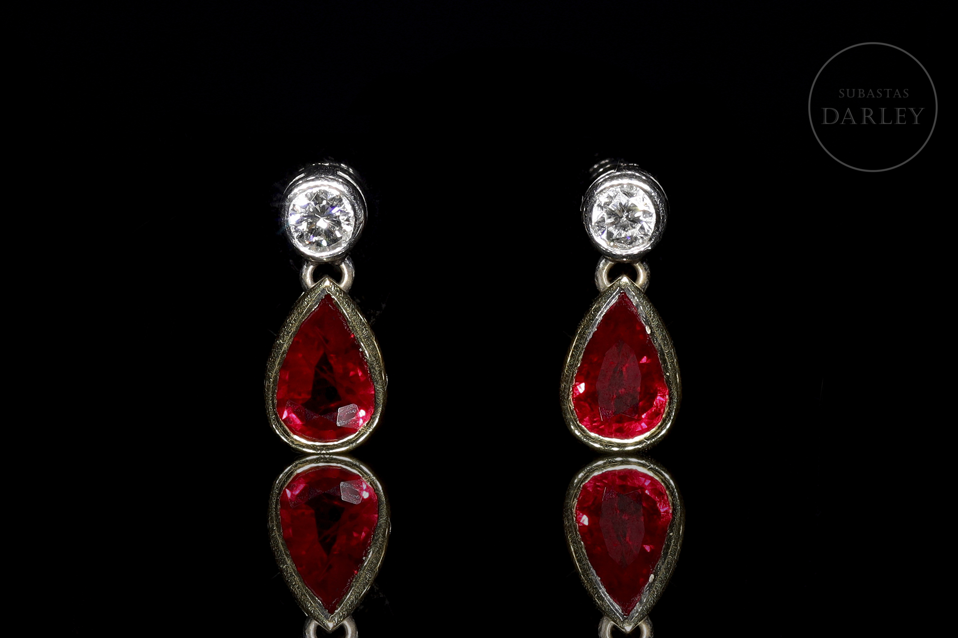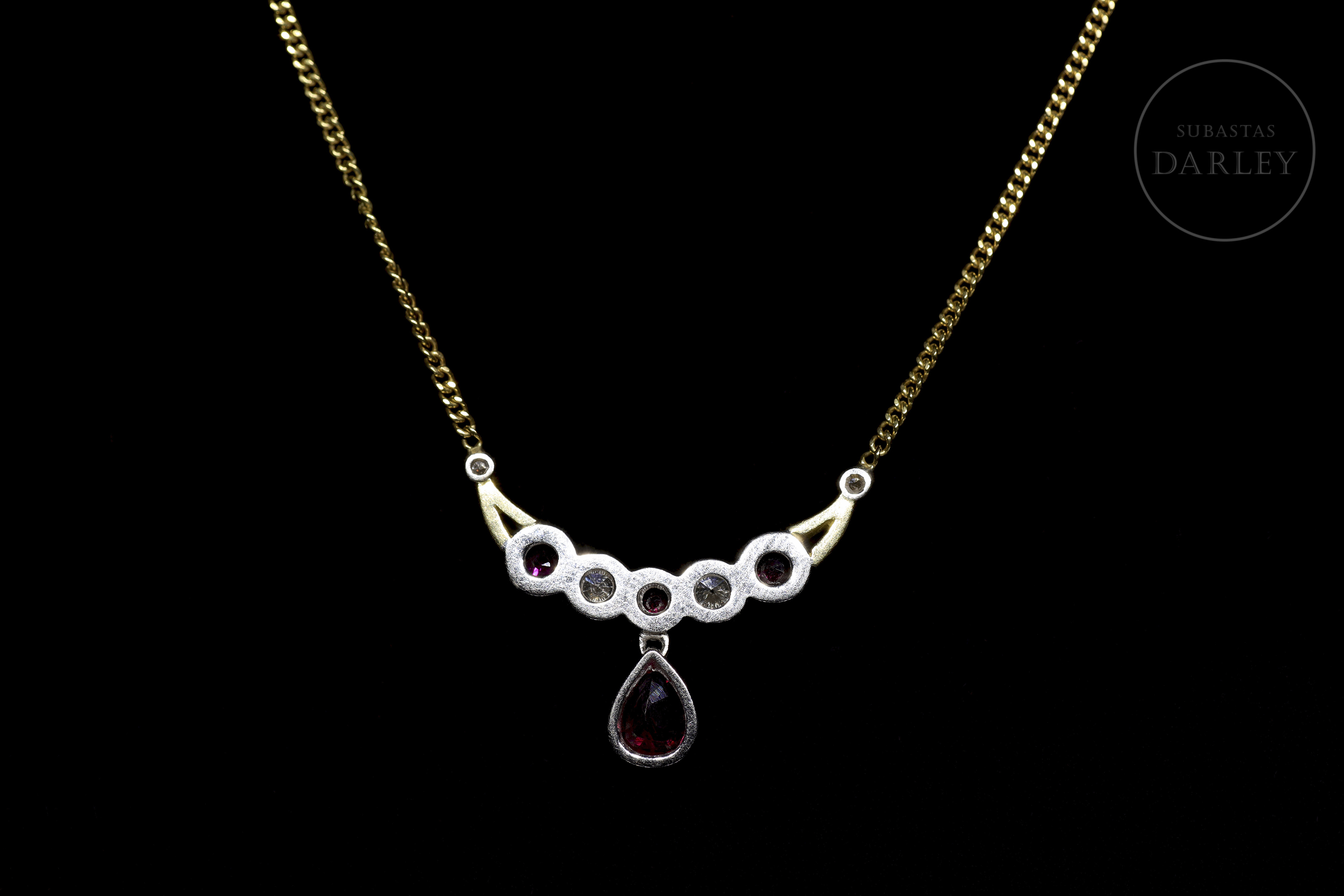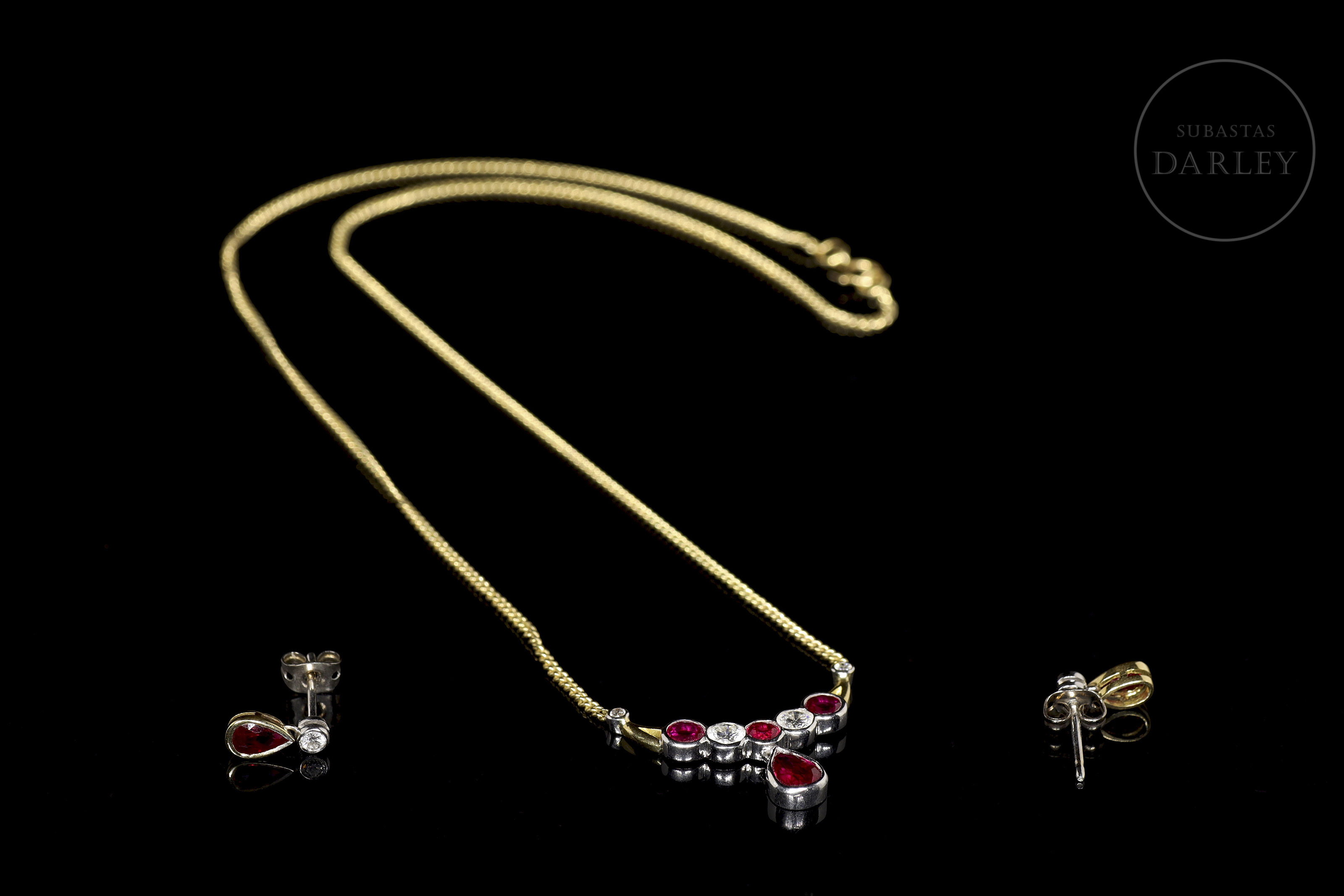 Oro blanco y amarillo de 18k. El collar presenta cadena fina con motivo central alternando rubíes y diamantes talla brillante en engaste tipo chatón, rematado por un rubí talla pera colgante. Los pendientes repiten el diseño con brillante superior y rubí talla pera suspendido. Cierre de presión. Peso total de diamantes: aprox. 0,63 ct.