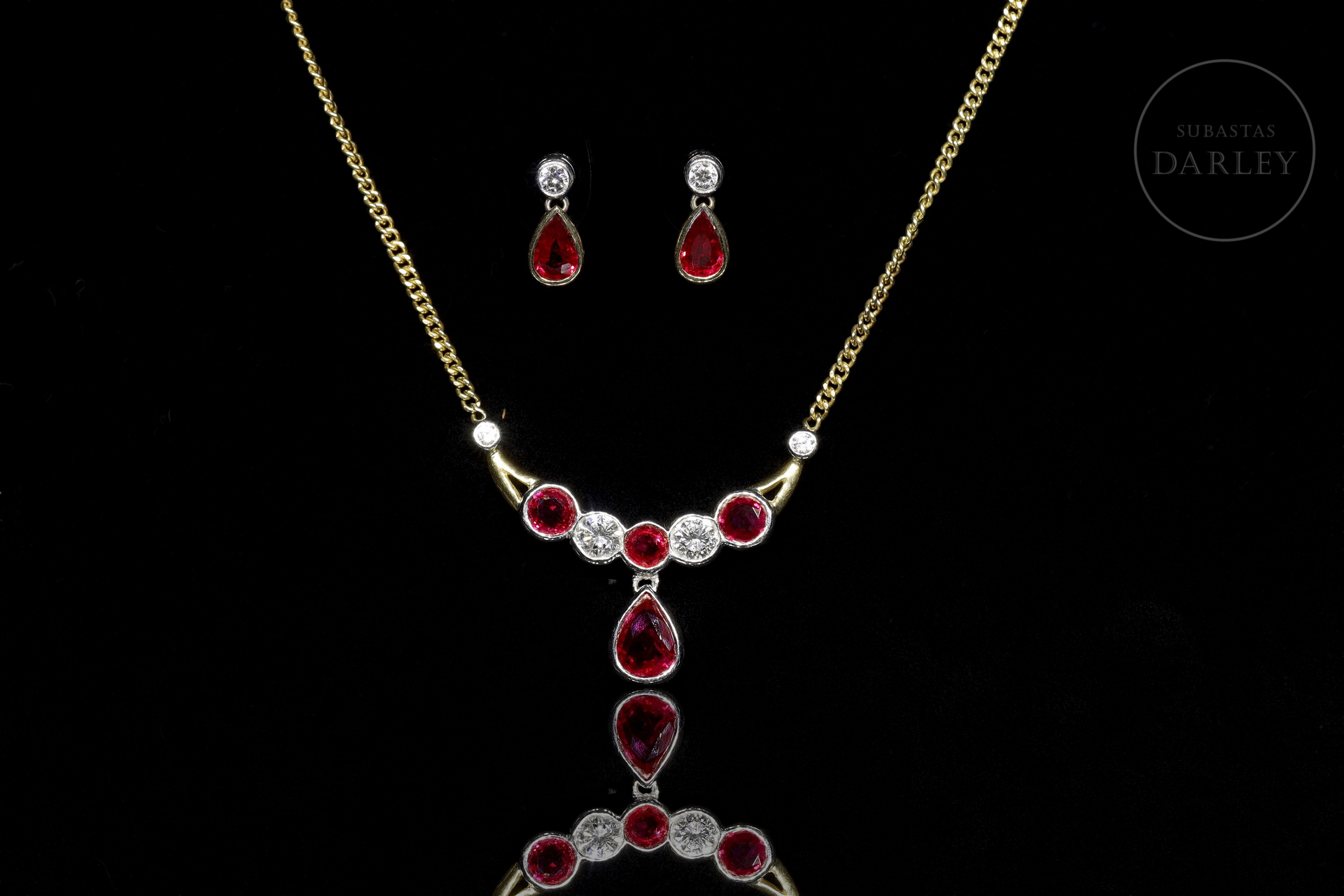 Conjunto de collar y pendientes en oro de 18k con rubíes y brillantes