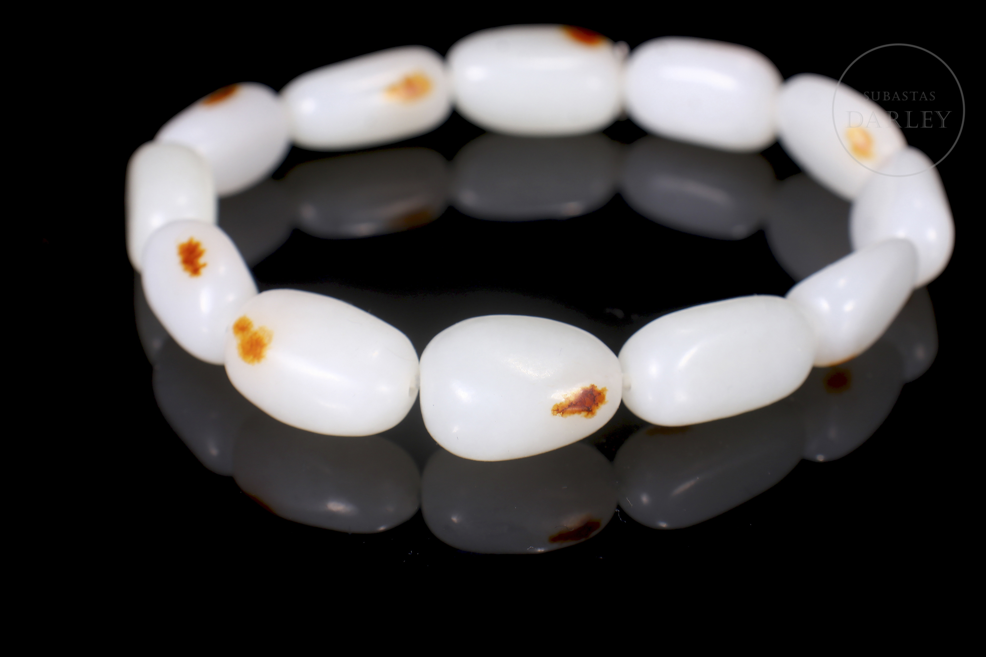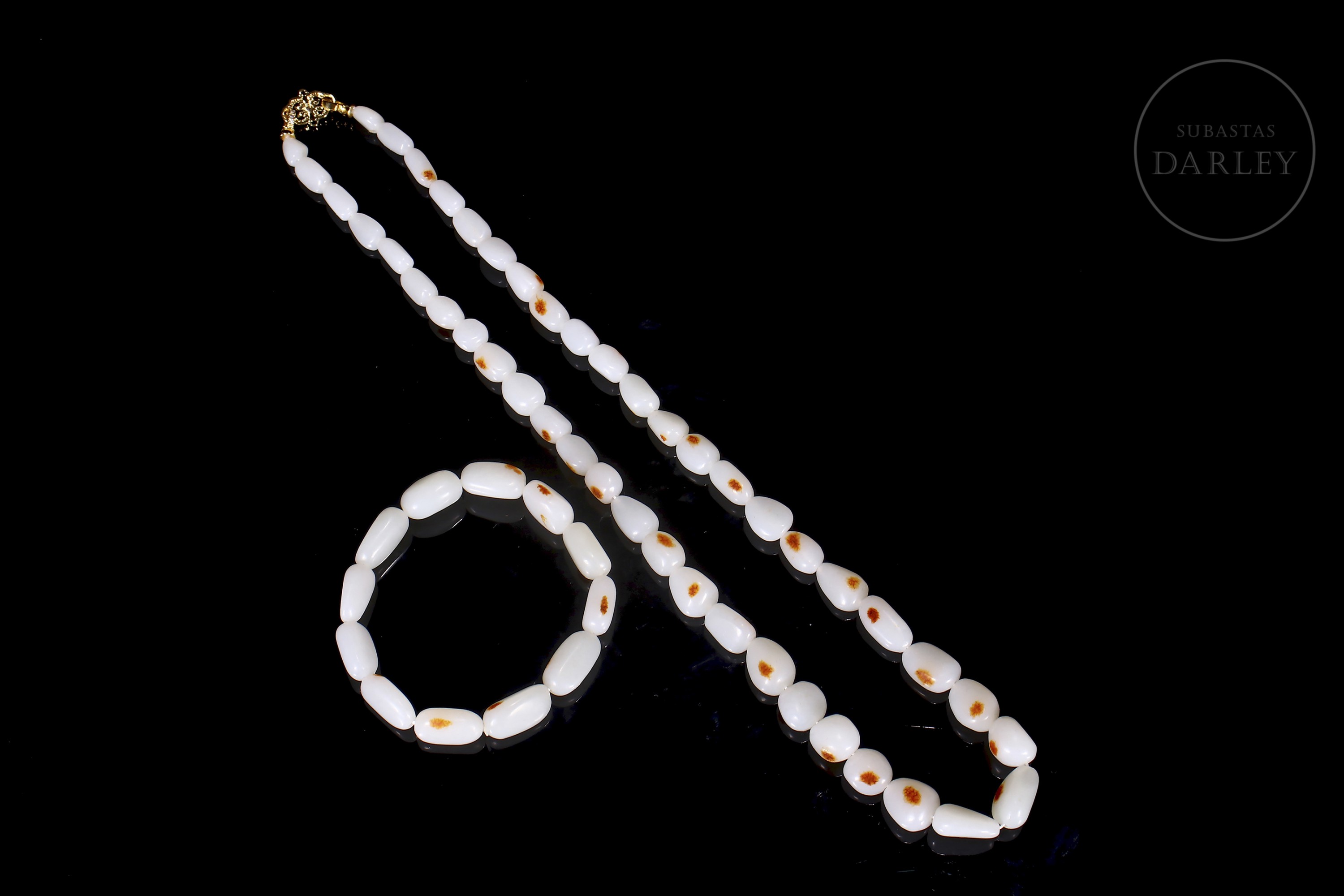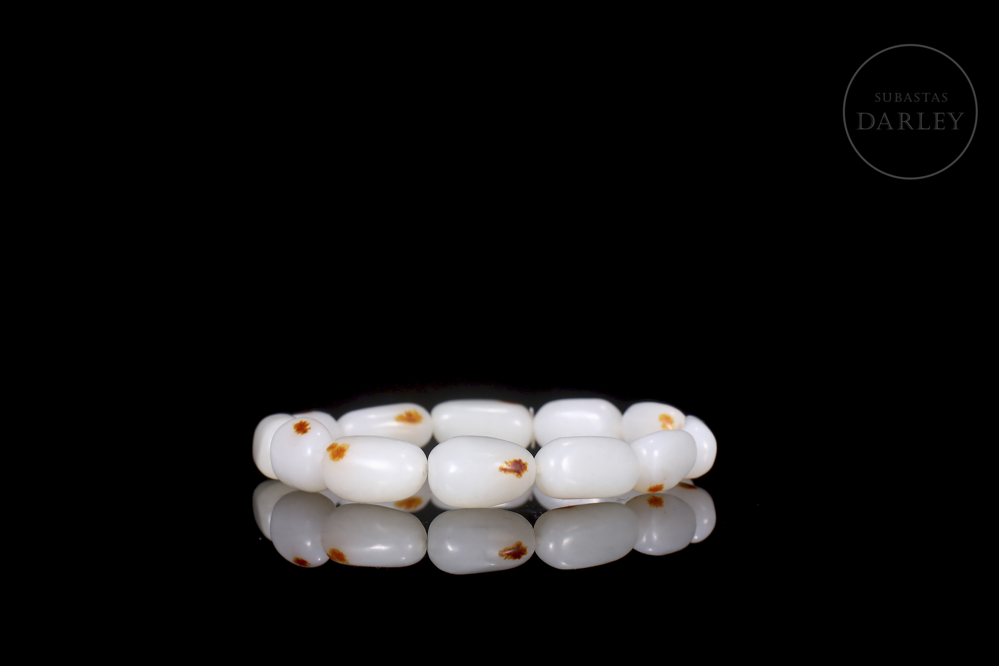 Conjunto compuesto por un collar y una pulsera de cuentas de jade blanco de Hetian. Las cuentas son de forma redondeada e irregular. El jade es de color blanco puro con pequeñas inclusiones de color rojizo. El collar presenta un cierre de metal dorado. El conjunto se presenta en una caja forrada a medida. Dinastía Qing (1644–1912).