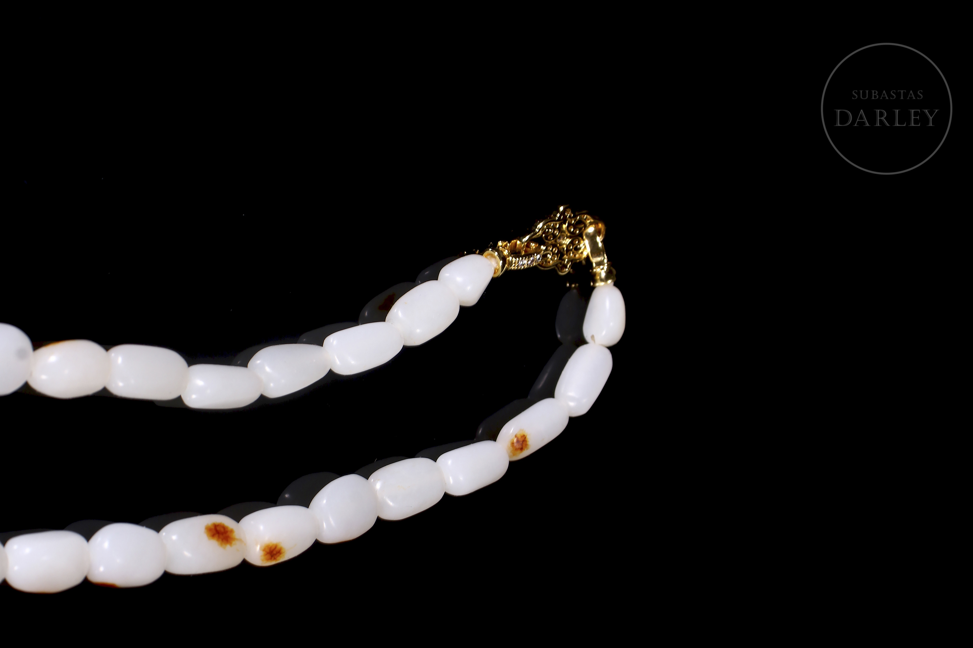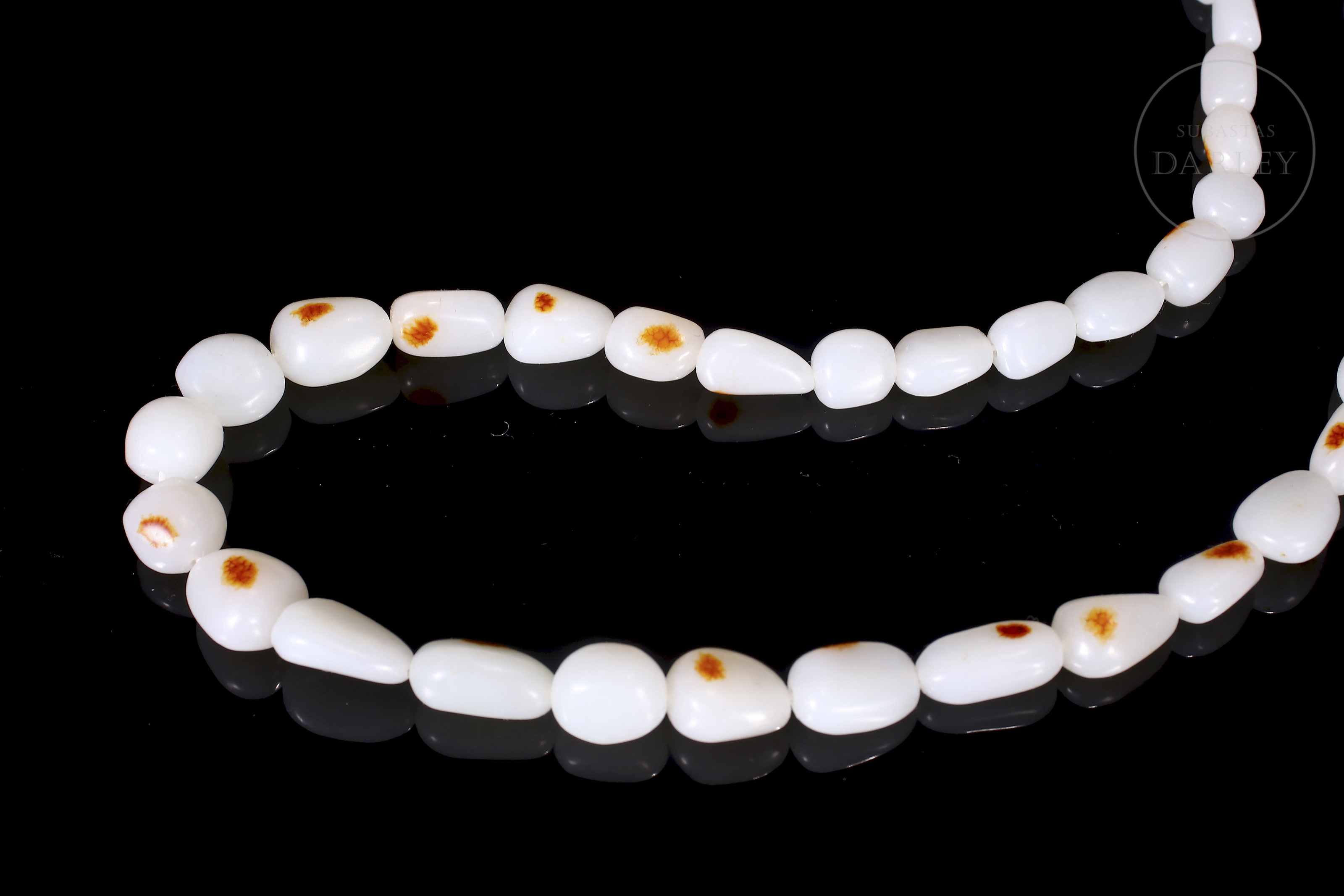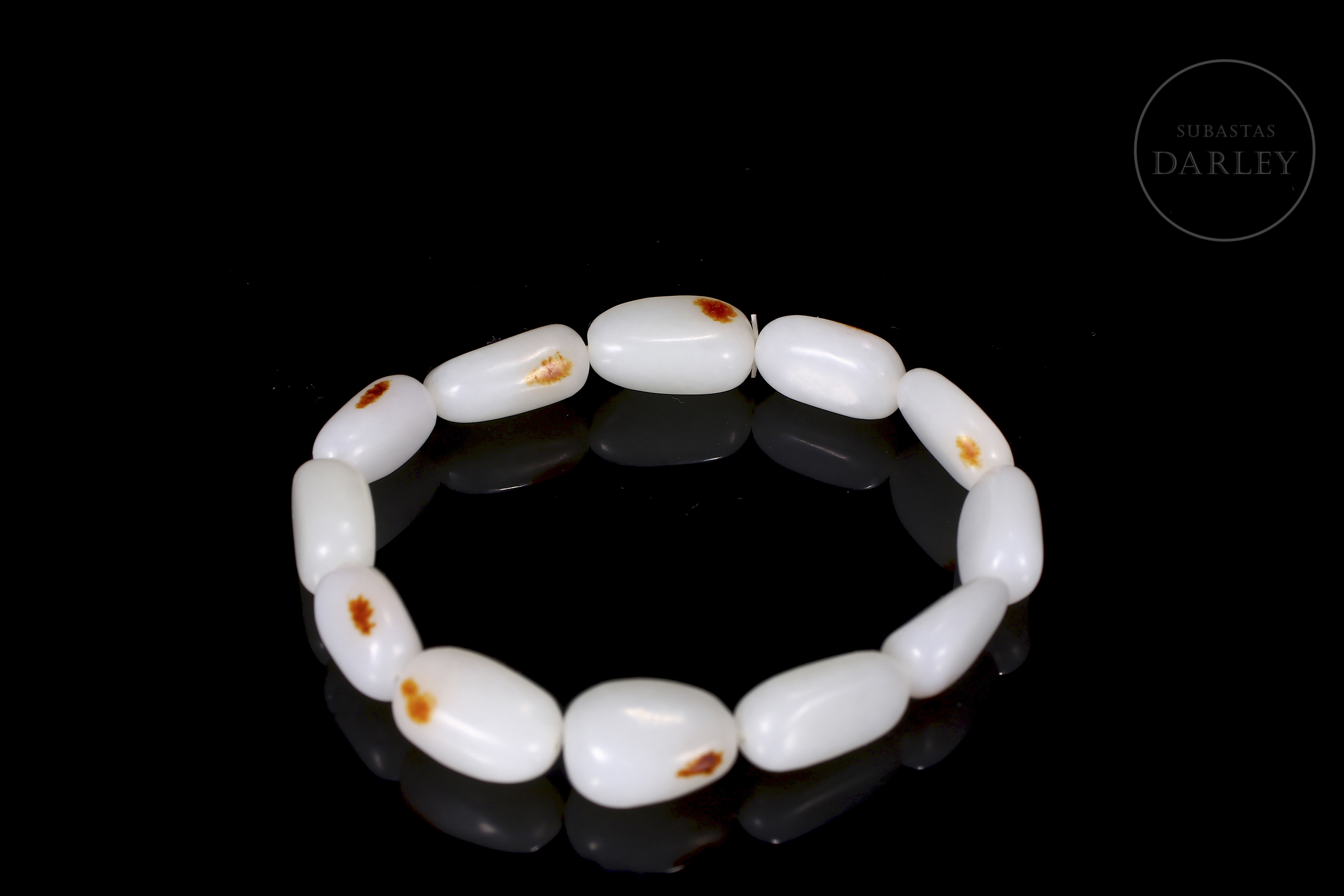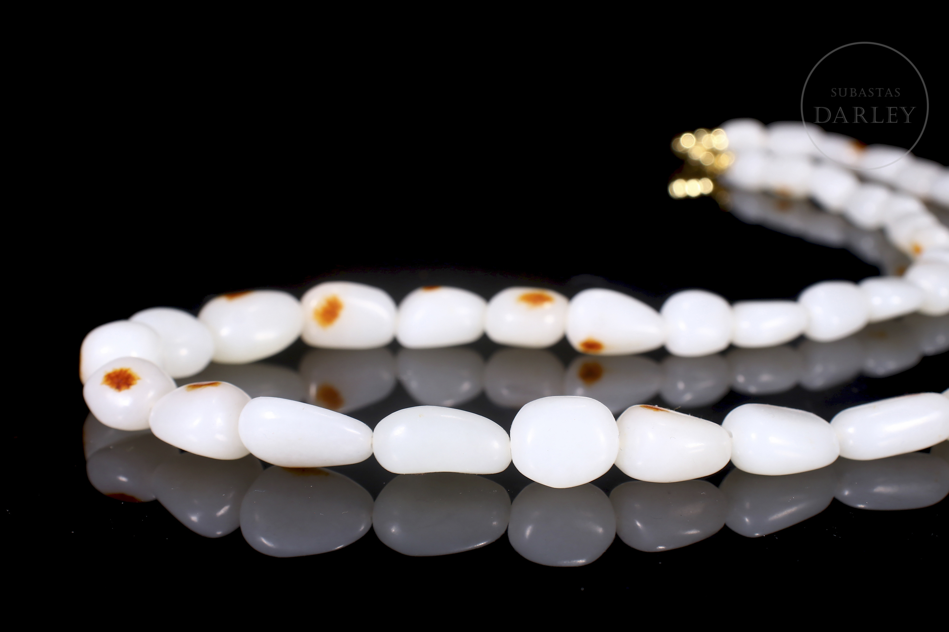 Conjunto compuesto por un collar y una pulsera de cuentas de jade blanco de Hetian. Las cuentas son de forma redondeada e irregular. El jade es de color blanco puro con pequeñas inclusiones de color rojizo. El collar presenta un cierre de metal dorado. El conjunto se presenta en una caja forrada a medida. Dinastía Qing (1644–1912).