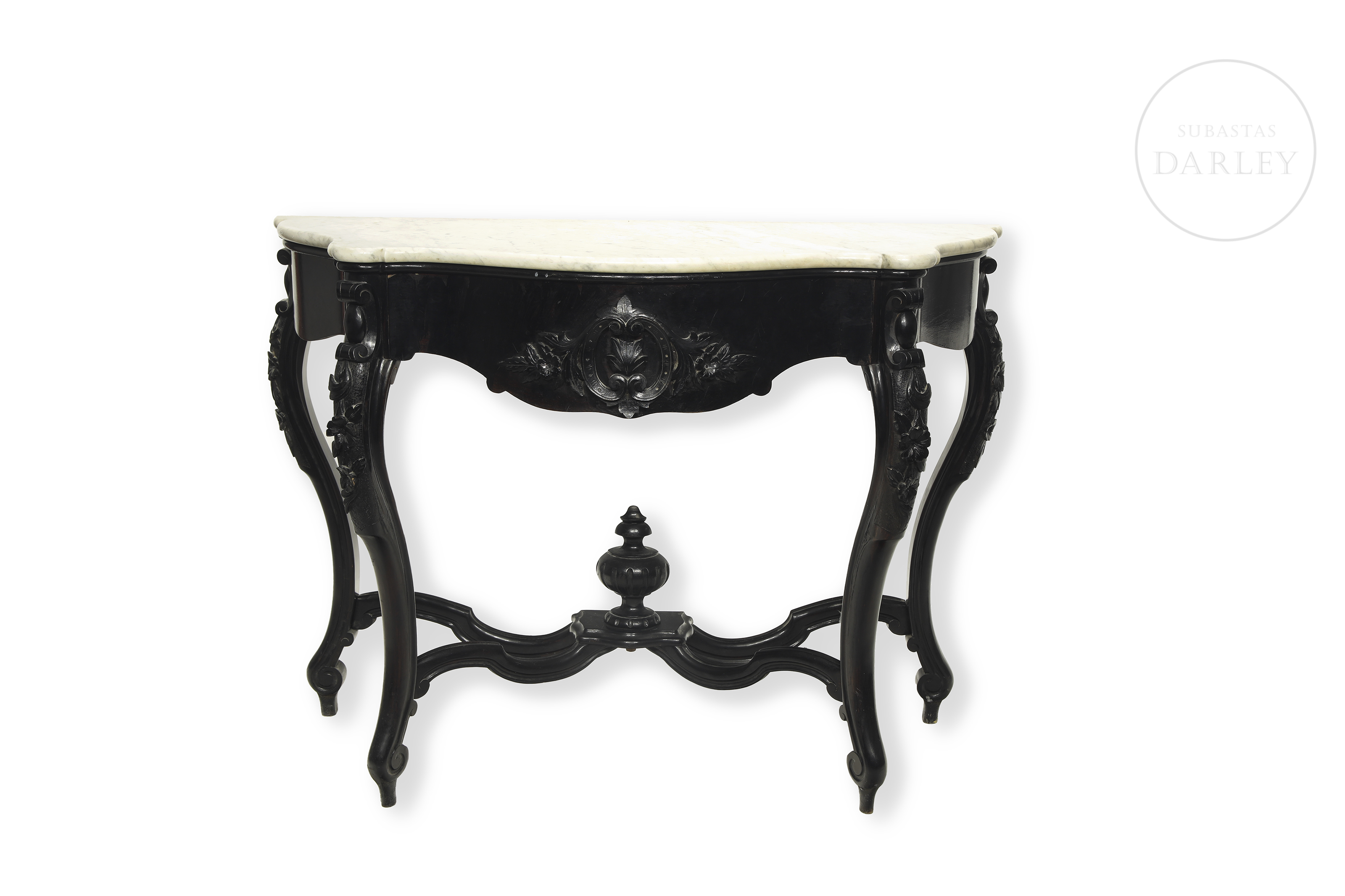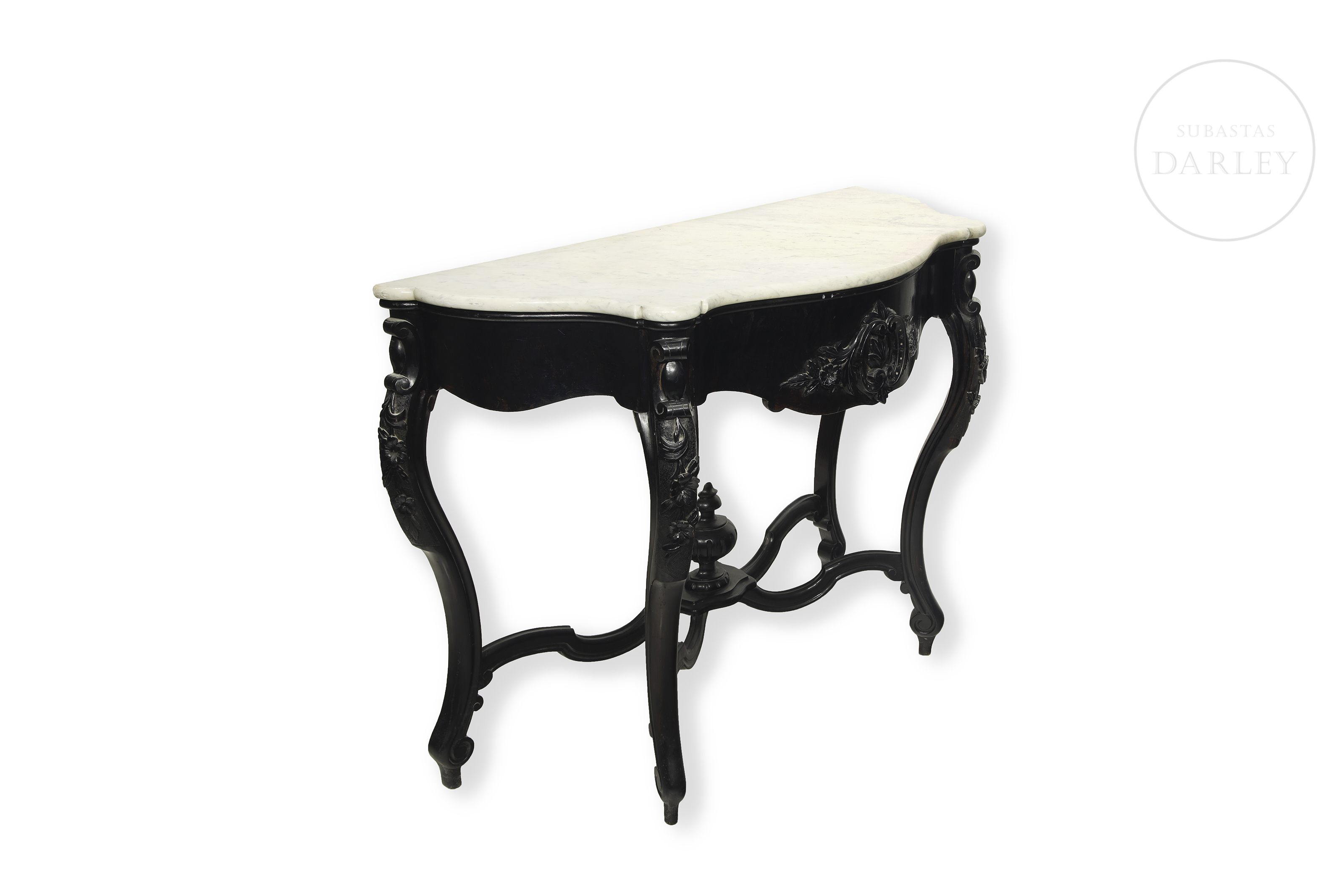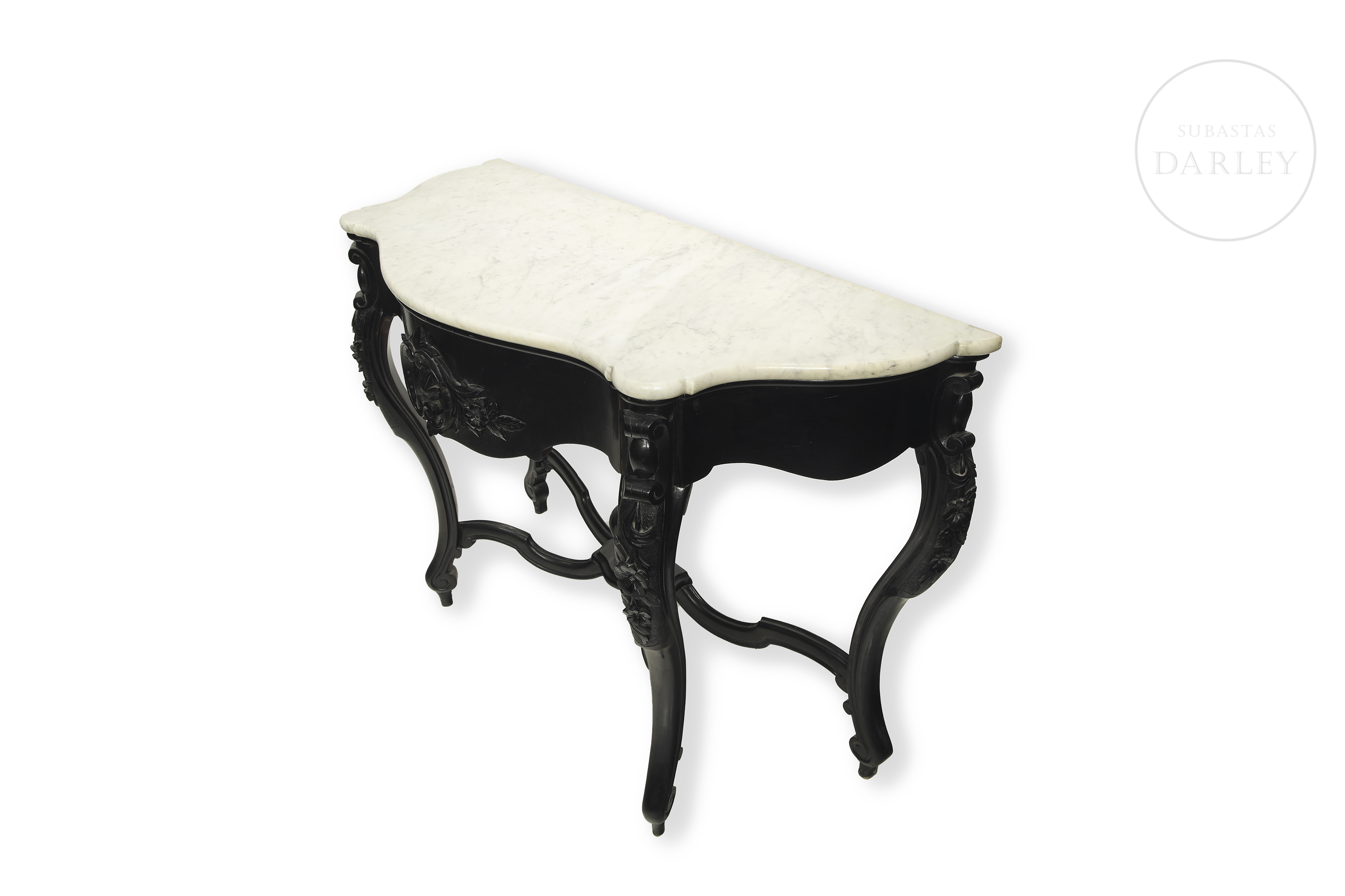 Elegante conjunto compuesto por una consola de pared y un gran espejo de estilo neo-isabelino realizado en madera ebonizada de oscura tonalidad. La consola presenta un sobre de mármol blanco veteado y patas cabriolé unidas por chambrana, mientras que el espejo destaca por su copete tallado con motivos vegetales y rocallas.