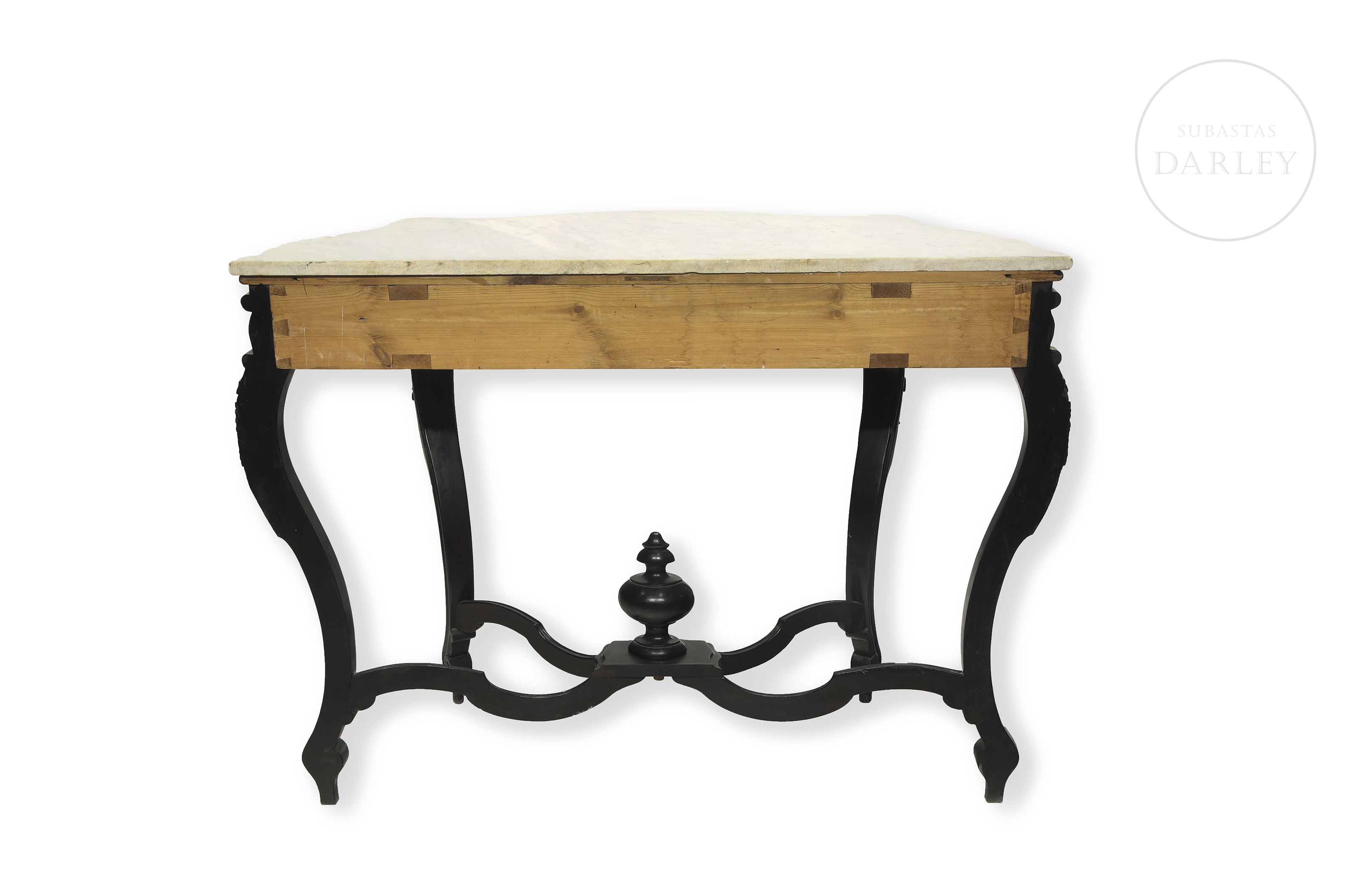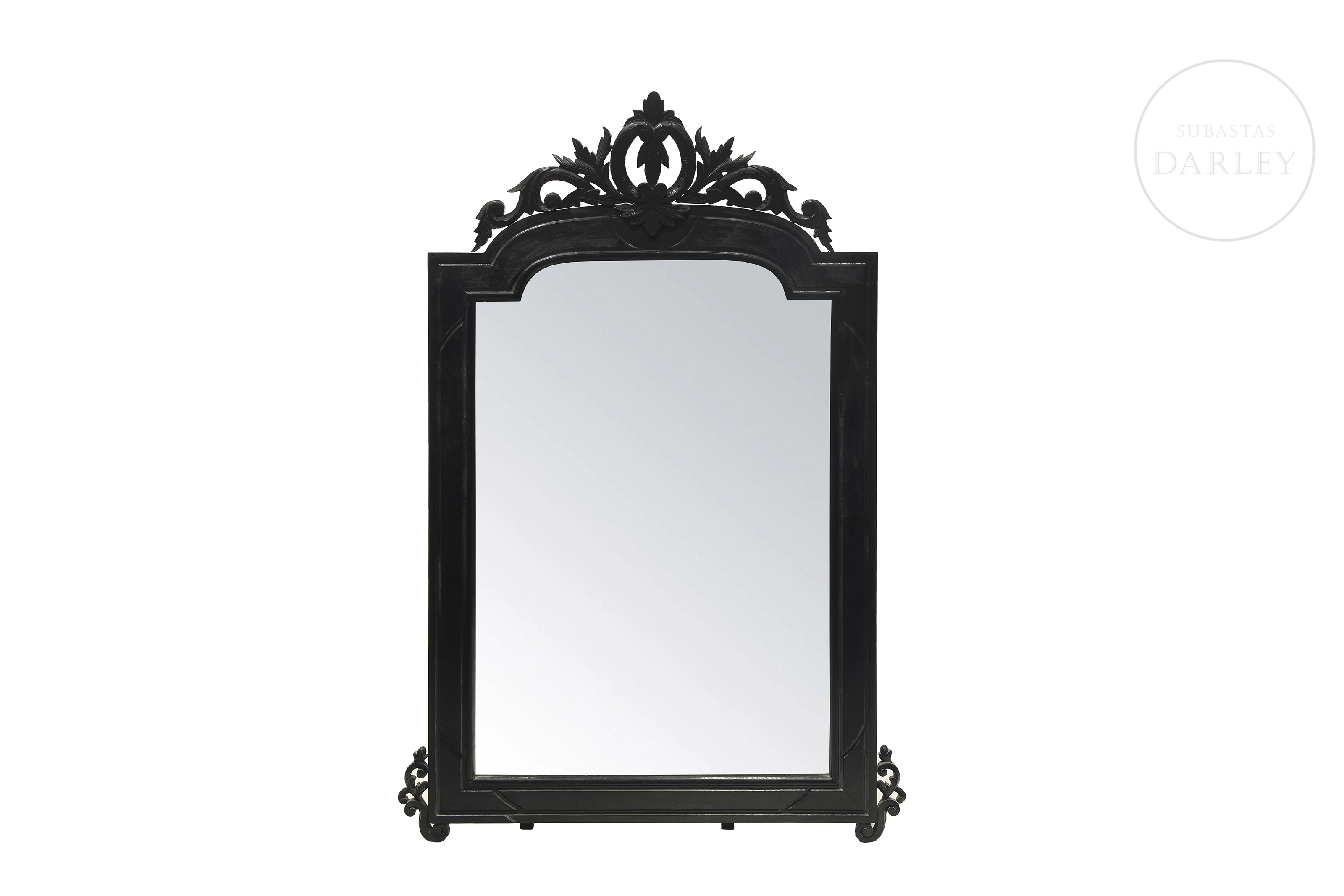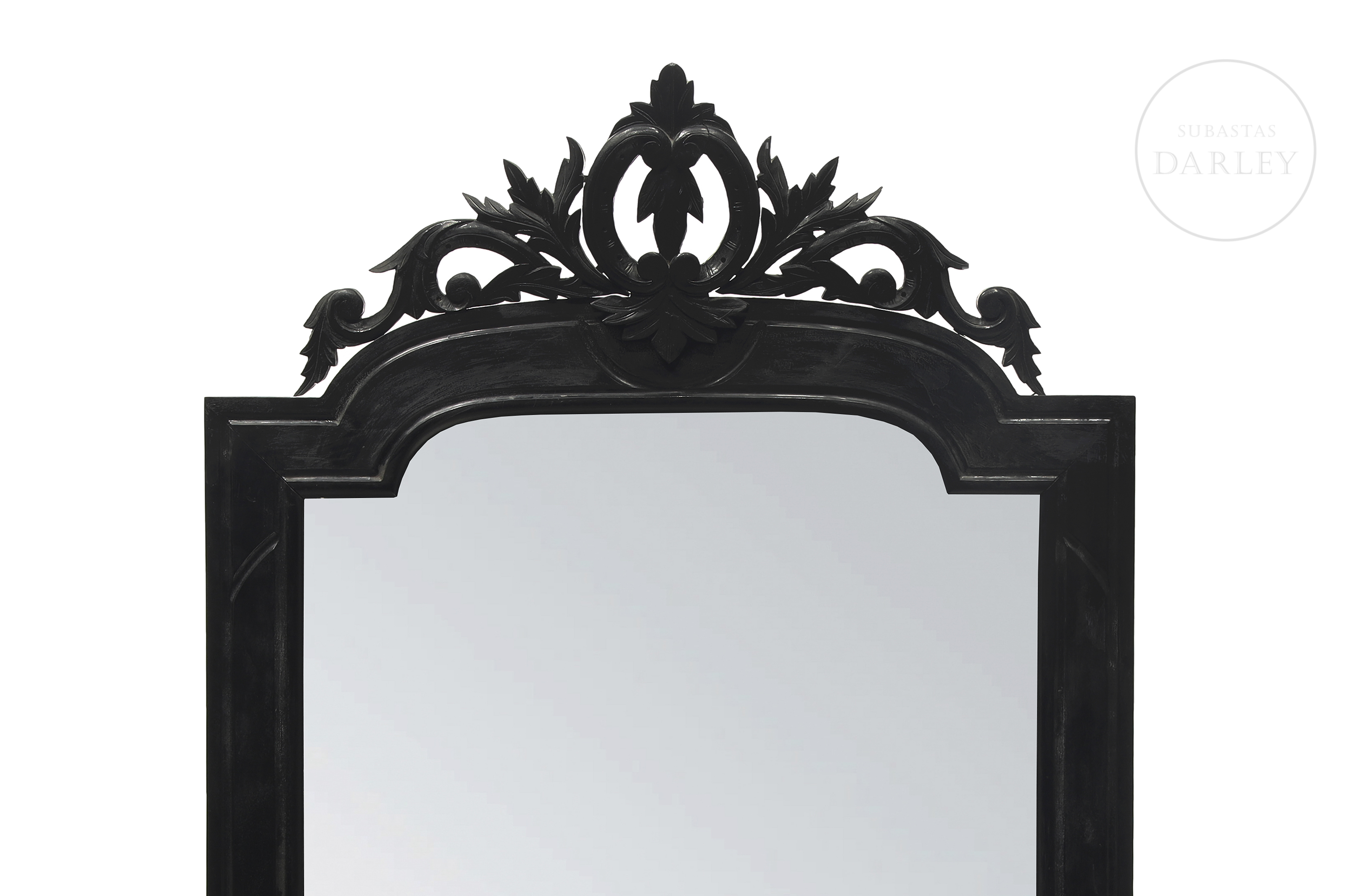 Elegante conjunto compuesto por una consola de pared y un gran espejo de estilo neo-isabelino realizado en madera ebonizada de oscura tonalidad. La consola presenta un sobre de mármol blanco veteado y patas cabriolé unidas por chambrana, mientras que el espejo destaca por su copete tallado con motivos vegetales y rocallas.