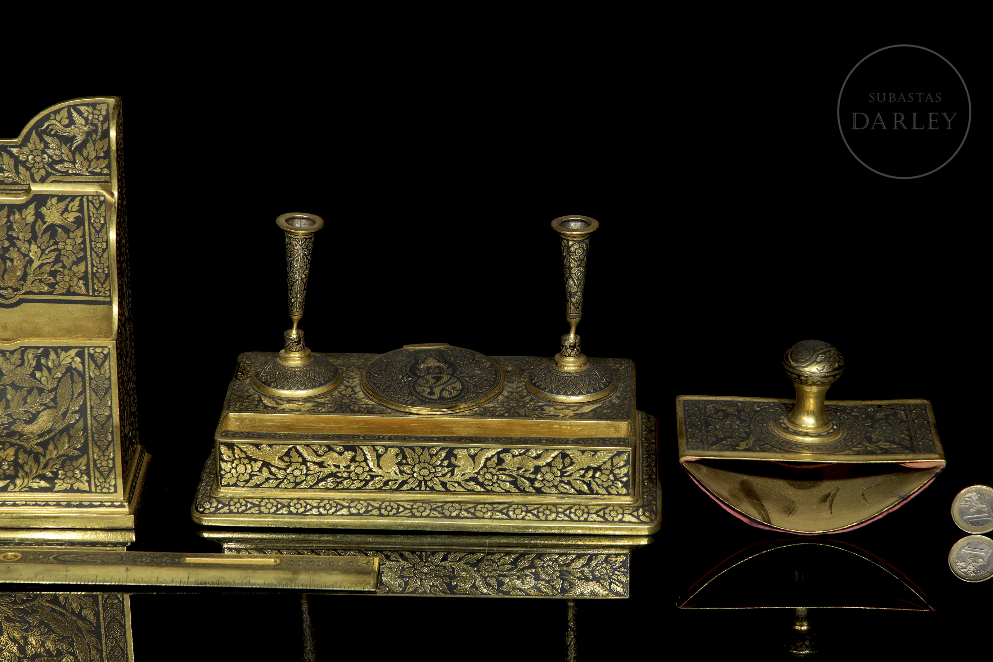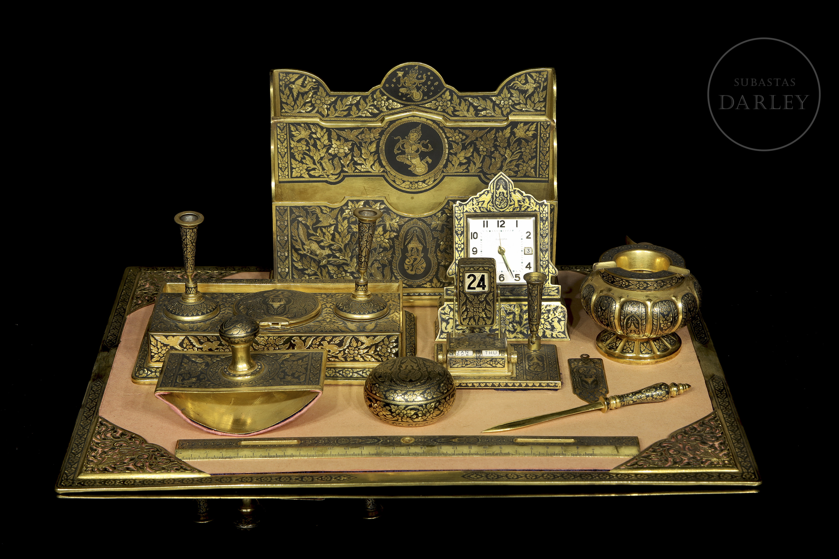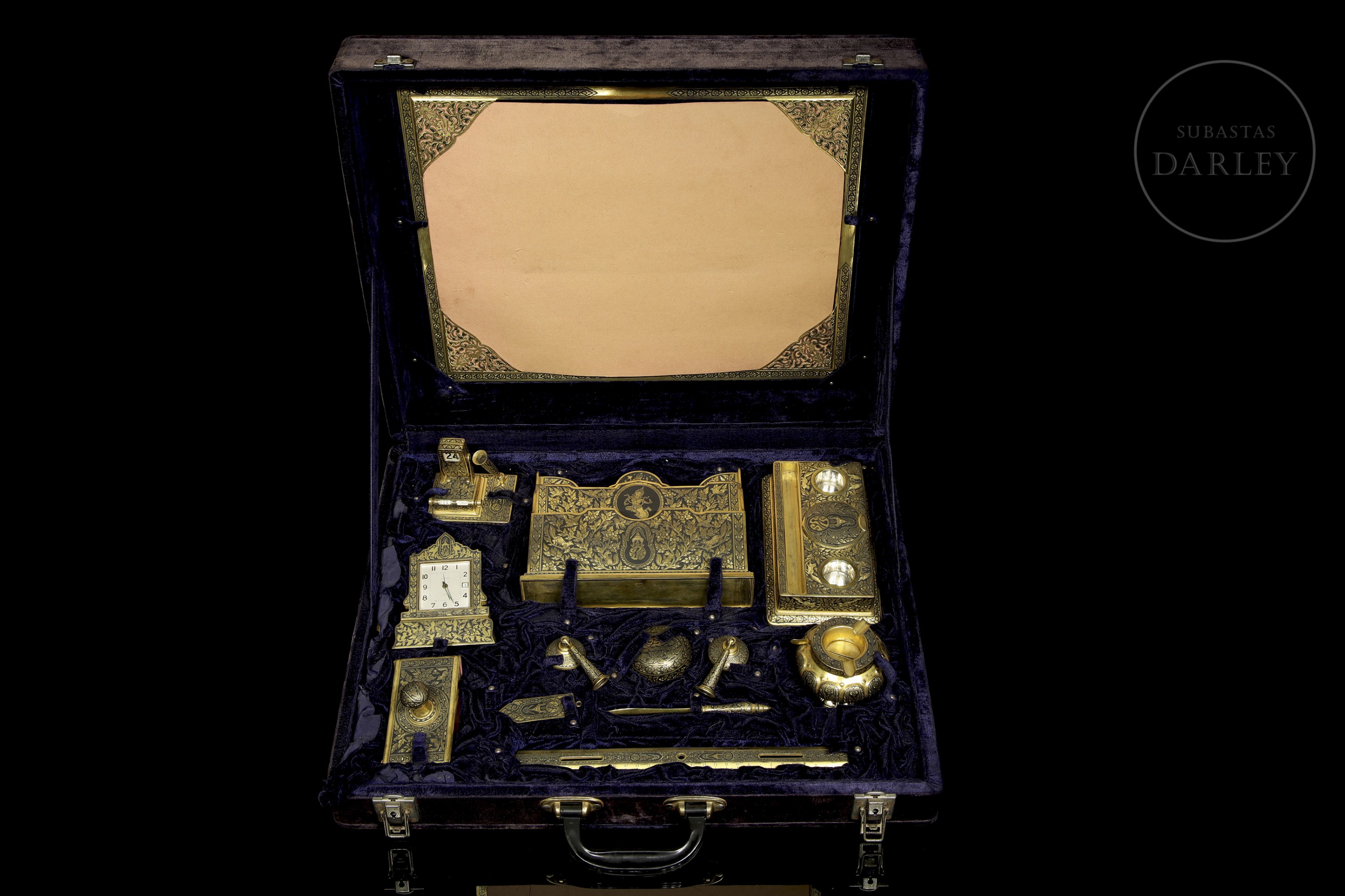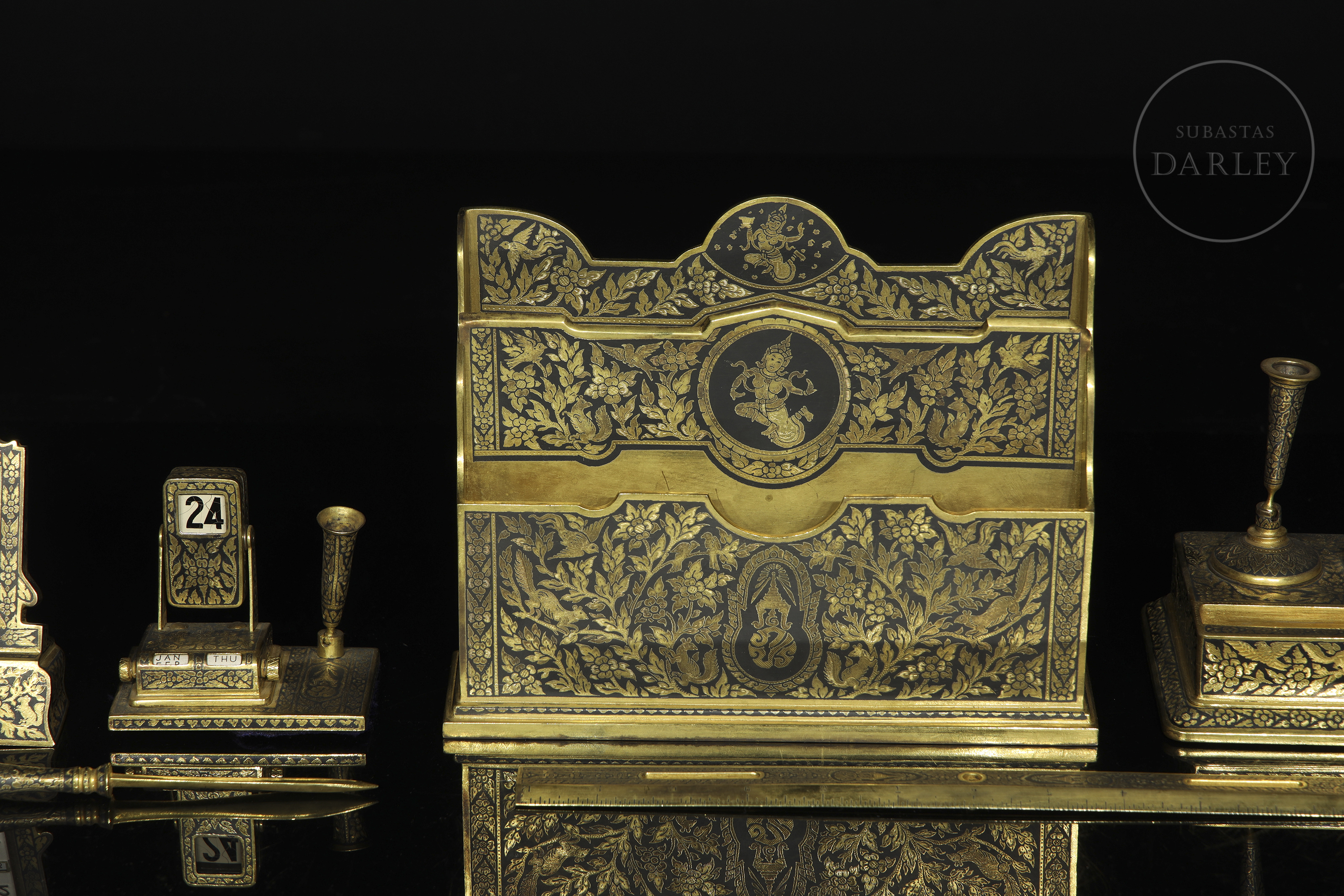 Excepcional conjunto de escritorio de manufactura tailandesa, destaca por su intrincada decoración nielada con motivos de deidades budistas y elementos vegetales sobre fondo oscuro. Presentado en maletín de terciopelo púrpura.