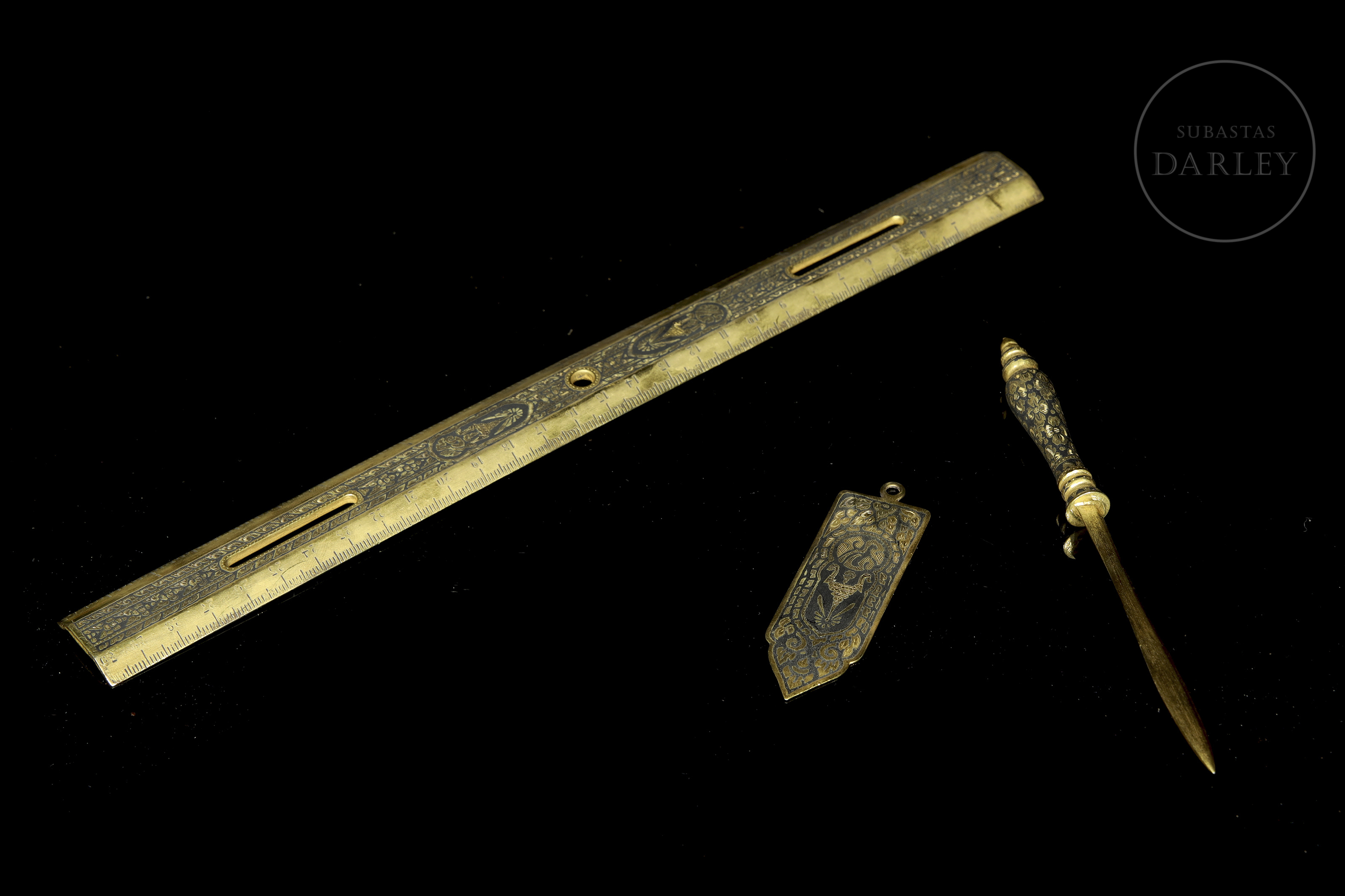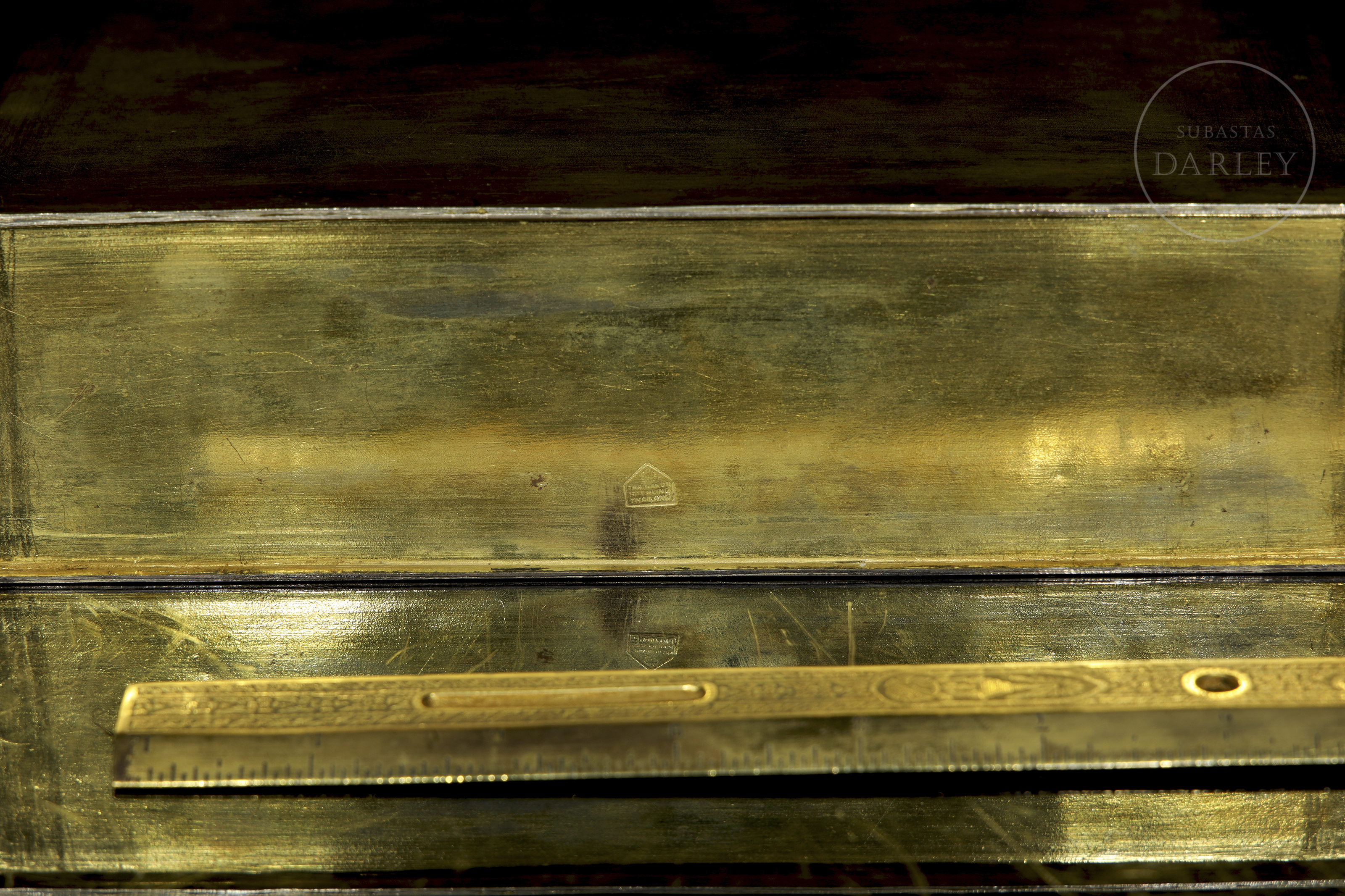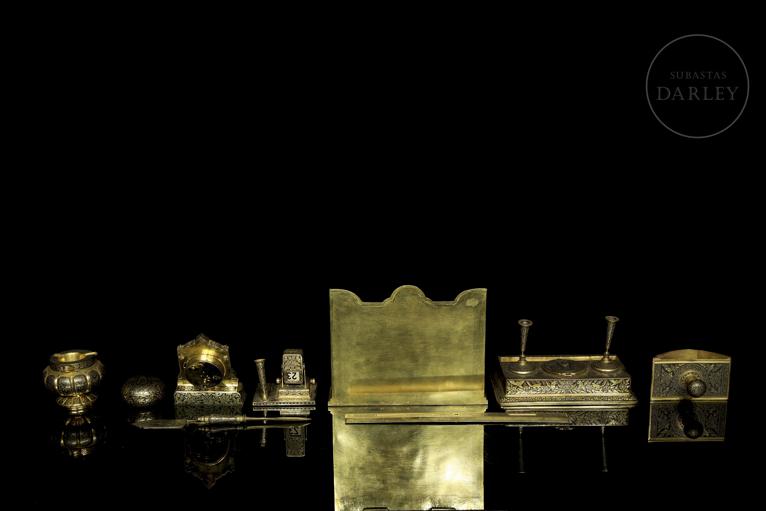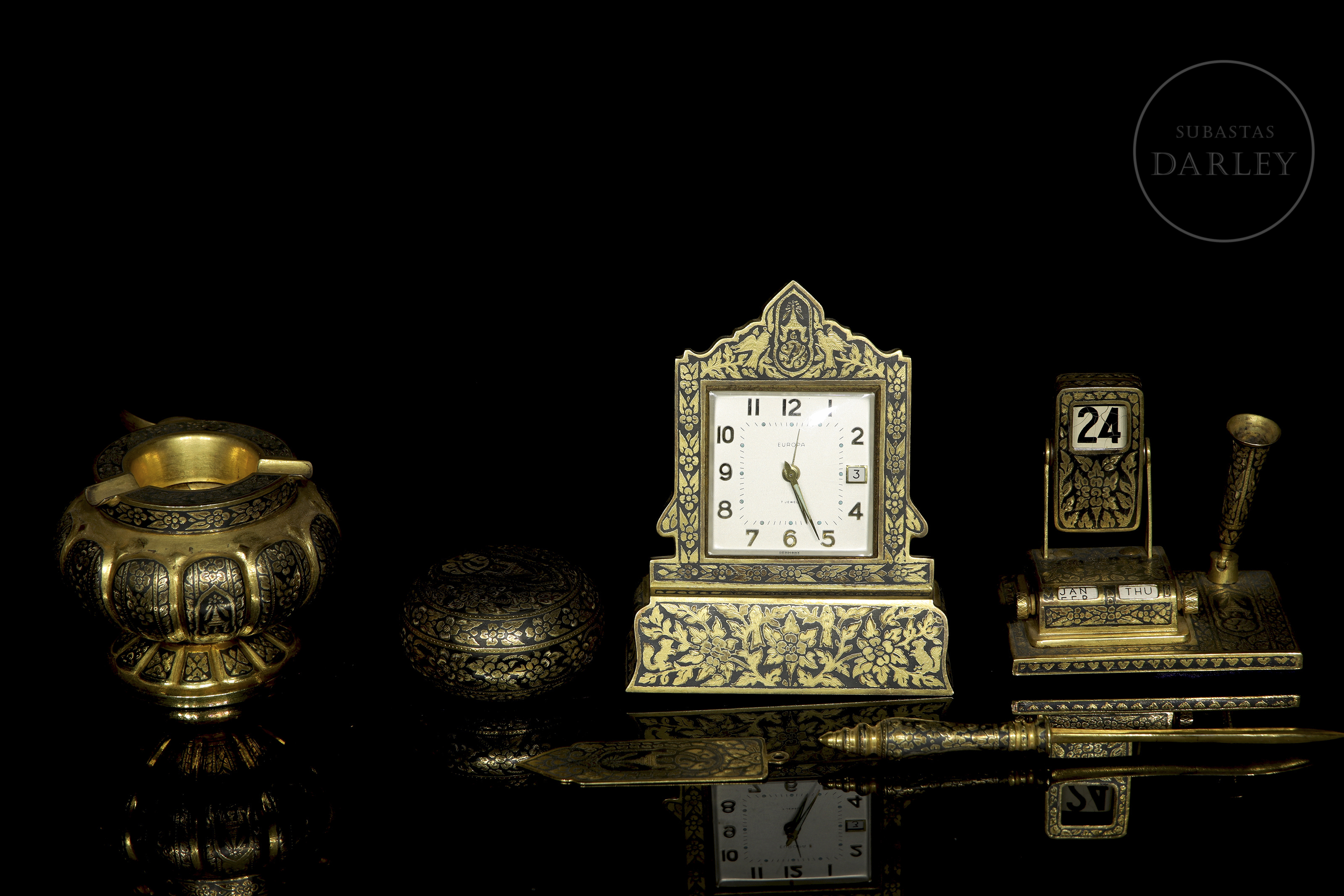 Excepcional conjunto de escritorio de manufactura tailandesa, destaca por su intrincada decoración nielada con motivos de deidades budistas y elementos vegetales sobre fondo oscuro. Presentado en maletín de terciopelo púrpura.