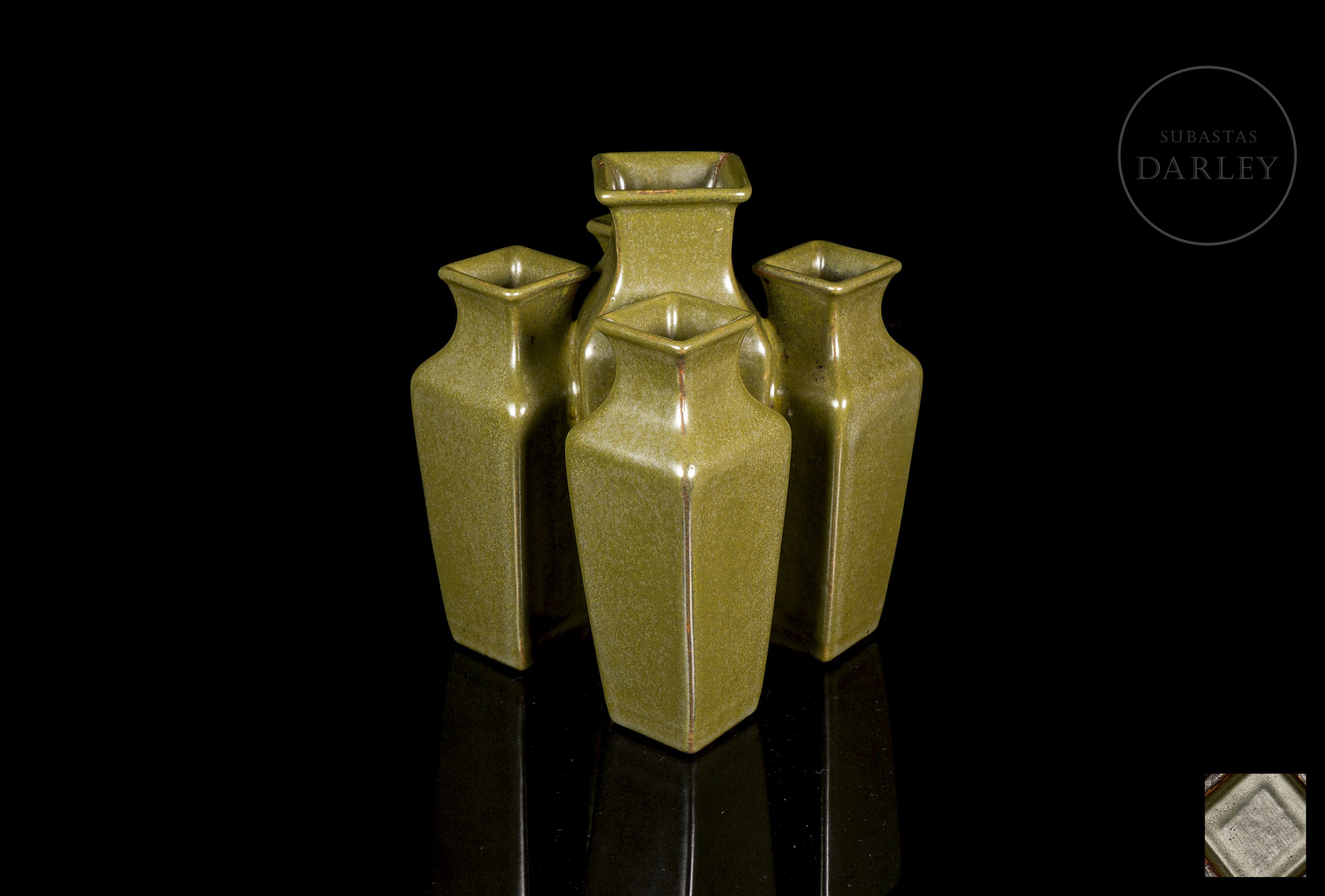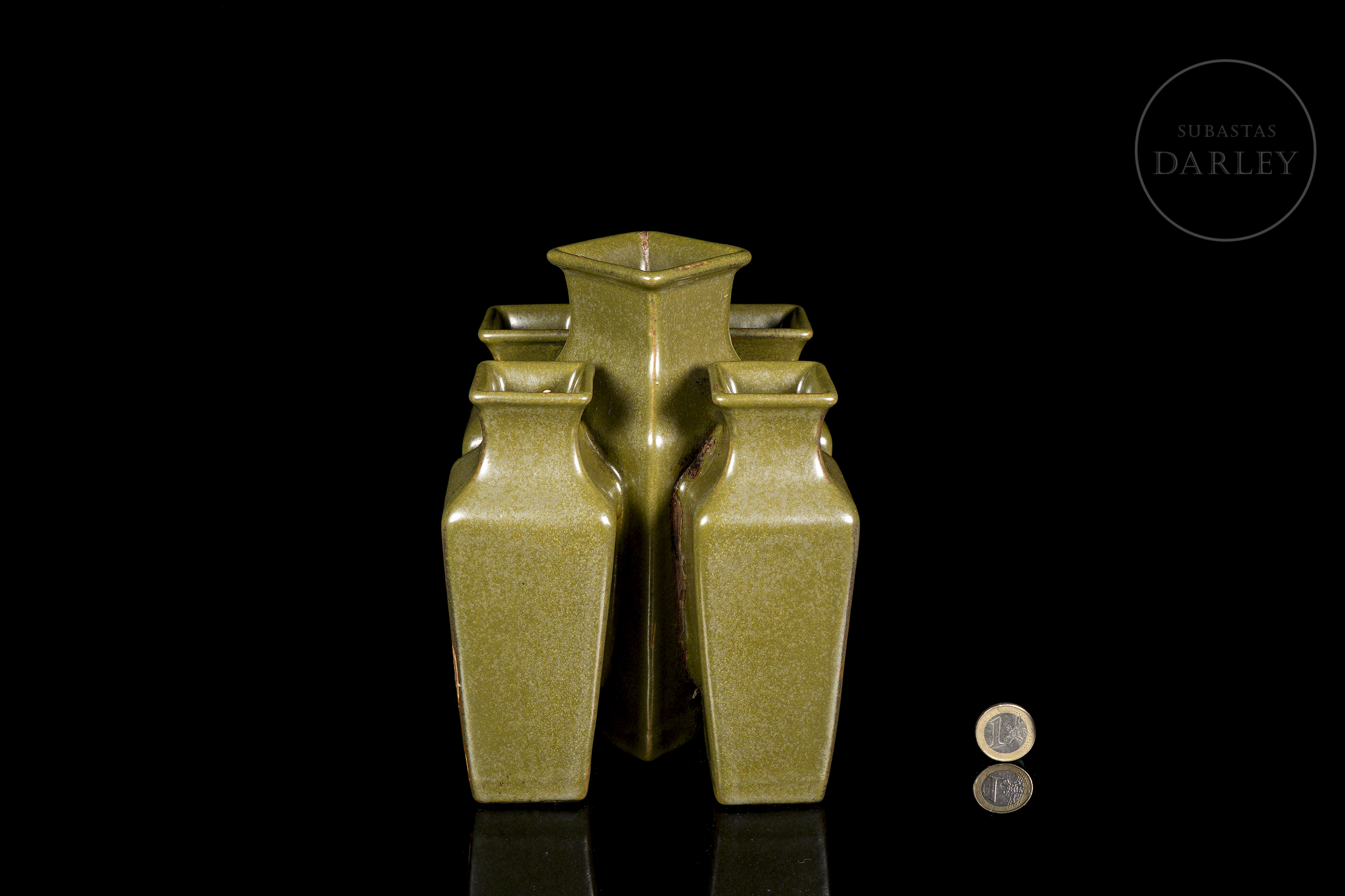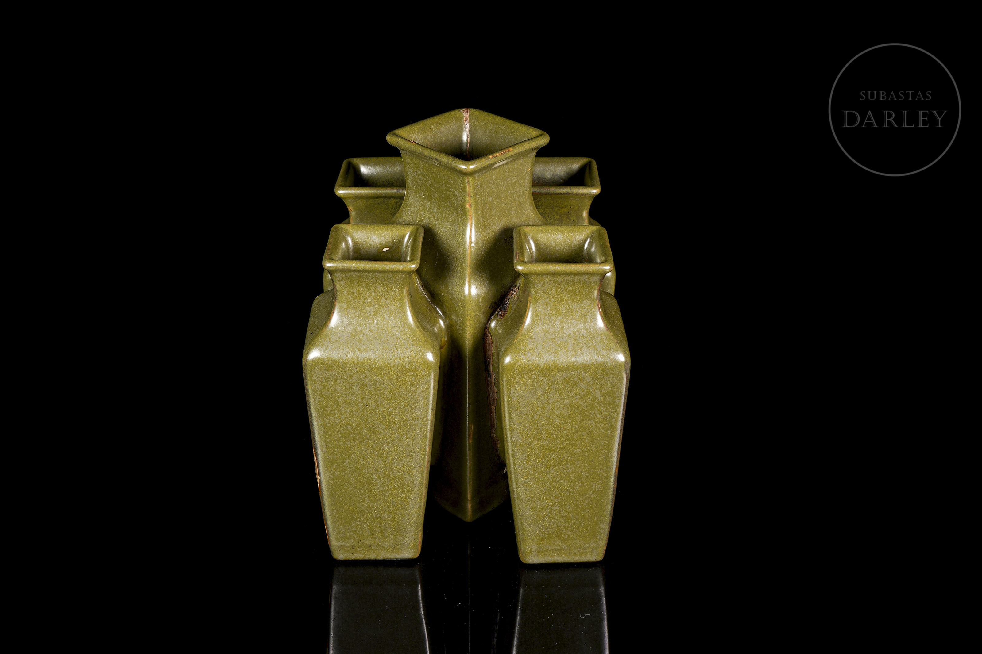 Jarrón de forma arquitectónica, compuesto por cinco recipientes de sección cuadrada unidos en un solo cuerpos. Este tipo de pieza, conocida como jarrón quintal, está completamente cubierta por un refinado esmalte "polvo de té", de acabado texturizado y color verde oliva. La base presenta una marca de seis caracteres “大清乾隆年制”.
