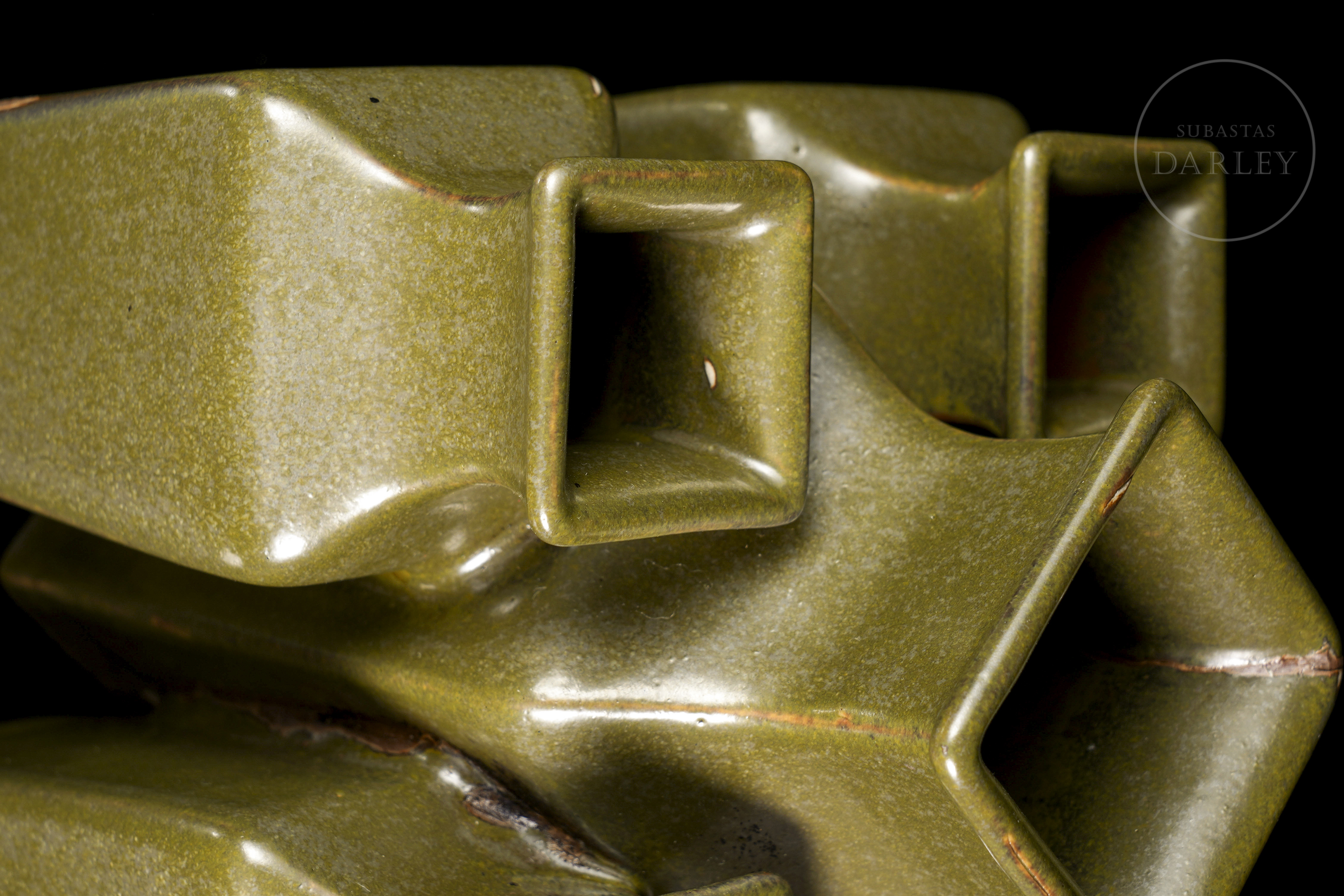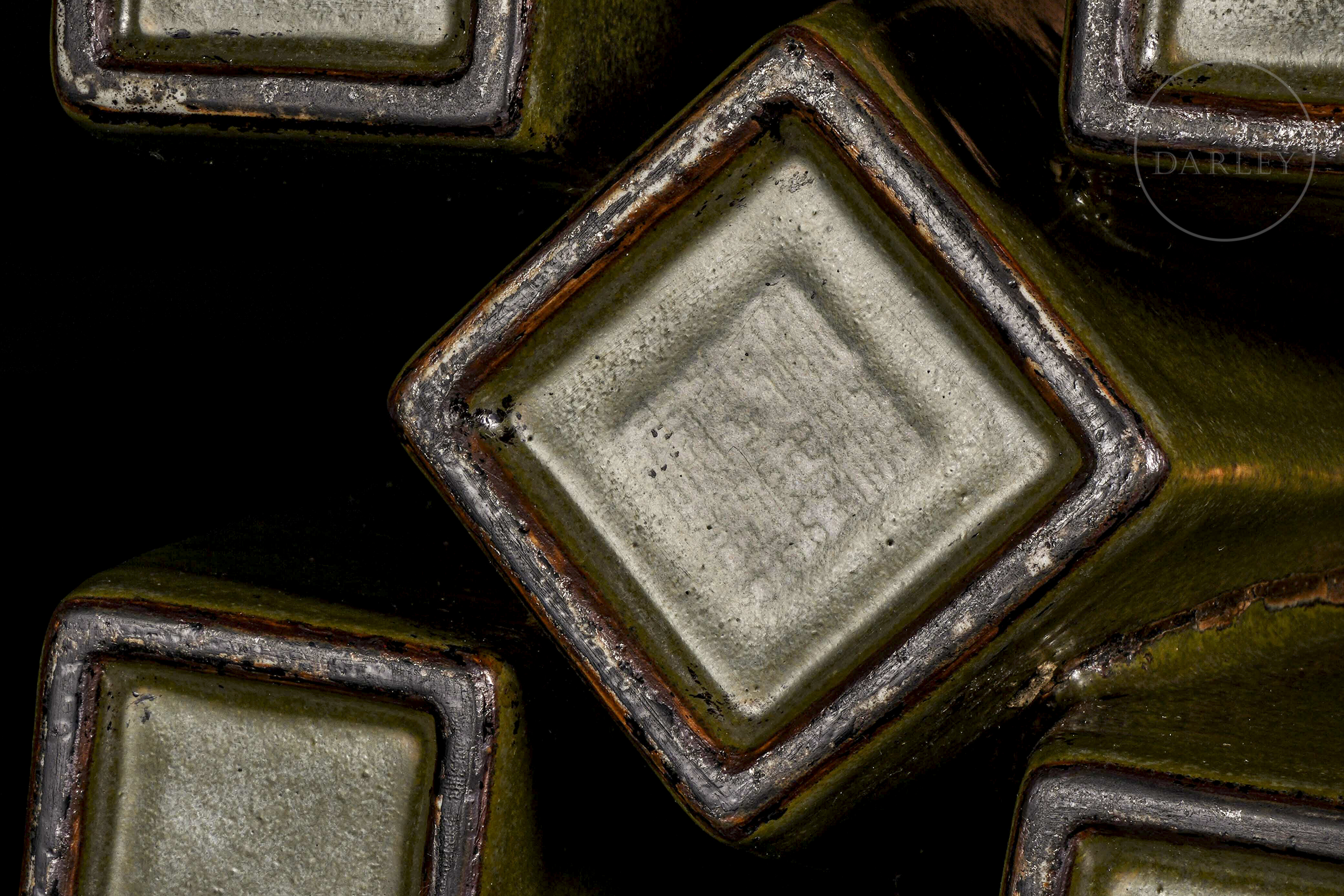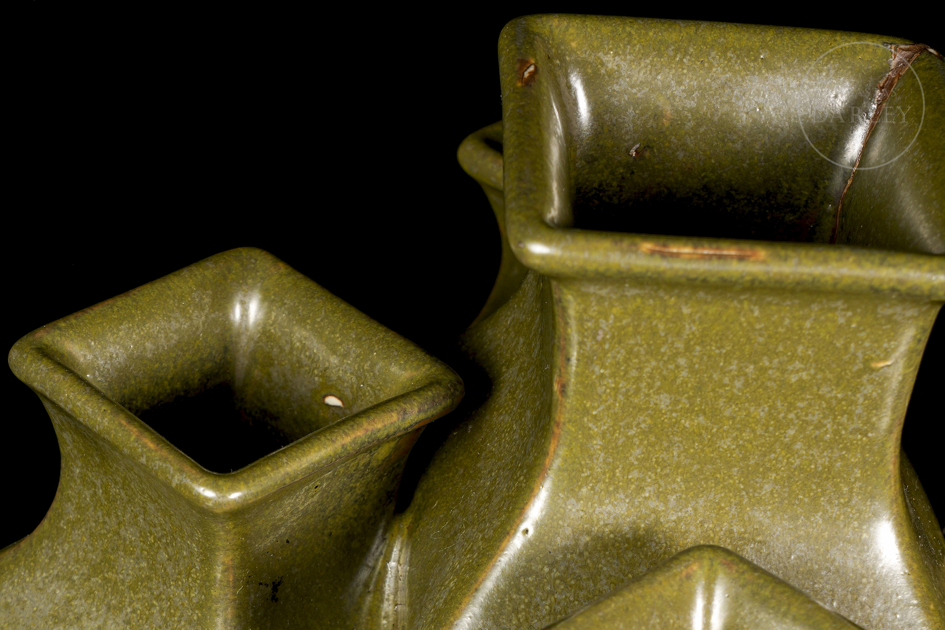 Jarrón de forma arquitectónica, compuesto por cinco recipientes de sección cuadrada unidos en un solo cuerpos. Este tipo de pieza, conocida como jarrón quintal, está completamente cubierta por un refinado esmalte "polvo de té", de acabado texturizado y color verde oliva. La base presenta una marca de seis caracteres “大清乾隆年制”.