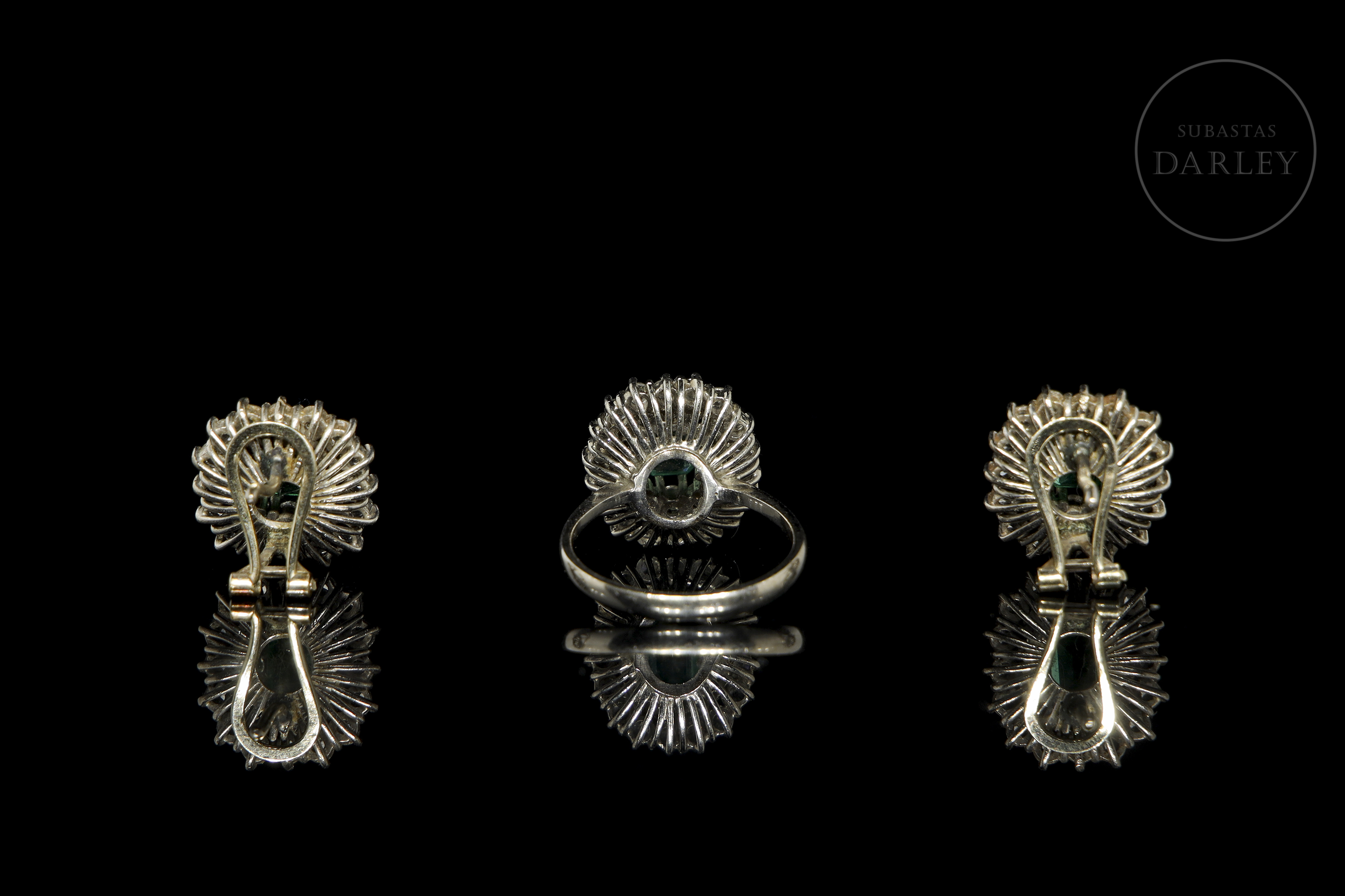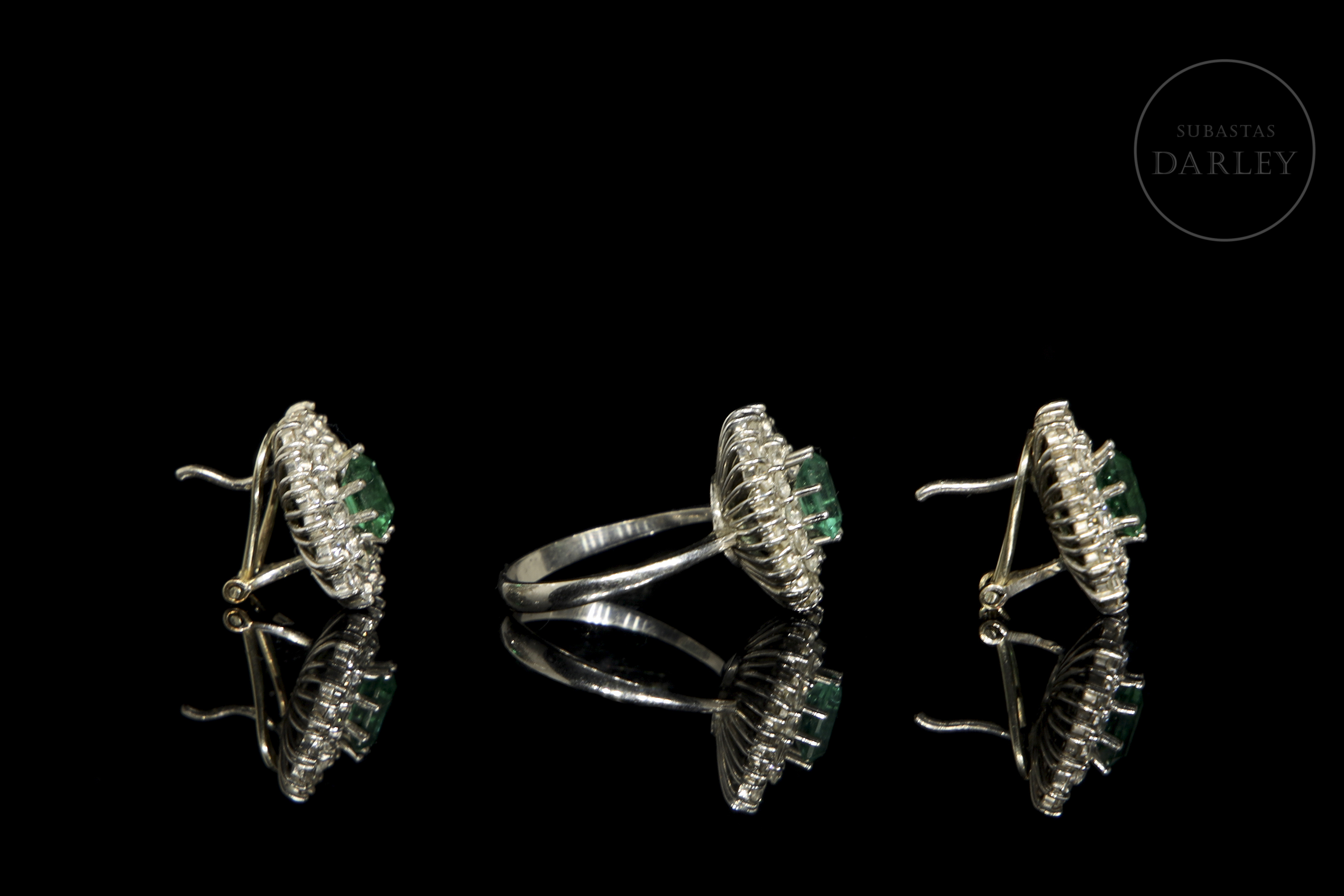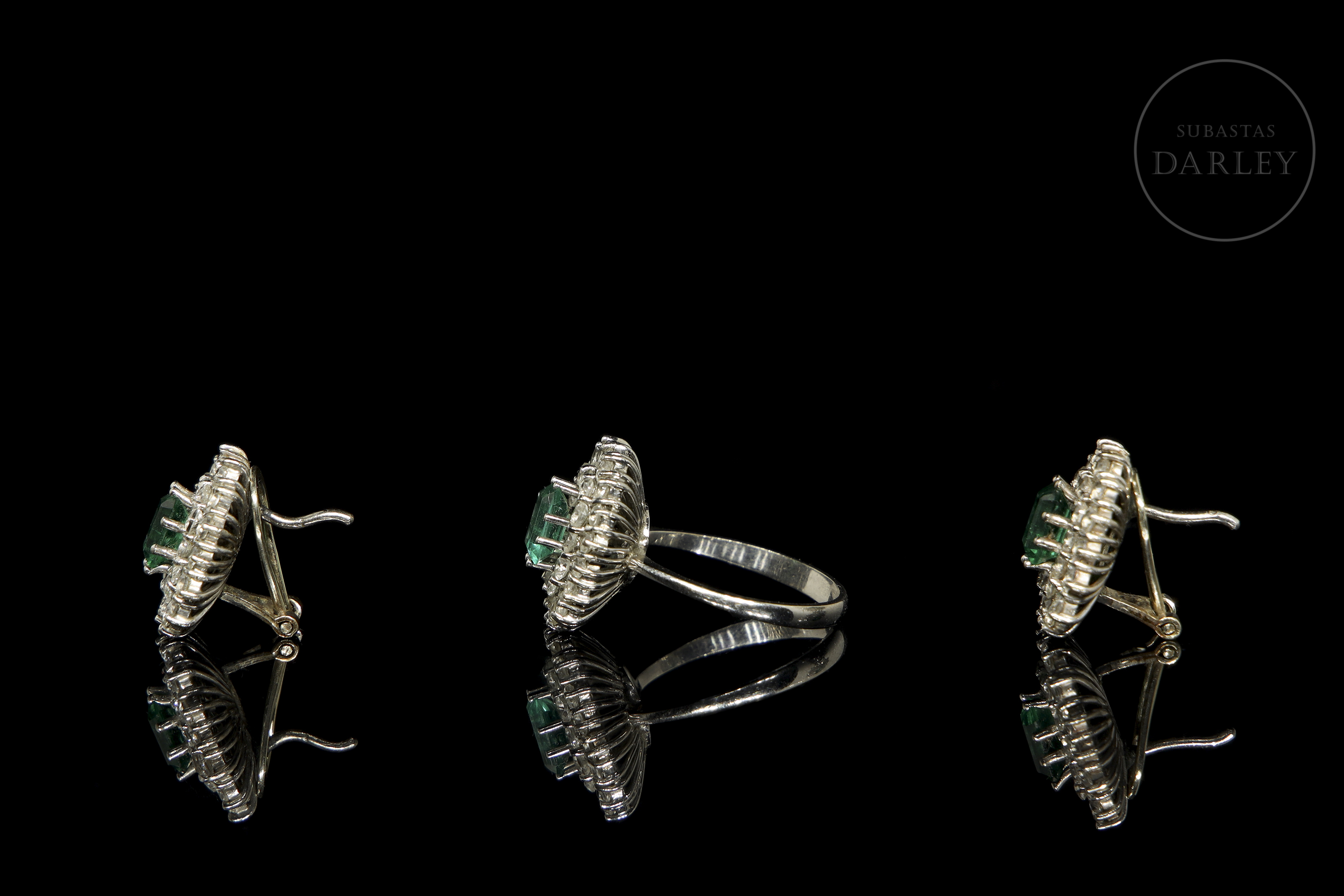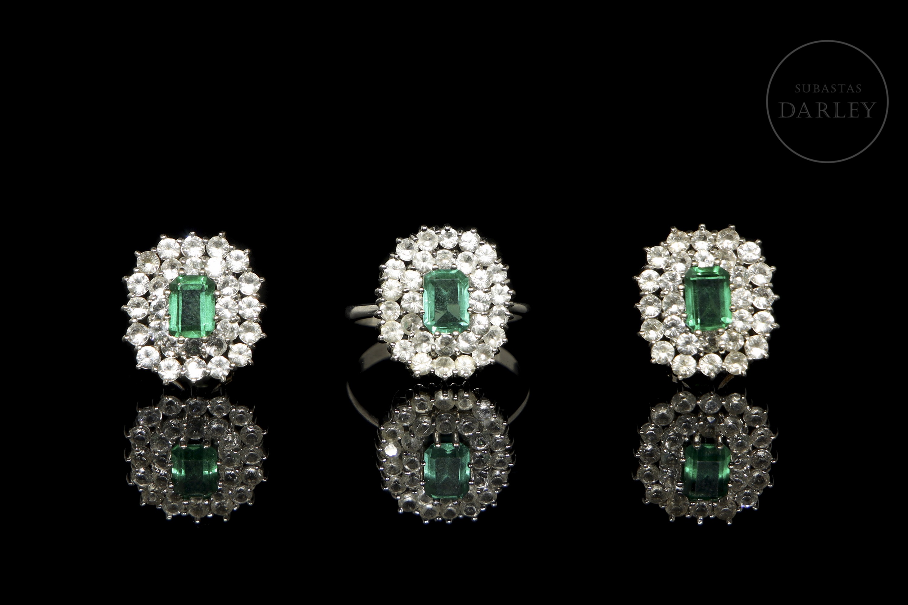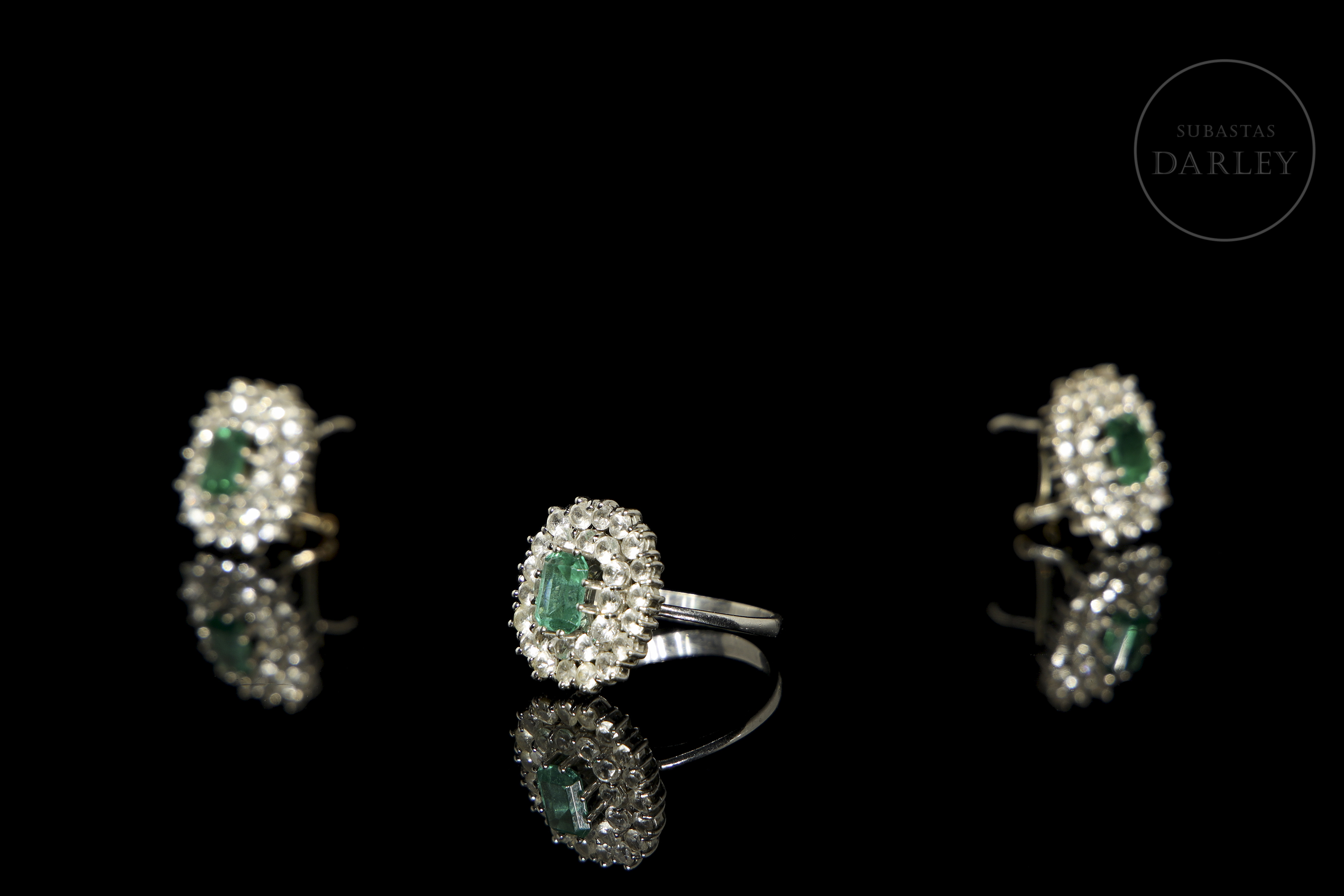Conjunto de pendientes y anillo en oro blanco de 18 k. Se componen por una esmeralda sintética central, rodeada por una doble orla de circonitas encastadas en garras. Cierre tipo pala omega.