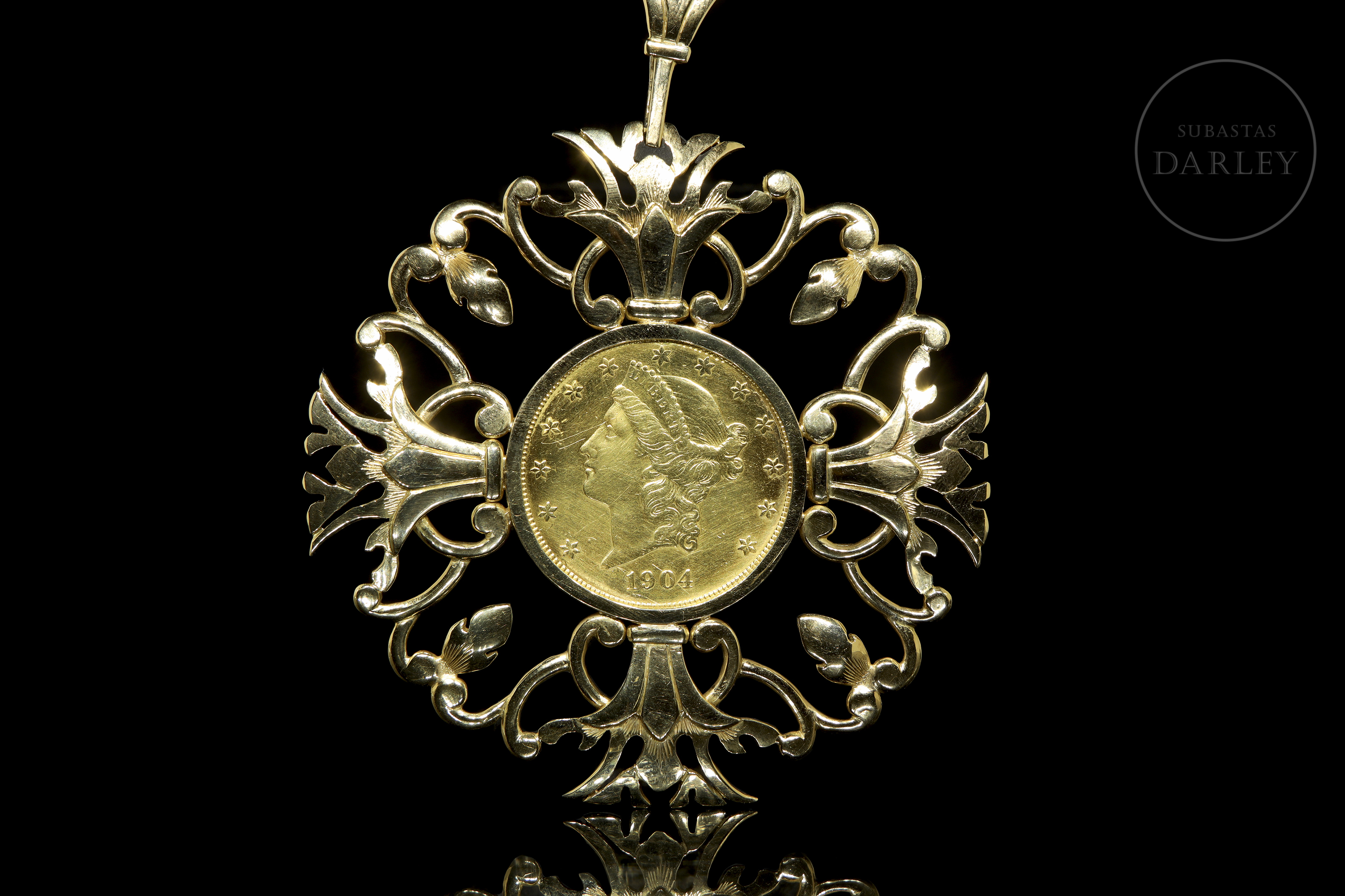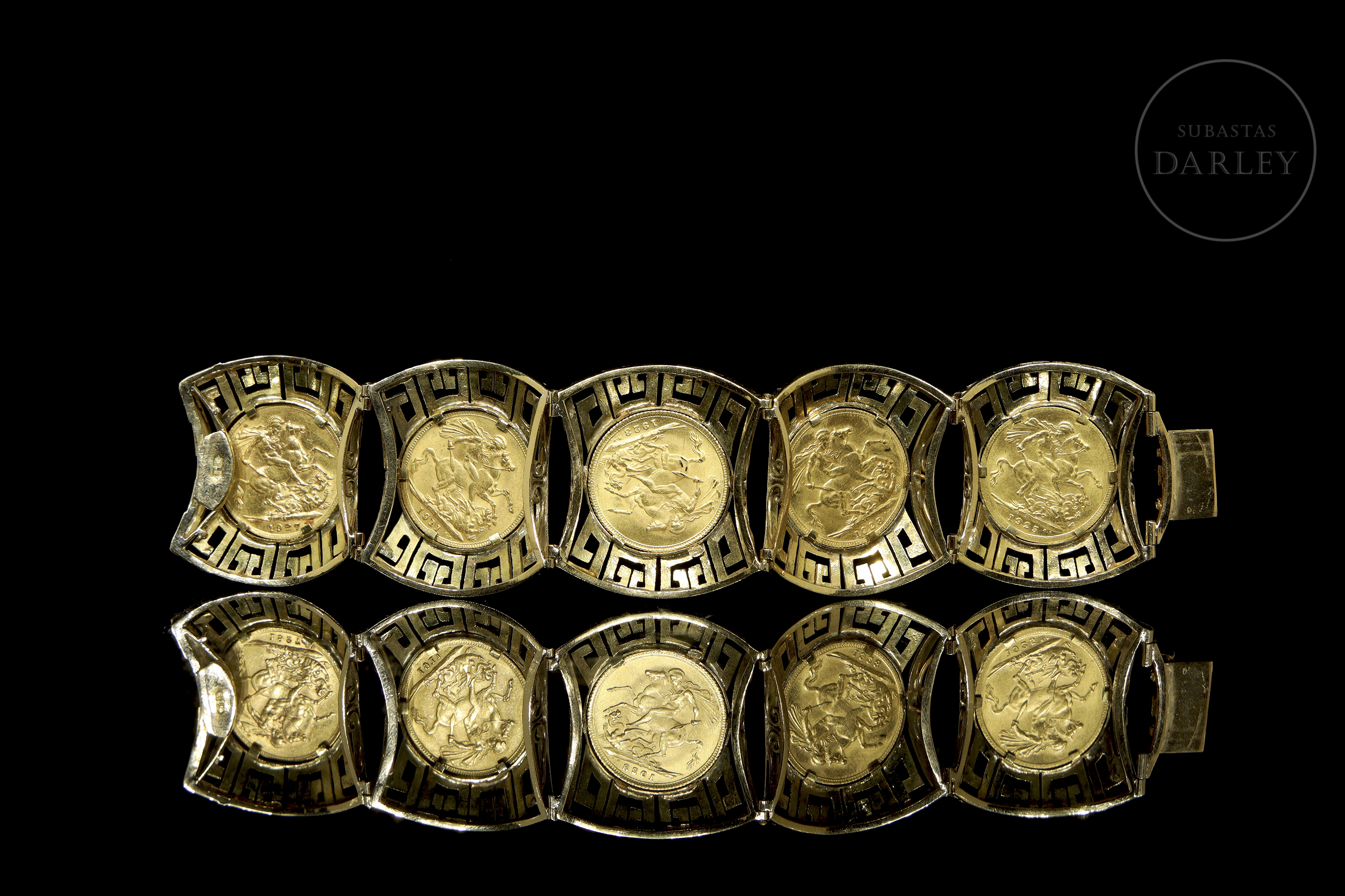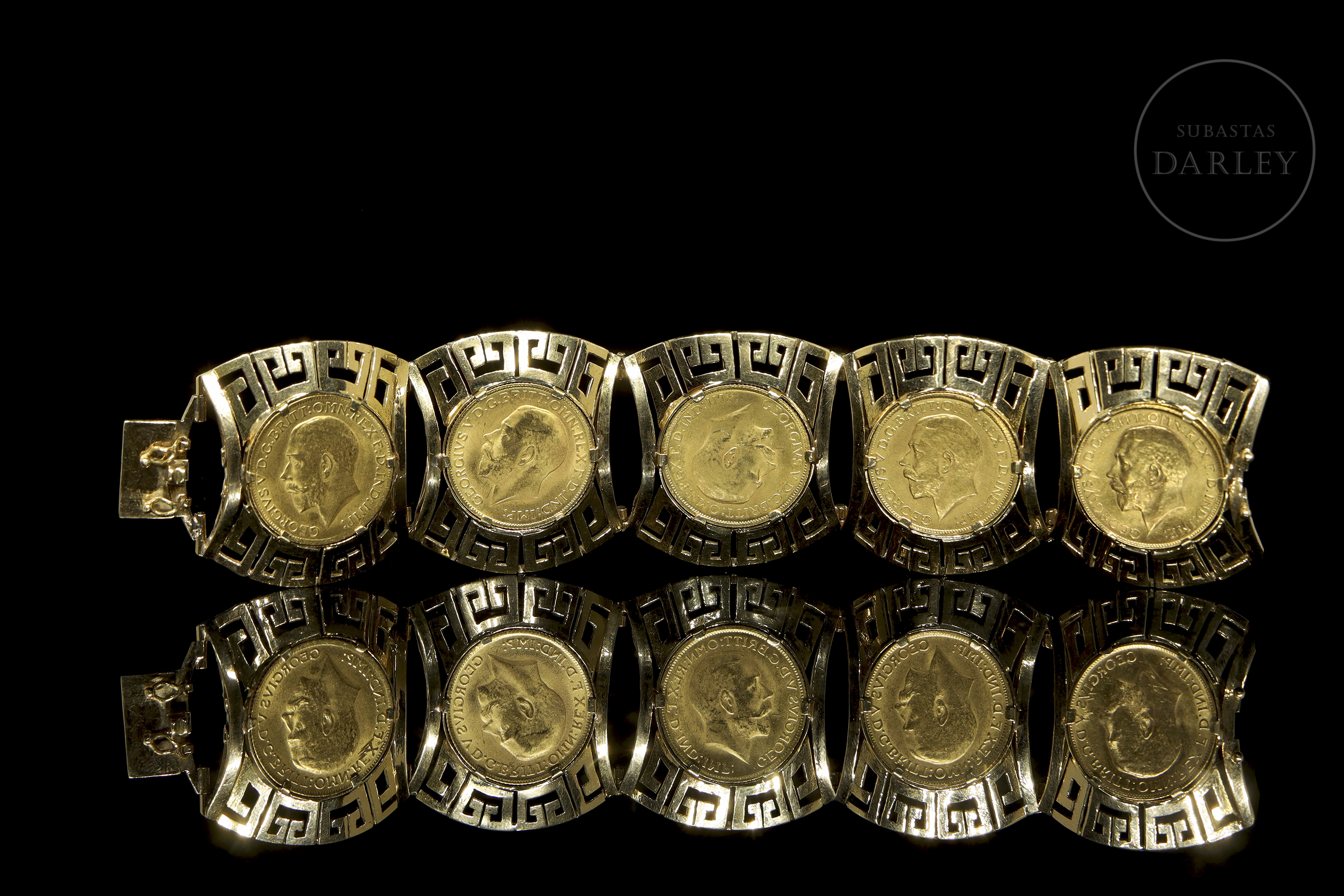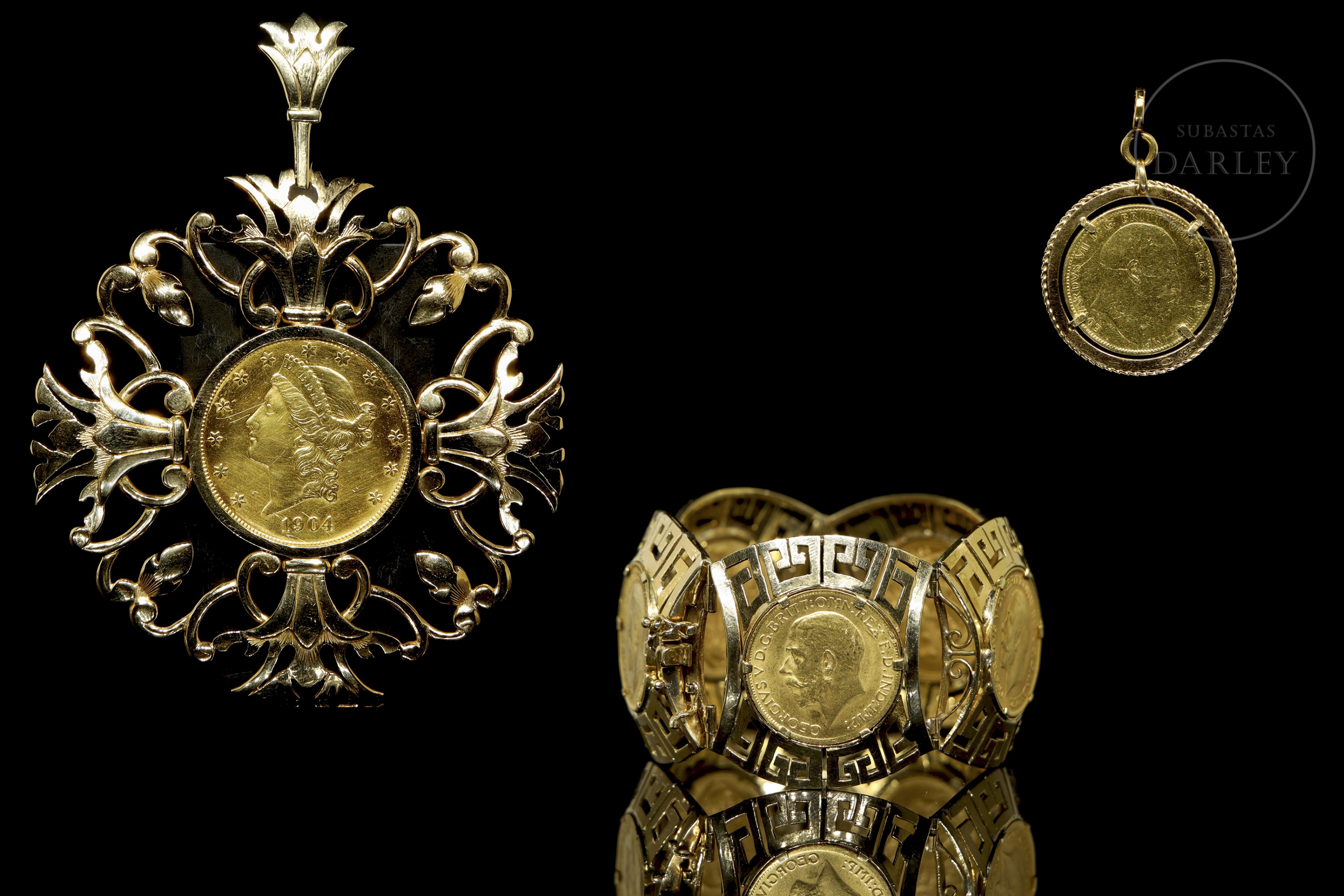 Conjunto de pulsera de oro "Georgius V", colgante "20 Dólares" y colgante "Eduardo VII"
