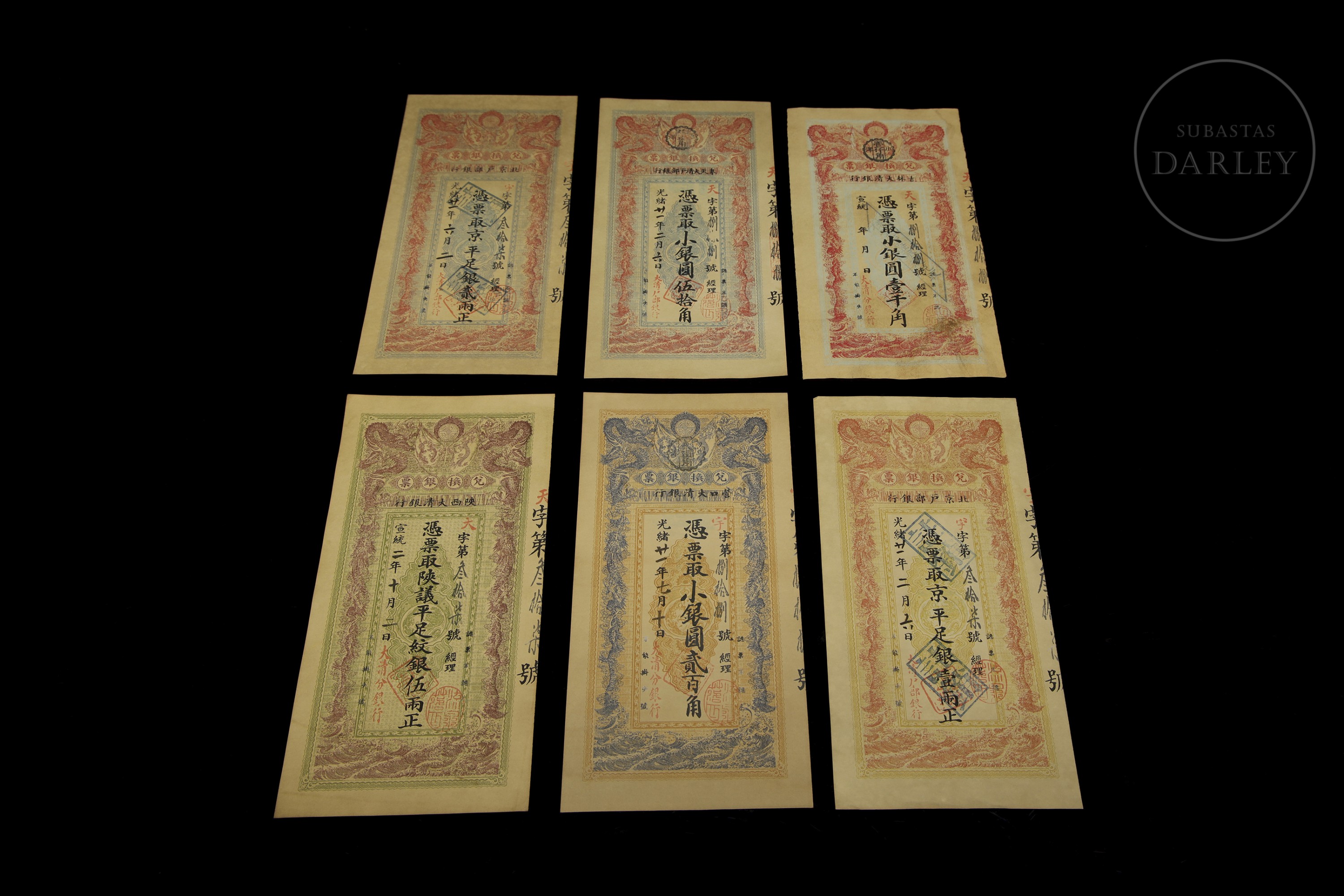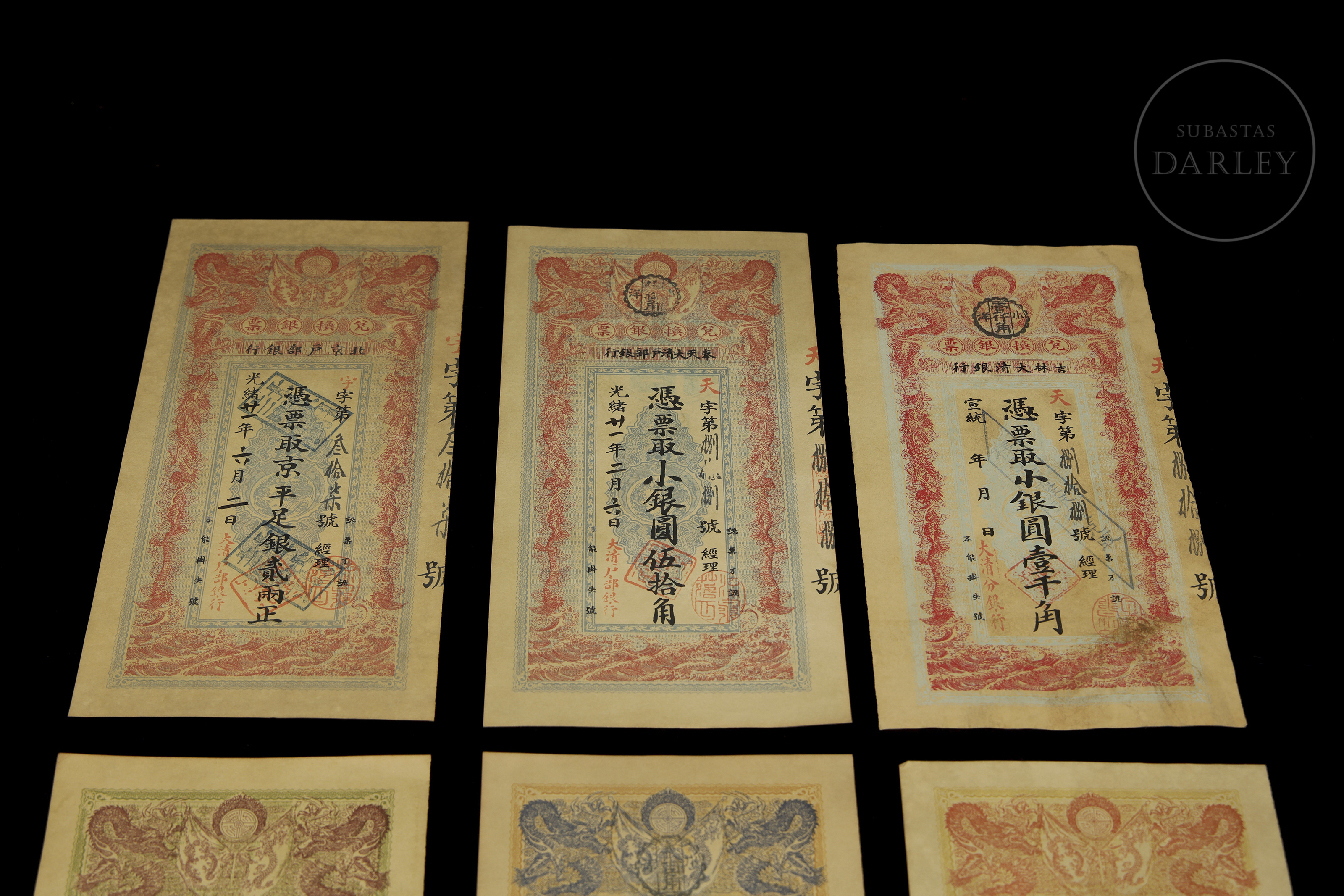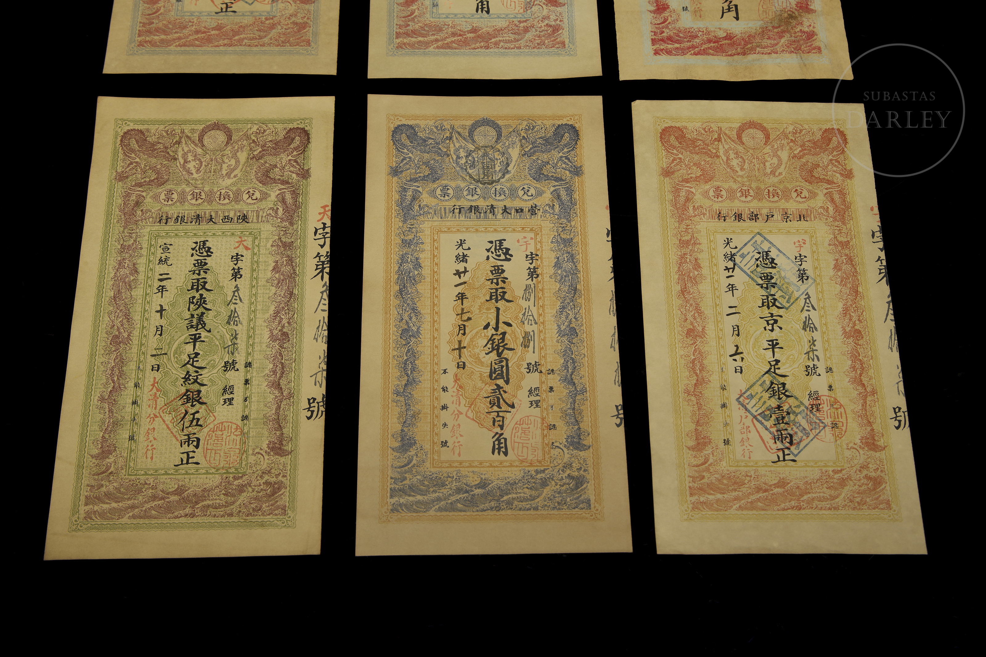 Lote compuesto por seis billetes chinos de gran formato, característicos del periodo de la República (principios del s.XX). Las piezas presentan una rica ornamentación con motivos de olas y dragones. El lote incluye emisiones de The Hongkong and Shanghai Banking Corporation (HSBC).
