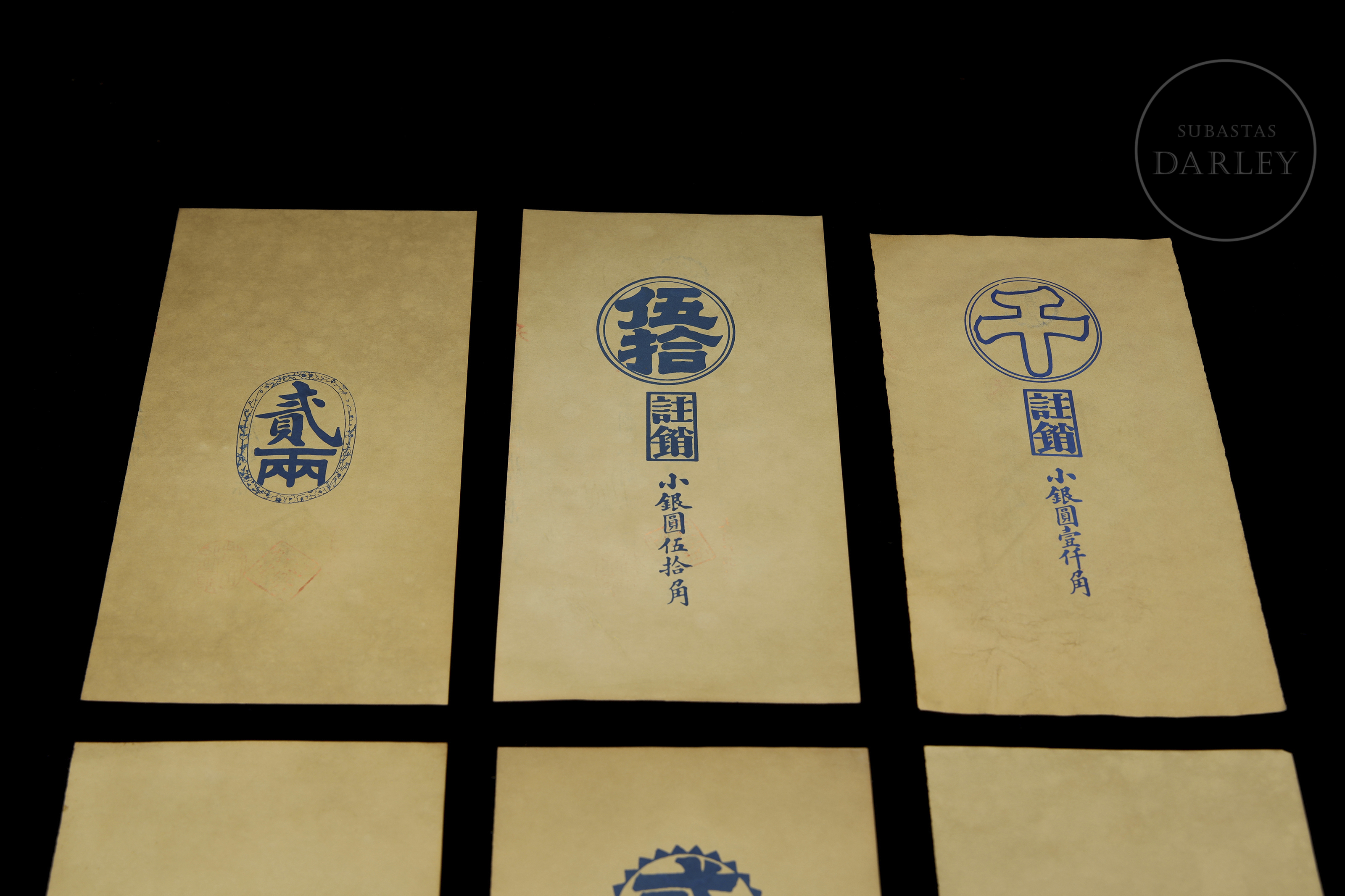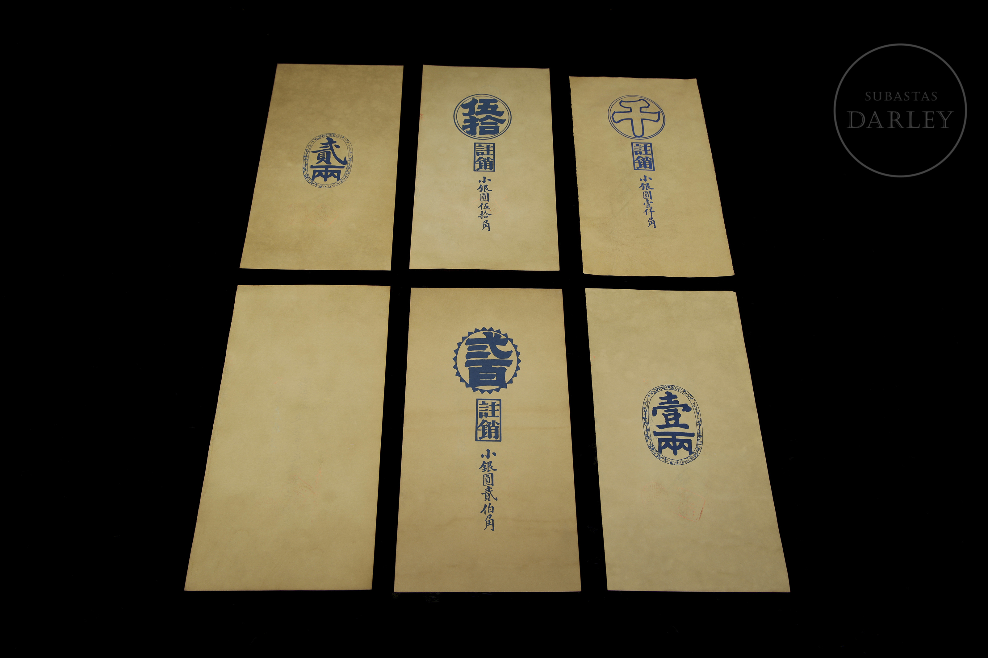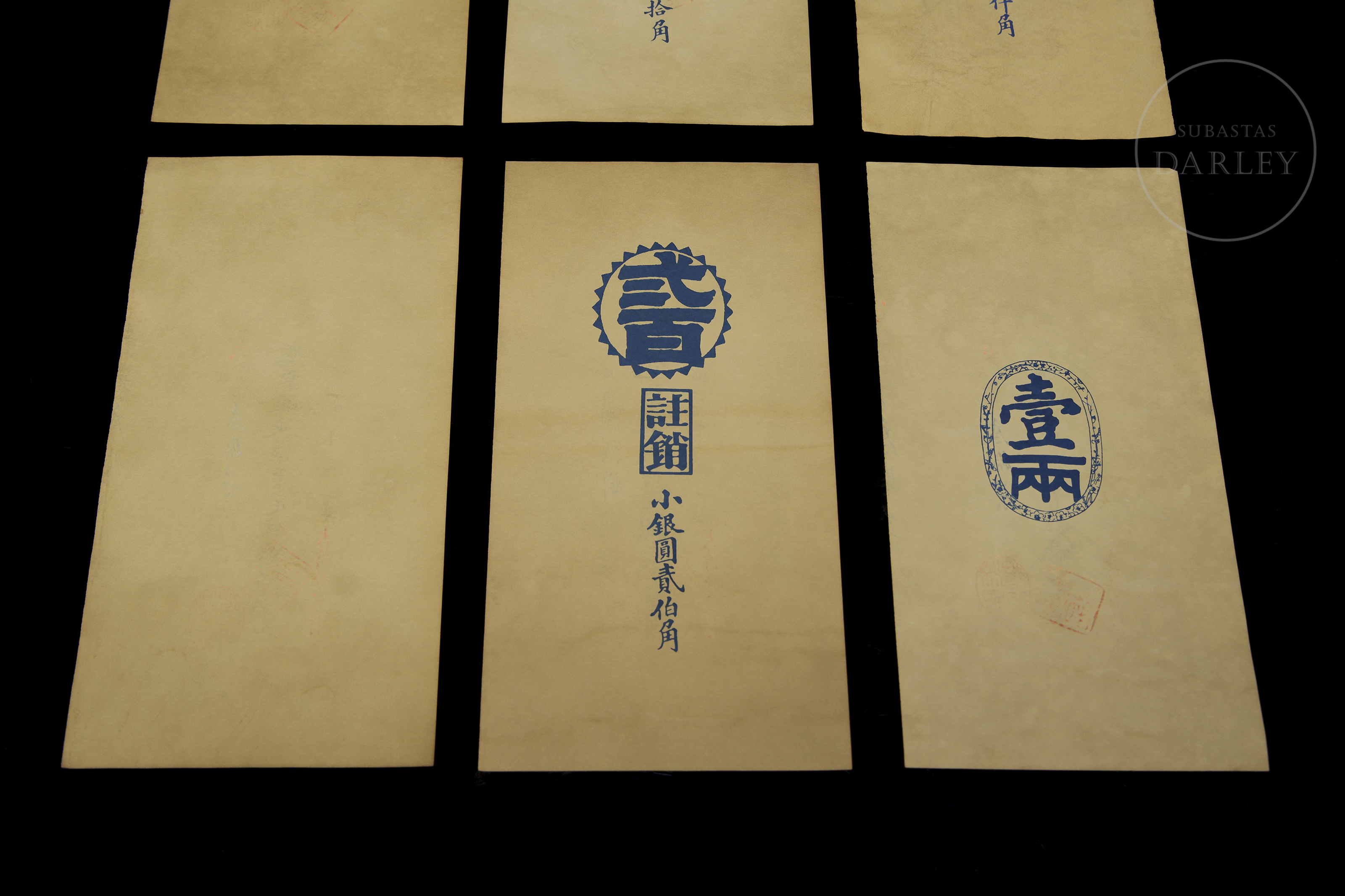 Lote compuesto por seis billetes chinos de gran formato, característicos del periodo de la República (principios del s.XX). Las piezas presentan una rica ornamentación con motivos de olas y dragones. El lote incluye emisiones de The Hongkong and Shanghai Banking Corporation (HSBC).