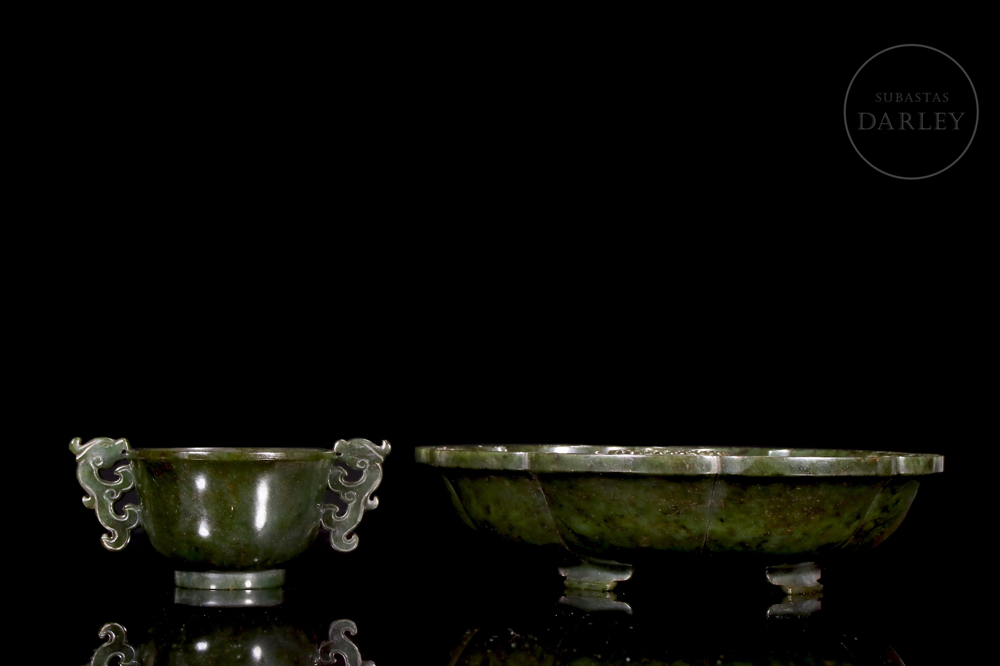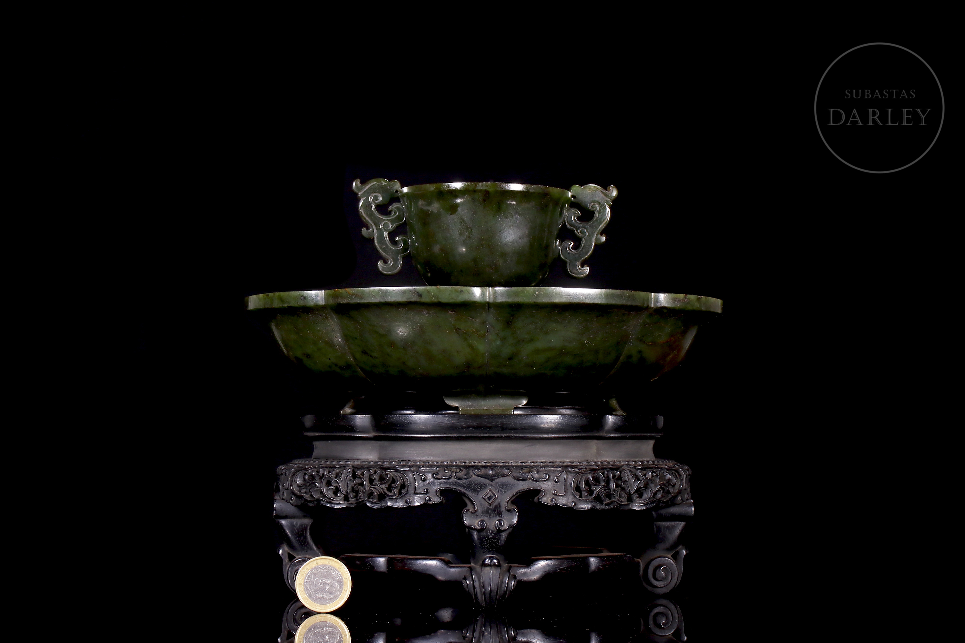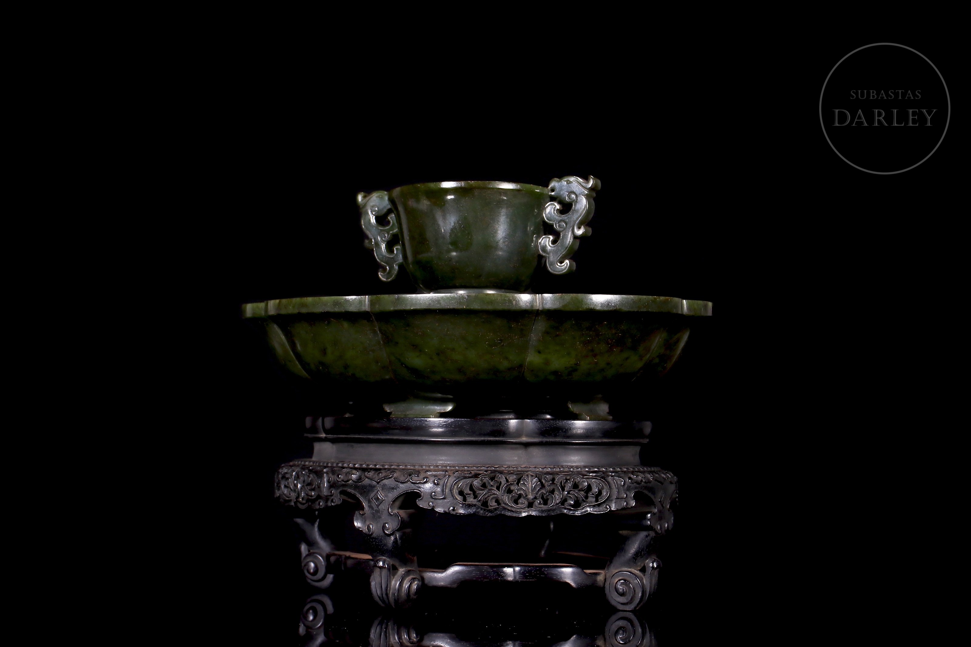Conjunto realizado en jad de tonalidad verde, con inclusiones de magnetita. El conjunto se compone de una taza ceremonial y un gran plato lobulado. La taza se encuentra flanqueada por dos asas caladas en forma de dragones chilong que muerden el borde. El plato, se encuentra profusamente adornado con relieves de dragones de cuerpo sinuoso, expresión feroz y afiladas garras que persiguen perlas llameantes entre nubes ruyi. En la base, se dispone un sello inciso de seis caracteres "大清乾隆年制". Una pátina de tacto sedoso y brillo vítreo rodea el conjunto, que descansa sobre una base de madera tallada a medida con motivos de nubes y oquedades. Dinastía Qing (1644-1912).