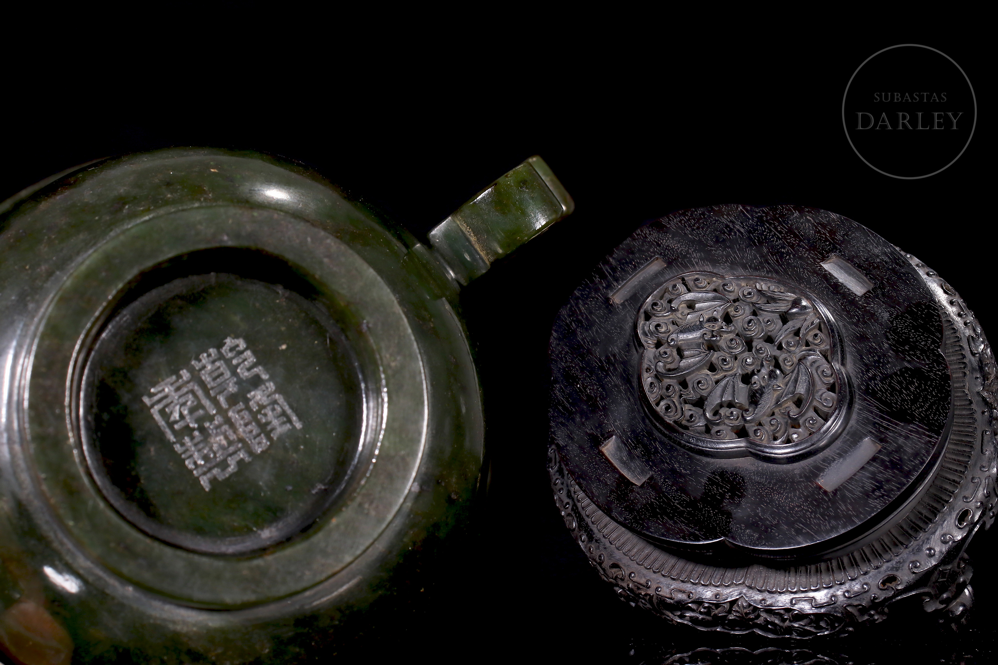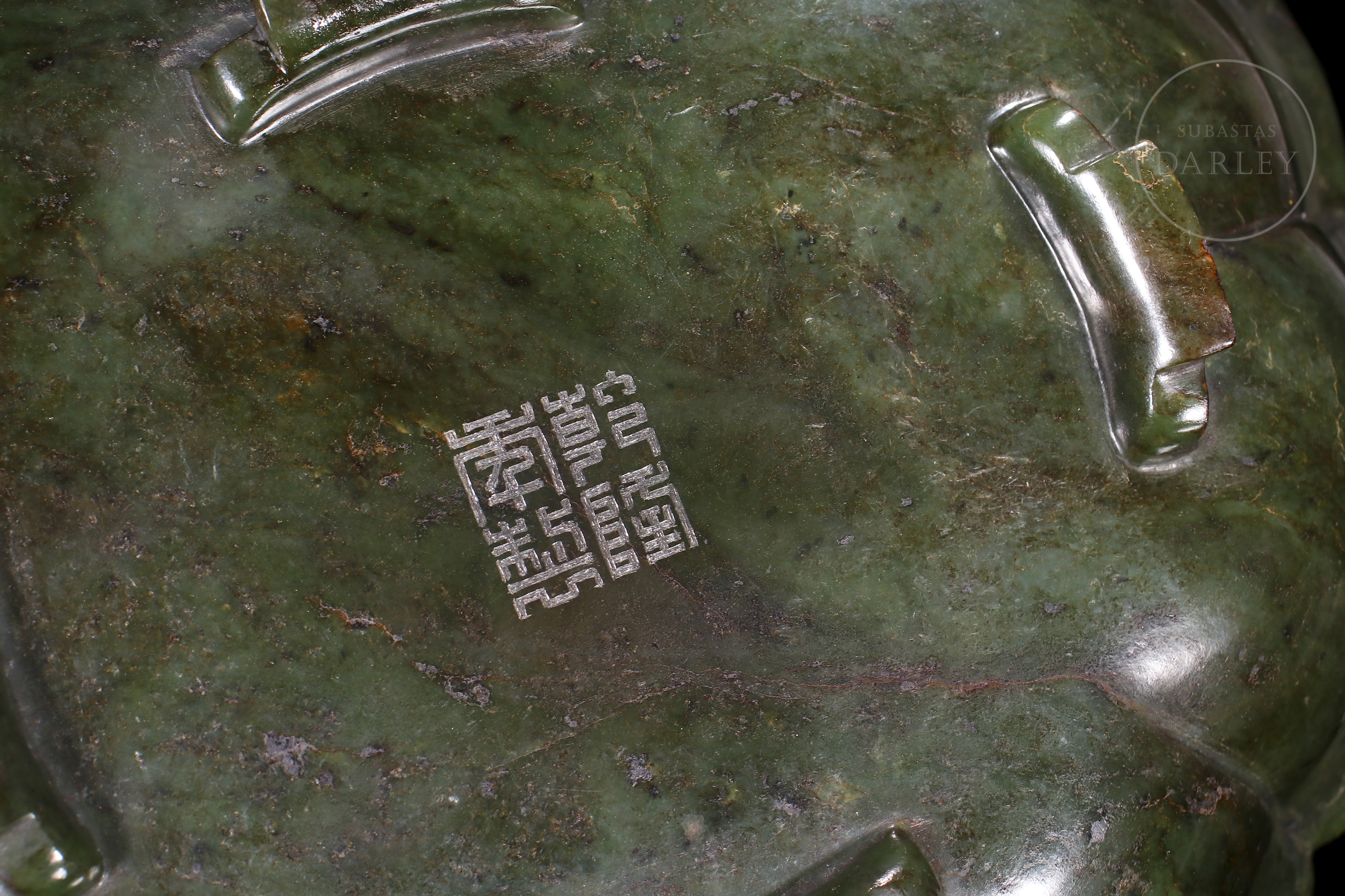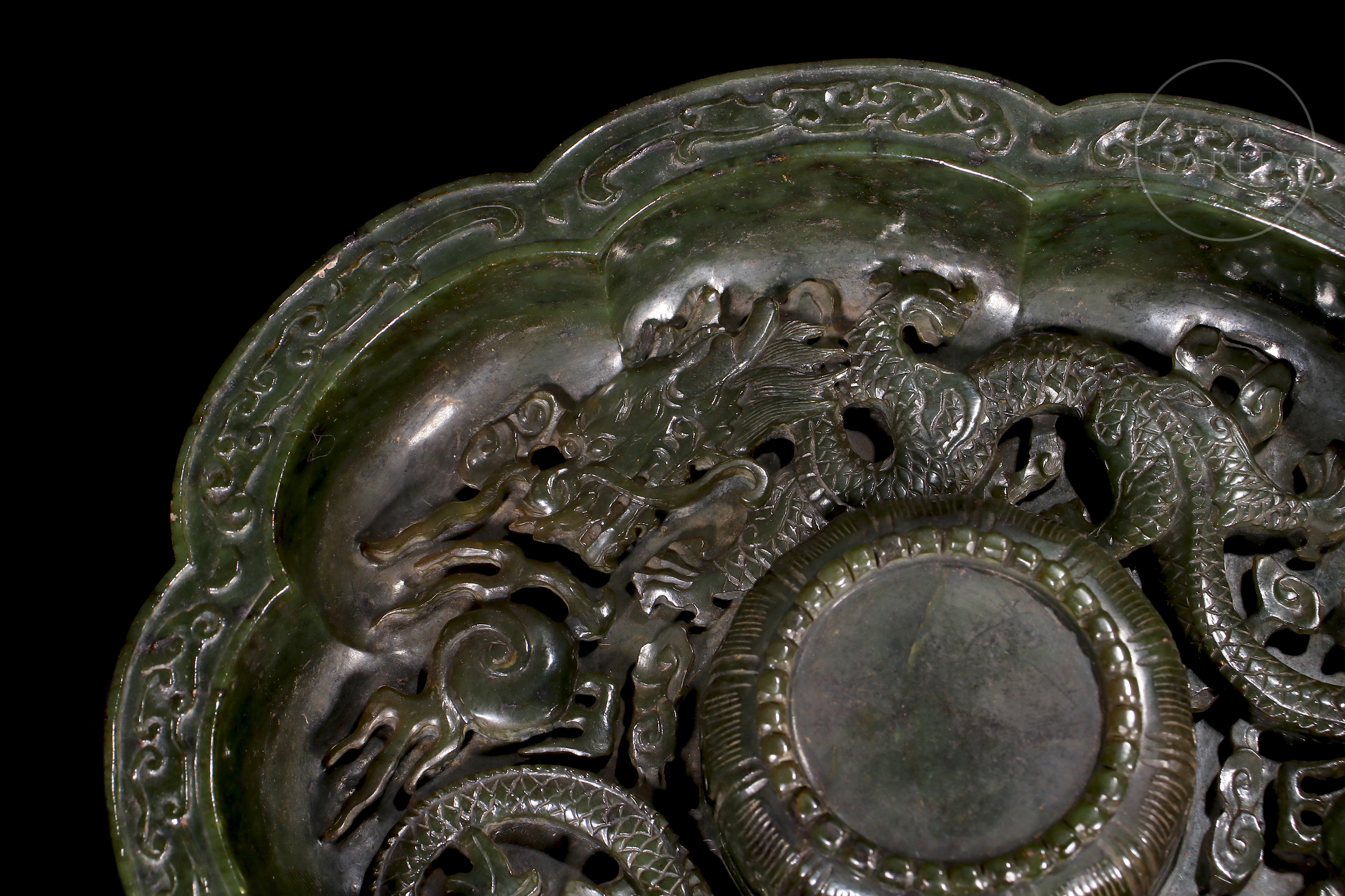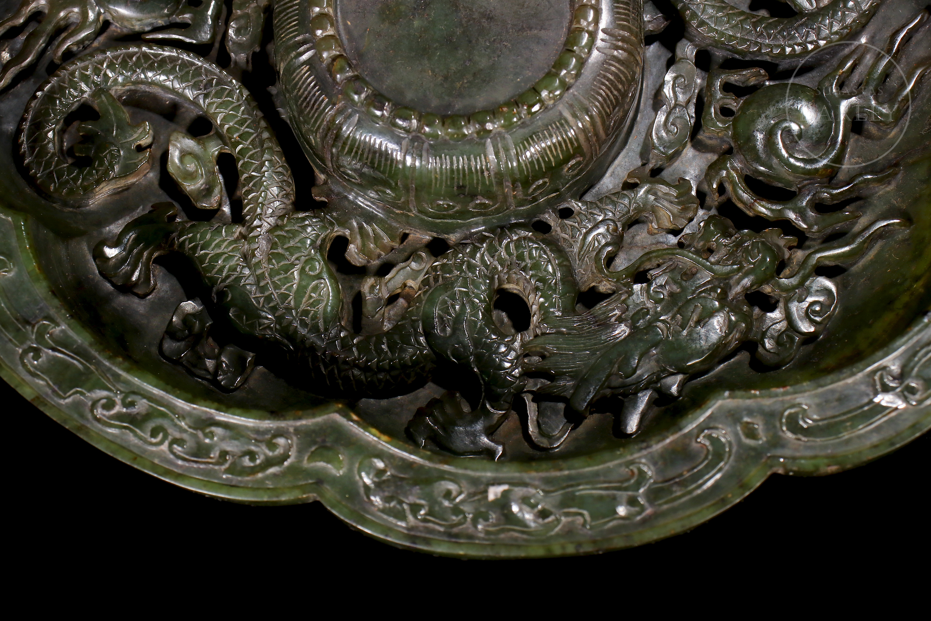 Conjunto realizado en jad de tonalidad verde, con inclusiones de magnetita. El conjunto se compone de una taza ceremonial y un gran plato lobulado. La taza se encuentra flanqueada por dos asas caladas en forma de dragones chilong que muerden el borde. El plato, se encuentra profusamente adornado con relieves de dragones de cuerpo sinuoso, expresión feroz y afiladas garras que persiguen perlas llameantes entre nubes ruyi. En la base, se dispone un sello inciso de seis caracteres "大清乾隆年制". Una pátina de tacto sedoso y brillo vítreo rodea el conjunto, que descansa sobre una base de madera tallada a medida con motivos de nubes y oquedades. Dinastía Qing (1644-1912).