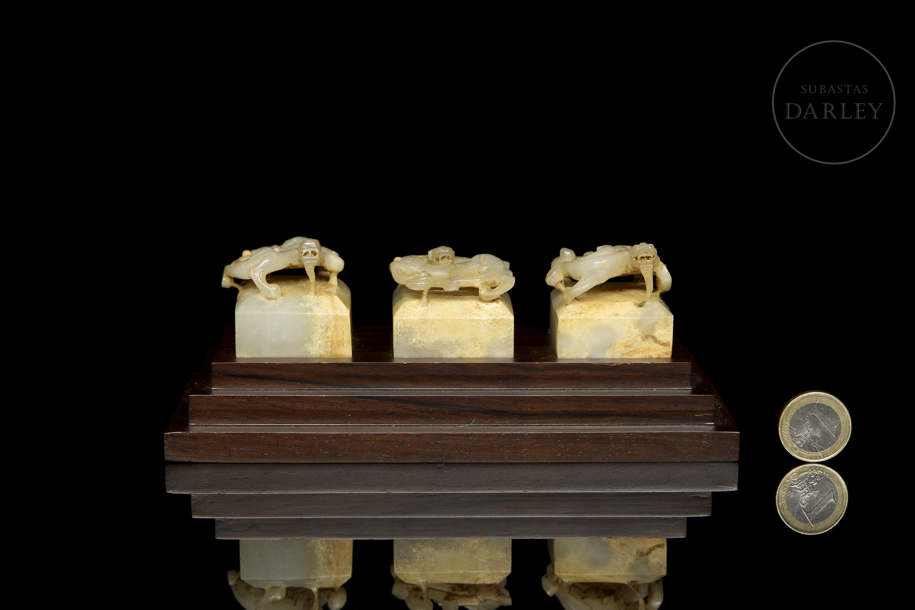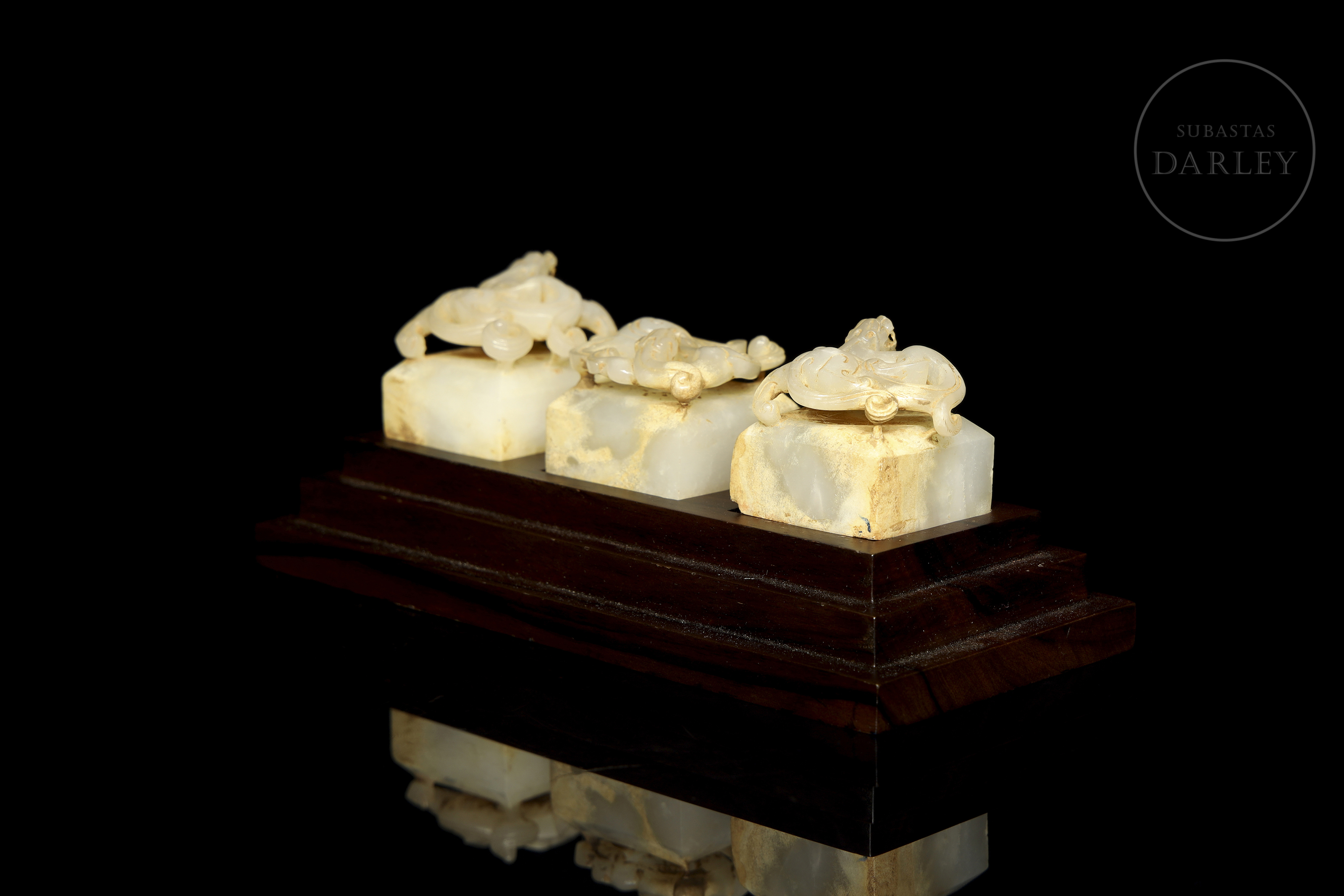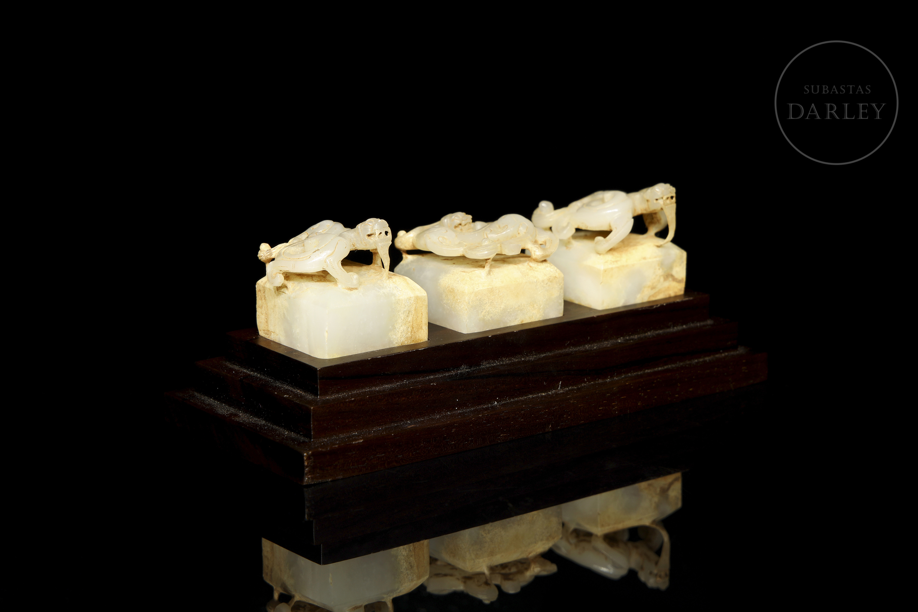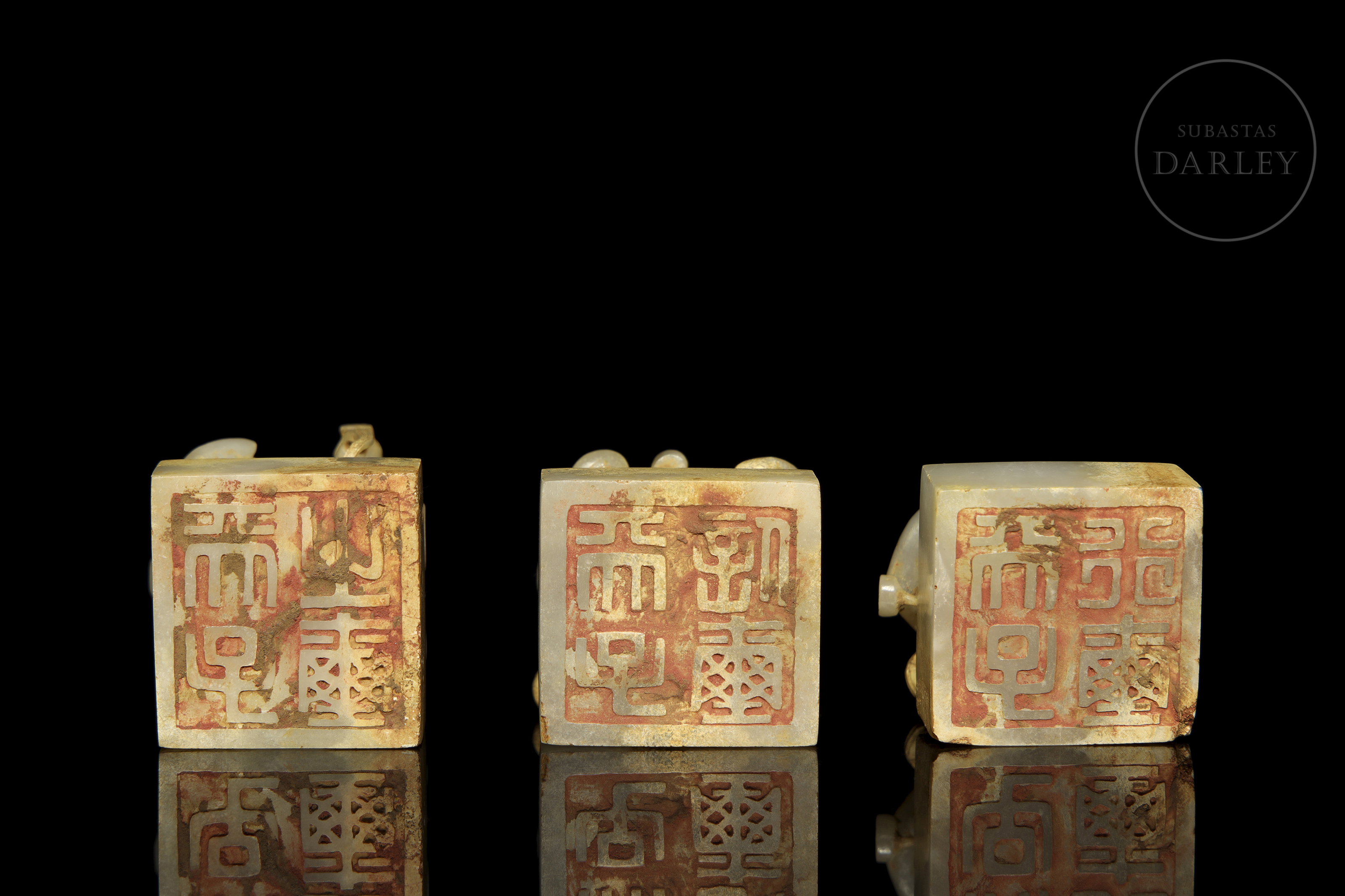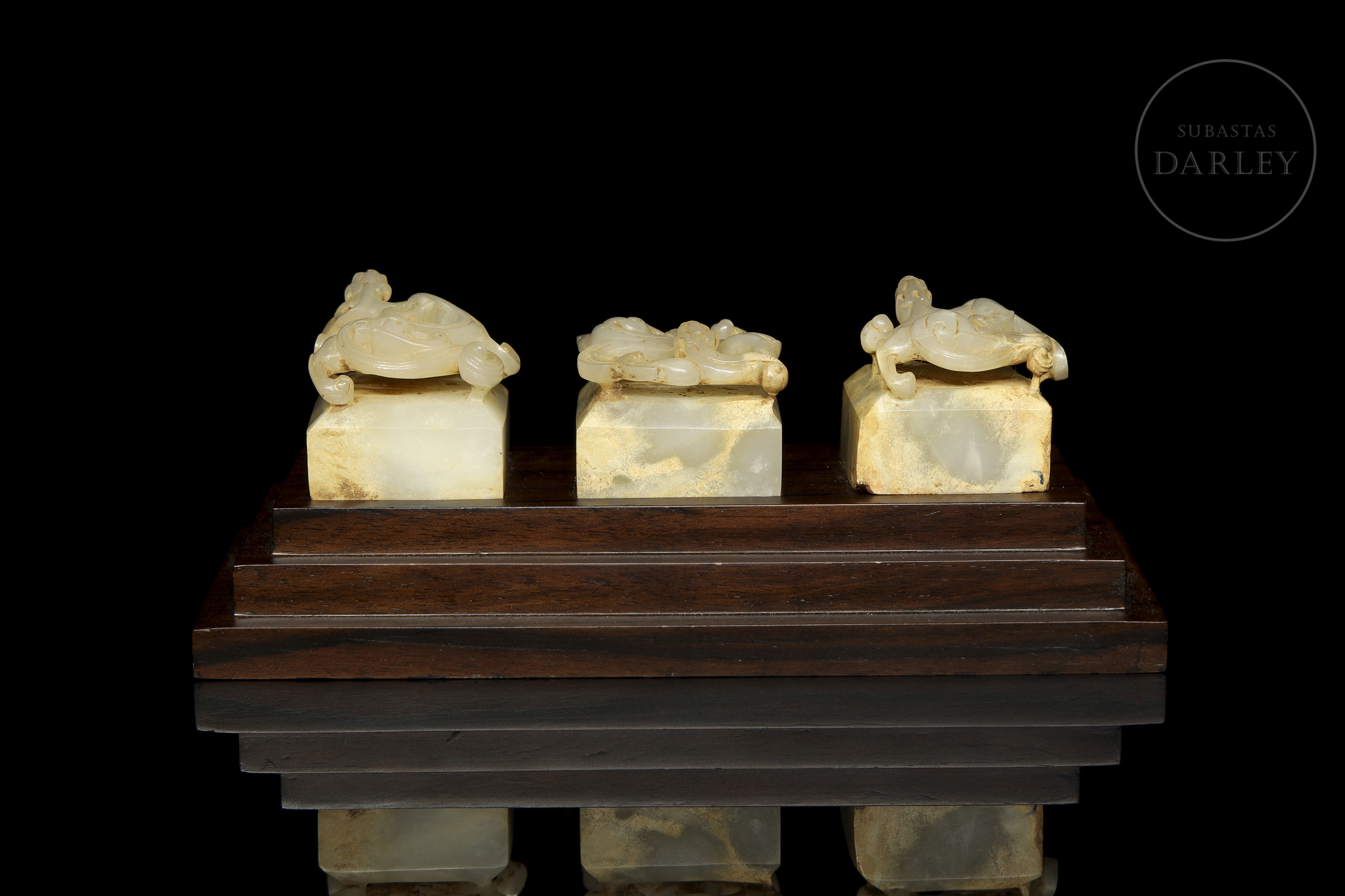 Tres sellos de jade nefrita de color blanco con áreas de pátina en tono crema y ocre. Cada pieza presenta una base cuadrangular coronada por un asa tallada en forma de dragón chilong de cuerpo sinuoso, con detalles de escamas, afiladas fauces y largas melenas. Las bases muestran incisos los sellos "天子之璽", "天子行璽" y "天子信璽" con restos de lacre rojo. El conjunto se presenta sobre una base de madera tallada a medida. Dinastía Han (206 a.C. – 220 d.C.) o posterior.