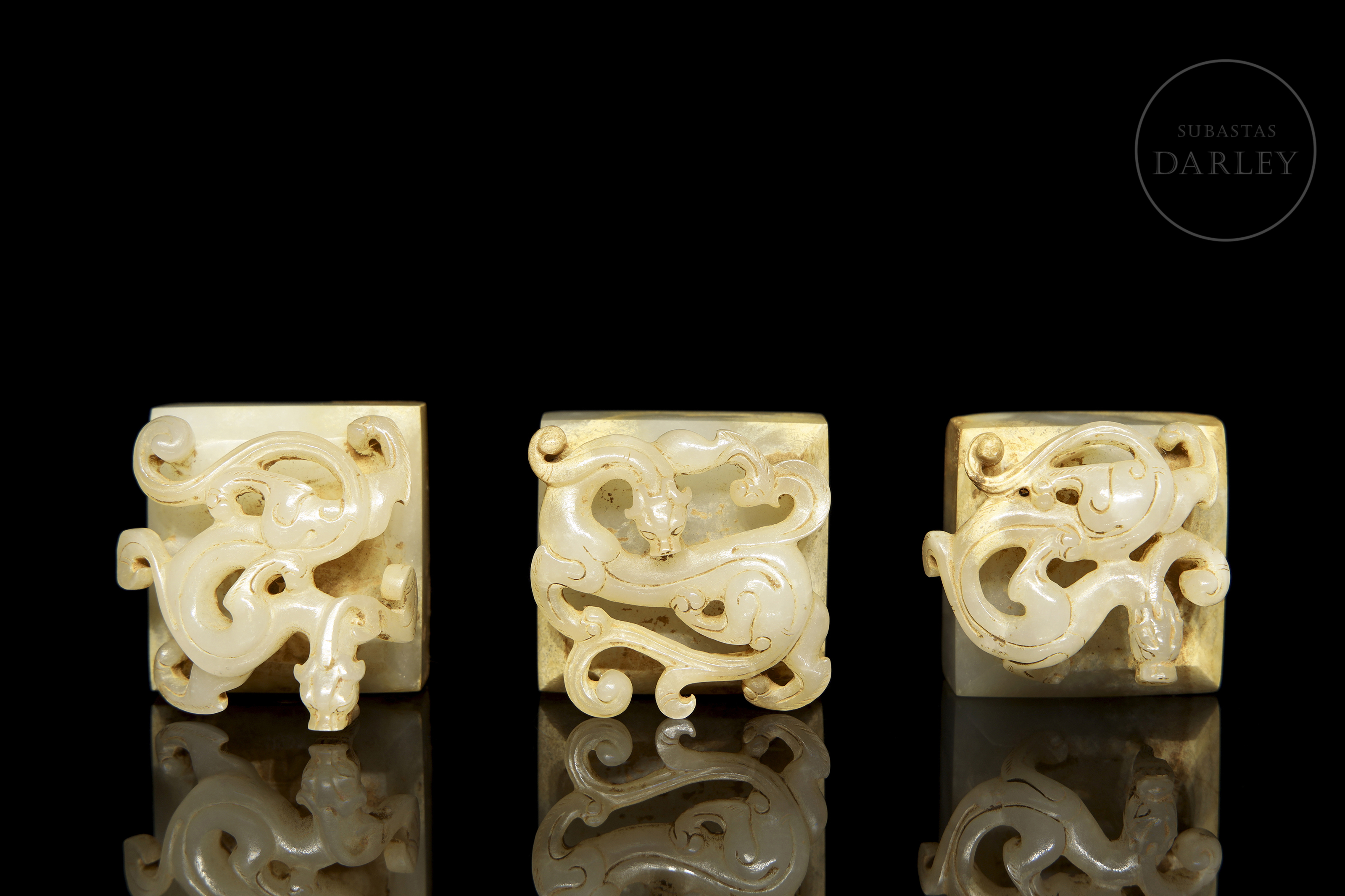 Conjunto de tres sellos de jade blanco "Dragones", dinastía Han