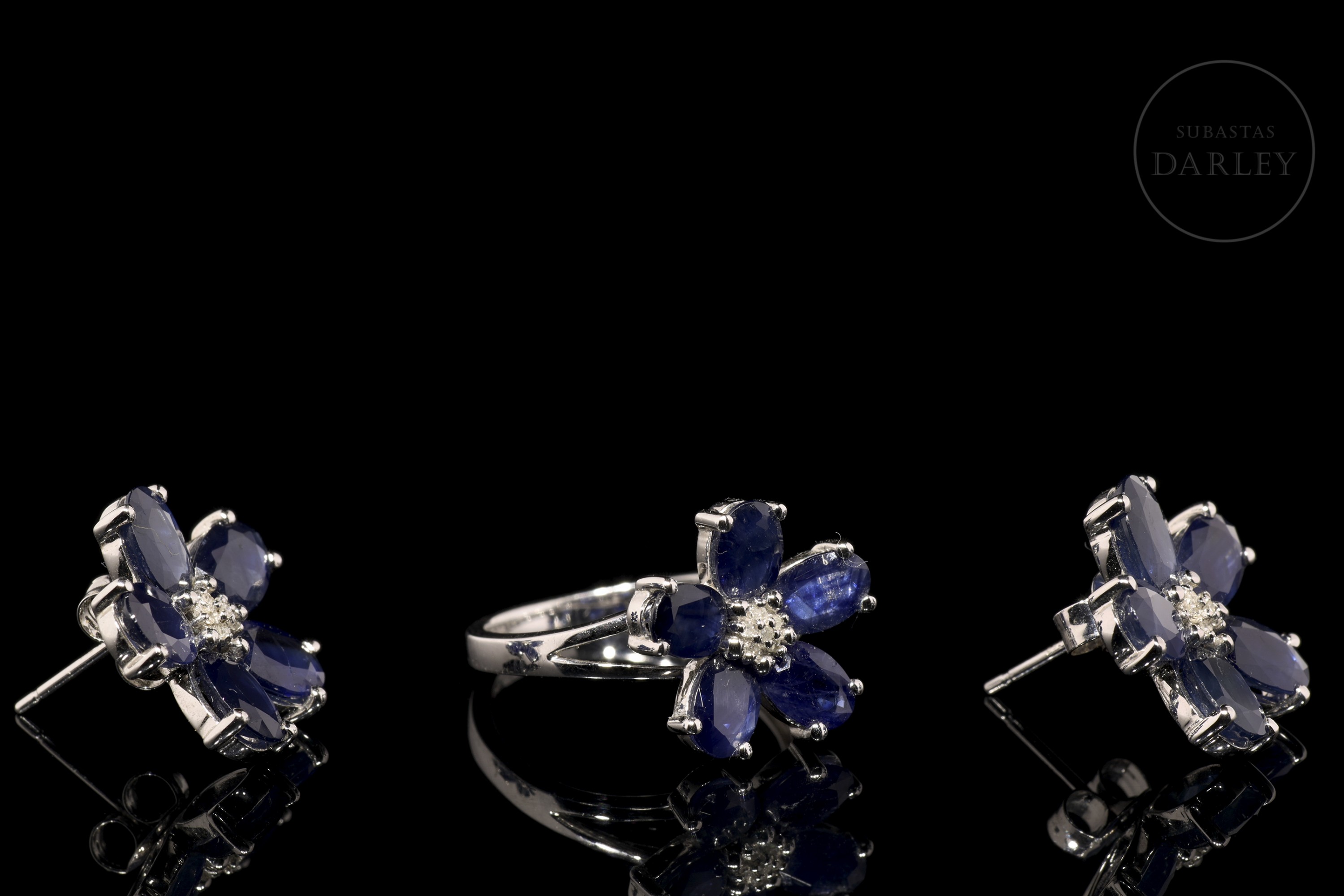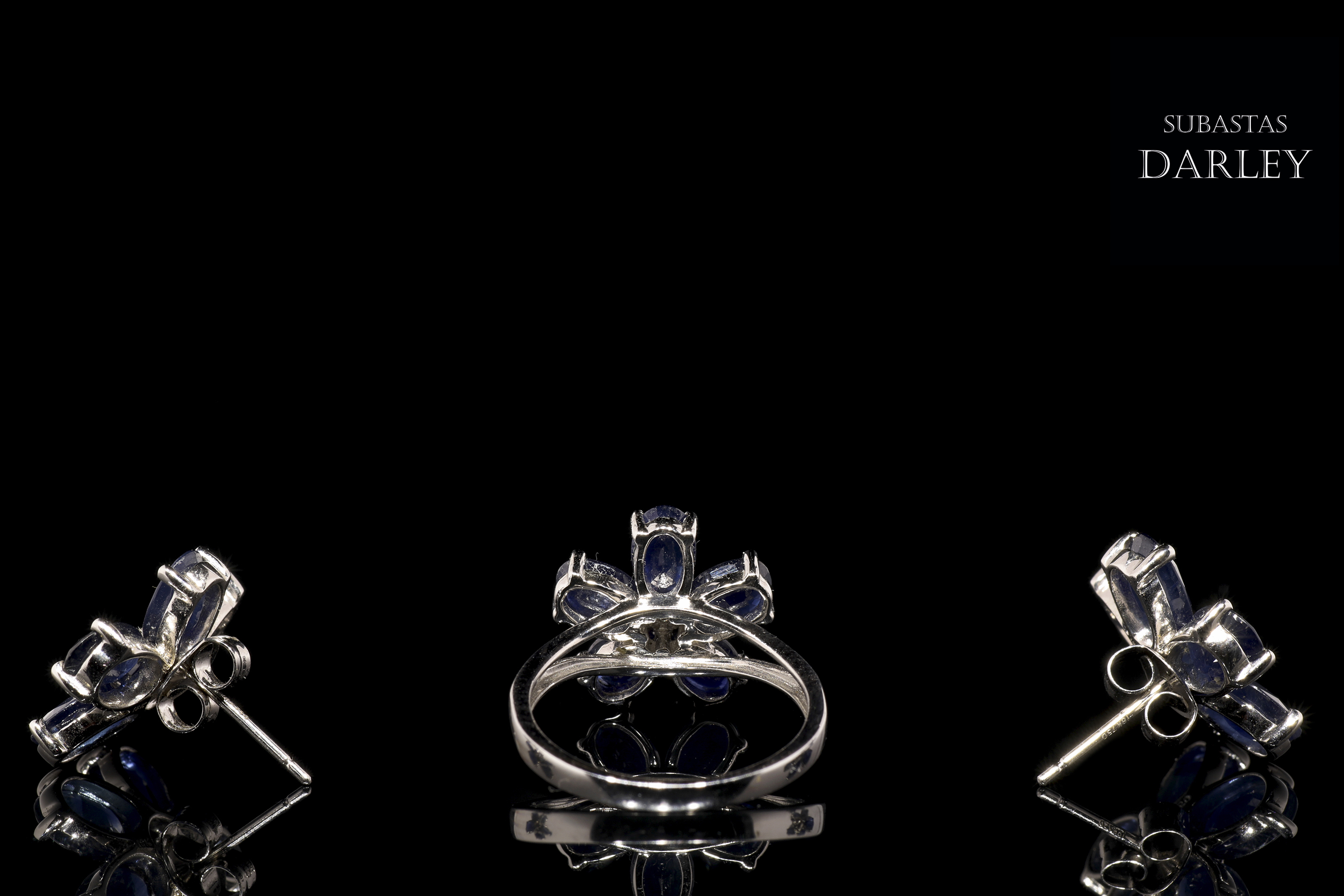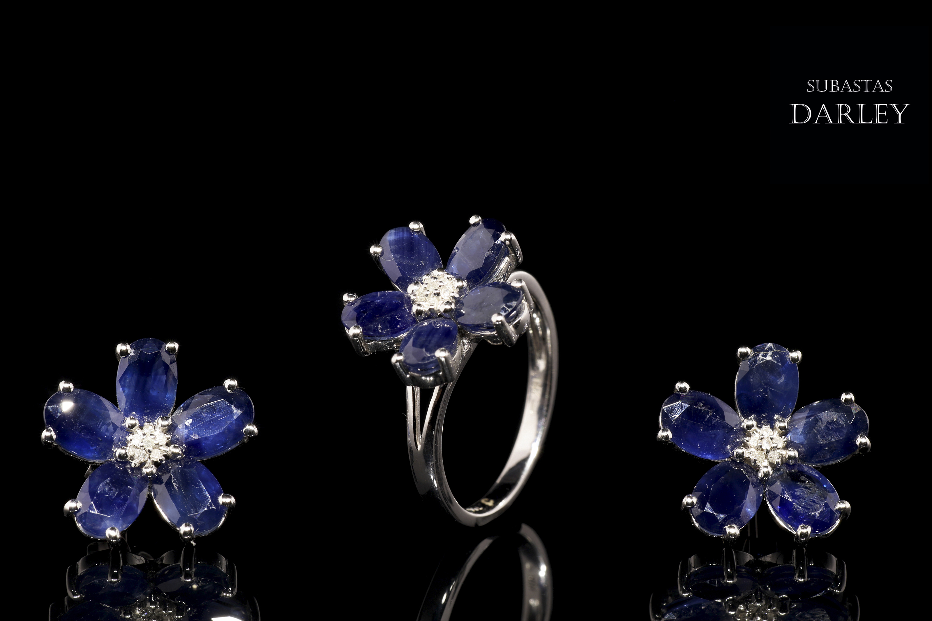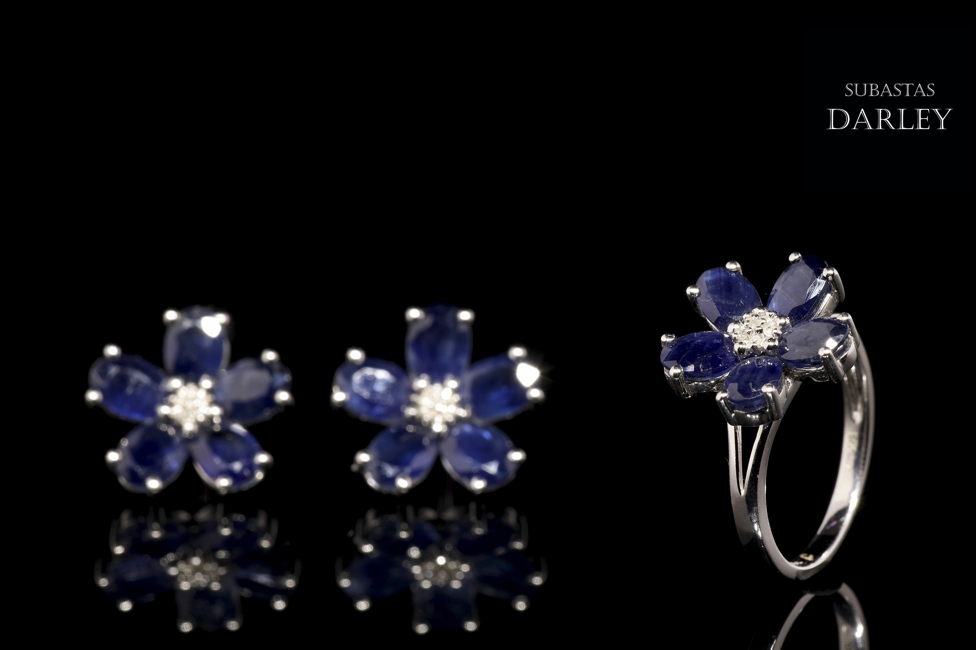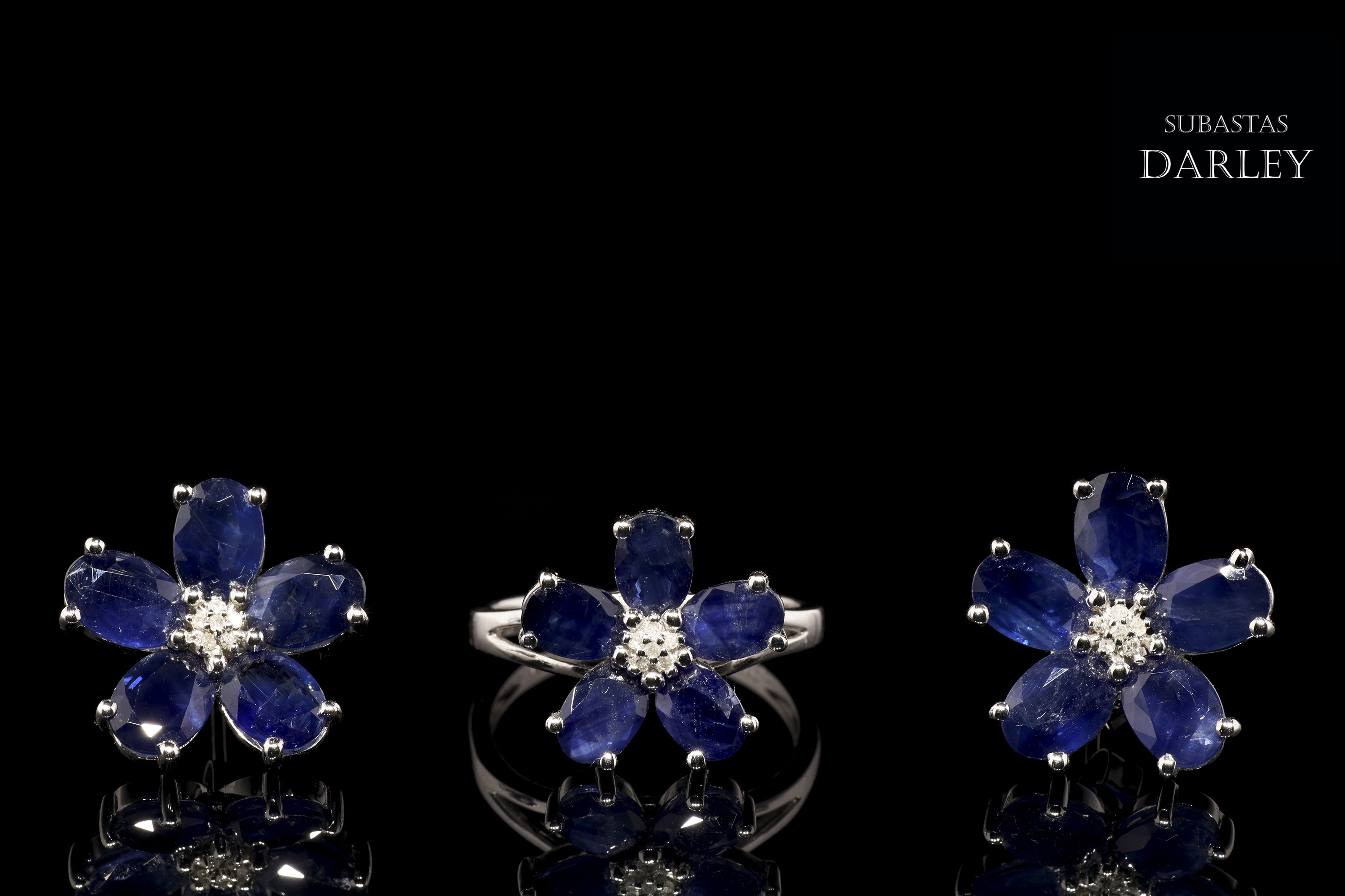 Conjunto en oro blanco de 18k "Flores" con zafiros y diamantes