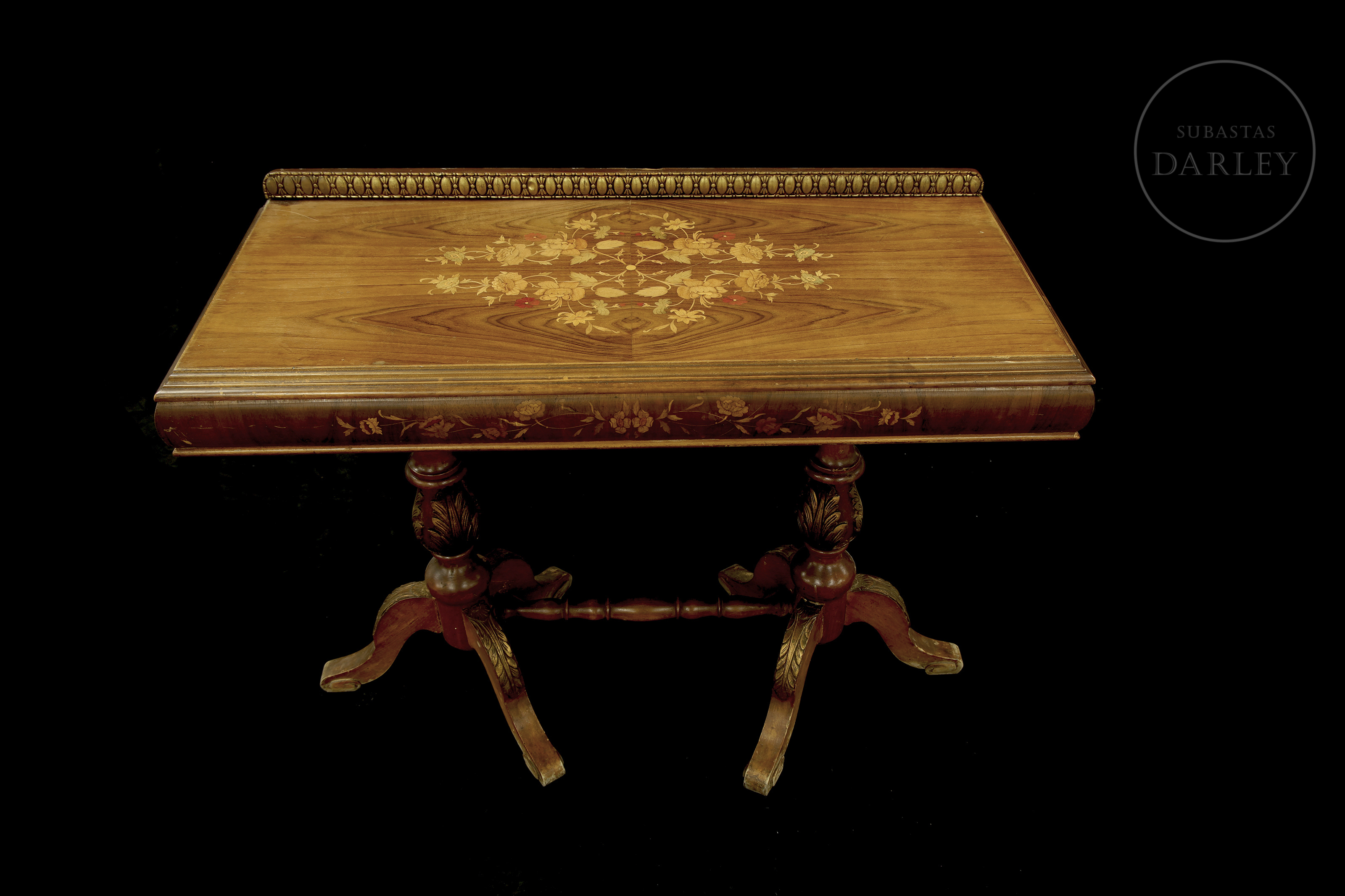 Mueble auxiliar de neorrenacentista, fabricada en Europa, que presenta un tablero rectangular con decoración de marquetería floral. El diseño destaca por sus soportes de columna torneada con tallas de hojas de acanto doradas y una estructura sólida unida por un chambrana central.