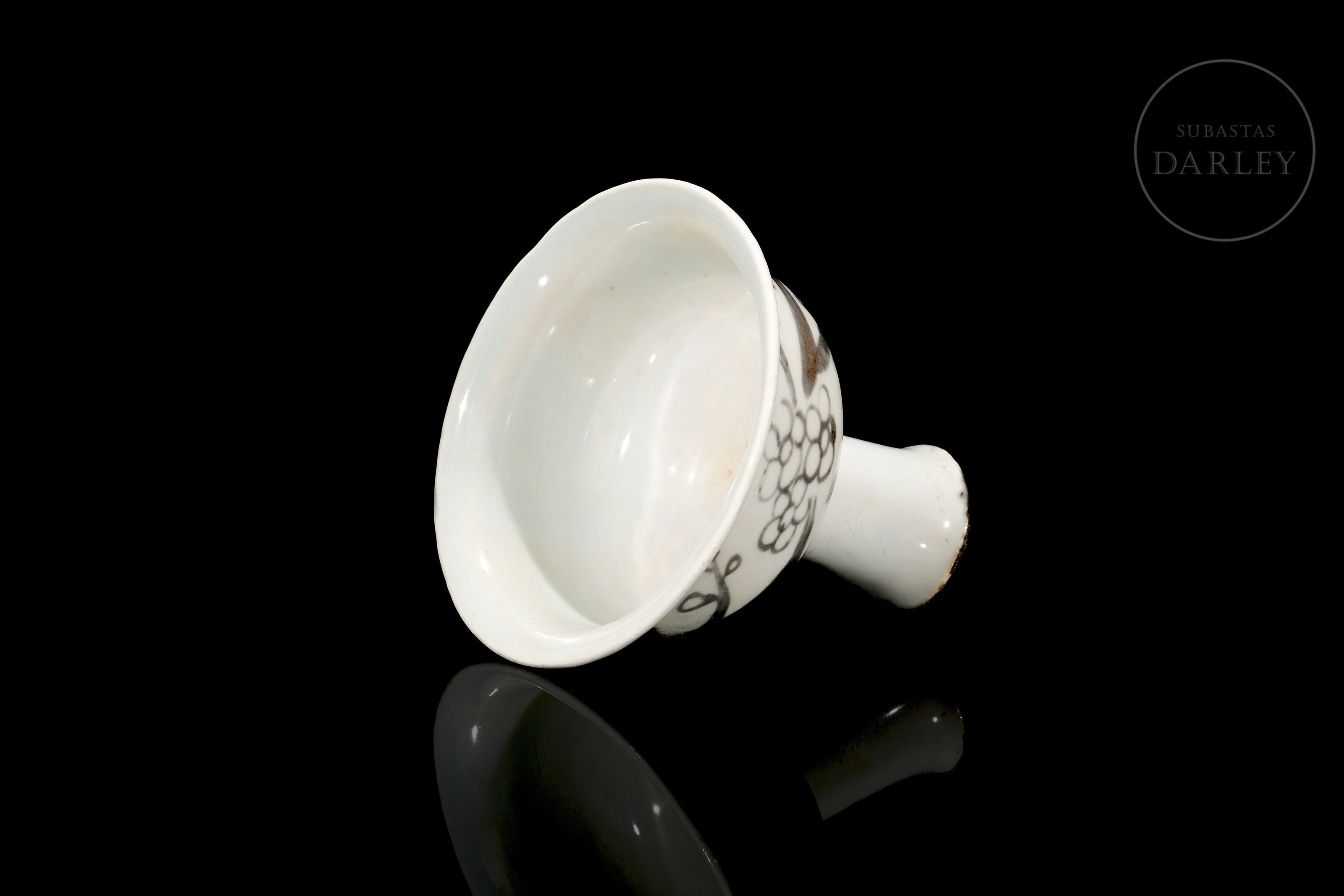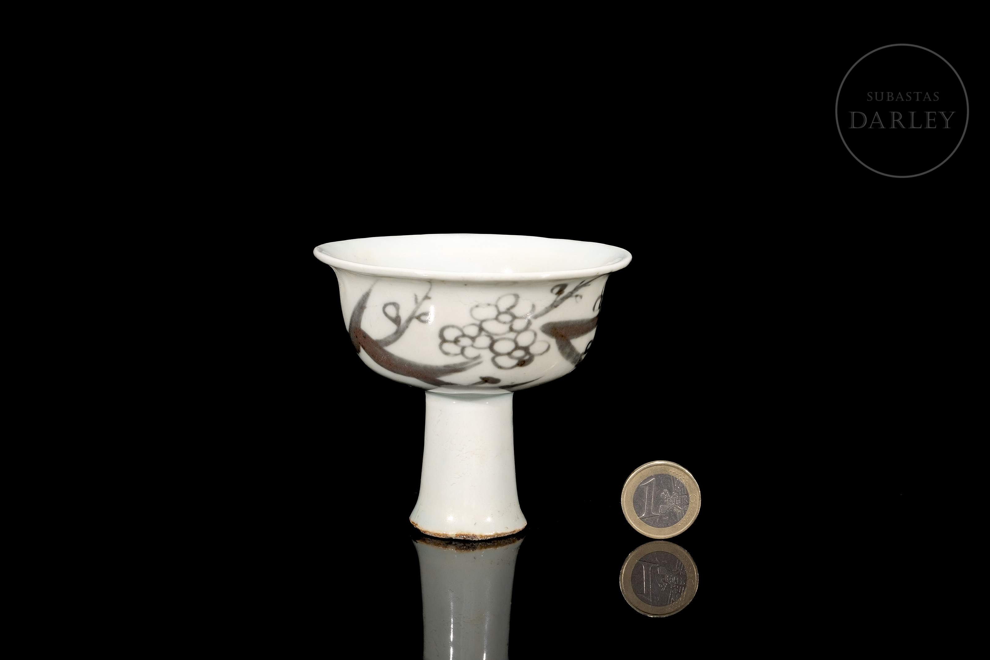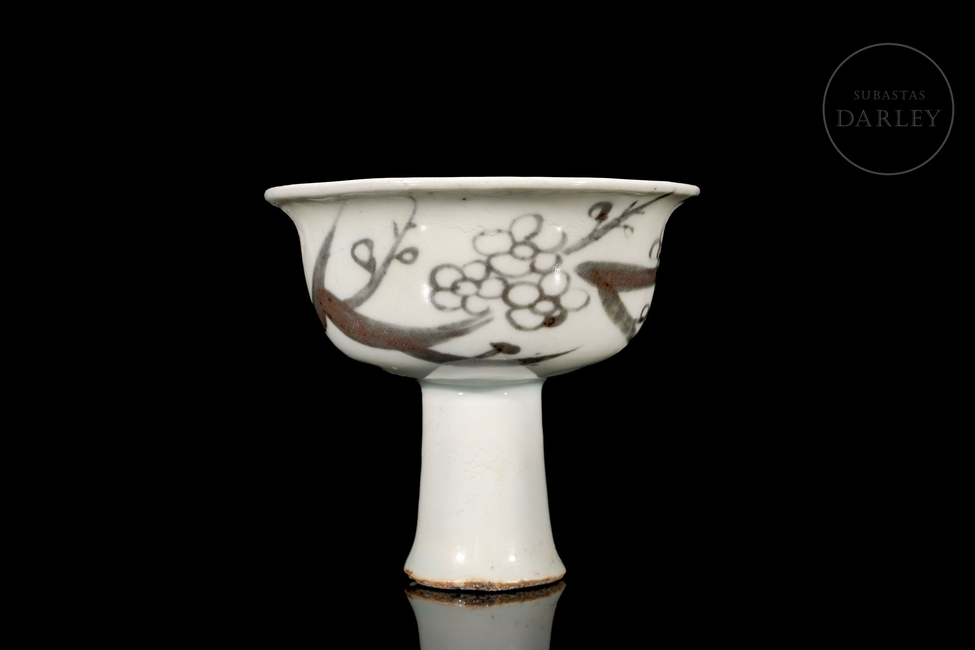 Copa de porcelana, compuesta por un cuenco de paredes abiertas y un pie alto y hueco. El exterior del cuenco está decorado con esmalte rojo bajo vidriado (youlihong), que forma una rama de vid. El pigmento presenta las variaciones de tono, de rojizo a grisáceo.