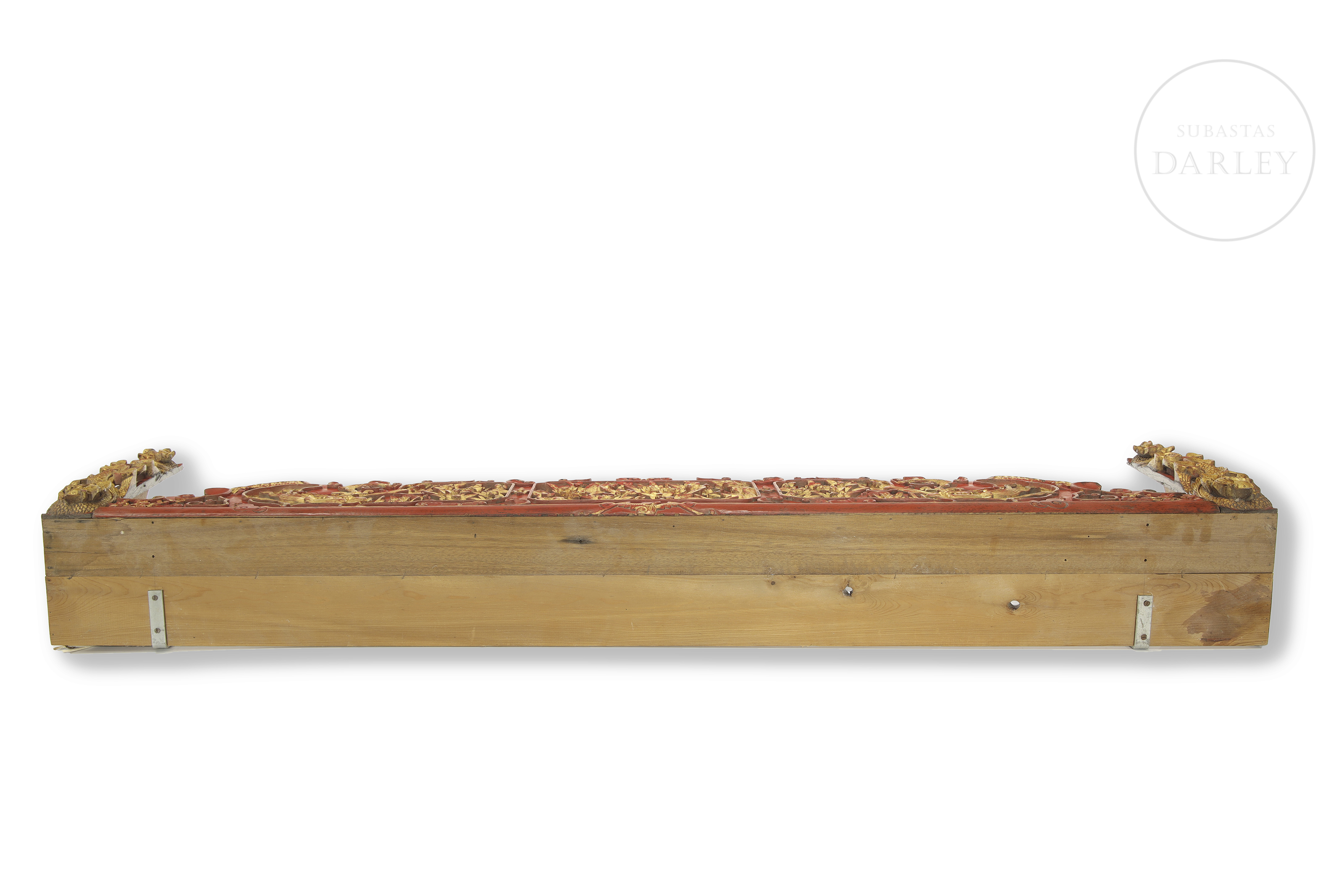 Madera tallada y lacada en rojo, con profusos detalles en dorado. Posee una morfología rectangular con extremos calados, dividida en tres paneles centrales. Decorado con una talla en relieve y calado que representan dragones estilizados entre flores de loto y peonías.