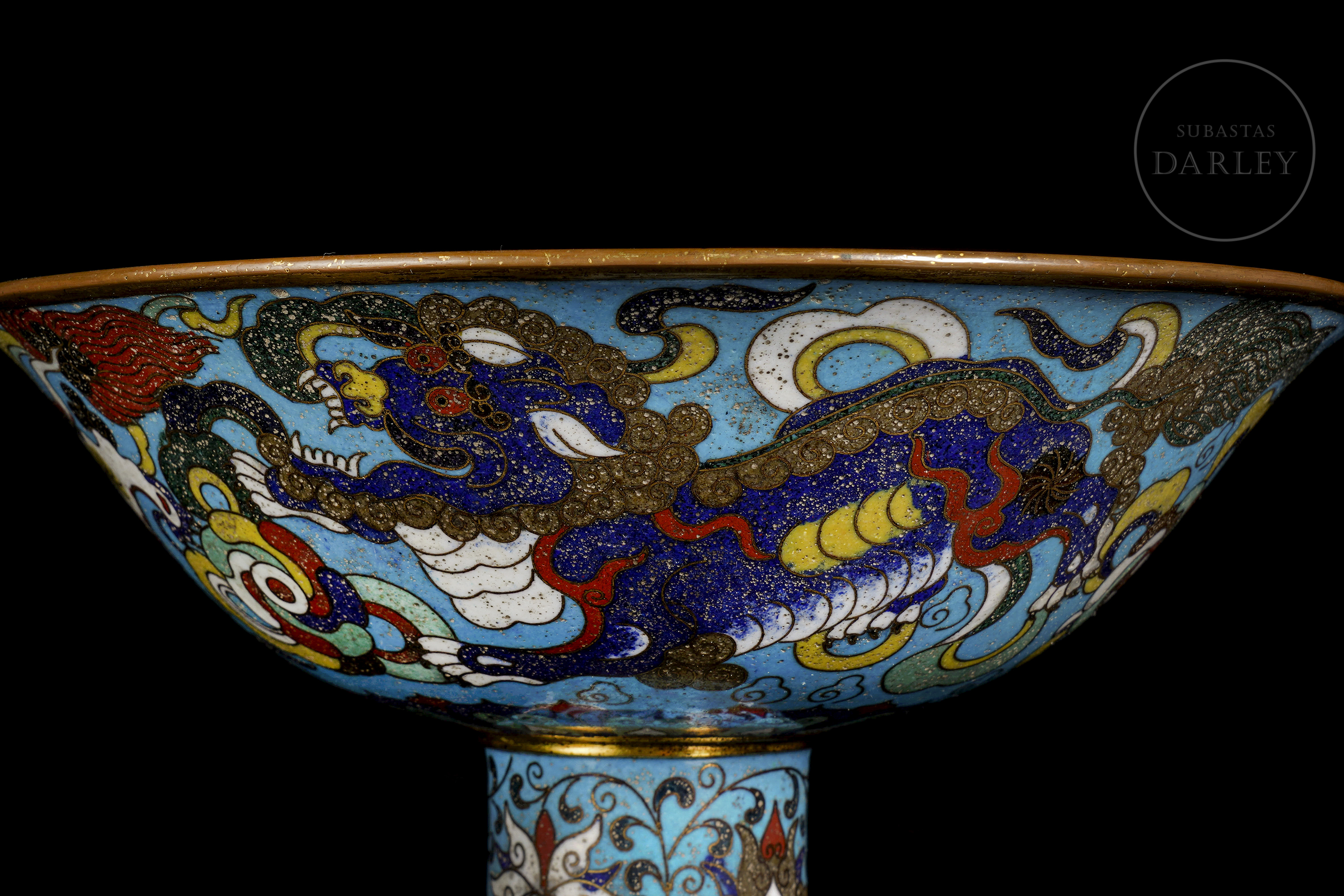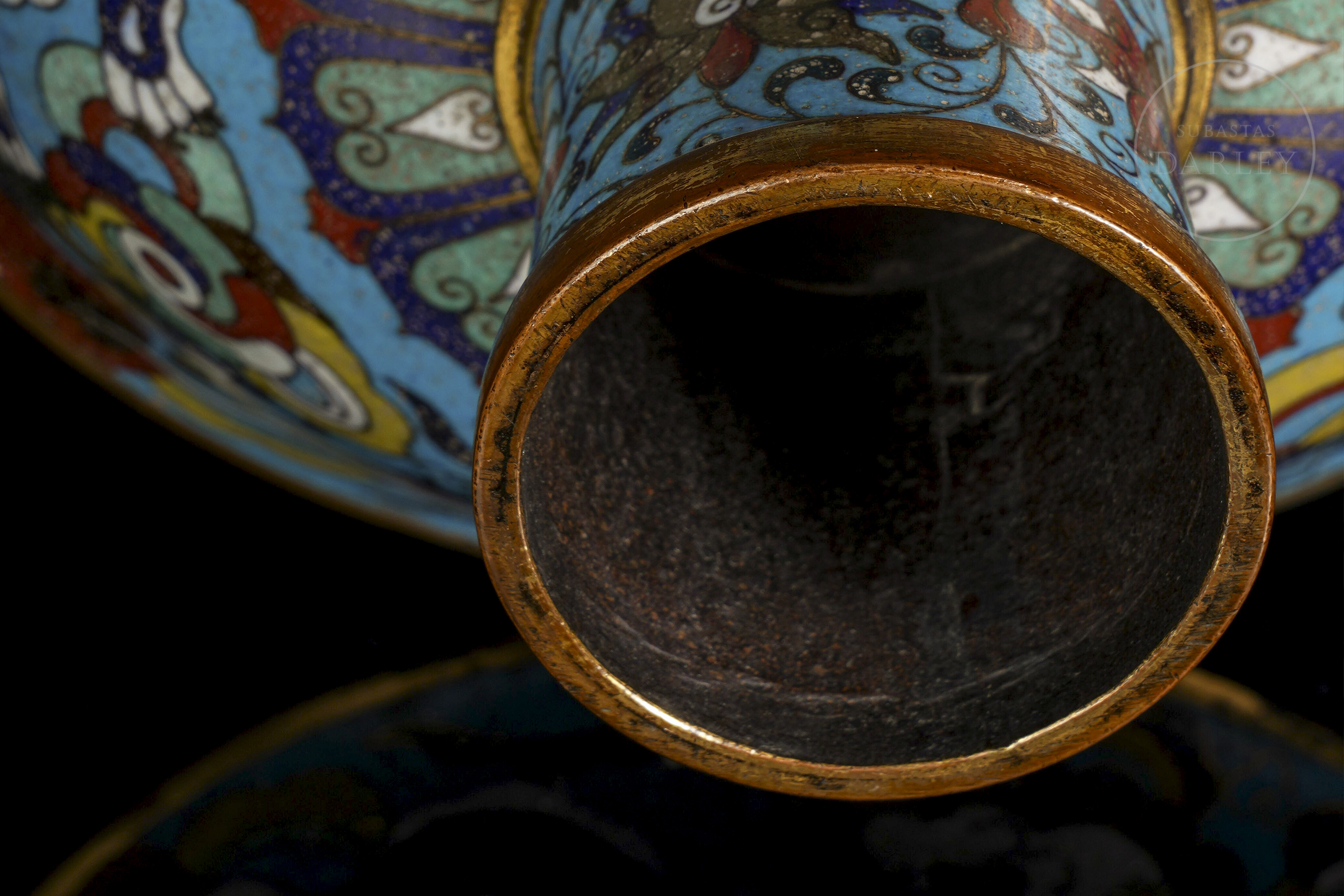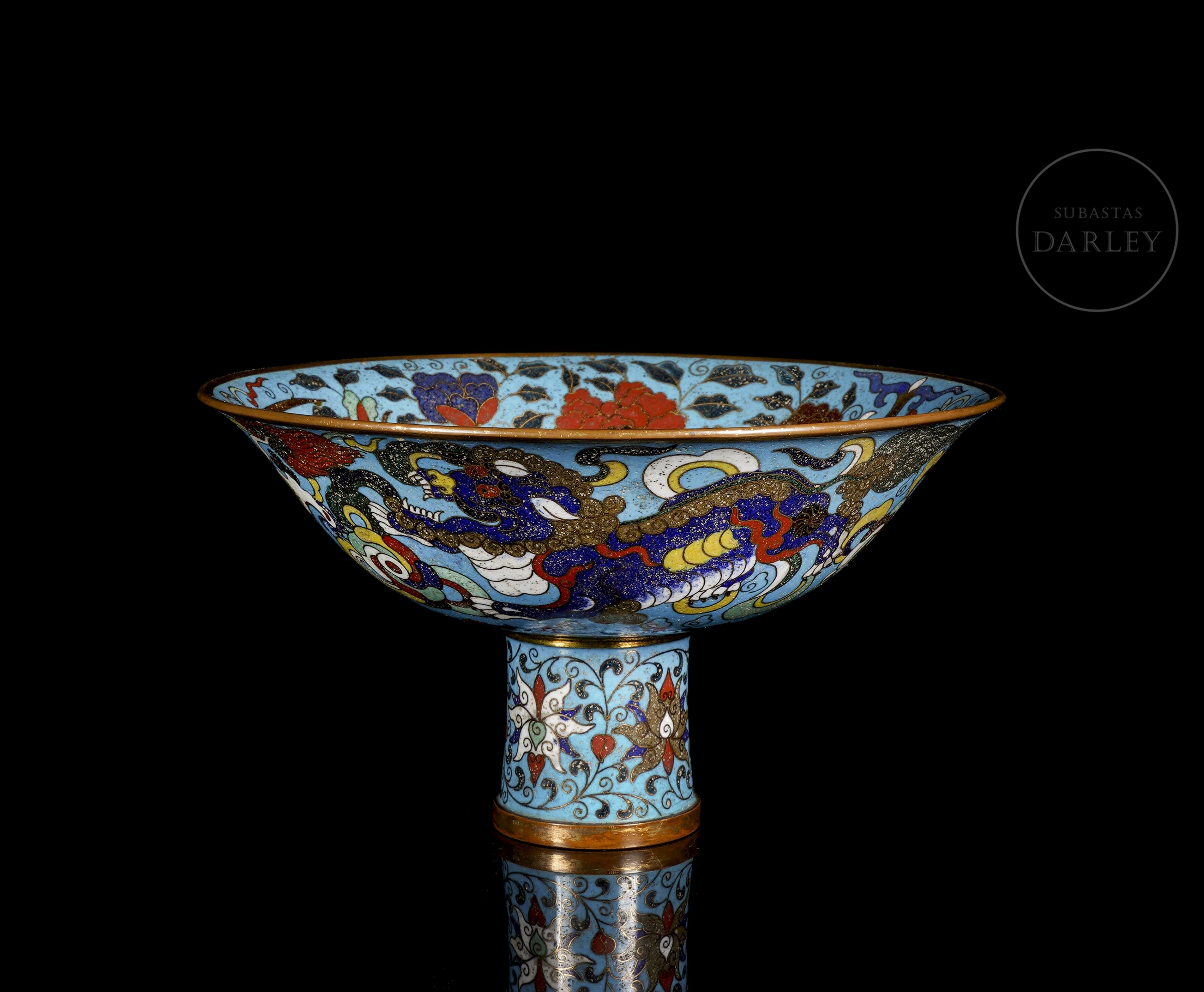 Cuenco de pie alto cónico de bronce dorado, adornado por esmaltes cloisonné. Sobre un fondo de color turquesa, se muestra una escena de bestias persiguiendo la perla llameante. El interior, de gran riqueza decorativa, muestra un medallón central con una bestia y una ancha cenefa con flores entre olas. El pie está ornamentado con motivos florales. La pieza está realizada siguiendo el apreciado estilo Xuande.