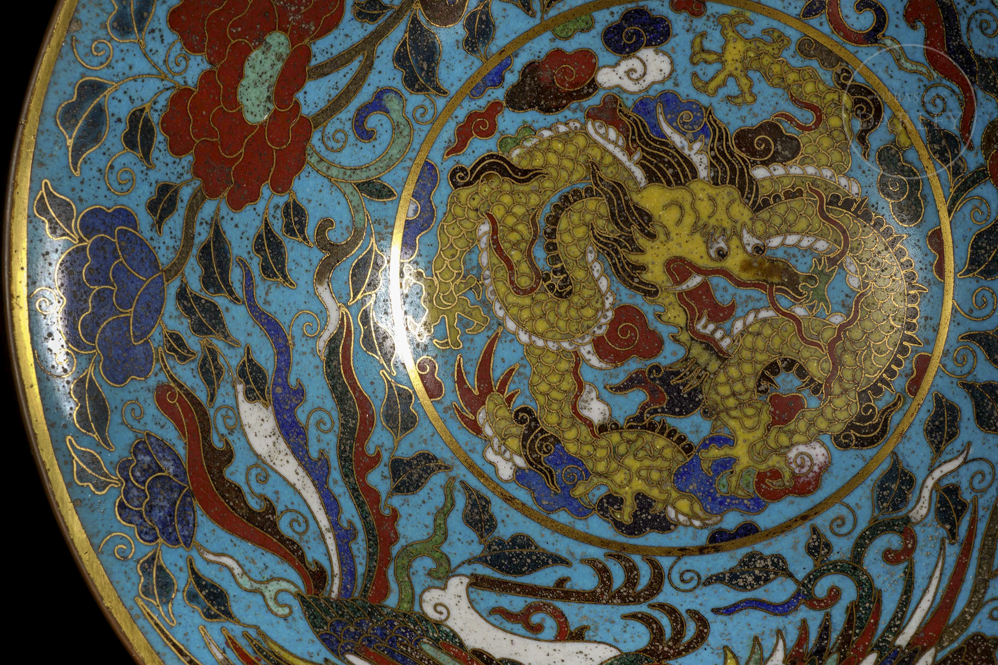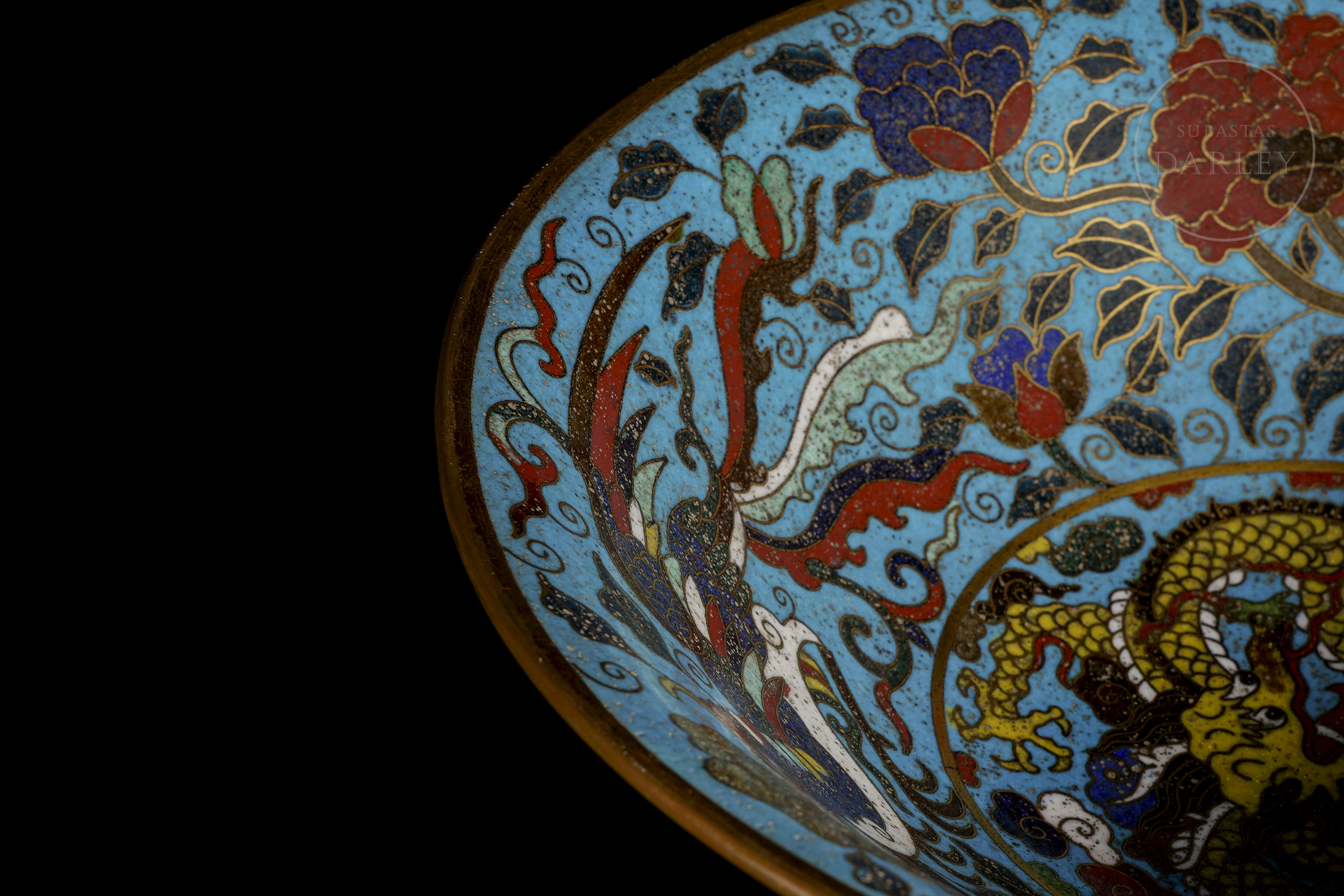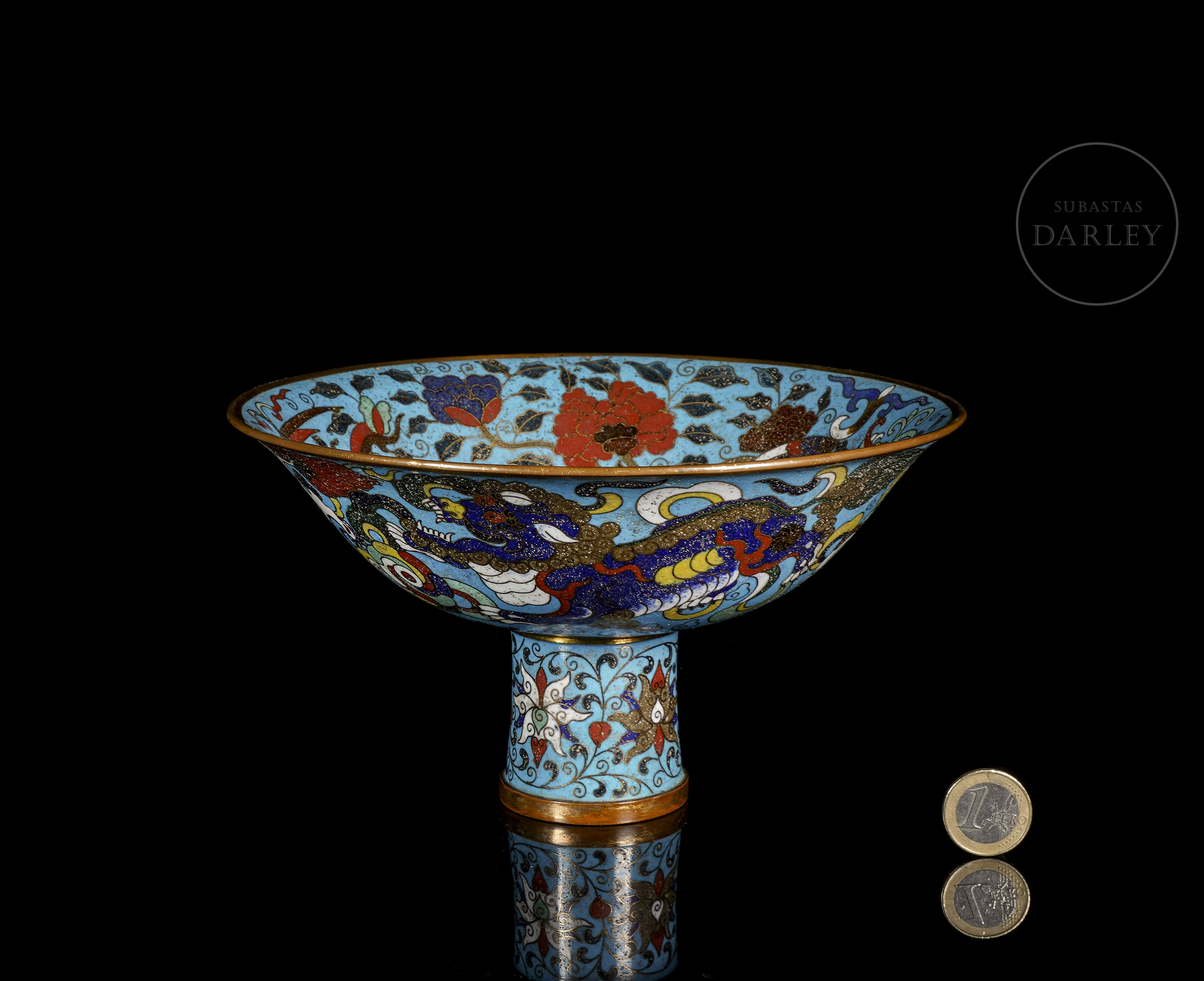 Cuenco de pie alto cónico de bronce dorado, adornado por esmaltes cloisonné. Sobre un fondo de color turquesa, se muestra una escena de bestias persiguiendo la perla llameante. El interior, de gran riqueza decorativa, muestra un medallón central con una bestia y una ancha cenefa con flores entre olas. El pie está ornamentado con motivos florales. La pieza está realizada siguiendo el apreciado estilo Xuande.