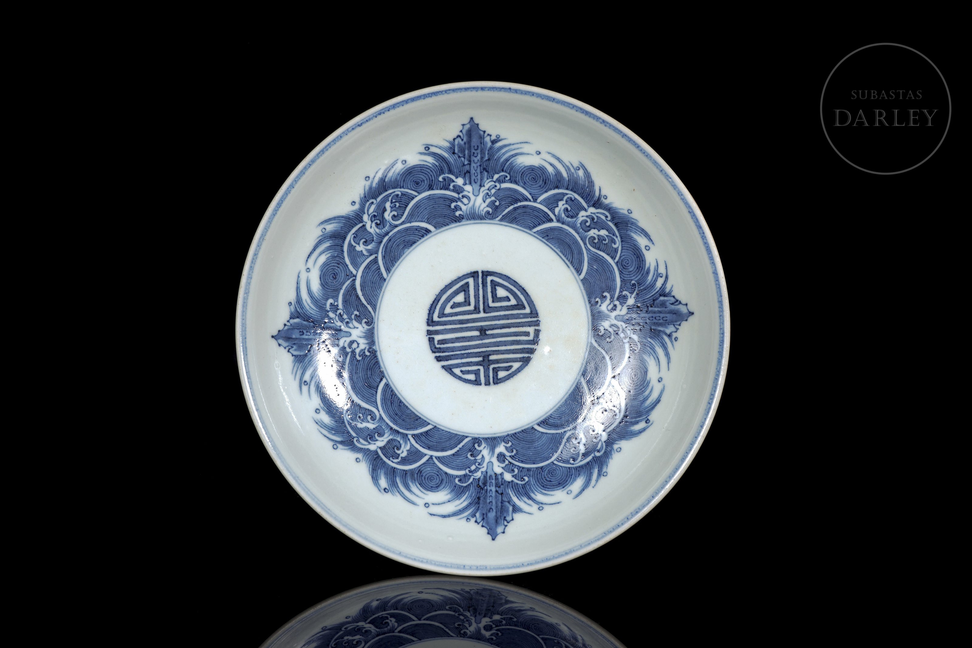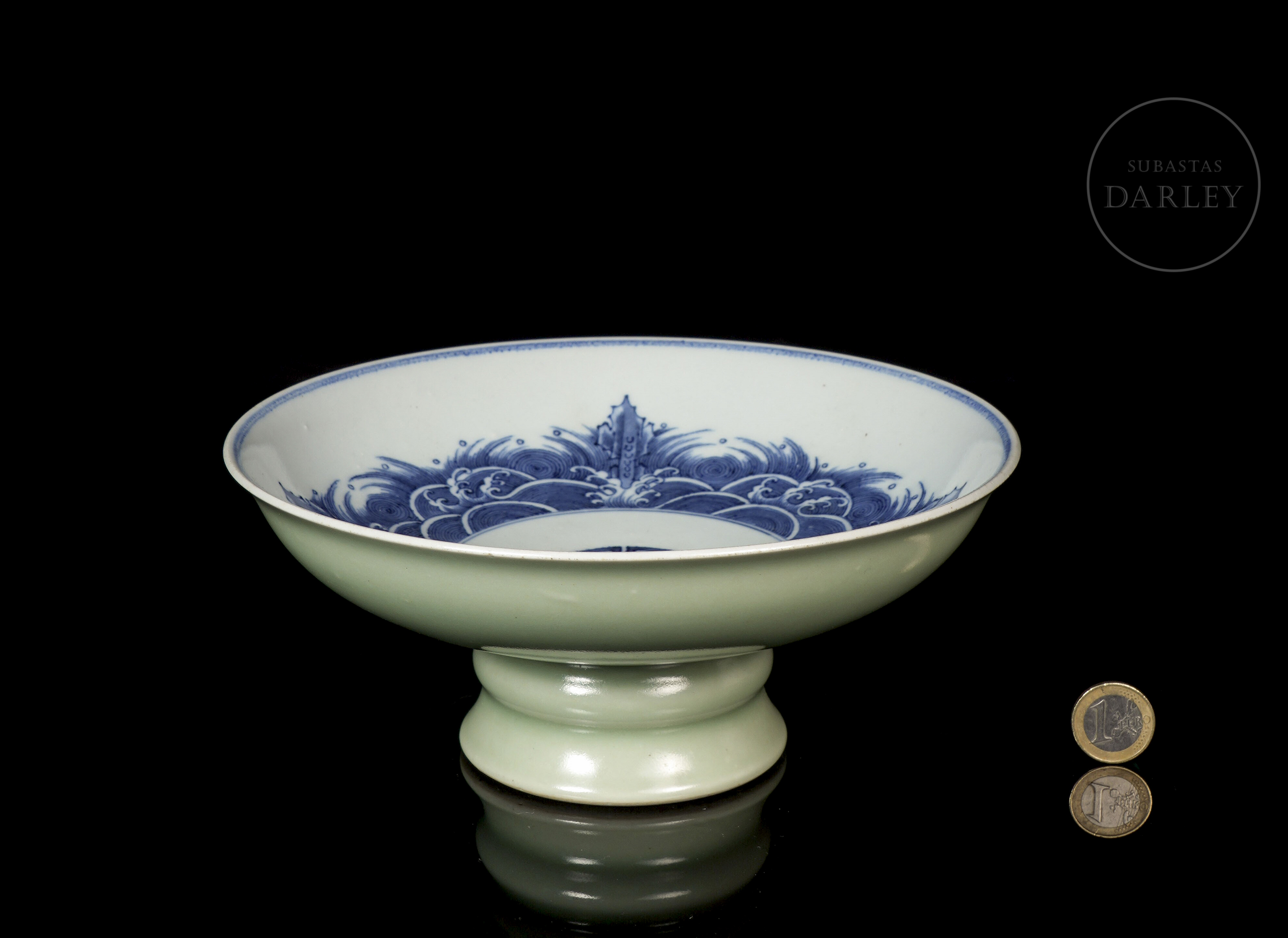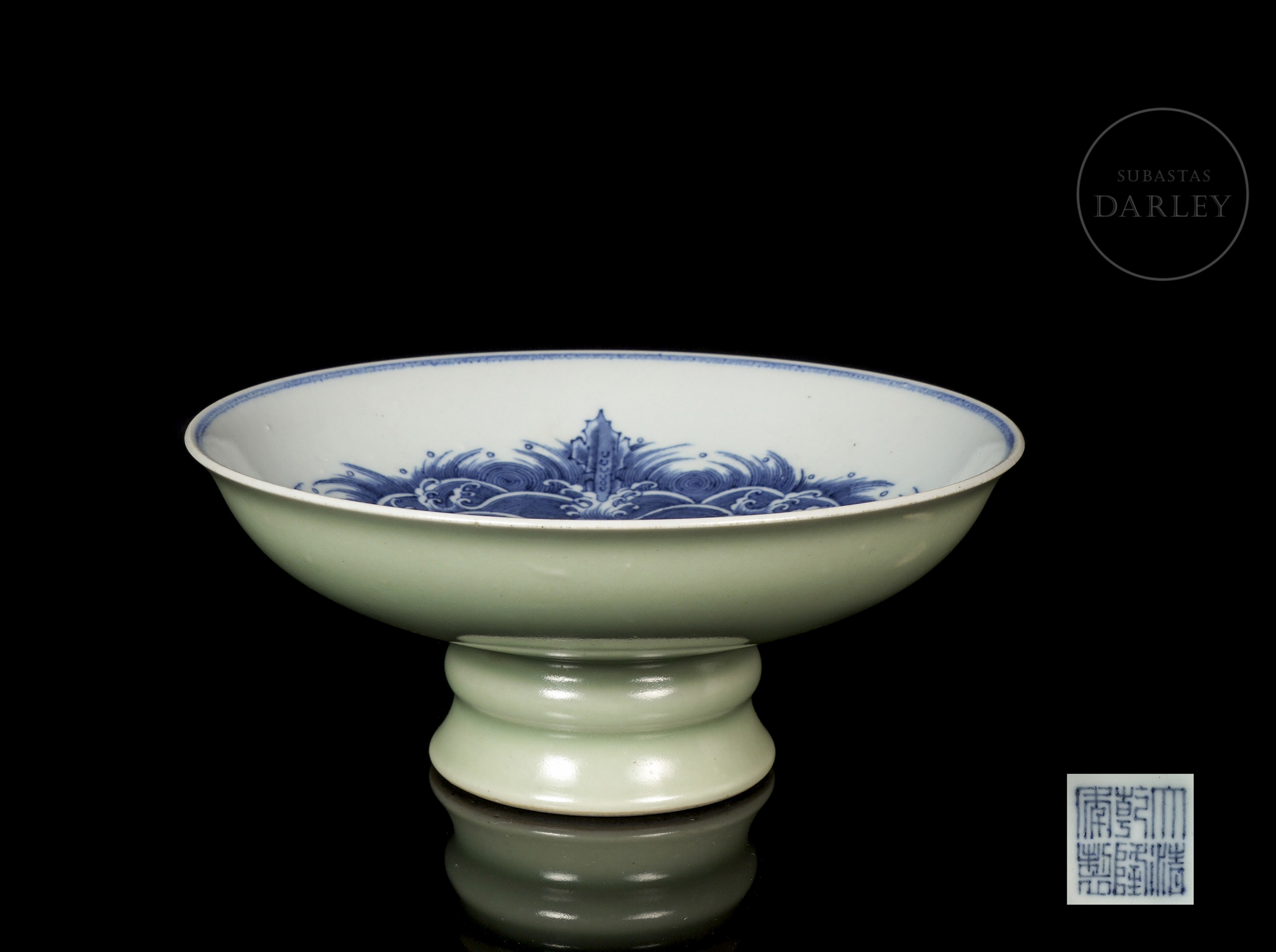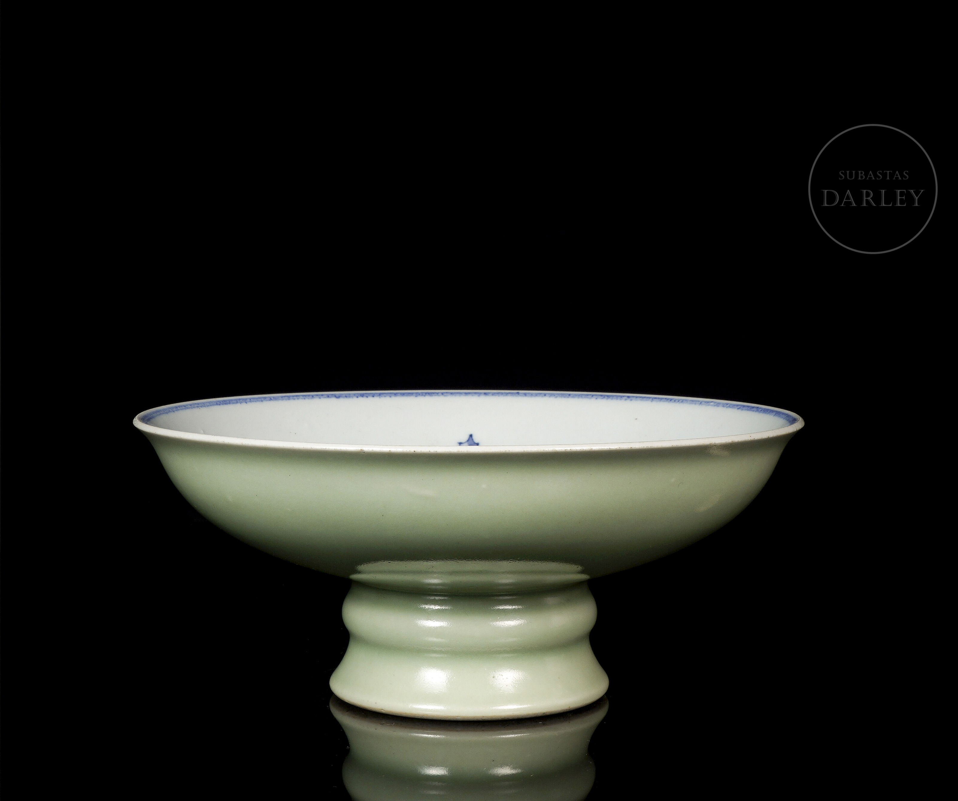 Frutero o plato de pie alto en porcelana. El exterior está cubierto por un esmalte verde celadón, mientras que el interior, en blanco y azul, está decorado con el carácter "shou" rodeado de olas. La base contiene el sello de seis caracteres “大清乾隆年制”.