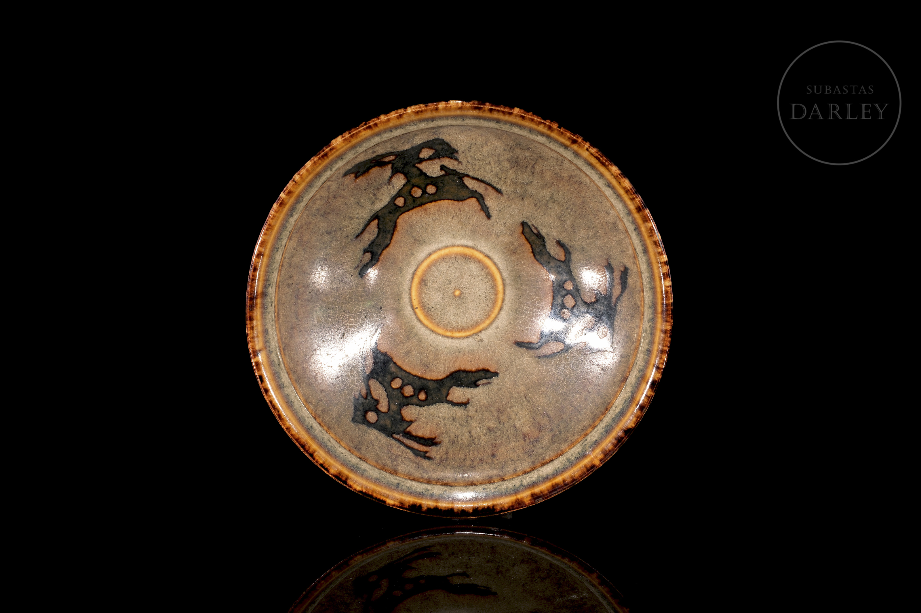 Cuenco para té de gres, de forma cónica, característico de los hornos de Jizhou. El interior está decorado con tres figuras de animales estilizados sobre un fondo ocre moteado. El exterior, exhibe un esmalte oscuro con un efecto de salpicaduras amarillentas conocido como "caparazón de tortuga" (daimao).
