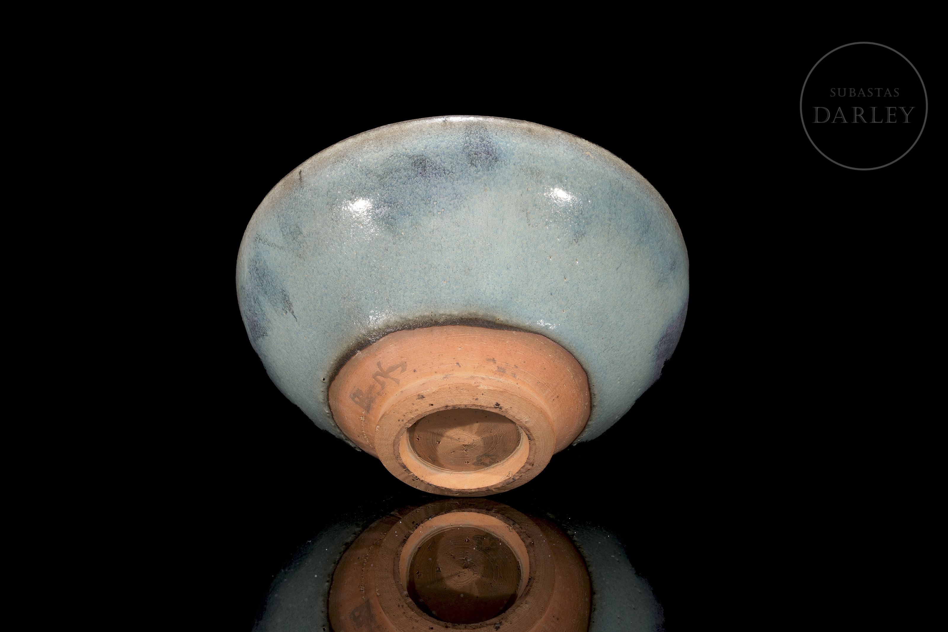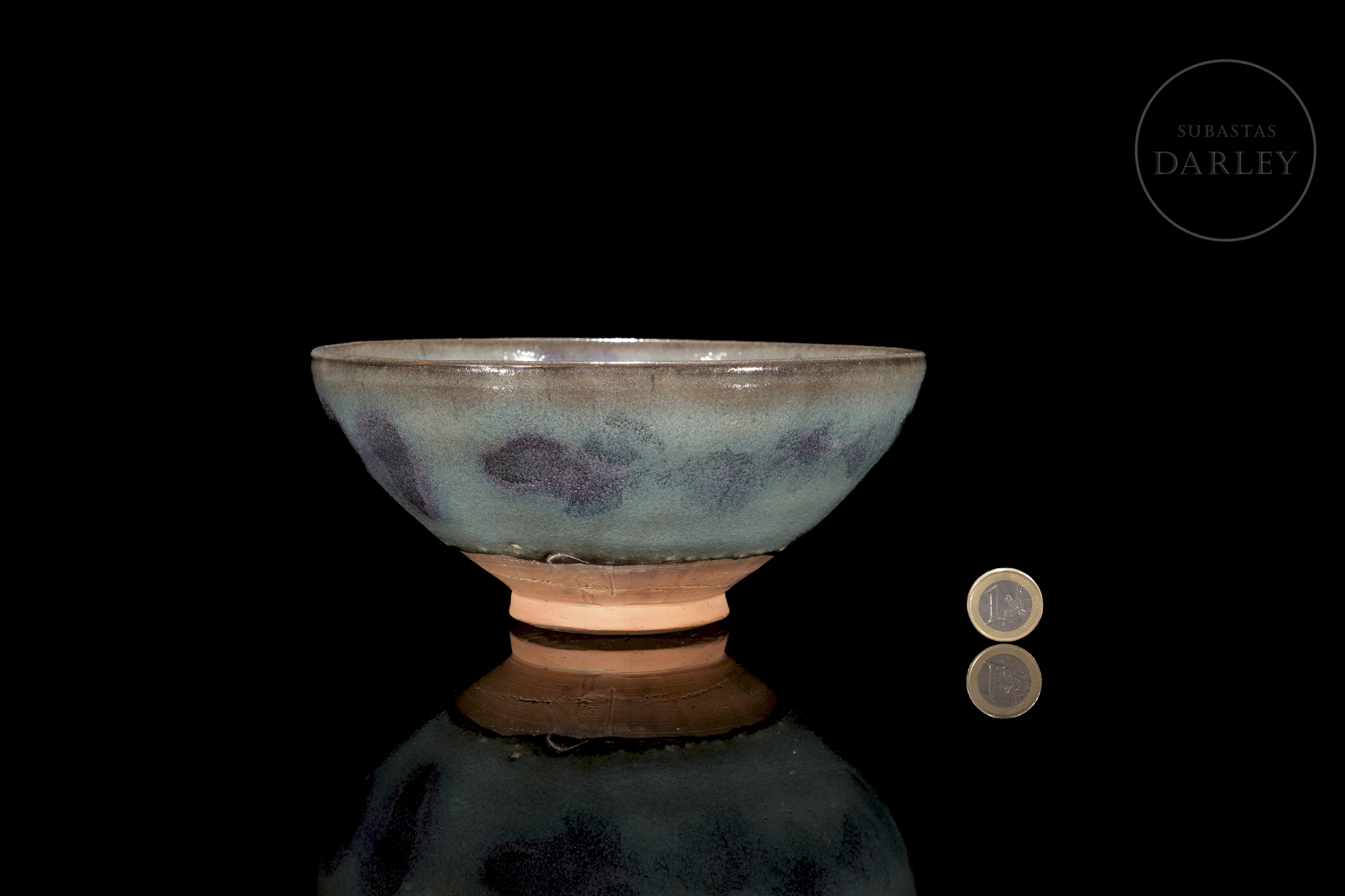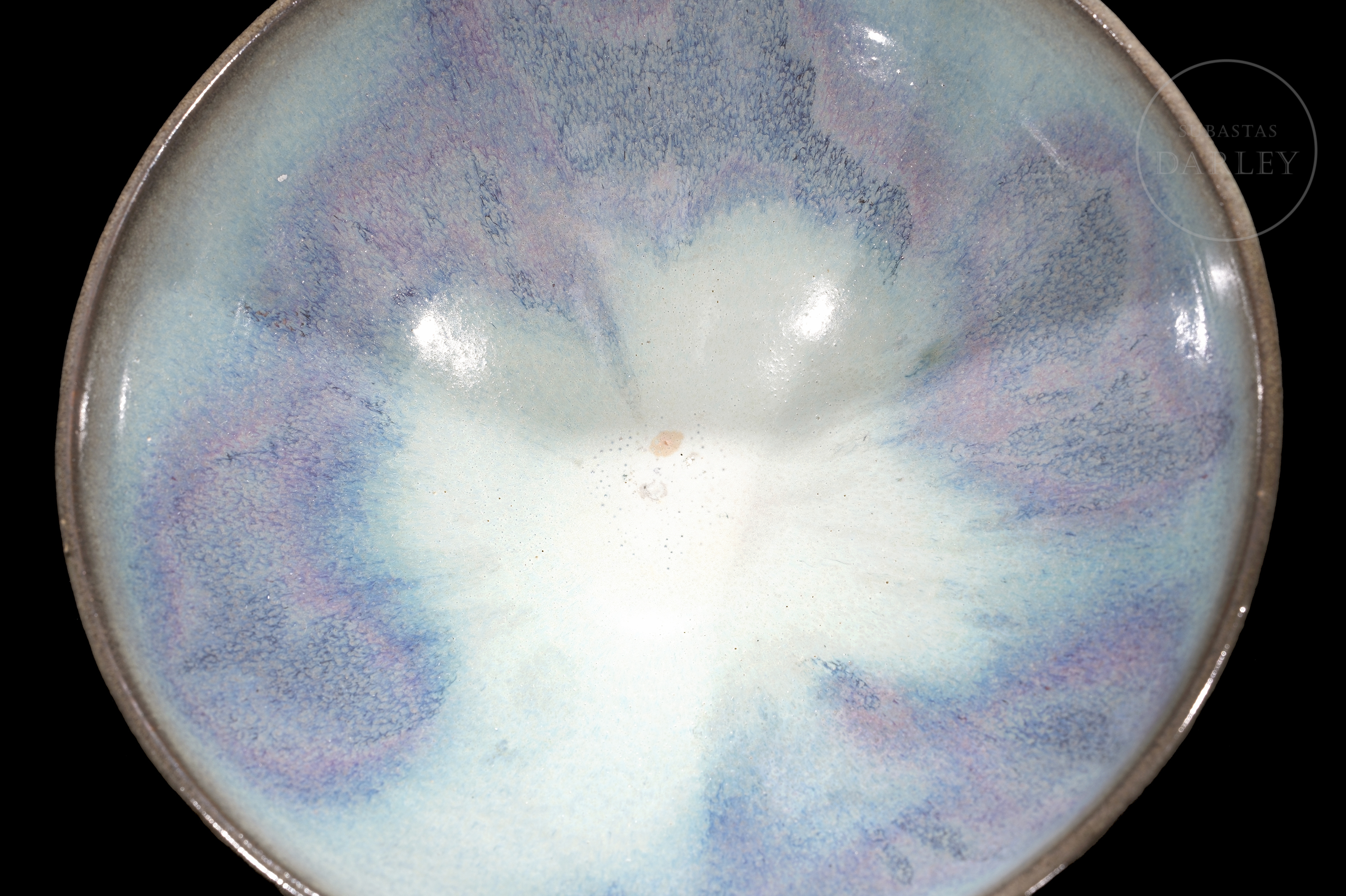Cuenco de cerámica de gres de forma cónica y paredes gruesas. Cubierto por un esmalte de tipo Jun,en cuyo interior muestra un vidriado opalescente de color azul celeste con manchas y veteados en tonos púrpuras y rojizos. El exterior es de un tono azul-verdoso más sobrio. El pie, corto y robusto, se ha dejado sin esmaltar.