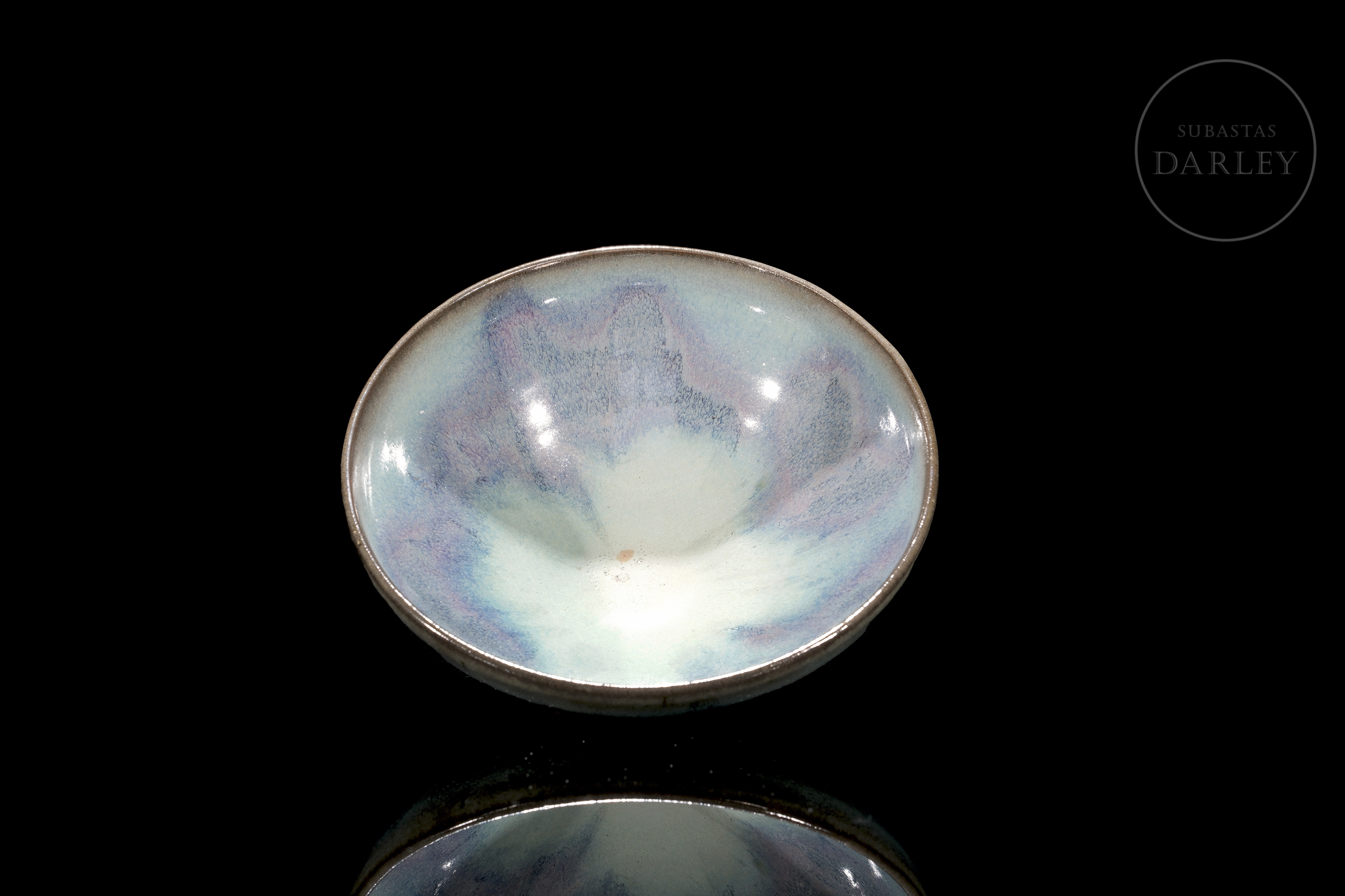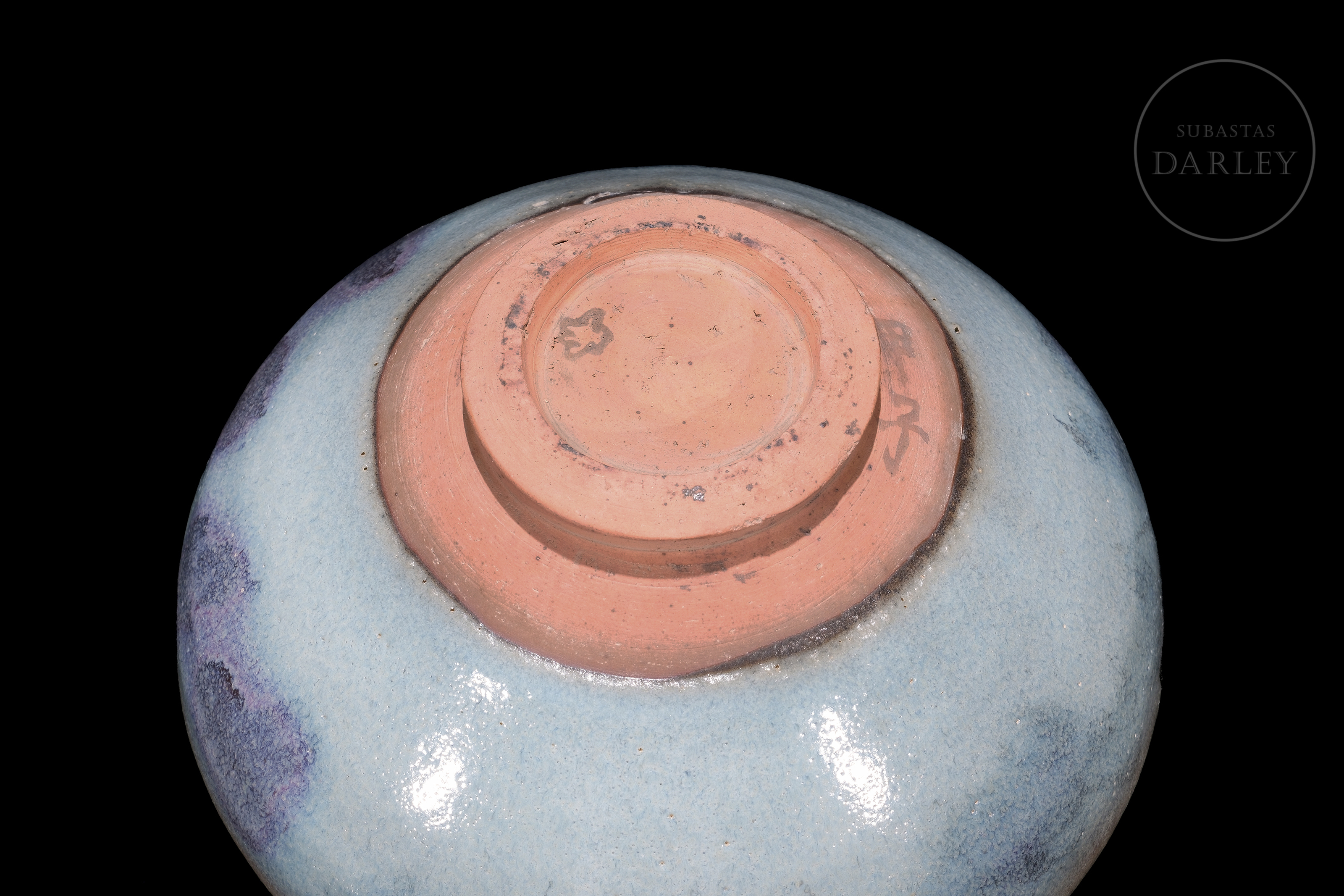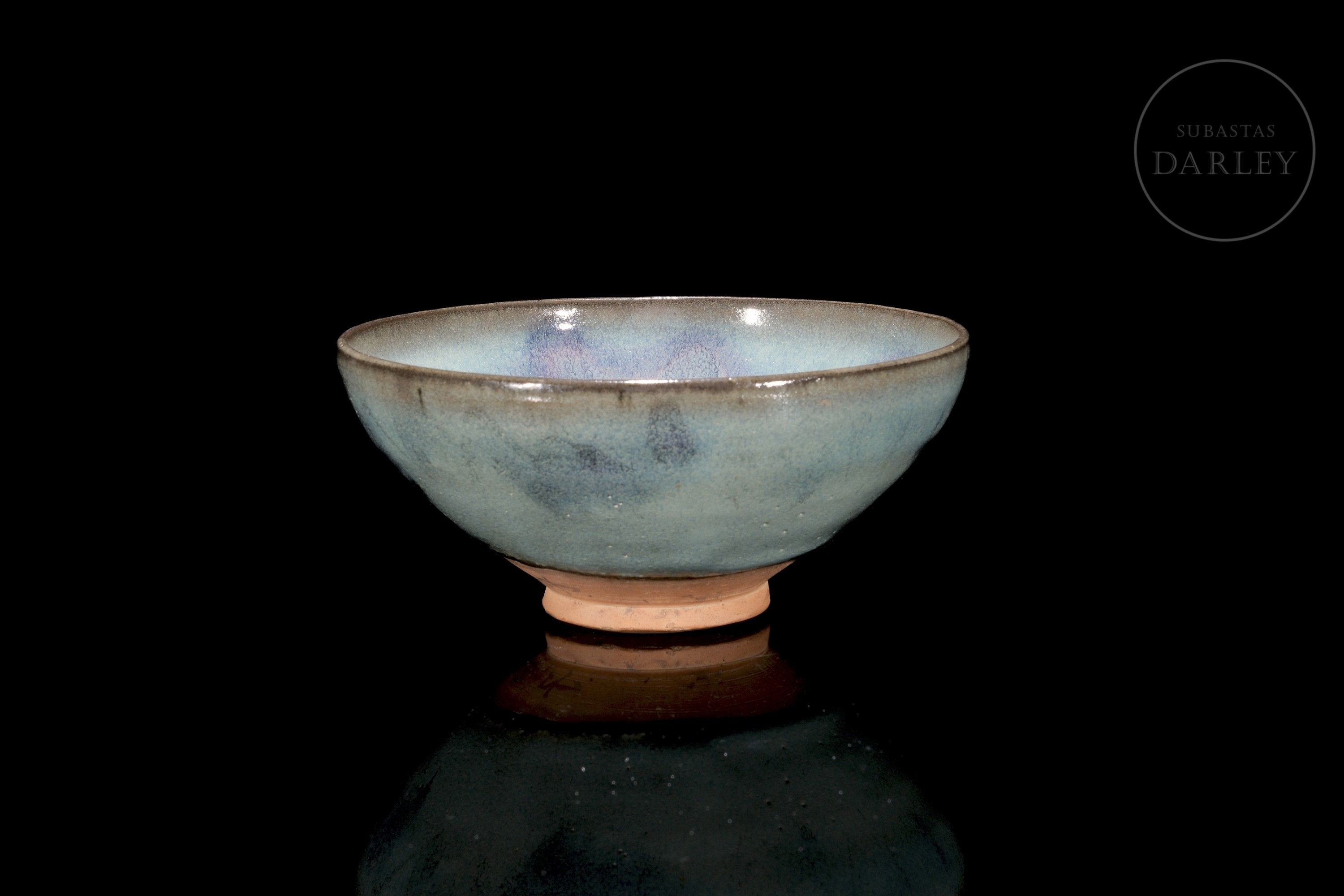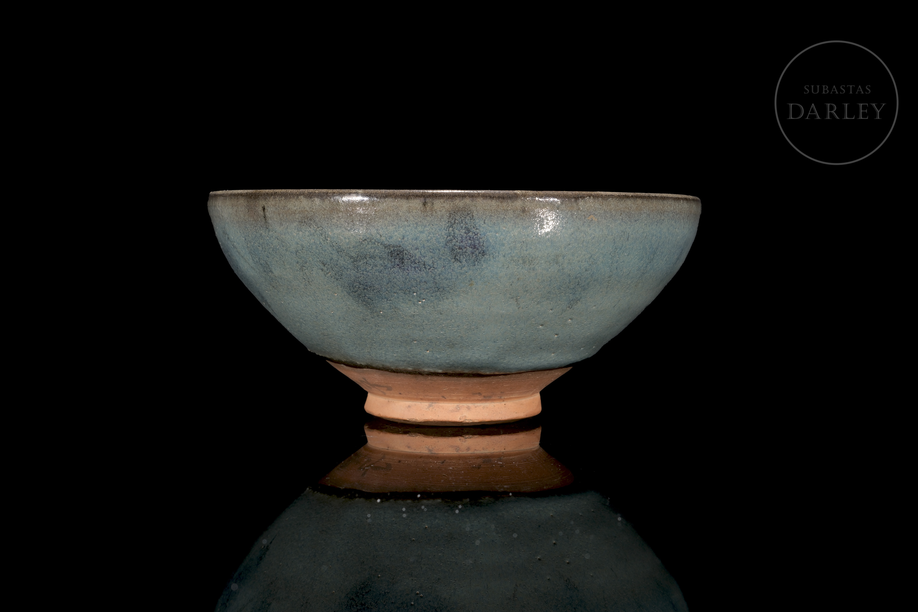Cuenco de cerámica de gres de forma cónica y paredes gruesas. Cubierto por un esmalte de tipo Jun,en cuyo interior muestra un vidriado opalescente de color azul celeste con manchas y veteados en tonos púrpuras y rojizos. El exterior es de un tono azul-verdoso más sobrio. El pie, corto y robusto, se ha dejado sin esmaltar.