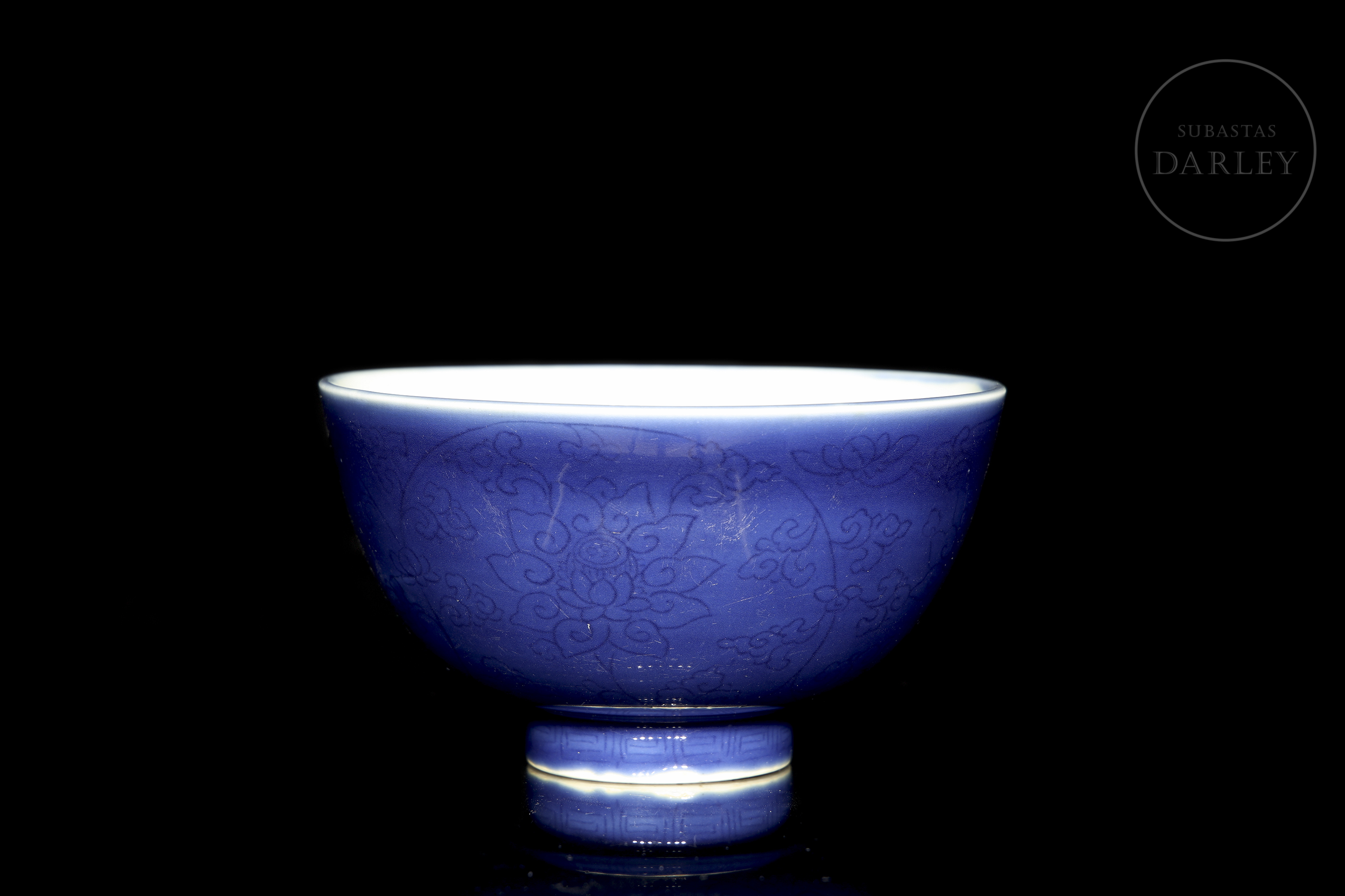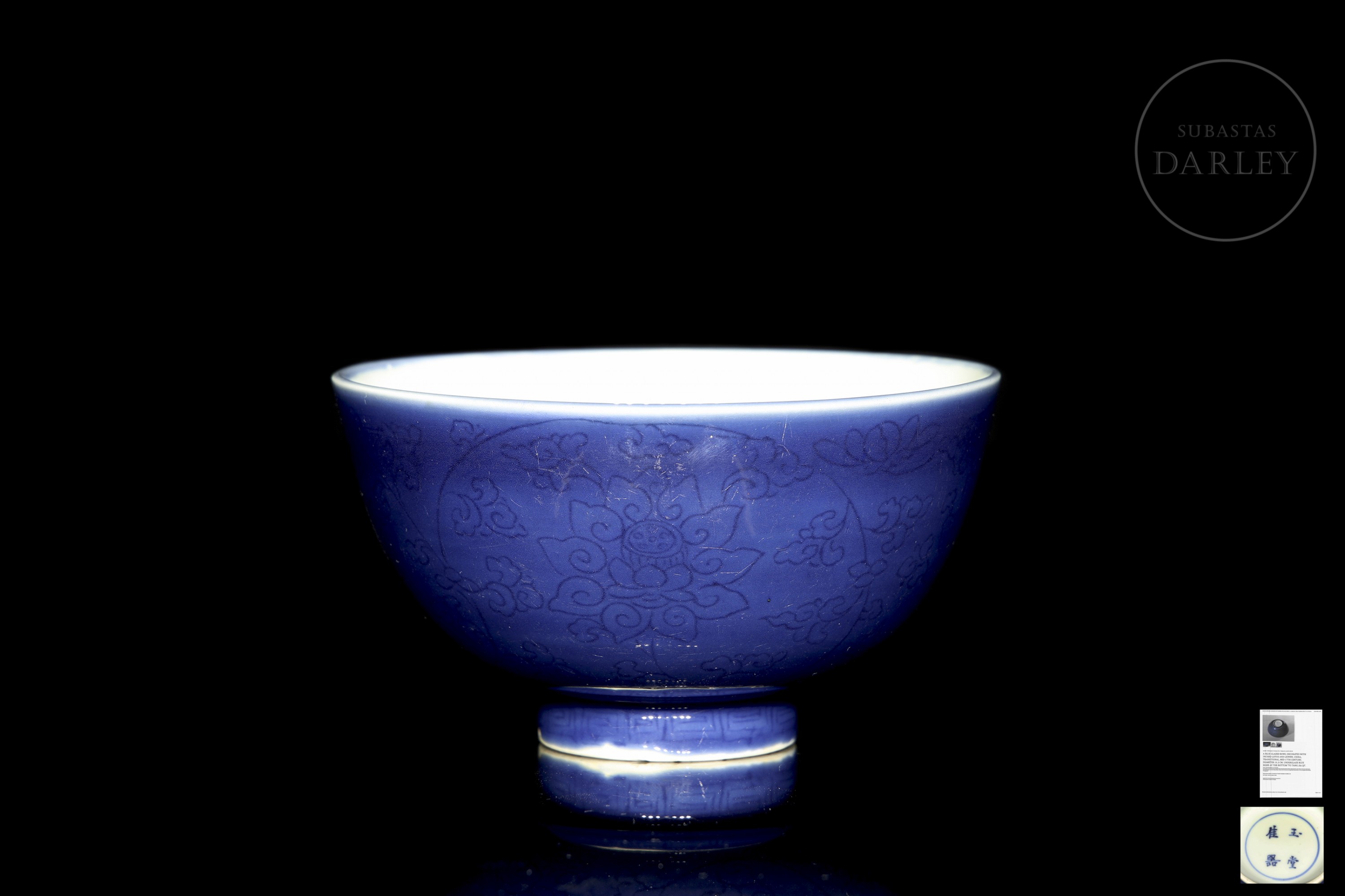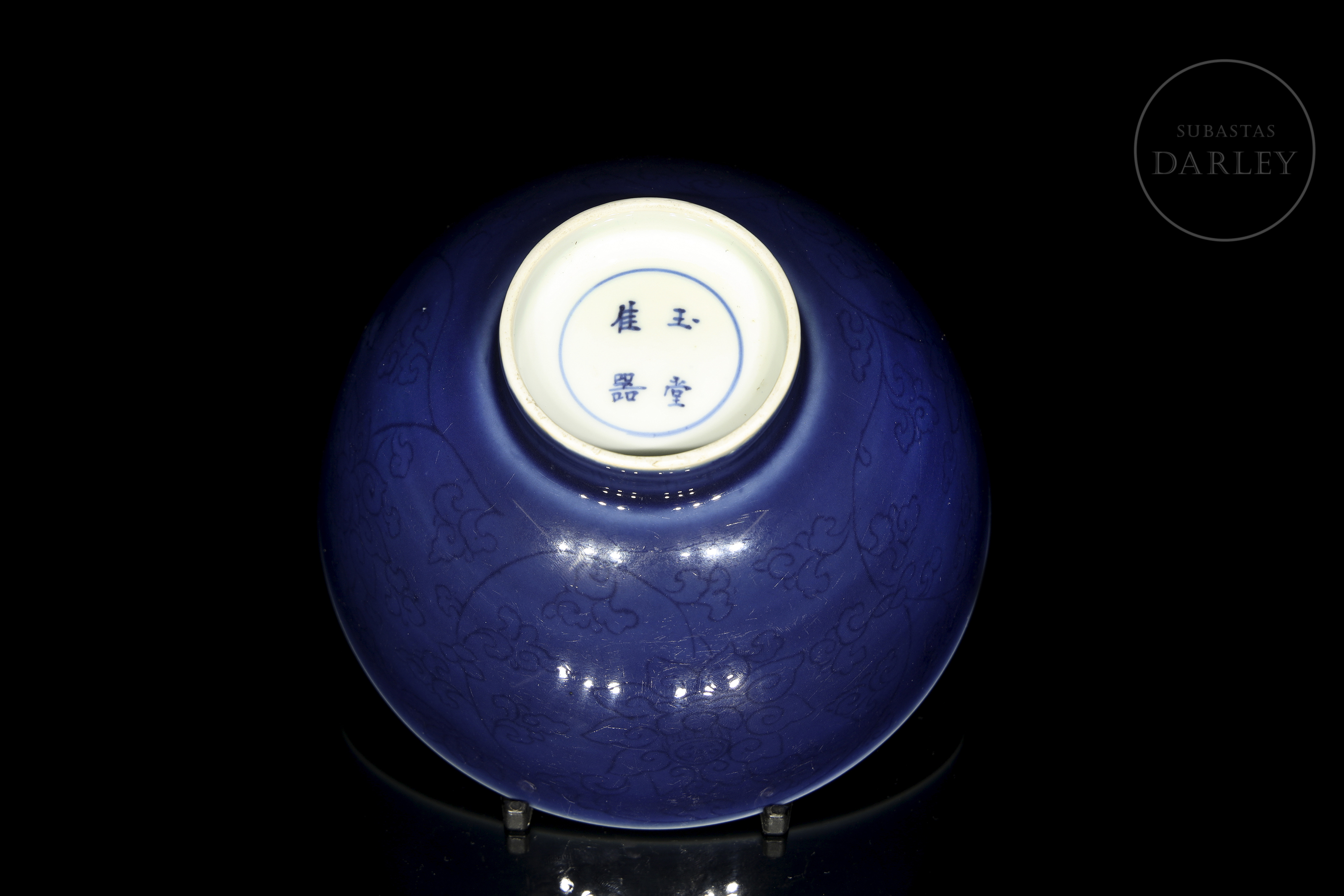 Elegante cuenco de porcelana modelada. El exterior está bañado por un intenso y profundo esmalte monocromo azul cobalto, finamente adornado por patrones incisos (anhua) de roleos de loto y leiwen. El interior, de inmaculado color blanco, contrasta con el intenso color azul del perímetro exterior. La base, en porcelana blanca, presenta un sello de cuatro caracteres “玉堂佳器” en azul bajo vidriado.