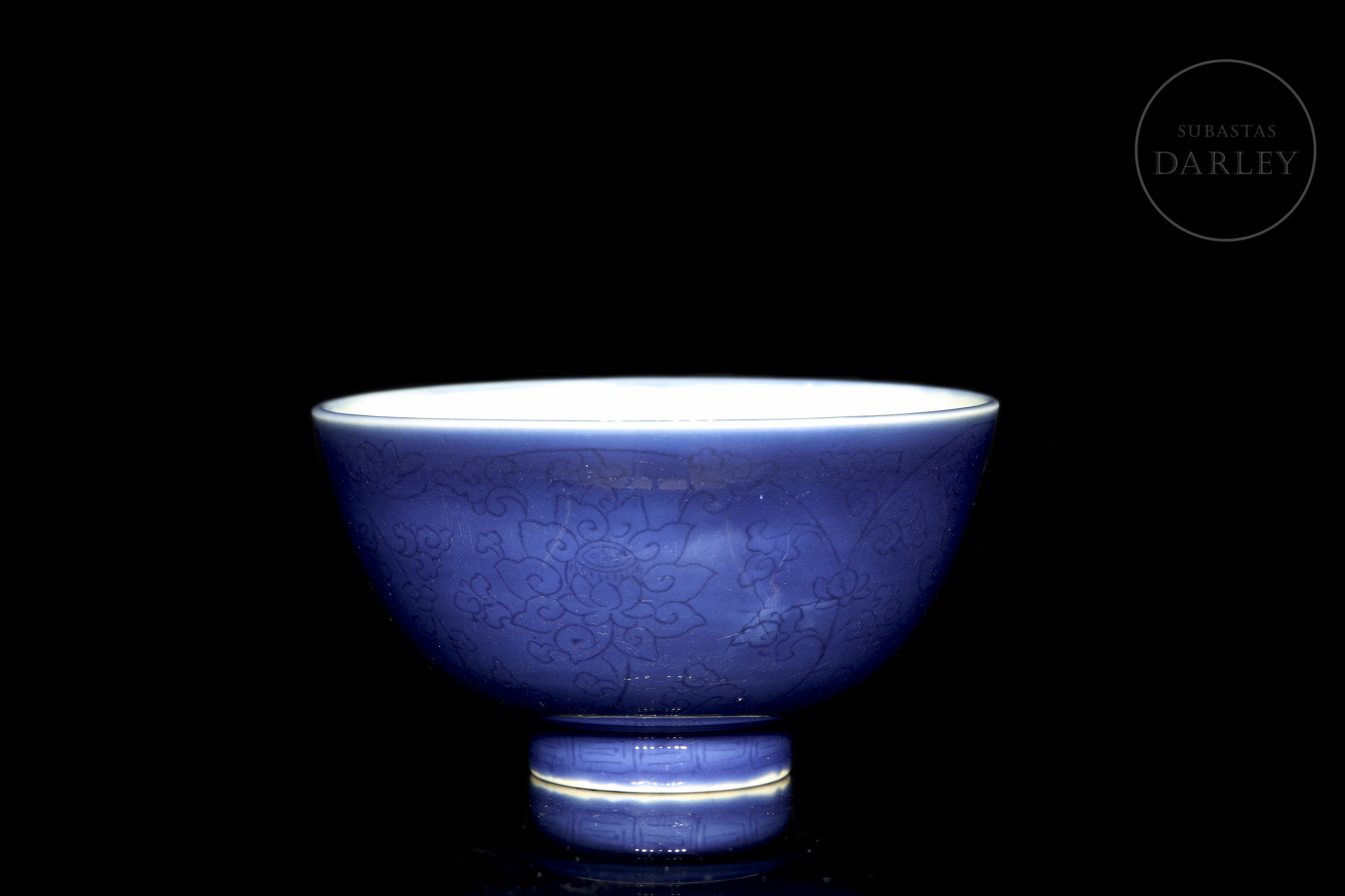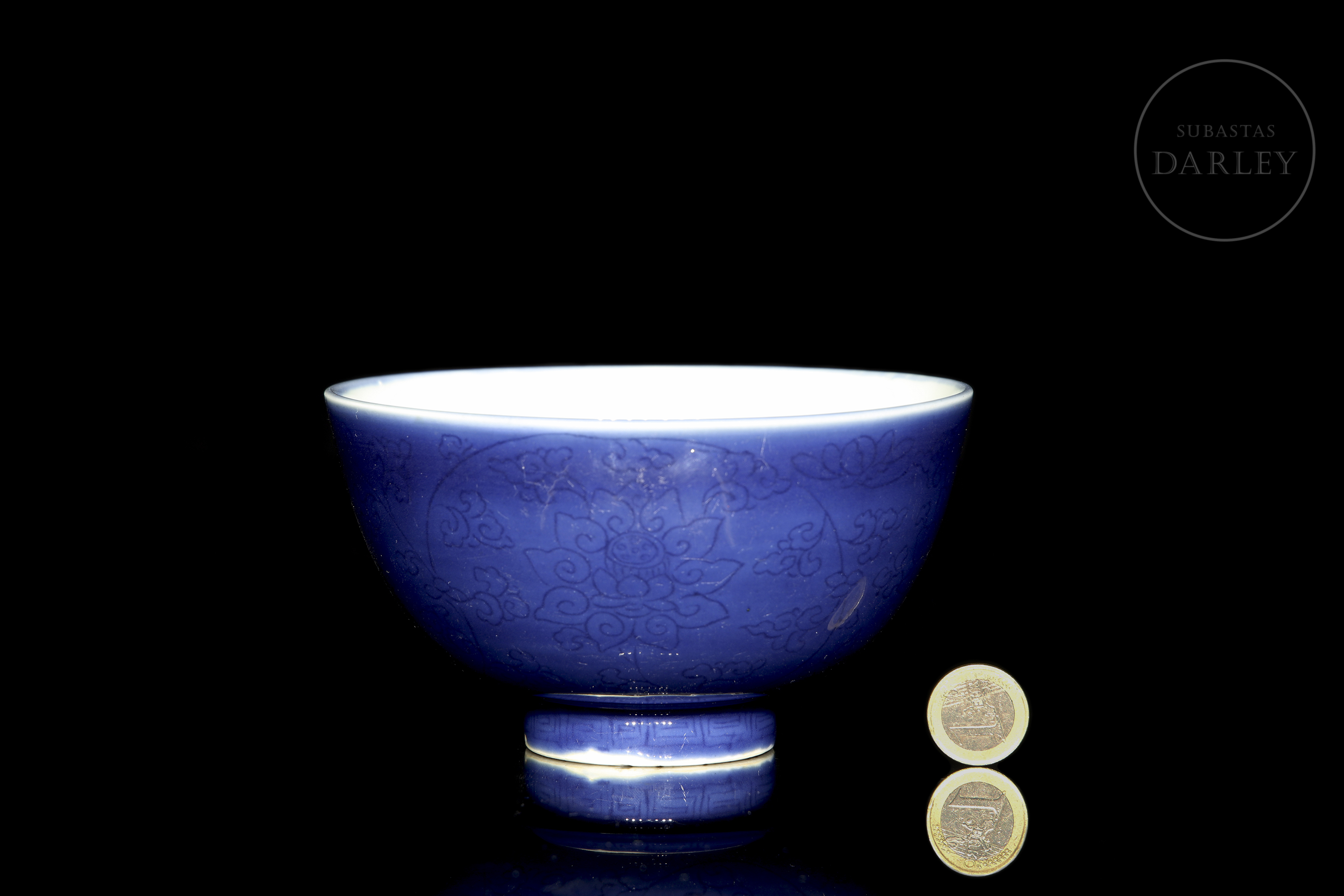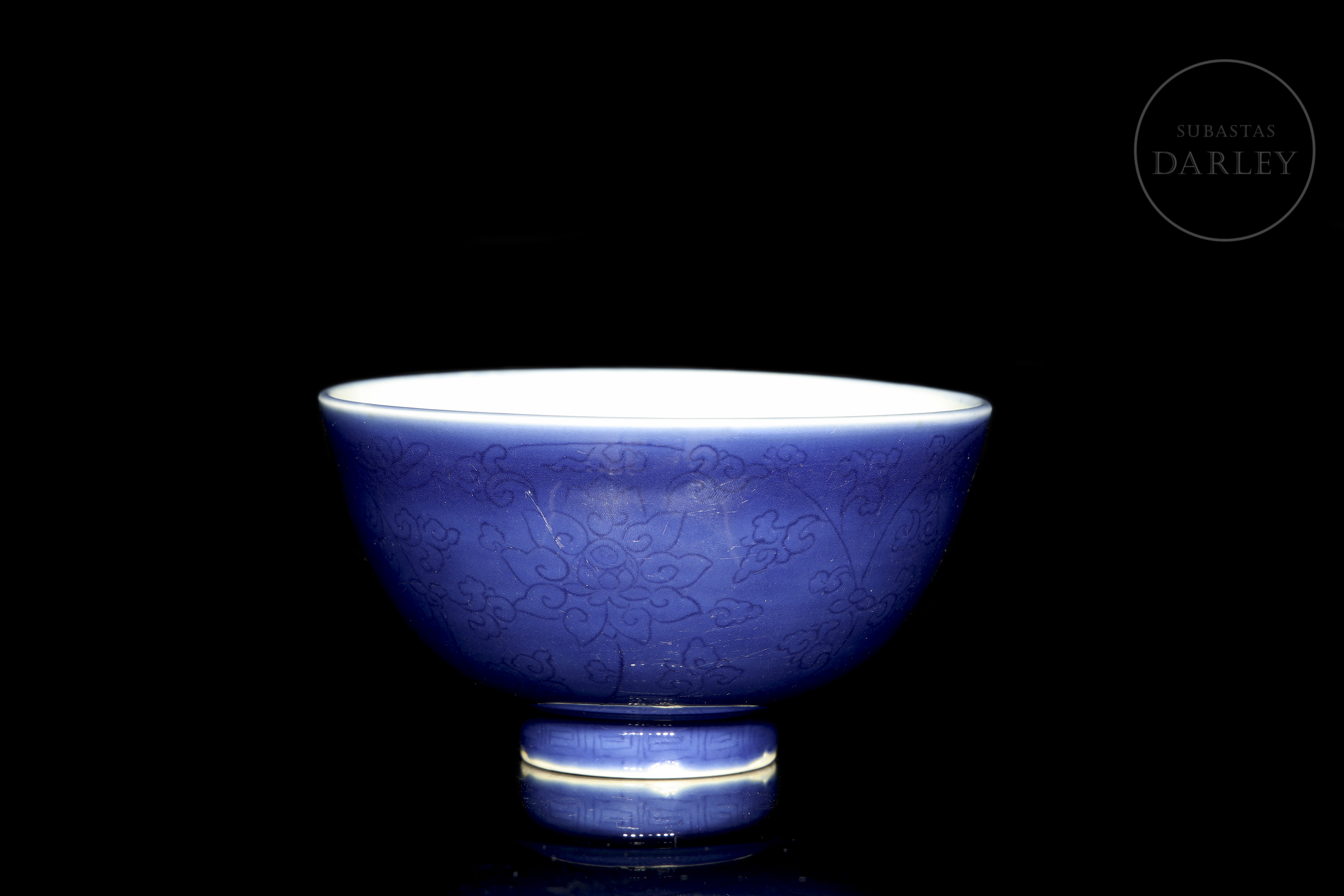 Elegante cuenco de porcelana modelada. El exterior está bañado por un intenso y profundo esmalte monocromo azul cobalto, finamente adornado por patrones incisos (anhua) de roleos de loto y leiwen. El interior, de inmaculado color blanco, contrasta con el intenso color azul del perímetro exterior. La base, en porcelana blanca, presenta un sello de cuatro caracteres “玉堂佳器” en azul bajo vidriado.