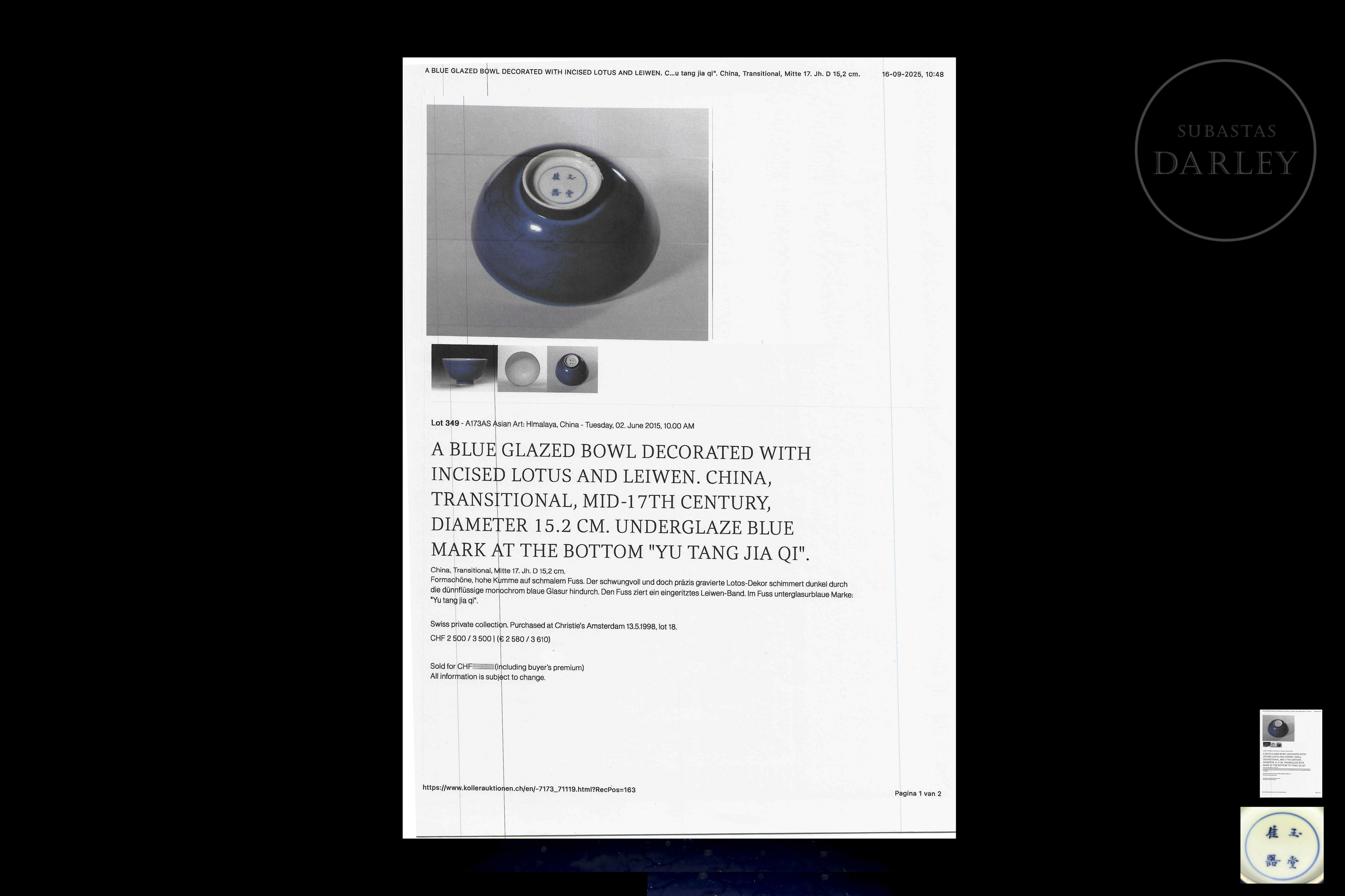 Cuenco de porcelana con esmalte azul "Loto y Leiwen", s.XVII dinastía Ming