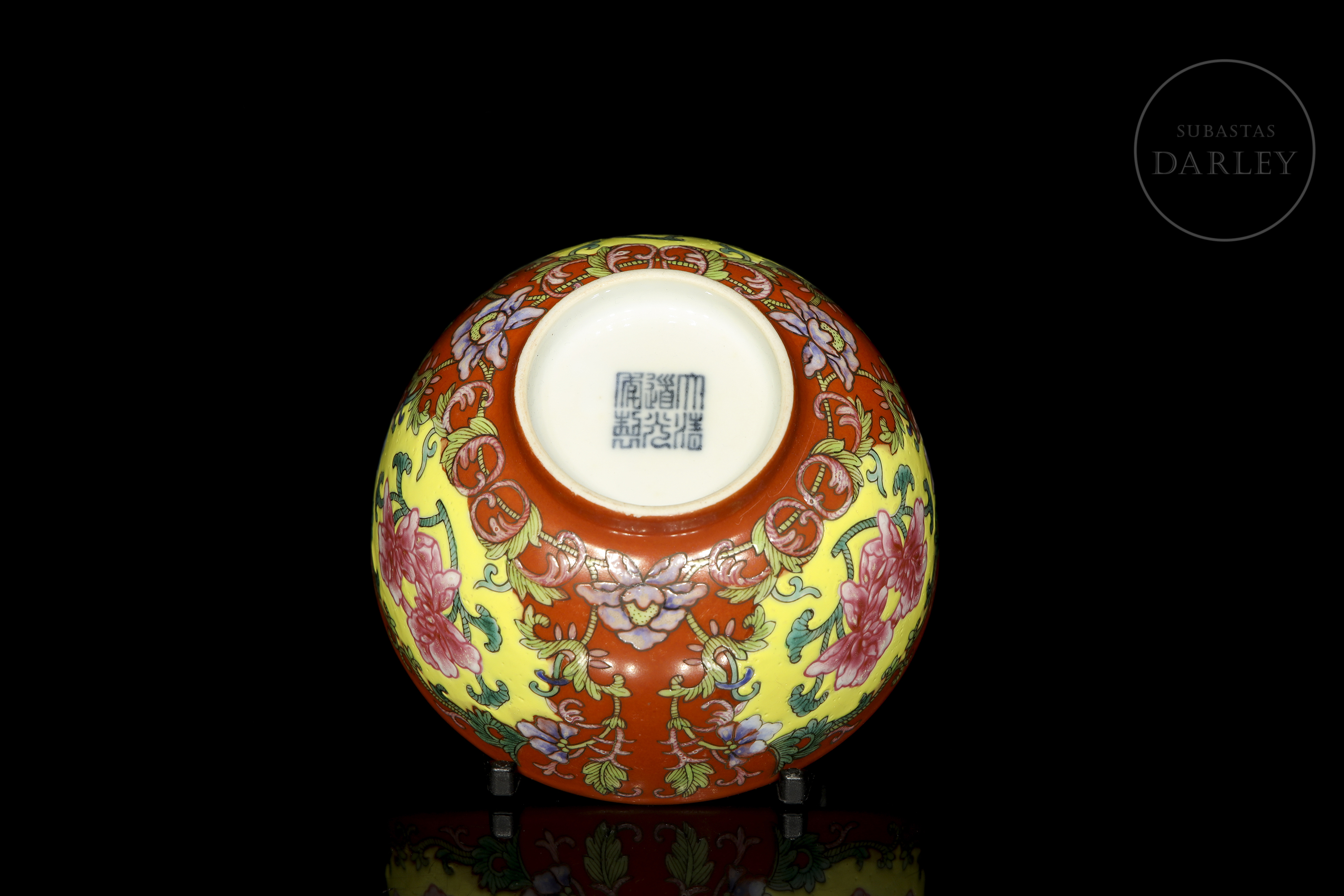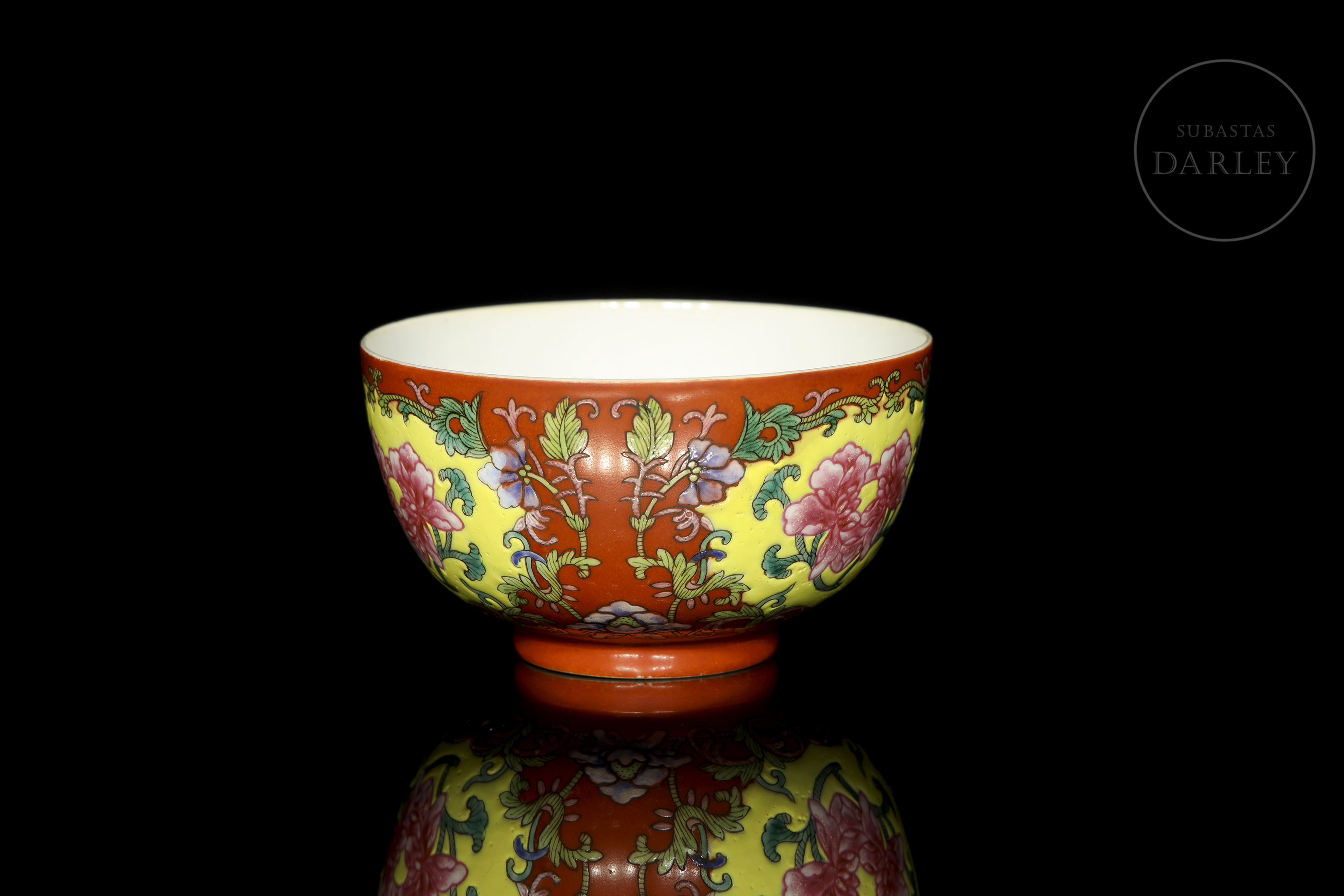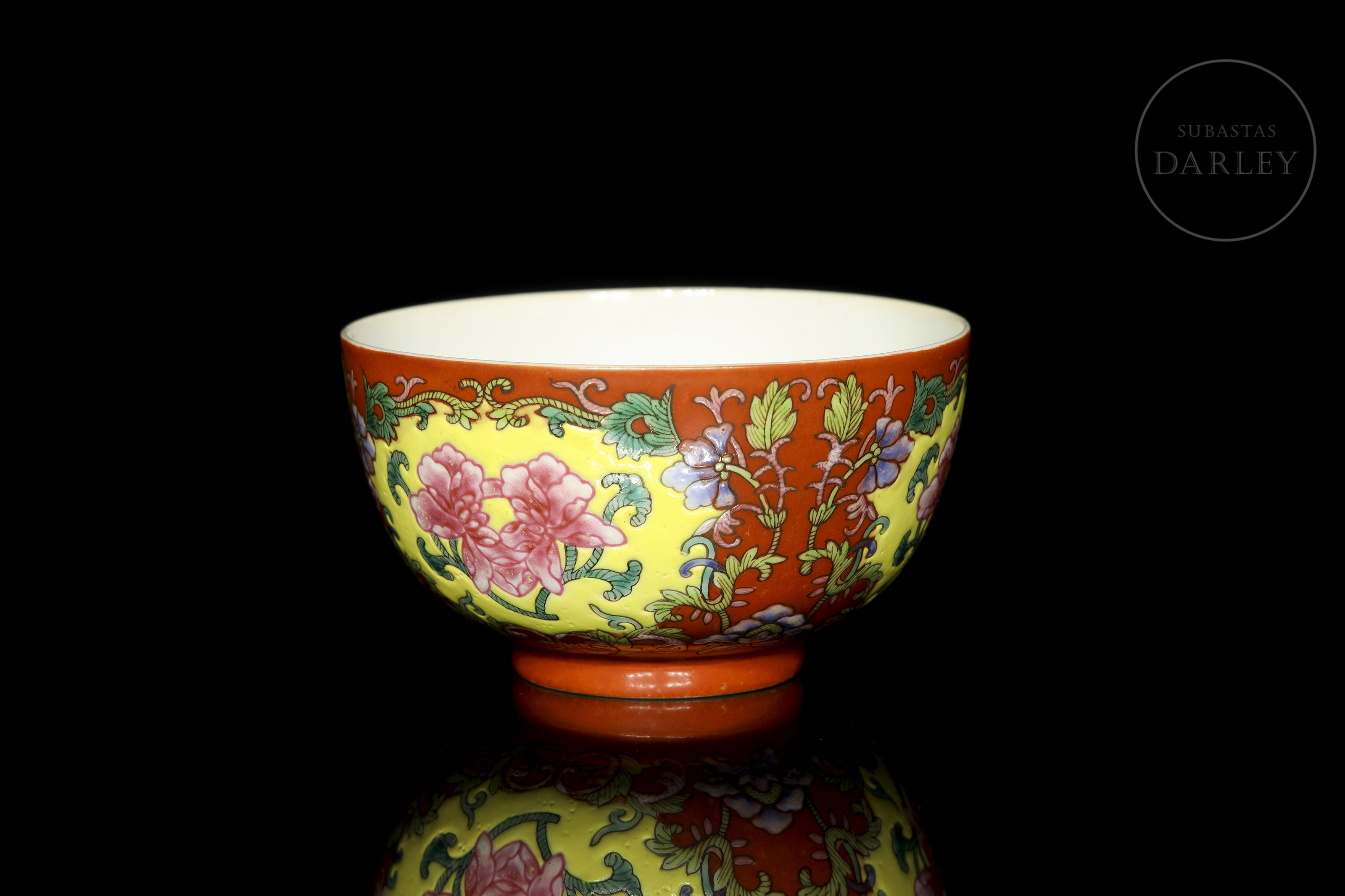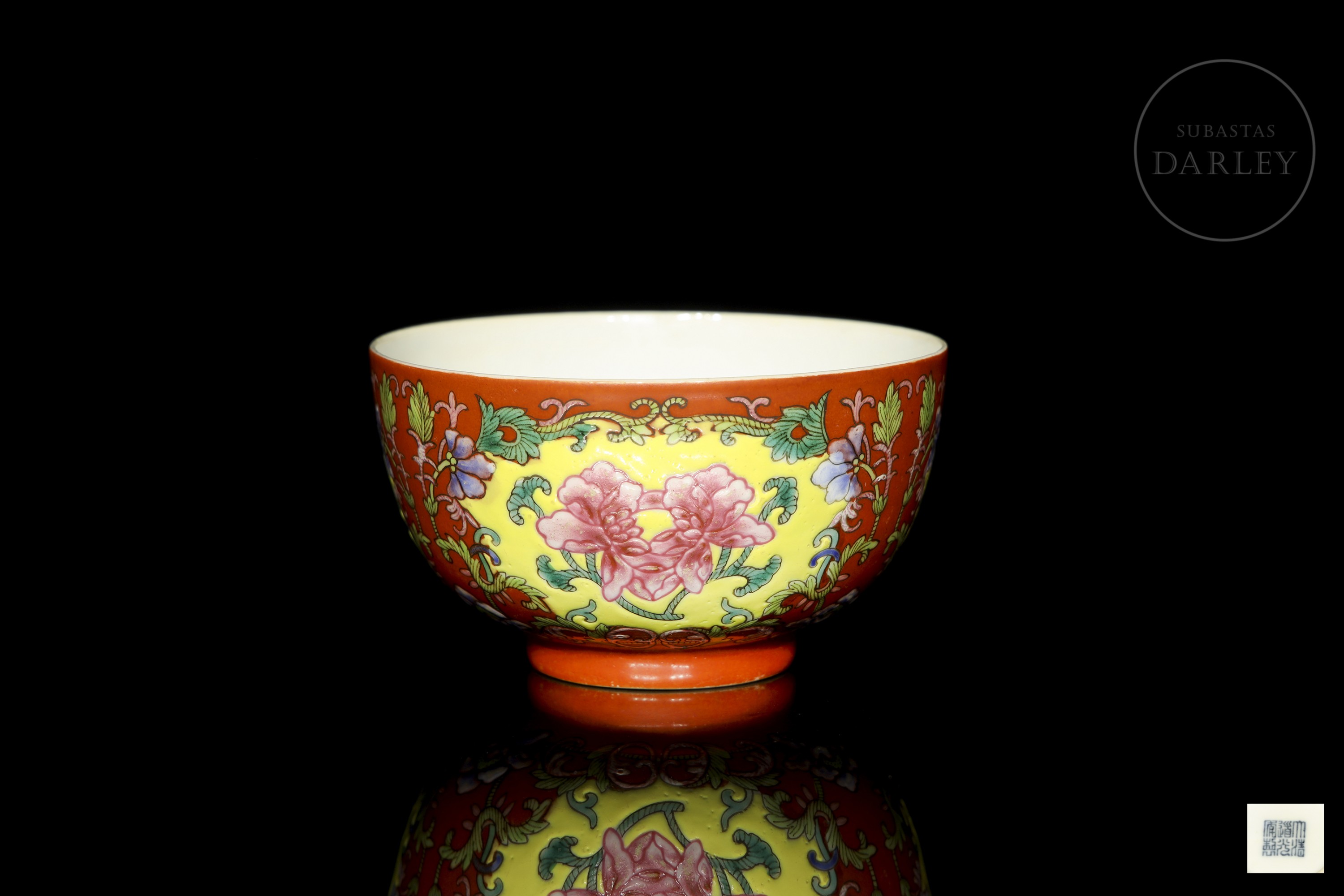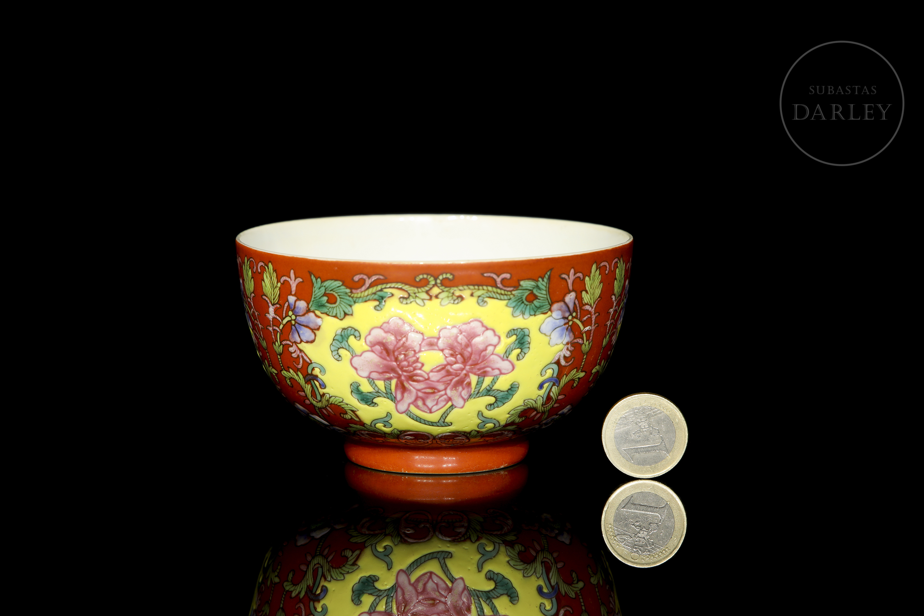 Realizado en porcelana con un formato circular de paredes curvas, ancha boca y corto pie circular. La decoración exterior, ejecutada con esmaltes polícromos de la familia rosa, presenta una composición de ramas floridas y brotes que nacen desde la base y se extienden enmarcando cartelas lobuladas de lotos en flor; todo ello sobre un fondo de intenso color coral. En la base presenta el sello de seis caracteres "大清道光年制" en azul bajo vidriado.