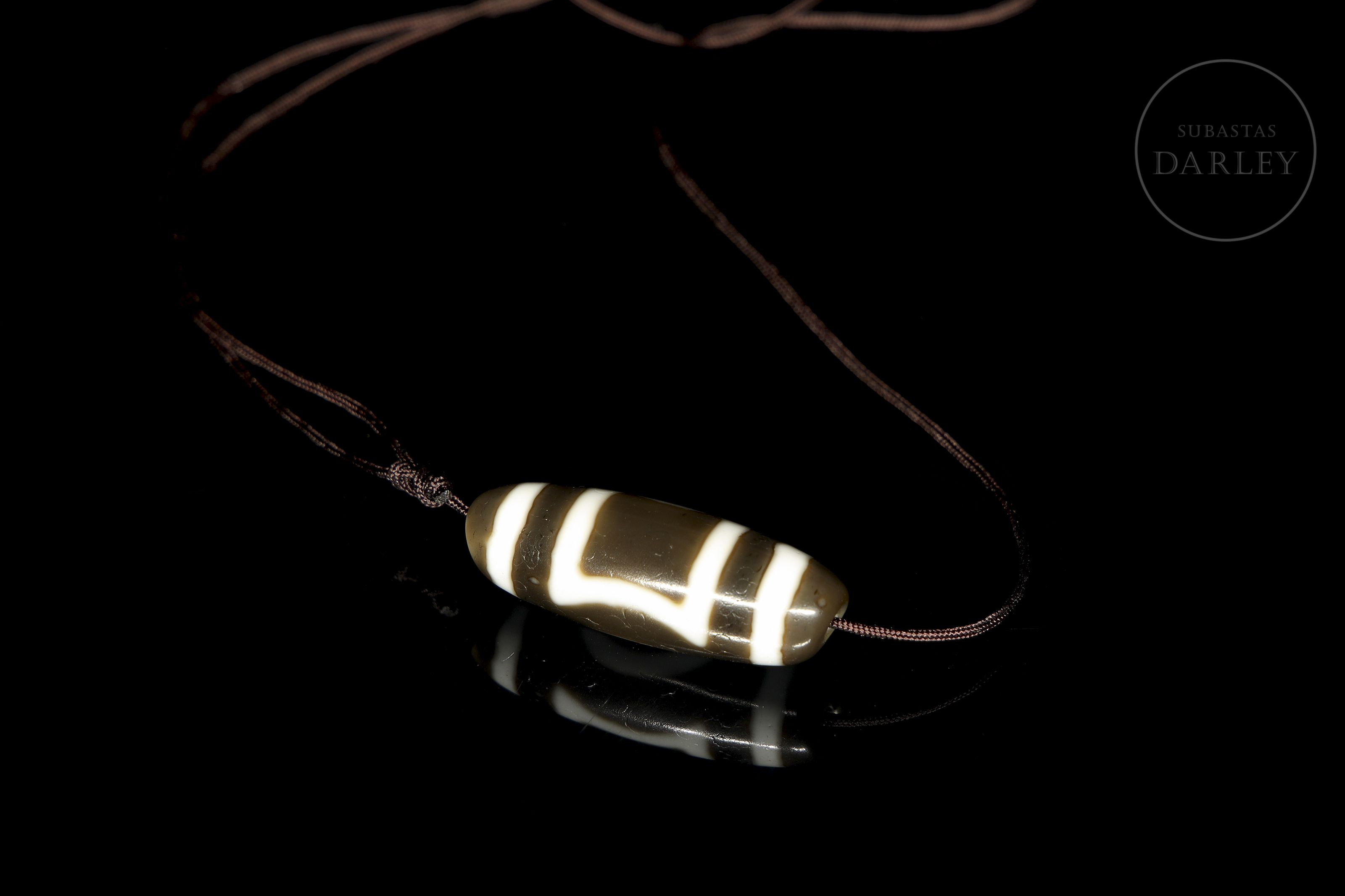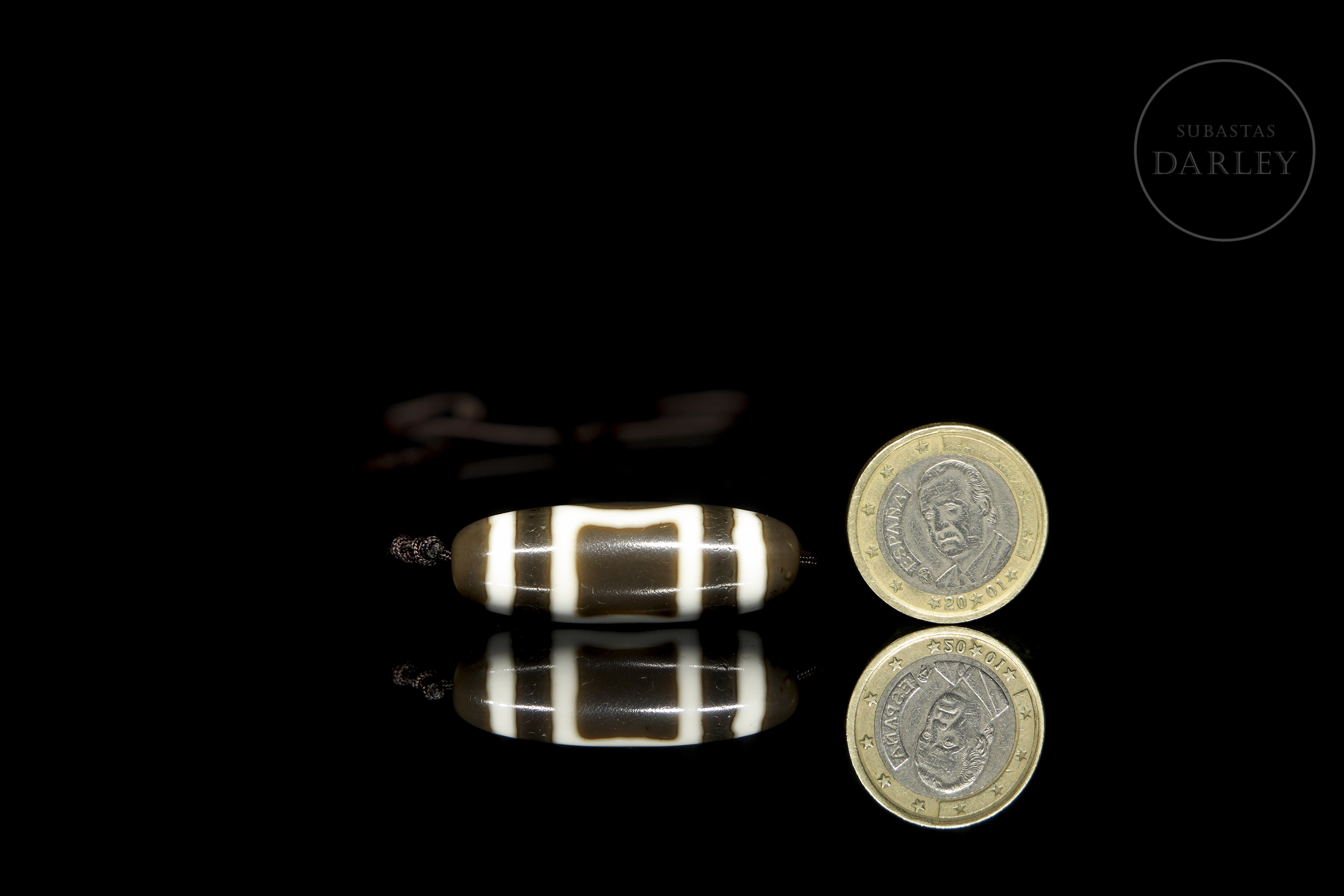 Ágata tallada en forma de vaina alargada con bordes redondeados, sutilmente más estrecha en los extremos. Posee un color café o marrón que sirve como base para las decoraciones realizadas en blanco, donde destaca un ojo central y un cuadrado, enmarcada por dos franjas del mismo color. Dinastía Tang (618-906) o posterior.