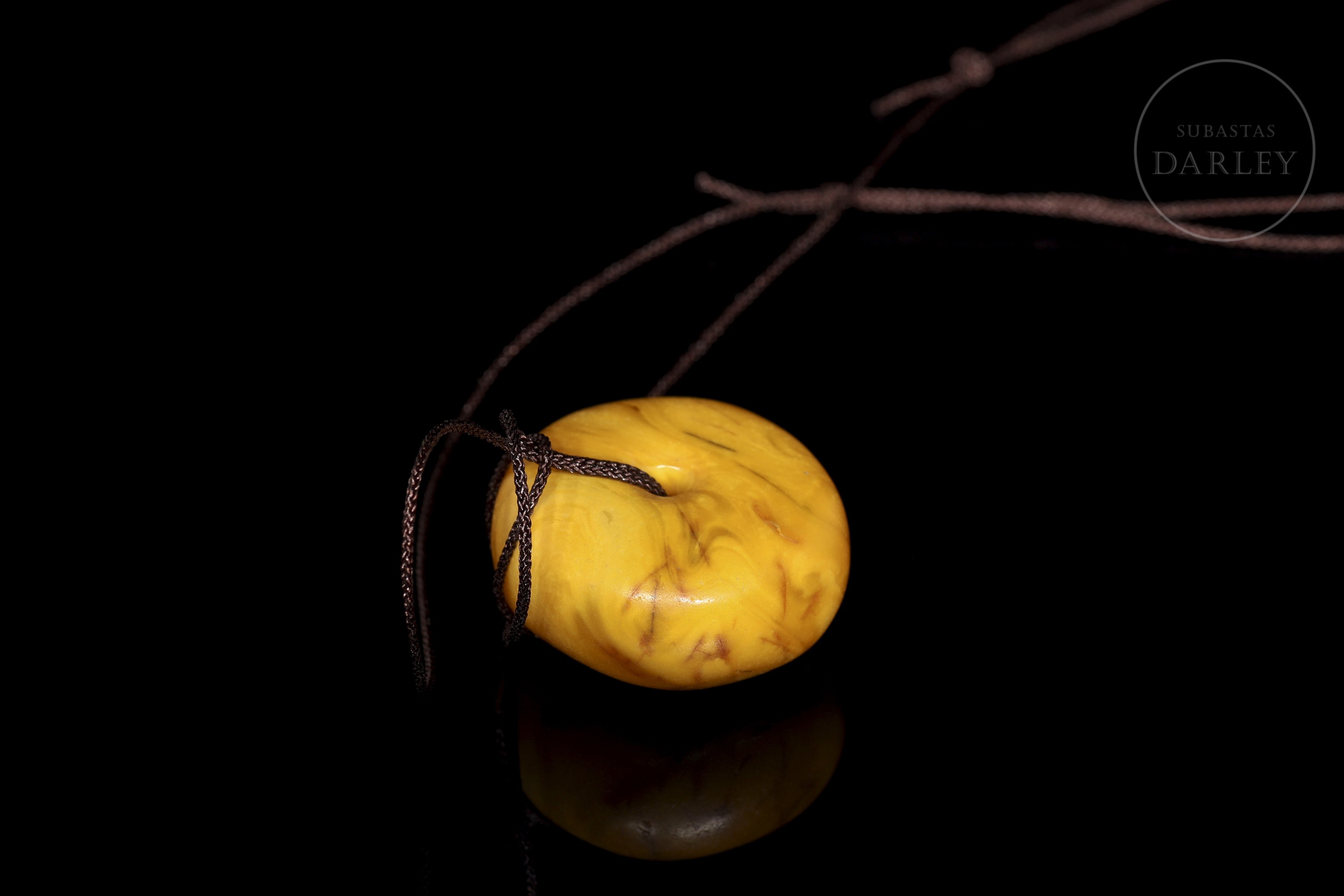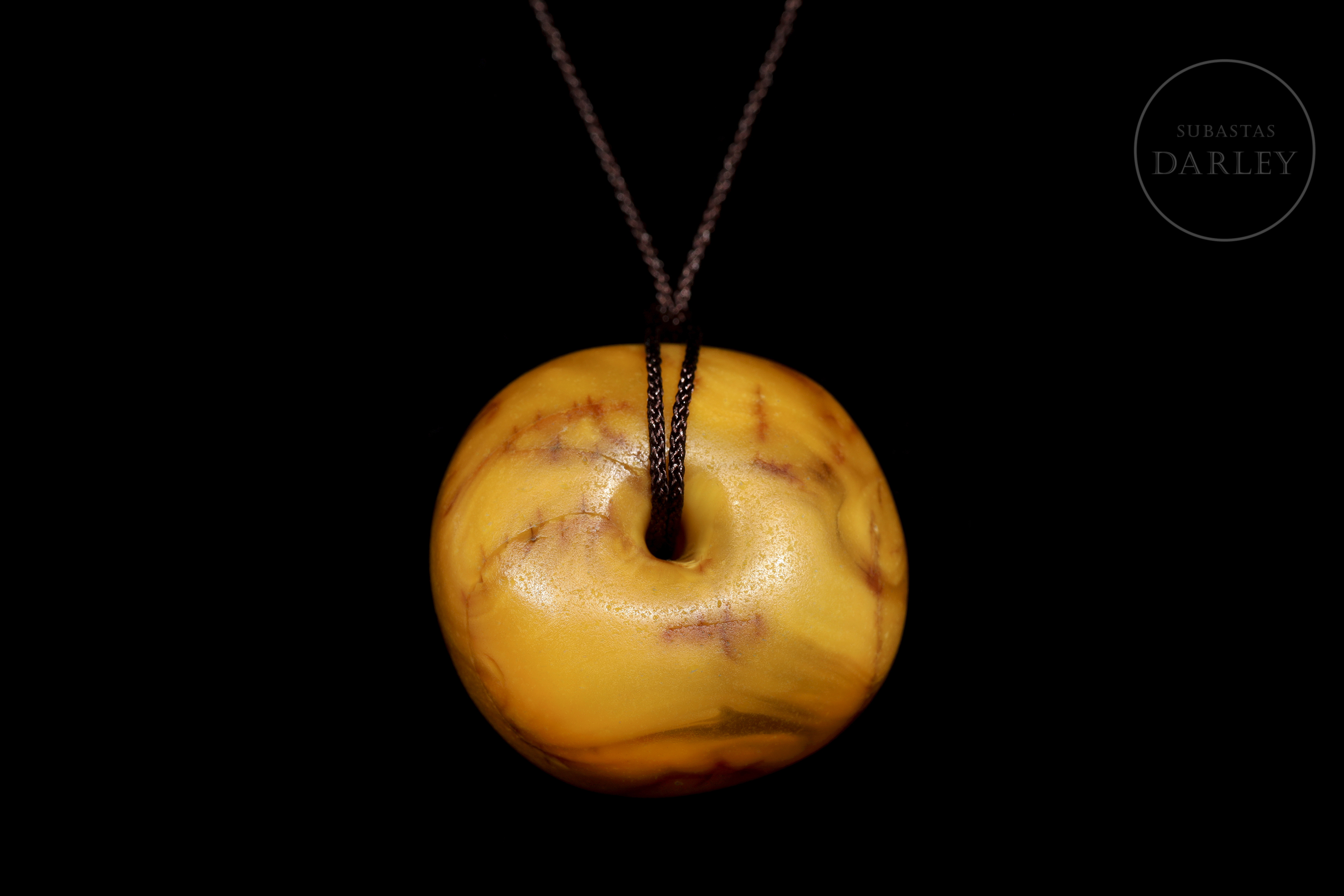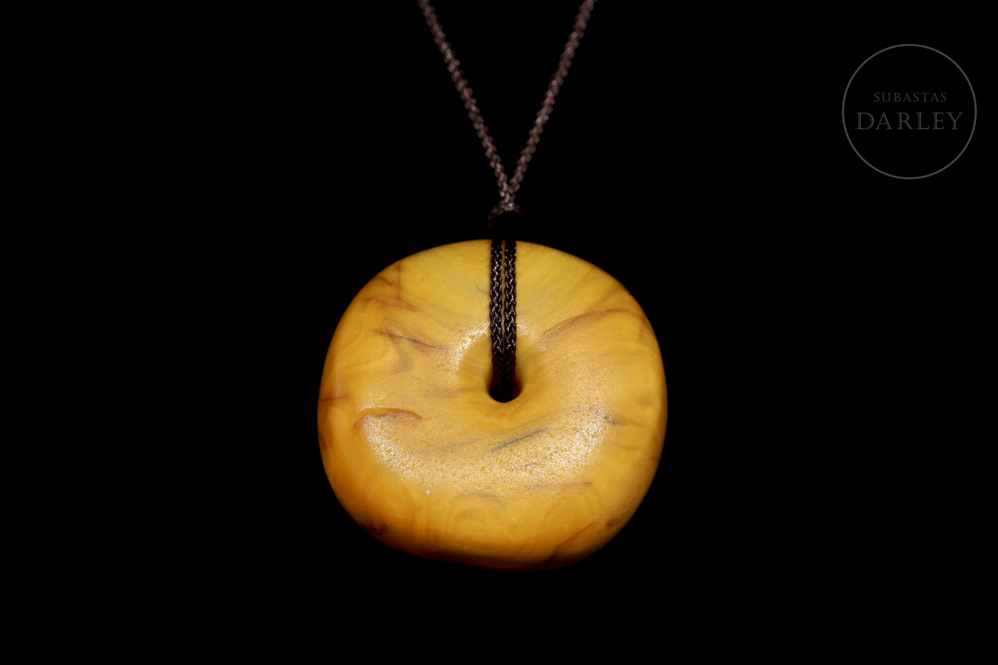Colgante de ámbar natural, tallado y pulido con una forma de disco irregular. La pieza, de un profundo color miel, muestra las vetas, inclusiones y zonas de opacidad características de la resina fosilizada. Presenta una perforación central para poder ser suspendido.