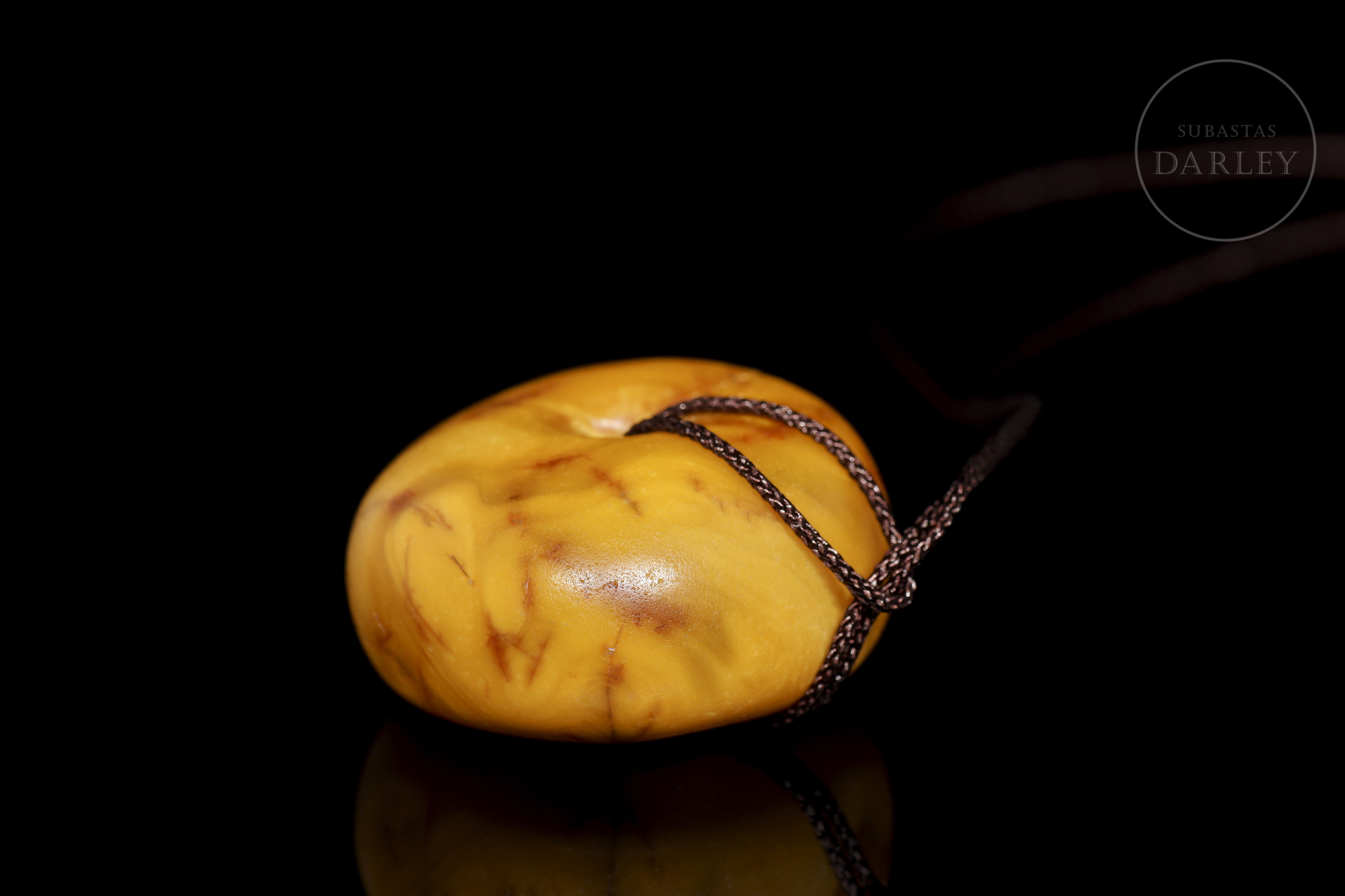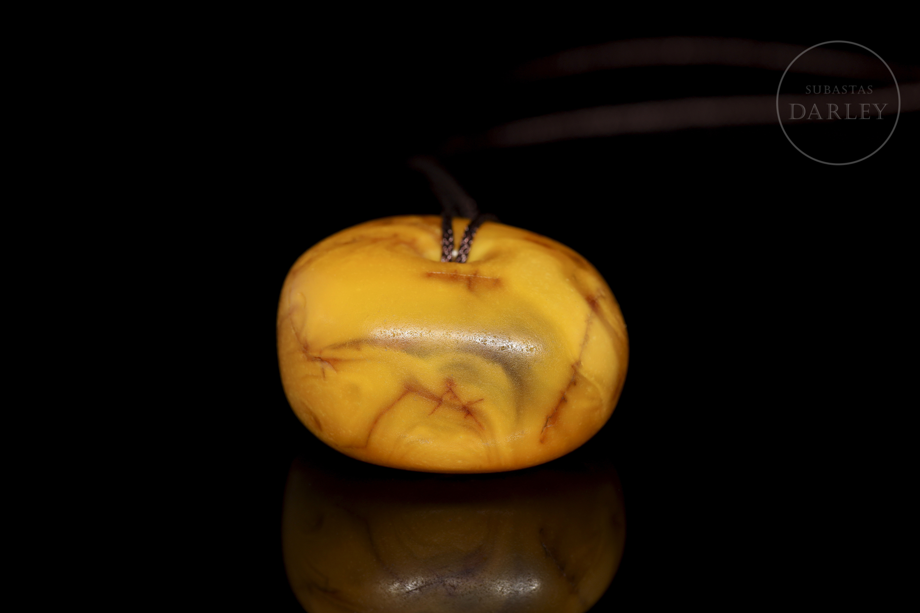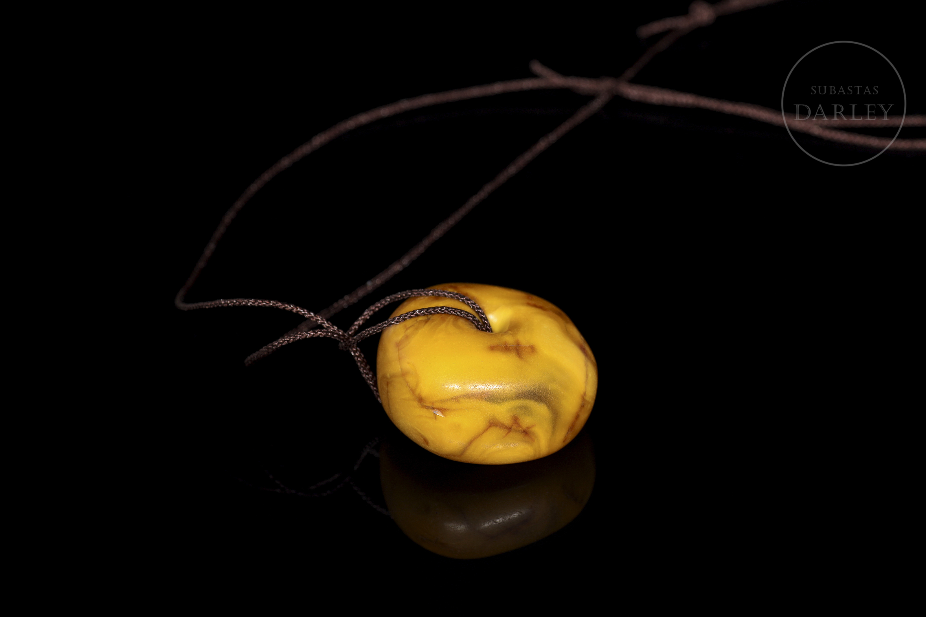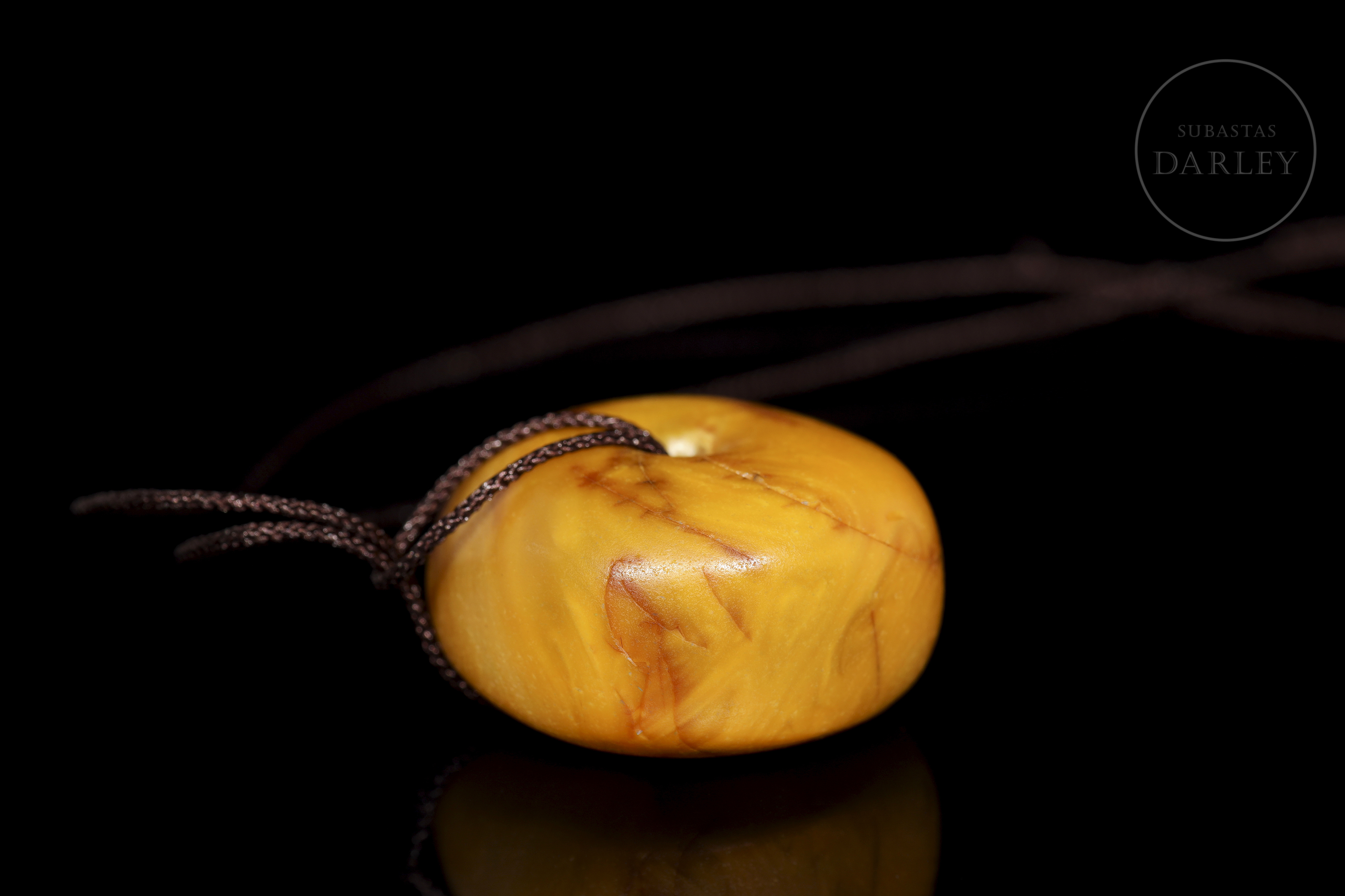 Colgante de ámbar natural, tallado y pulido con una forma de disco irregular. La pieza, de un profundo color miel, muestra las vetas, inclusiones y zonas de opacidad características de la resina fosilizada. Presenta una perforación central para poder ser suspendido.